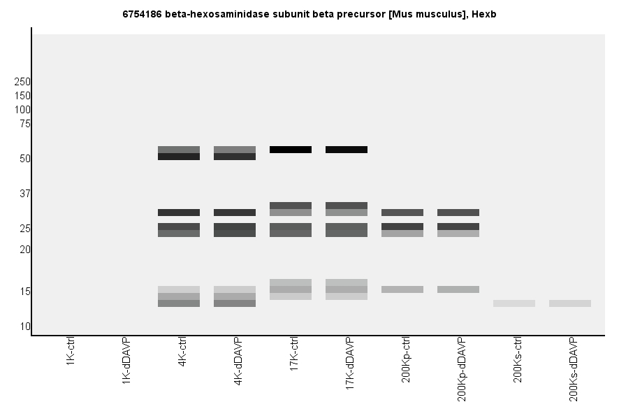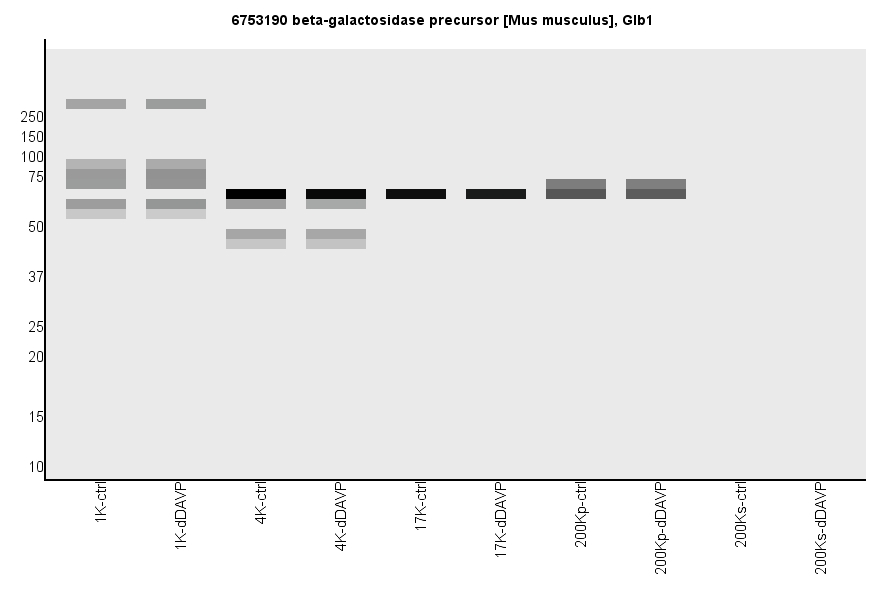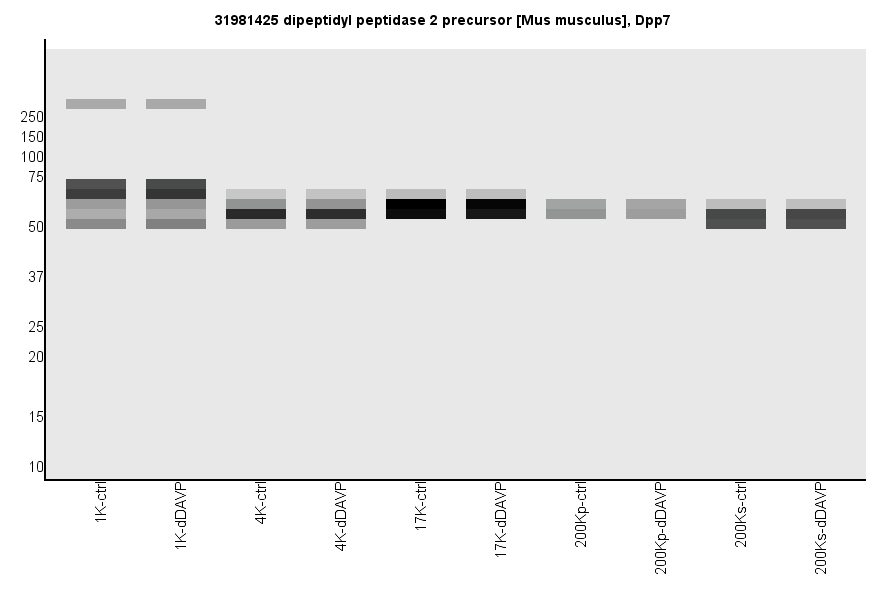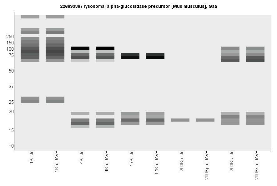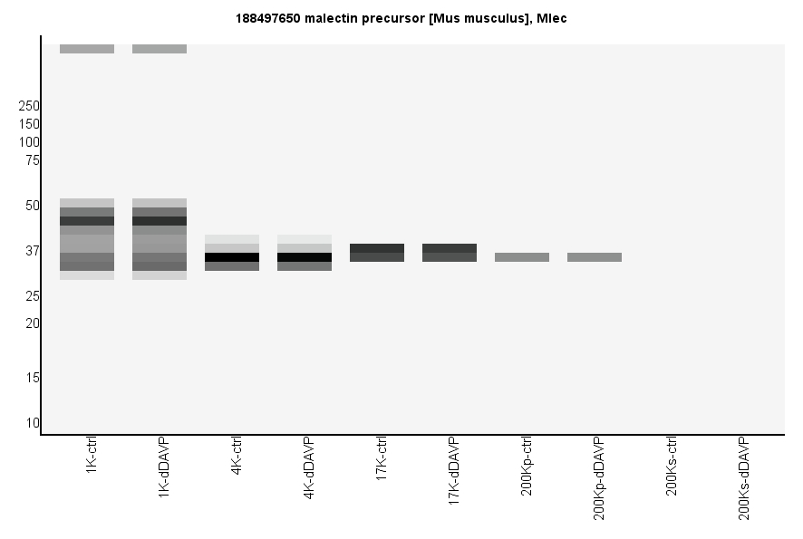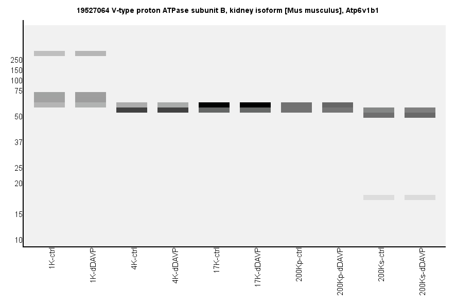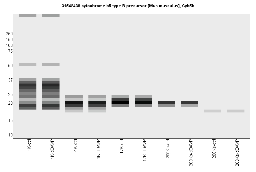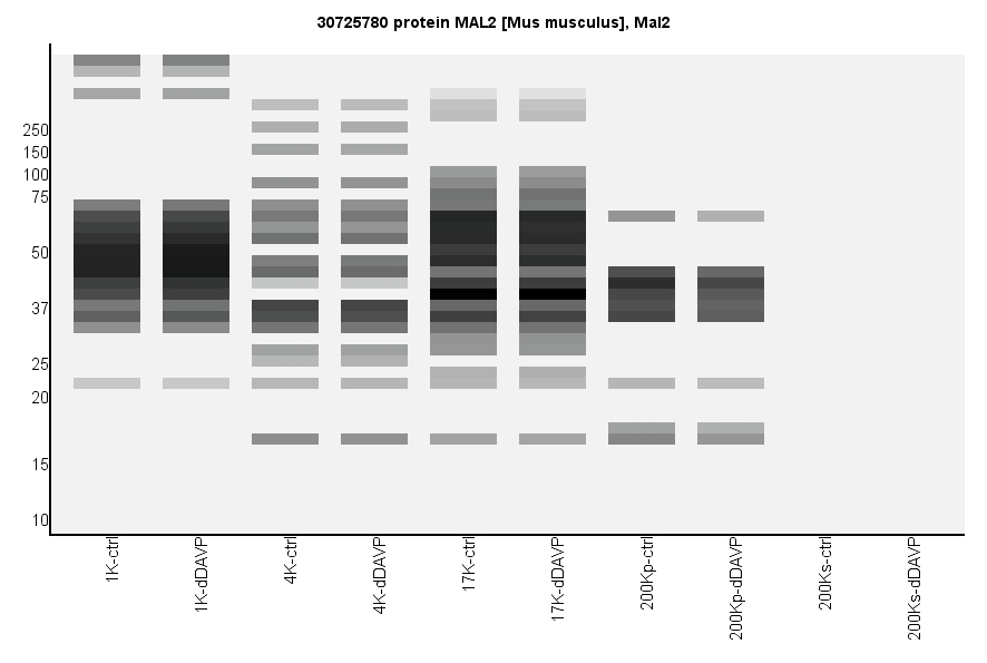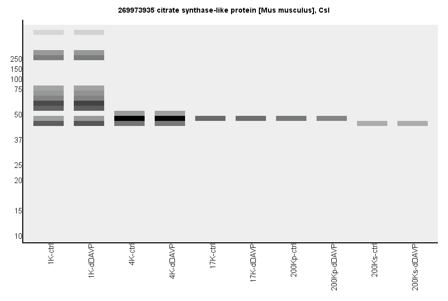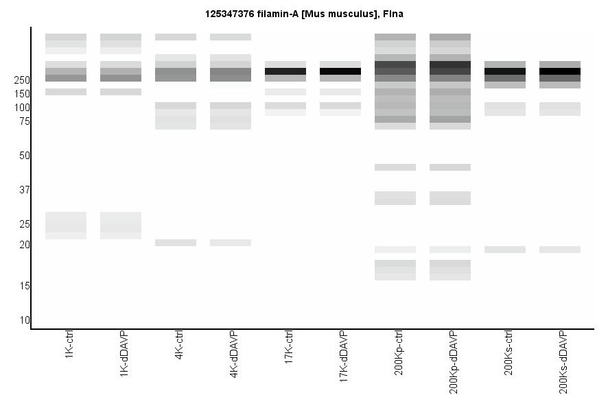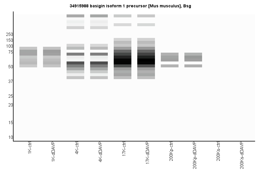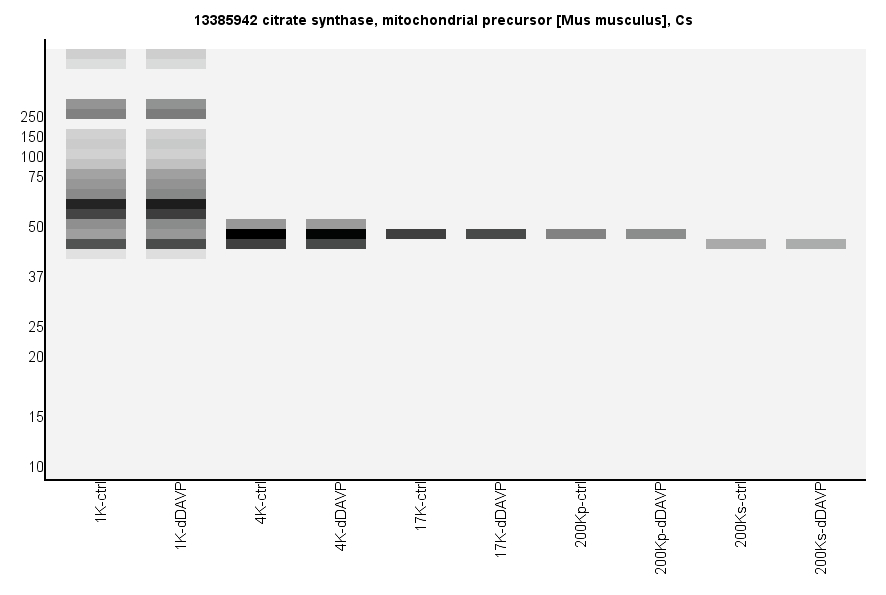 The virtual western blot images show data normalized using a logarithmic conversion scale to map peptide intensities to gray-scale levels. Using this conversion method, low-abundance peptides are generally visible in the blot images. Switch back to the default linear conversion scale database page.