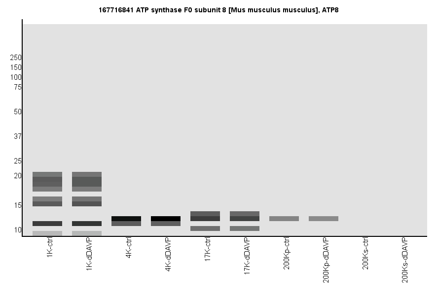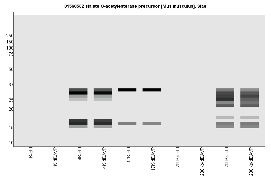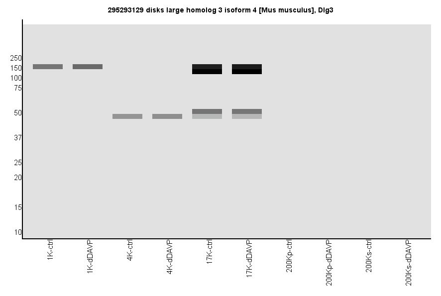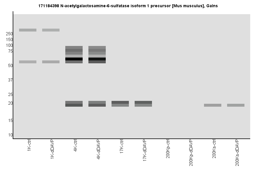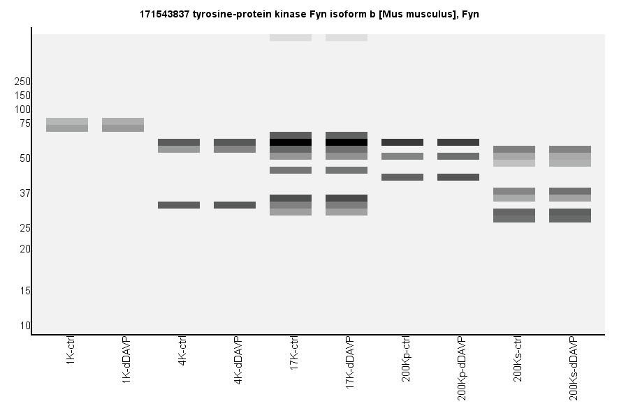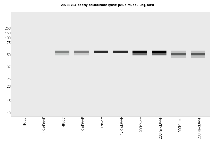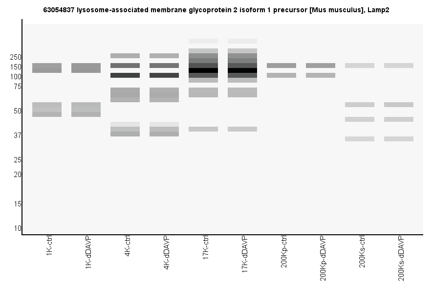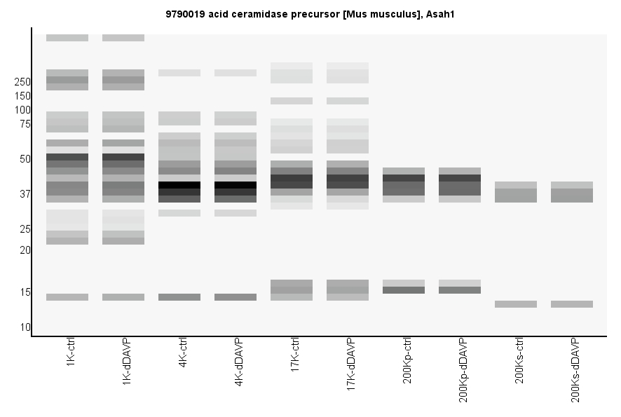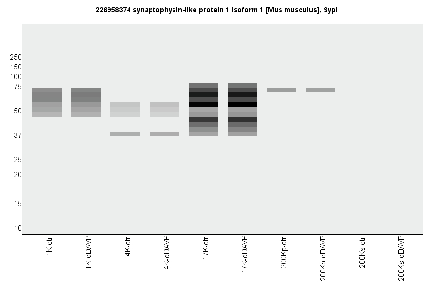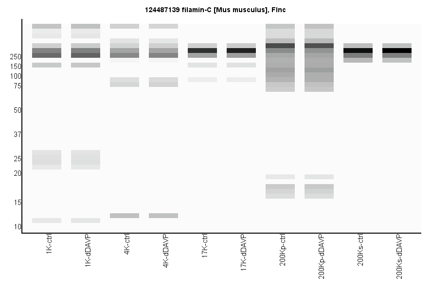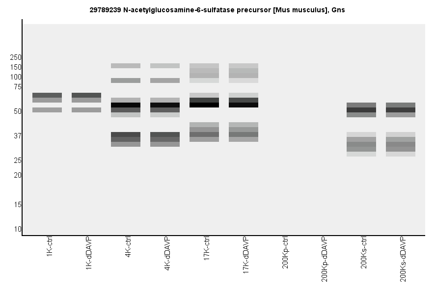 The virtual western blot images show data normalized using a logarithmic conversion scale to map peptide intensities to gray-scale levels. Using this conversion method, low-abundance peptides are generally visible in the blot images. Switch back to the default linear conversion scale database page.
