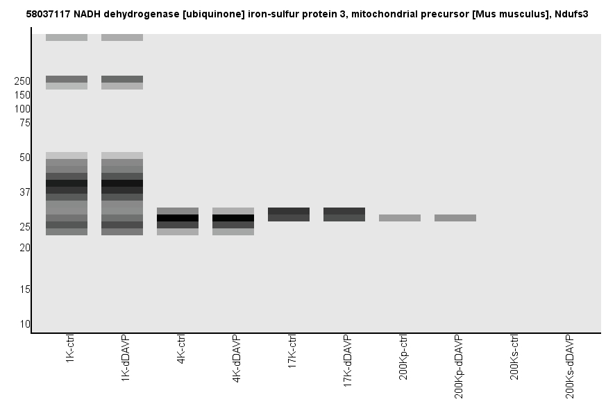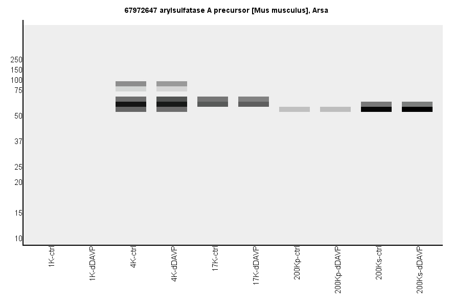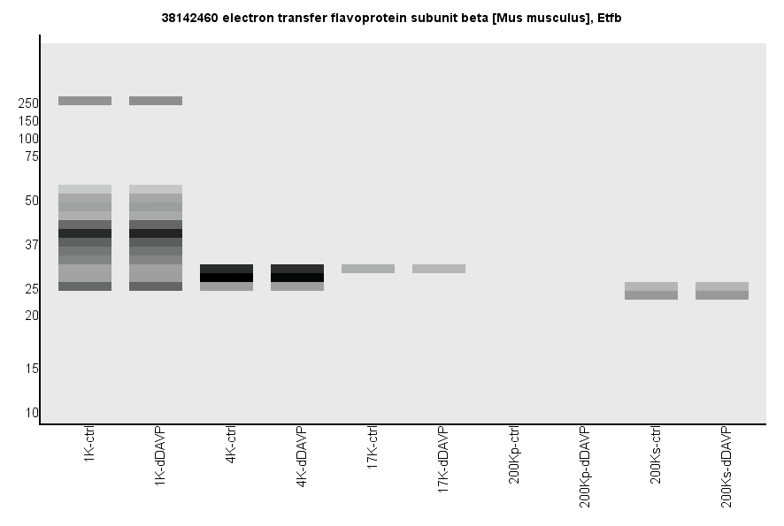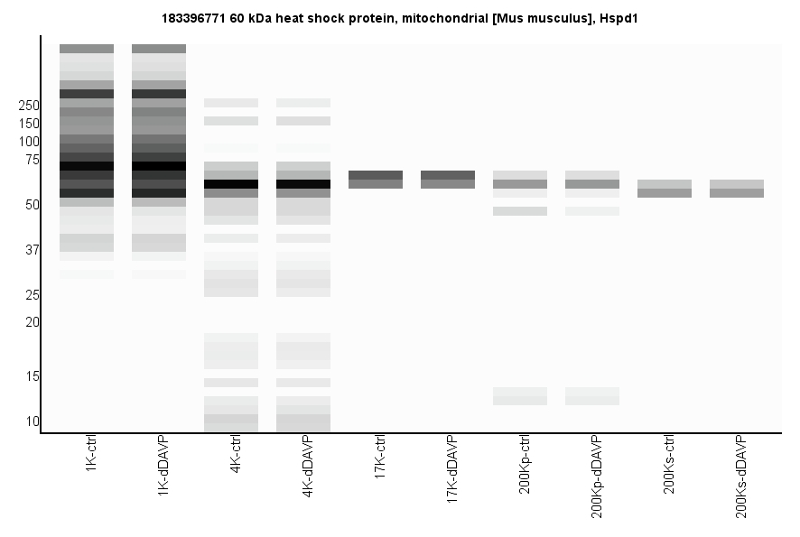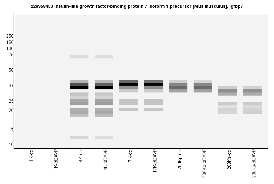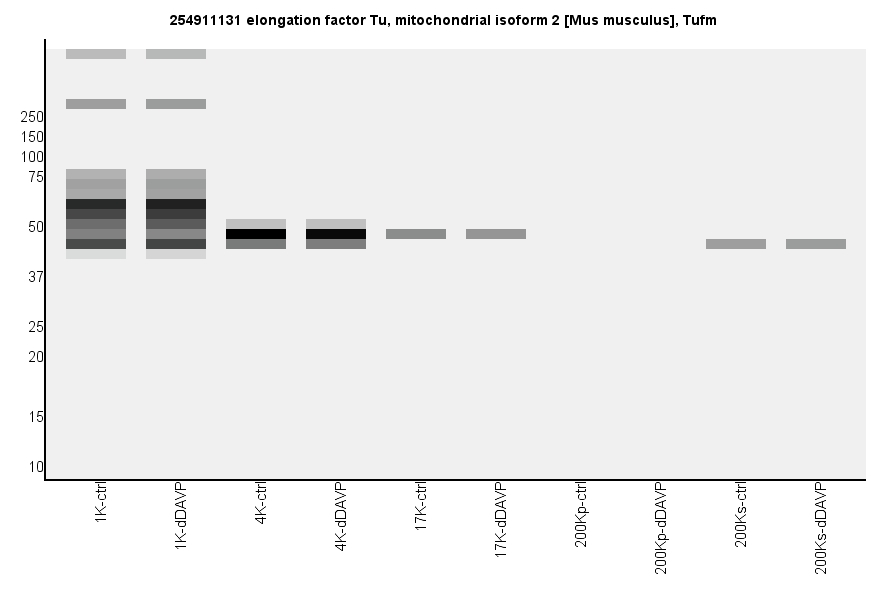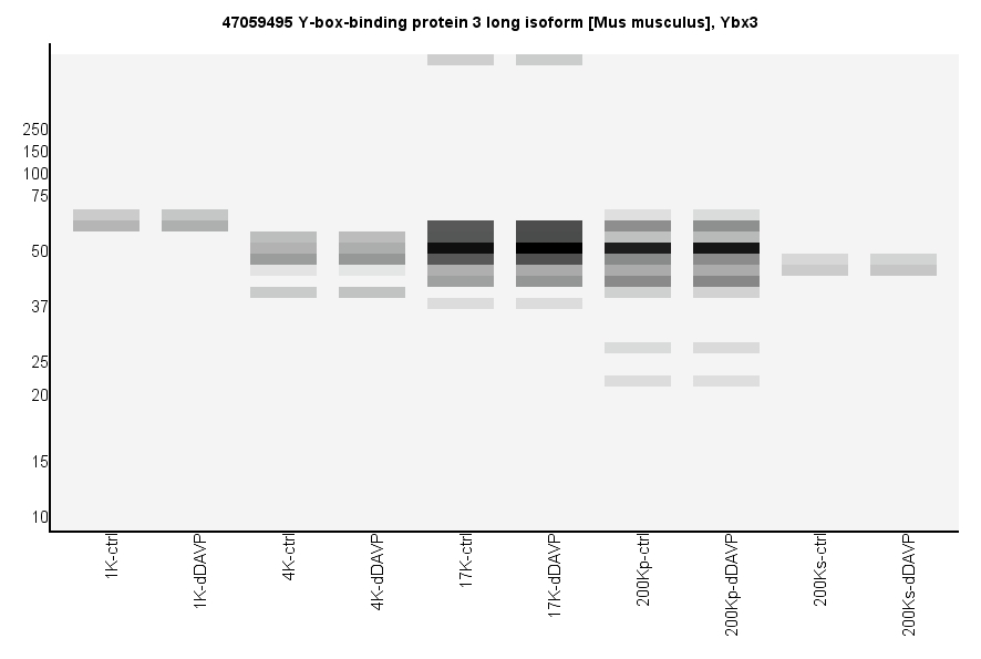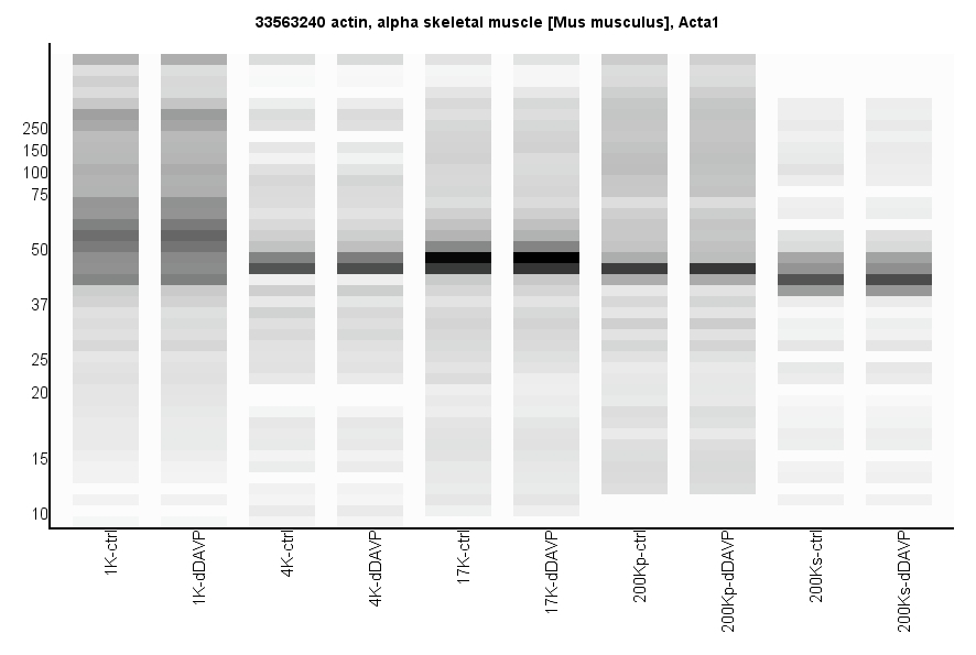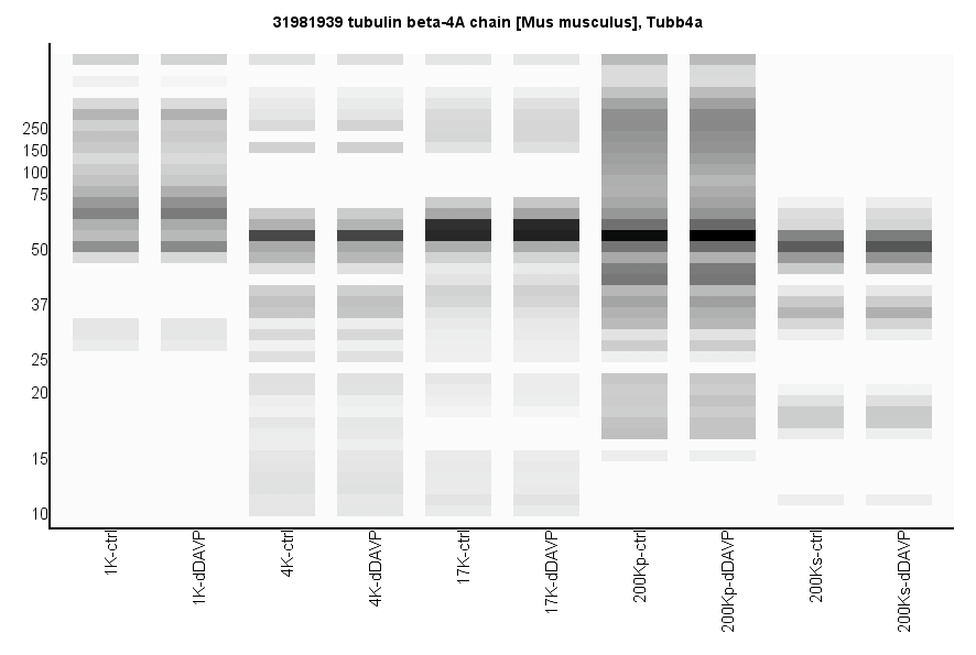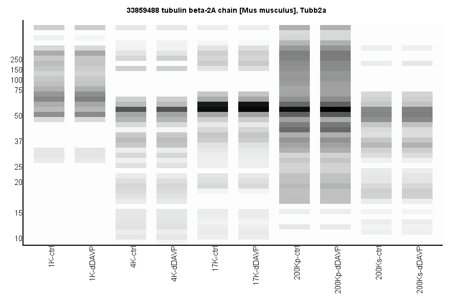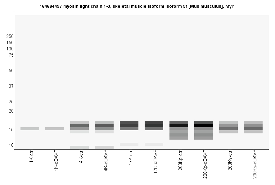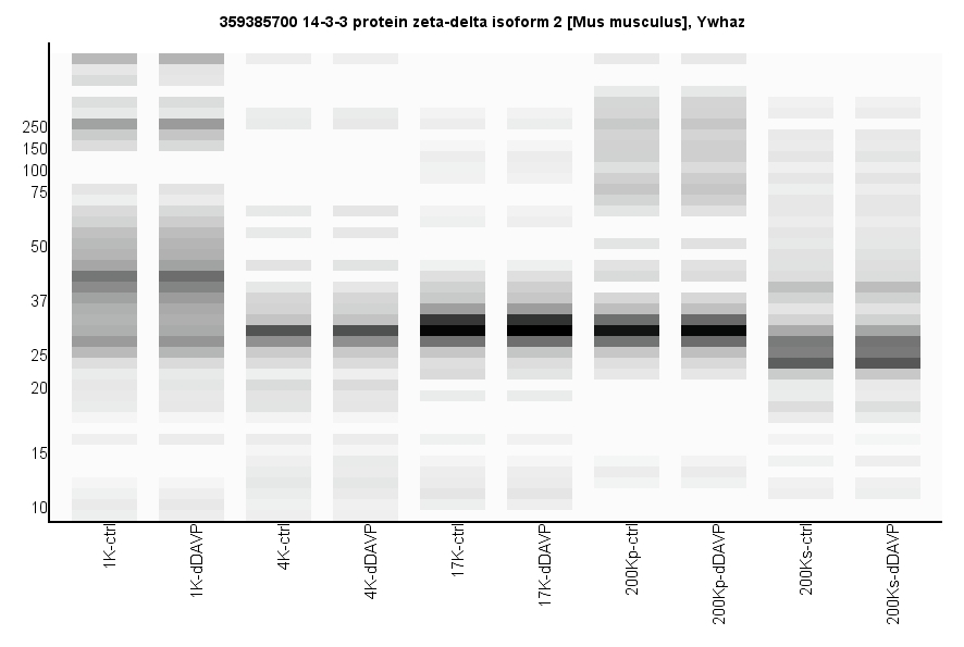 The virtual western blot images show data normalized using a logarithmic conversion scale to map peptide intensities to gray-scale levels. Using this conversion method, low-abundance peptides are generally visible in the blot images. Switch back to the default linear conversion scale database page.