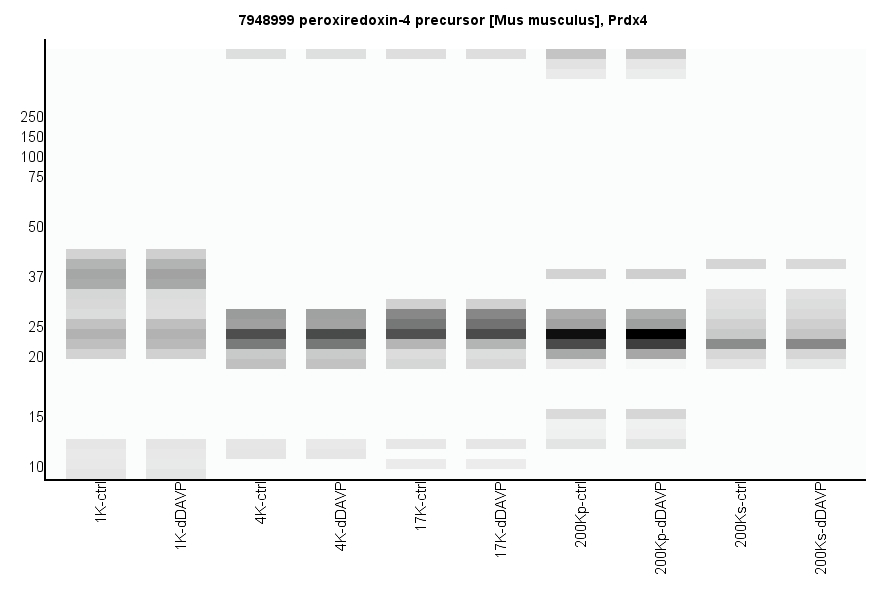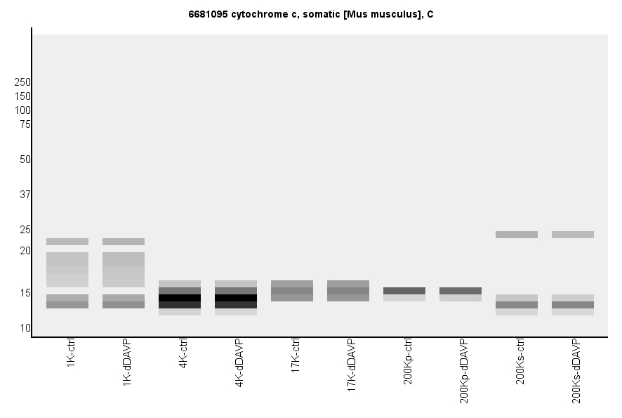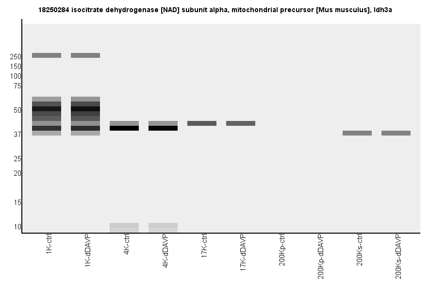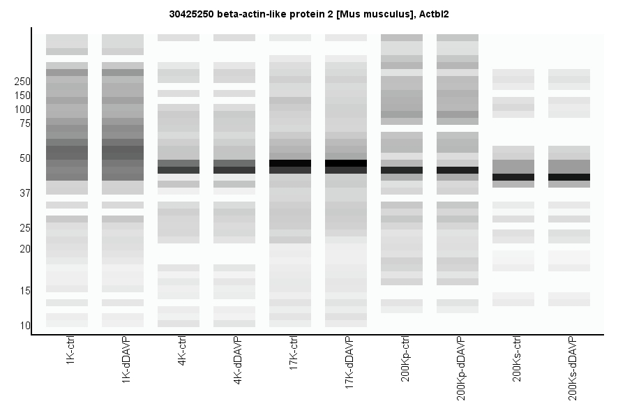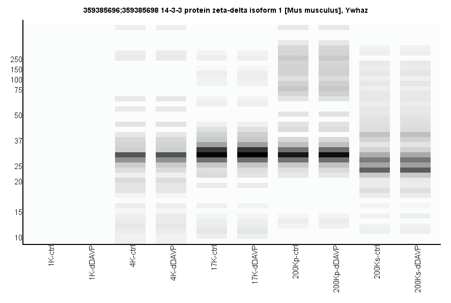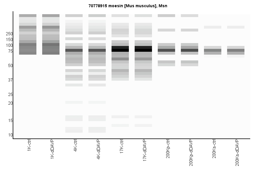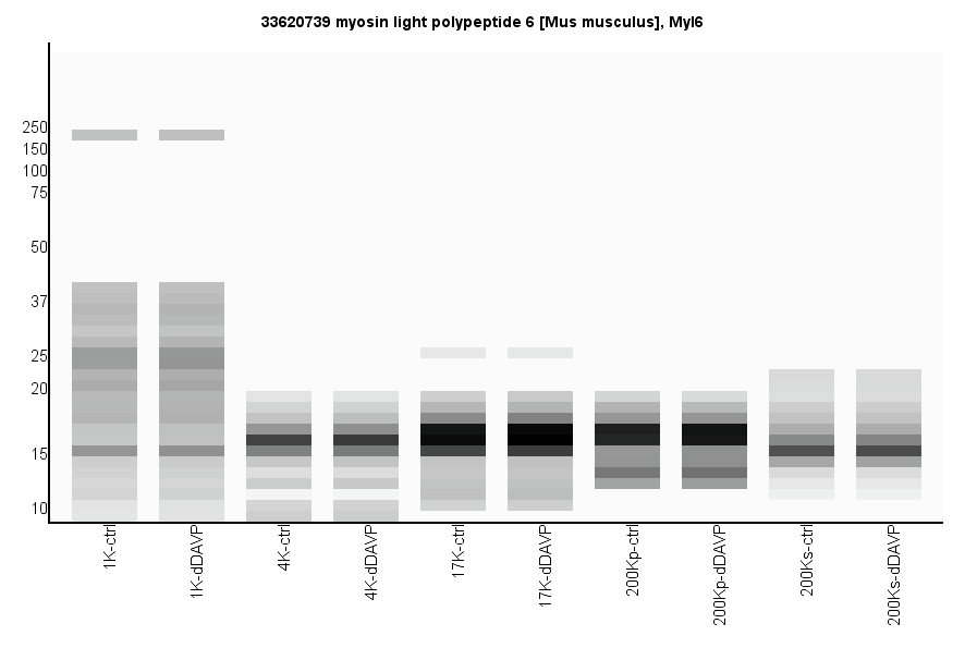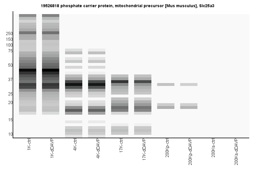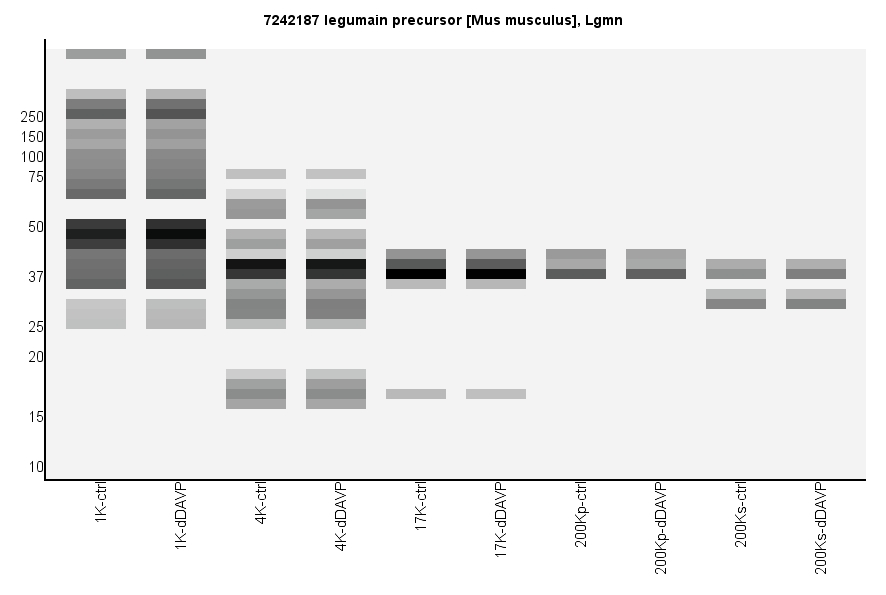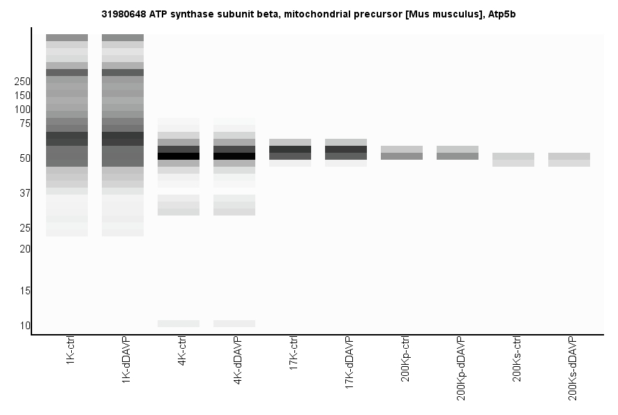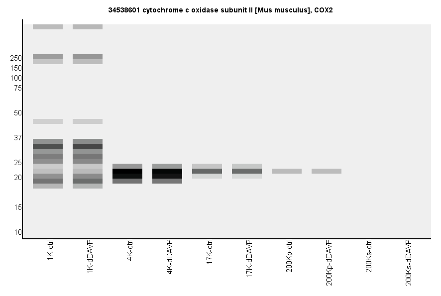 The virtual western blot images show data normalized using a logarithmic conversion scale to map peptide intensities to gray-scale levels. Using this conversion method, low-abundance peptides are generally visible in the blot images. Switch back to the default linear conversion scale database page.