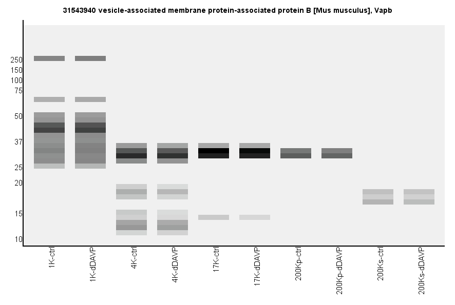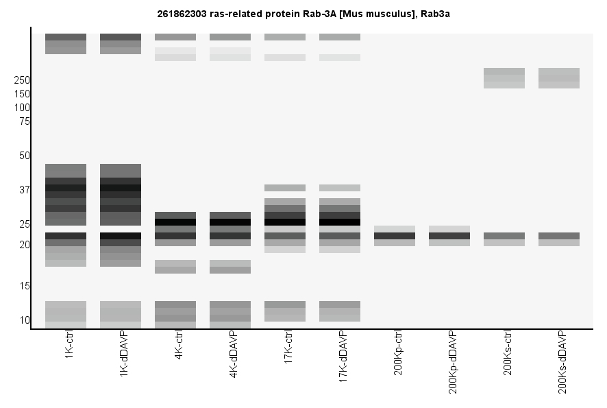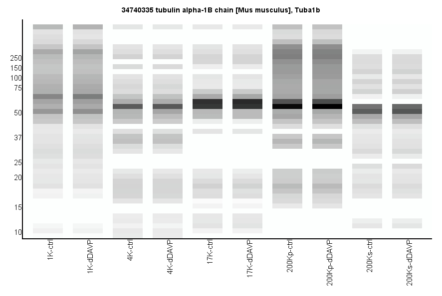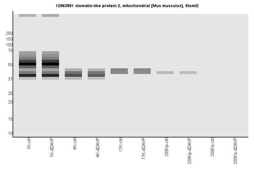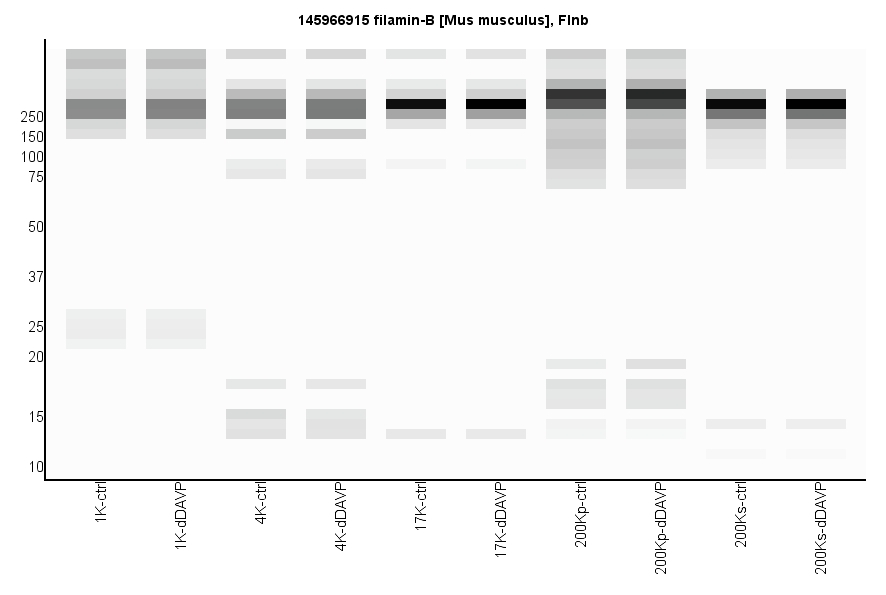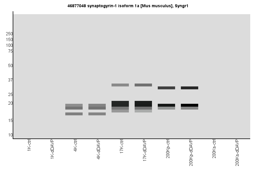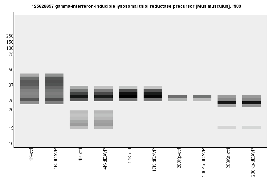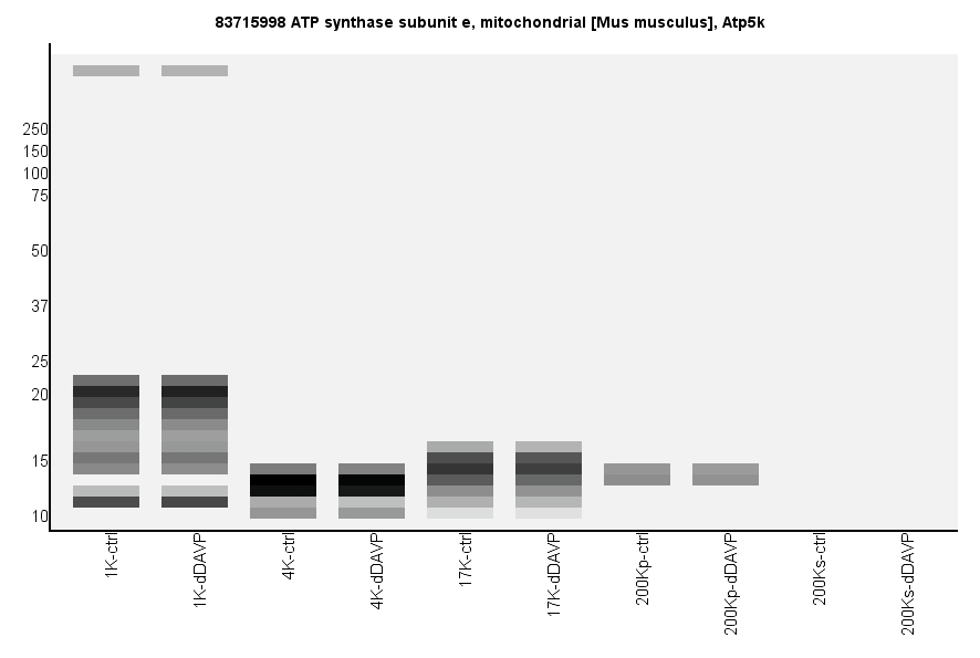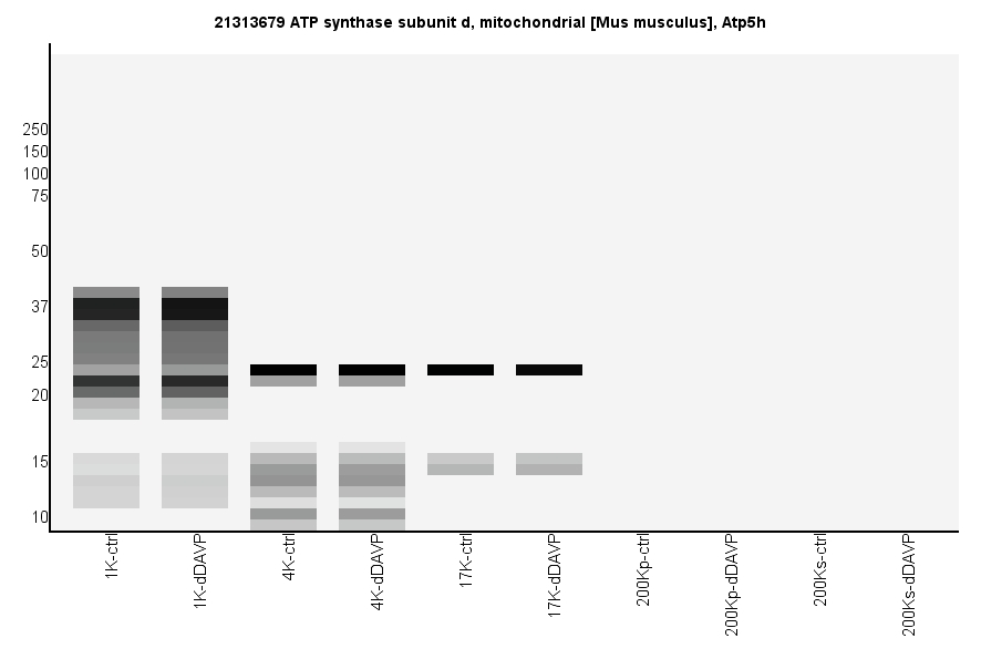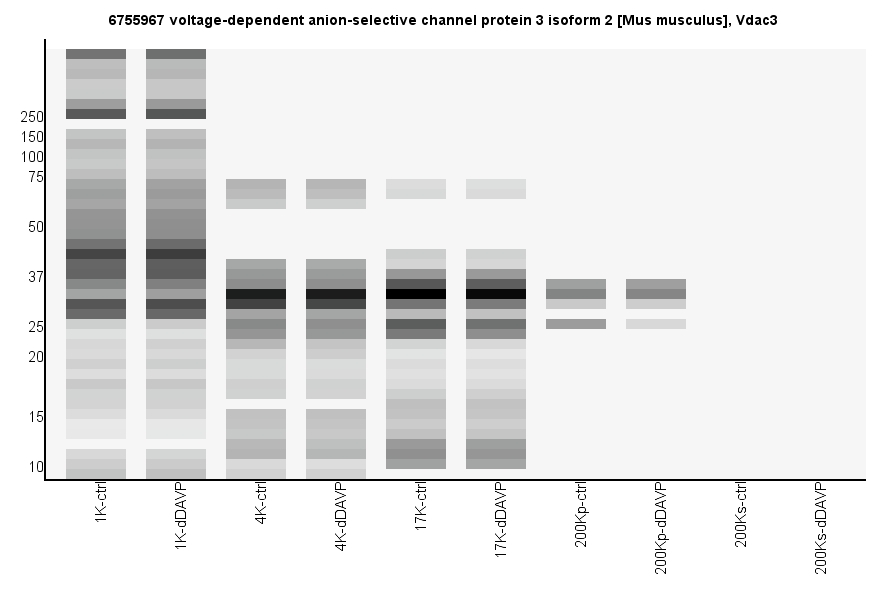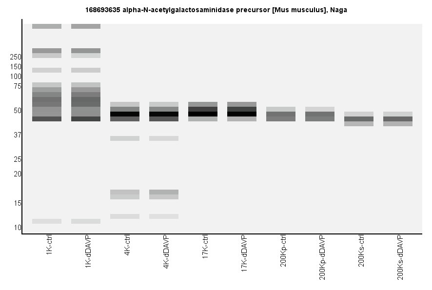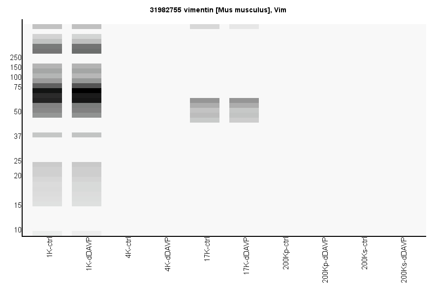 The virtual western blot images show data normalized using a logarithmic conversion scale to map peptide intensities to gray-scale levels. Using this conversion method, low-abundance peptides are generally visible in the blot images. Switch back to the default linear conversion scale database page.