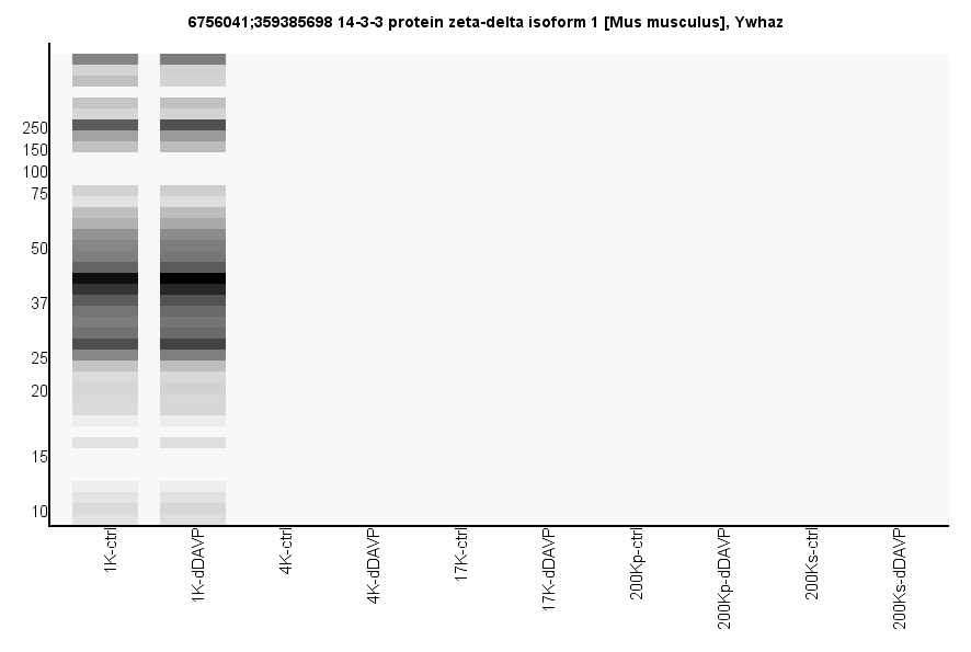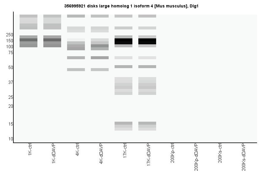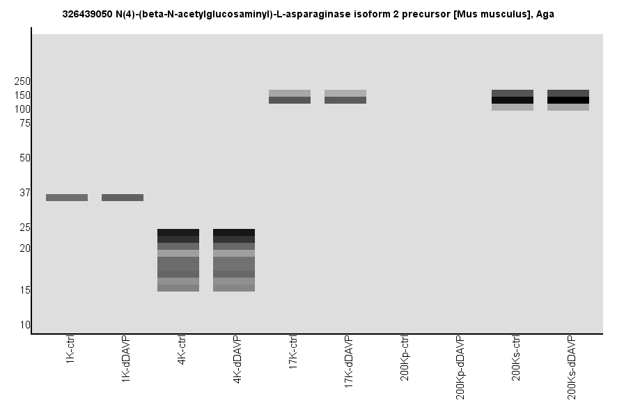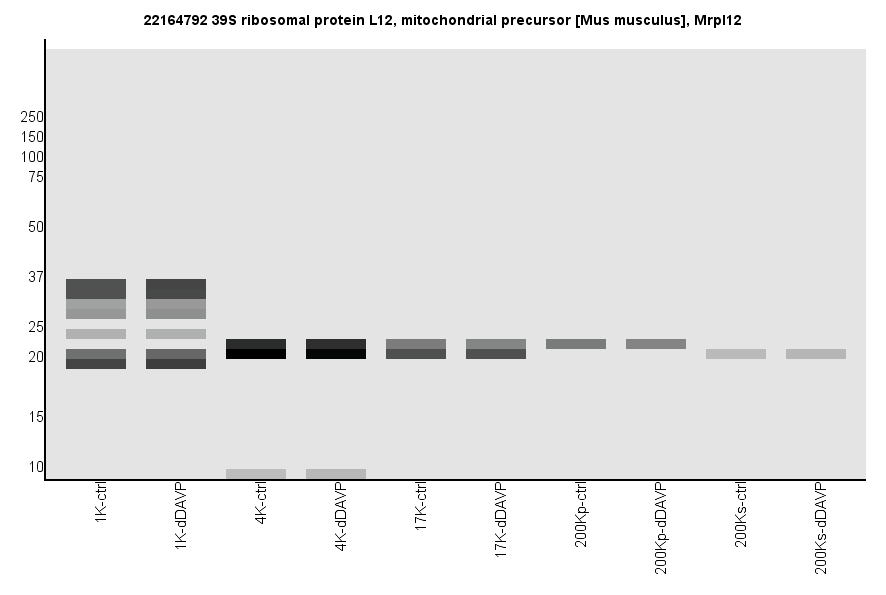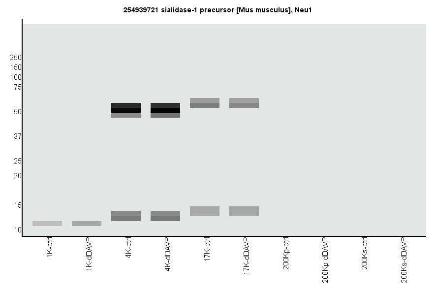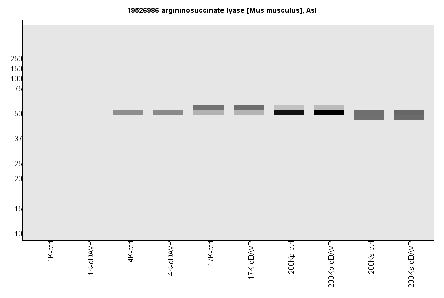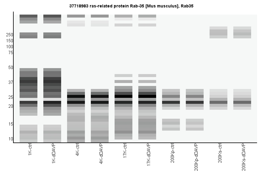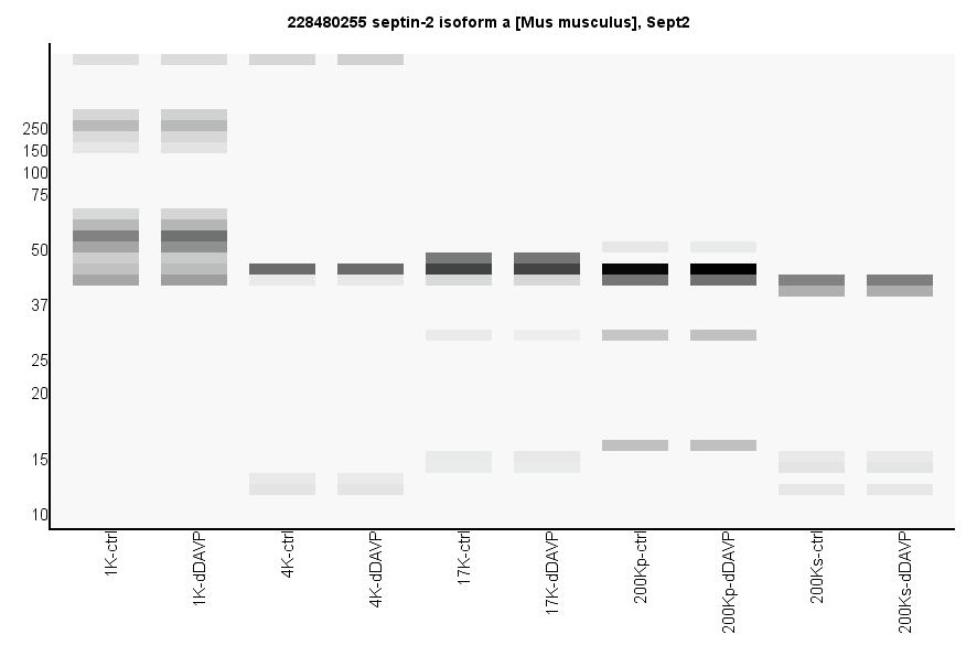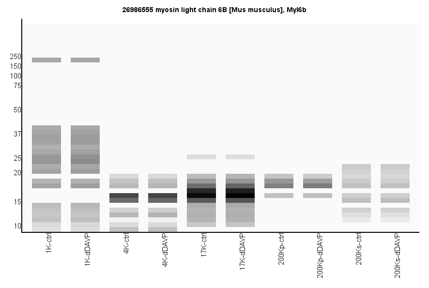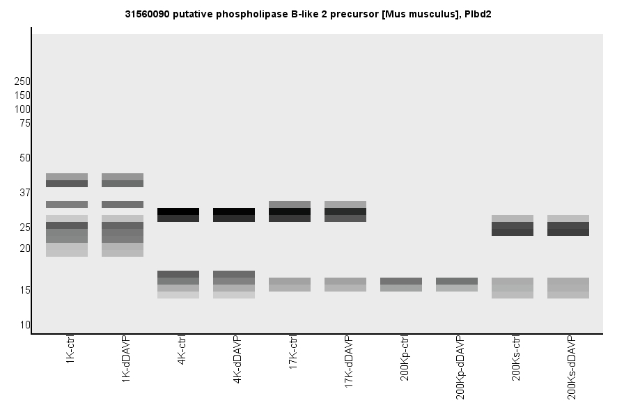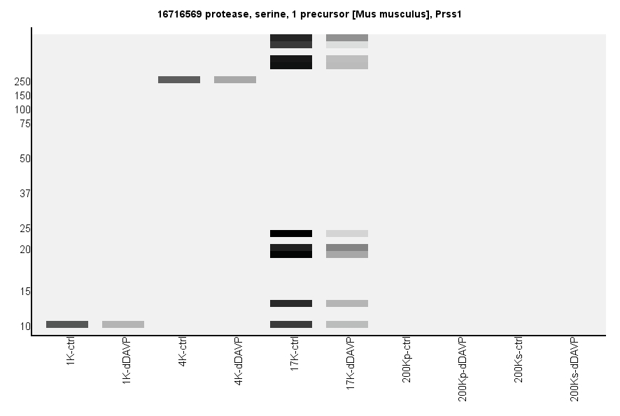 The virtual western blot images show data normalized using a logarithmic conversion scale to map peptide intensities to gray-scale levels. Using this conversion method, low-abundance peptides are generally visible in the blot images. Switch back to the default linear conversion scale database page.