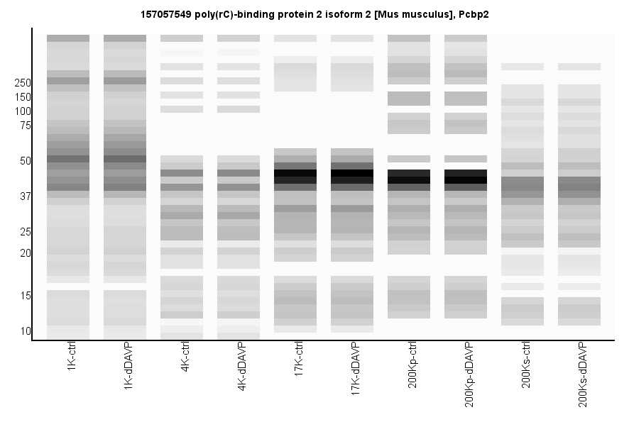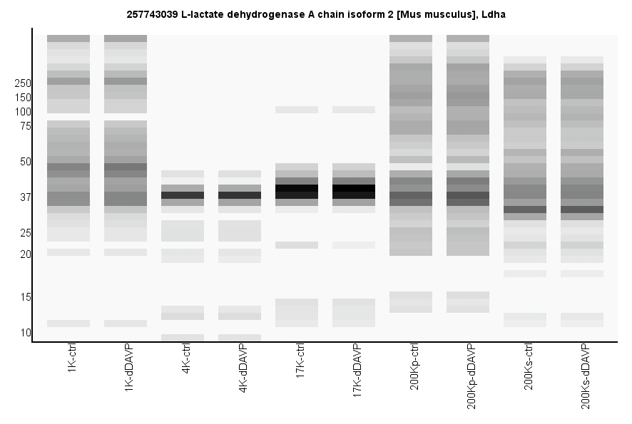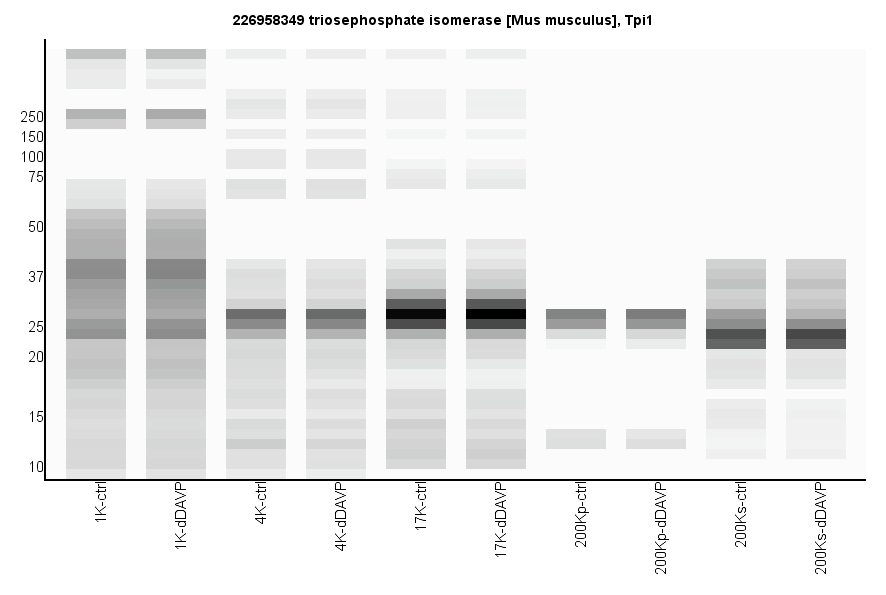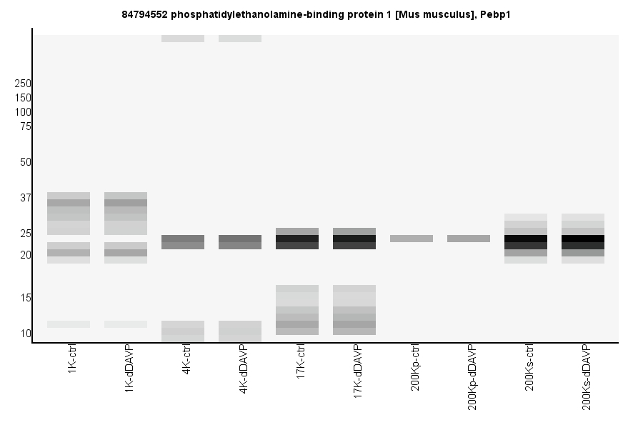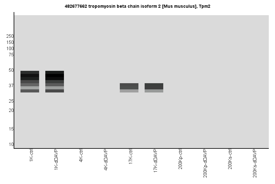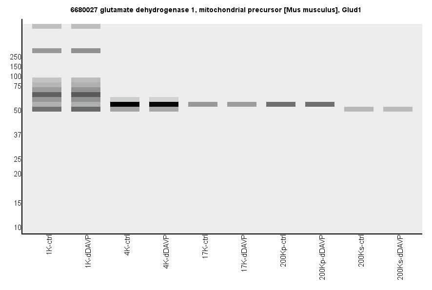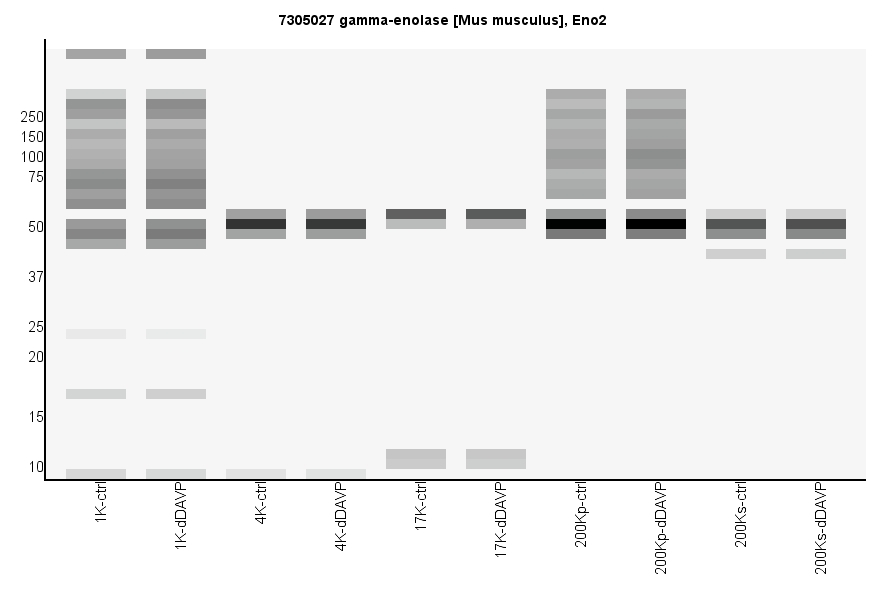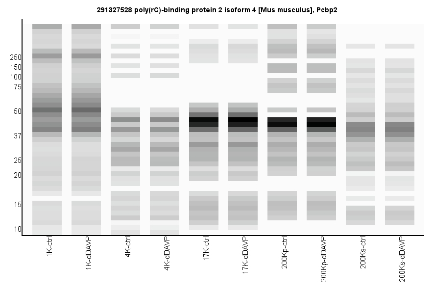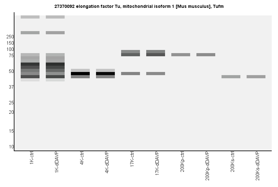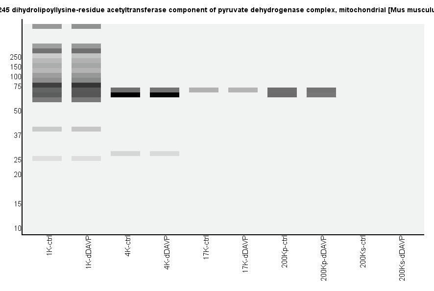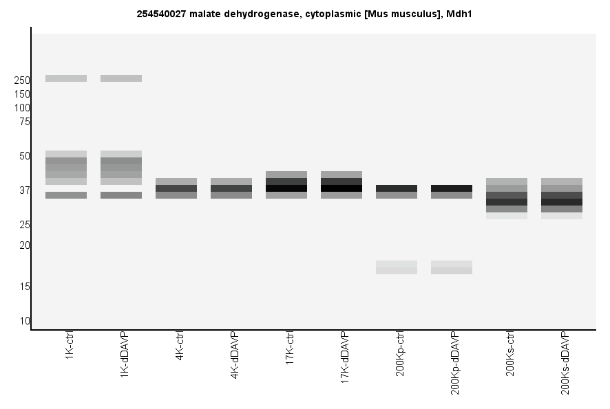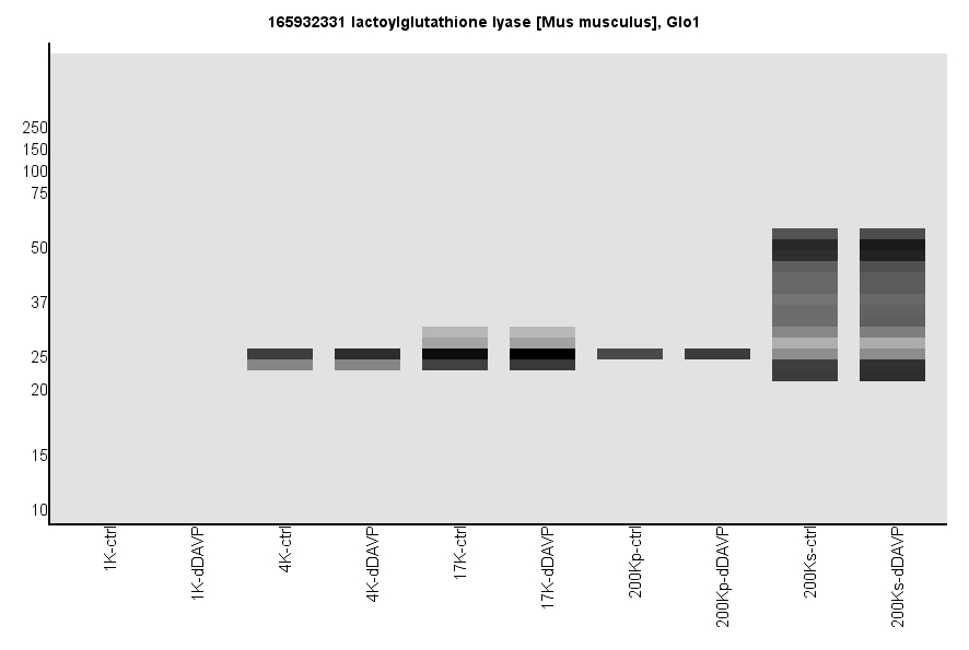 The virtual western blot images show data normalized using a logarithmic conversion scale to map peptide intensities to gray-scale levels. Using this conversion method, low-abundance peptides are generally visible in the blot images. Switch back to the default linear conversion scale database page.