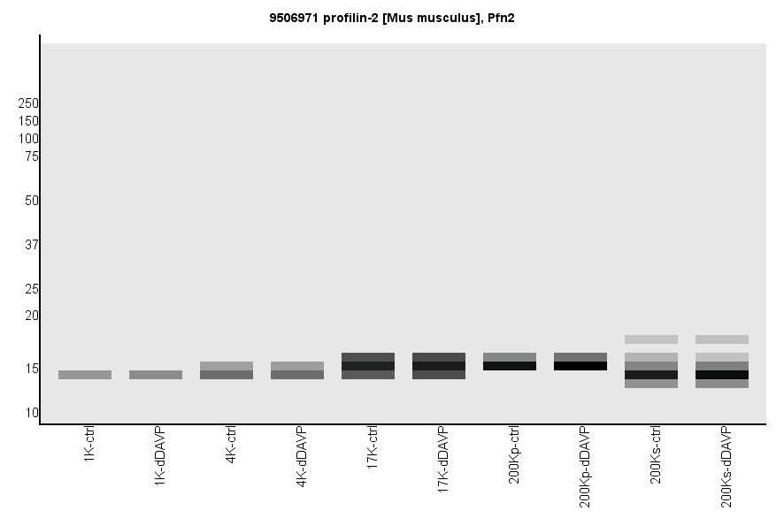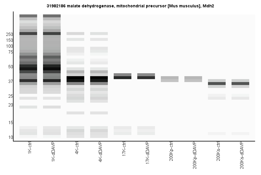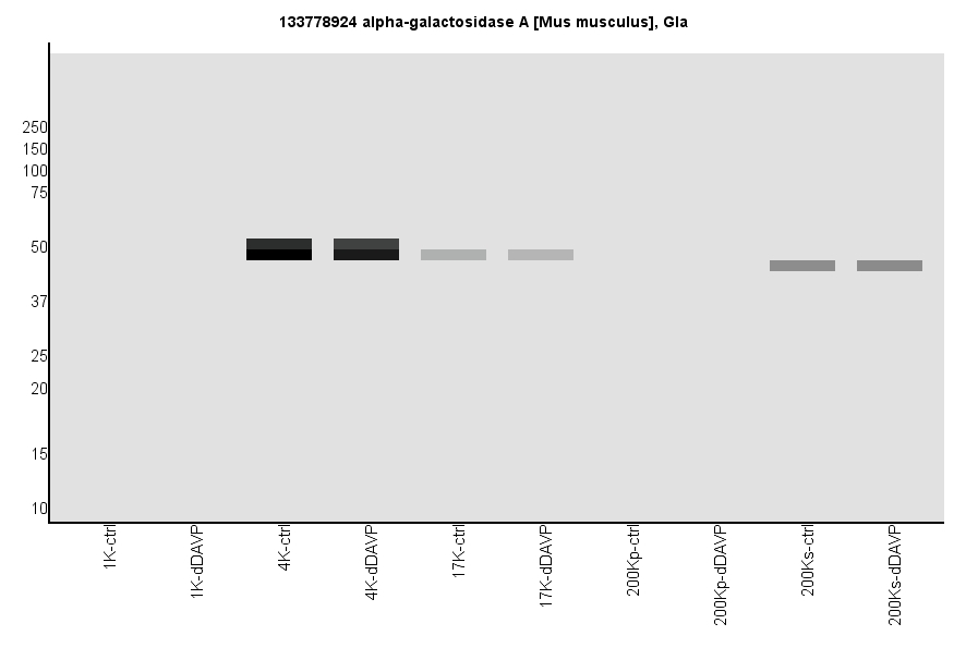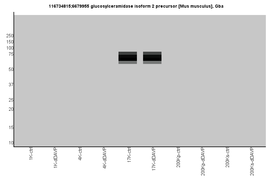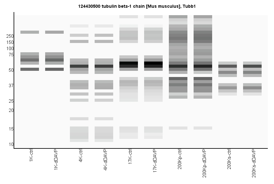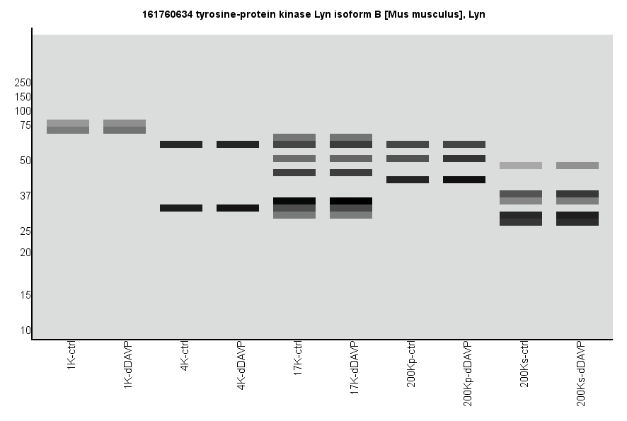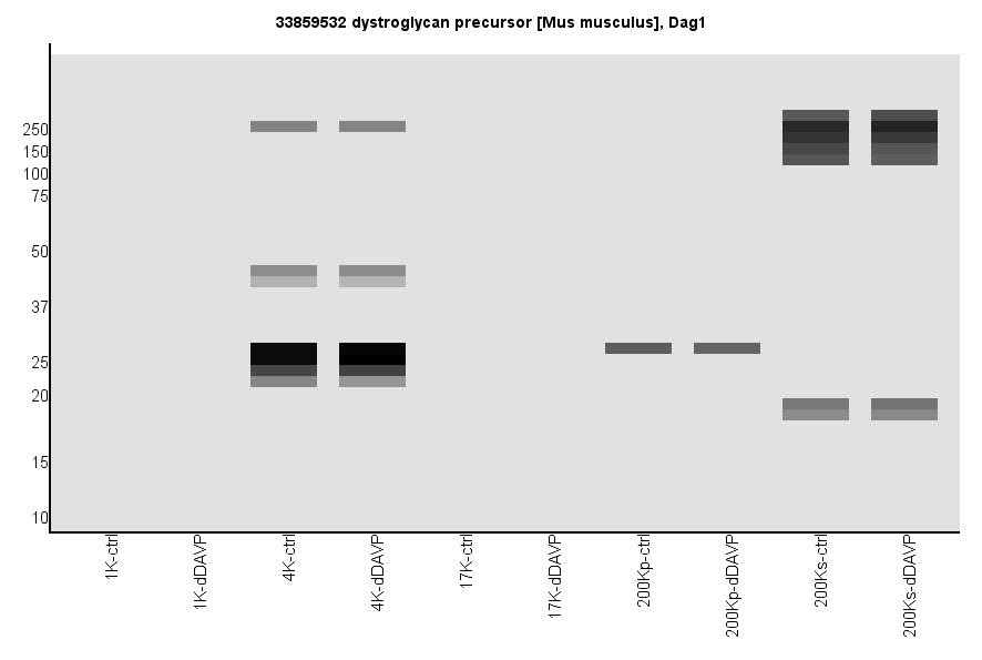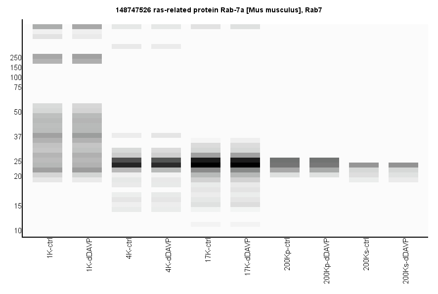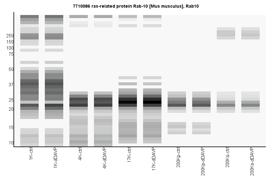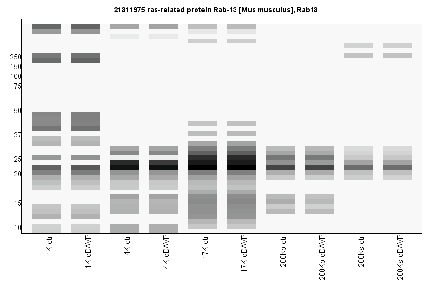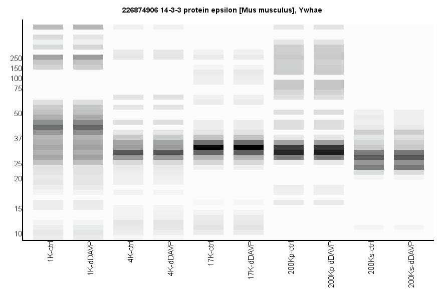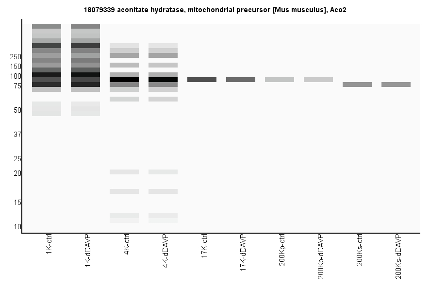The virtual western blot images show data normalized using a logarithmic conversion scale to map peptide intensities to gray-scale levels. Using this conversion method, low-abundance peptides are generally visible in the blot images. Switch back to the default linear conversion scale database page.