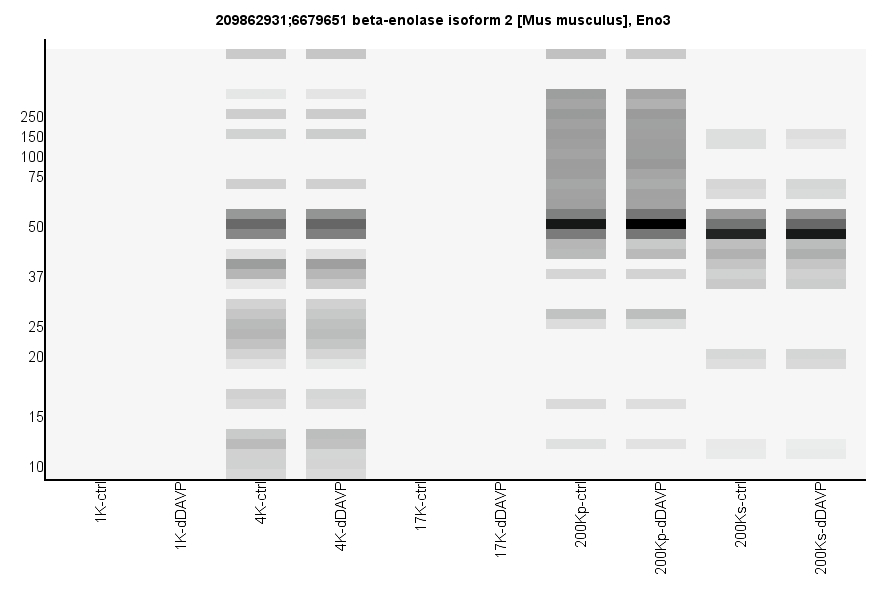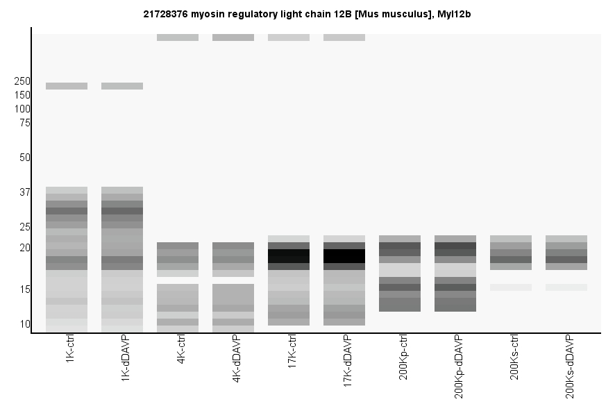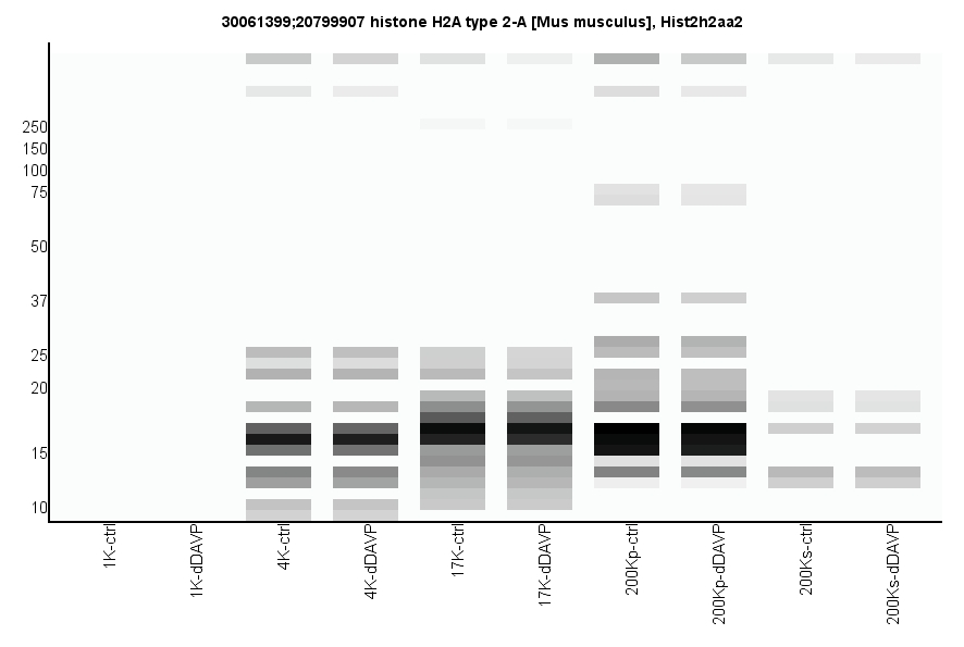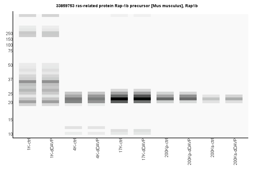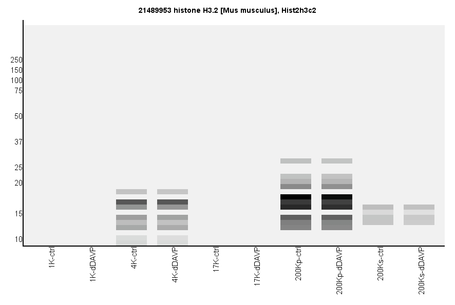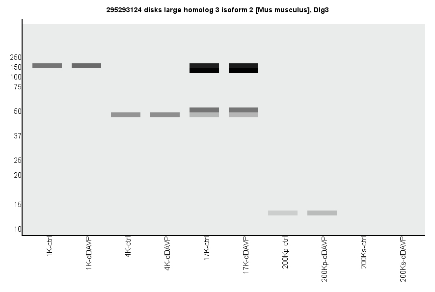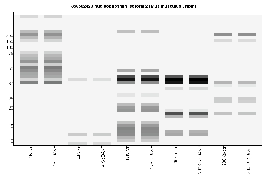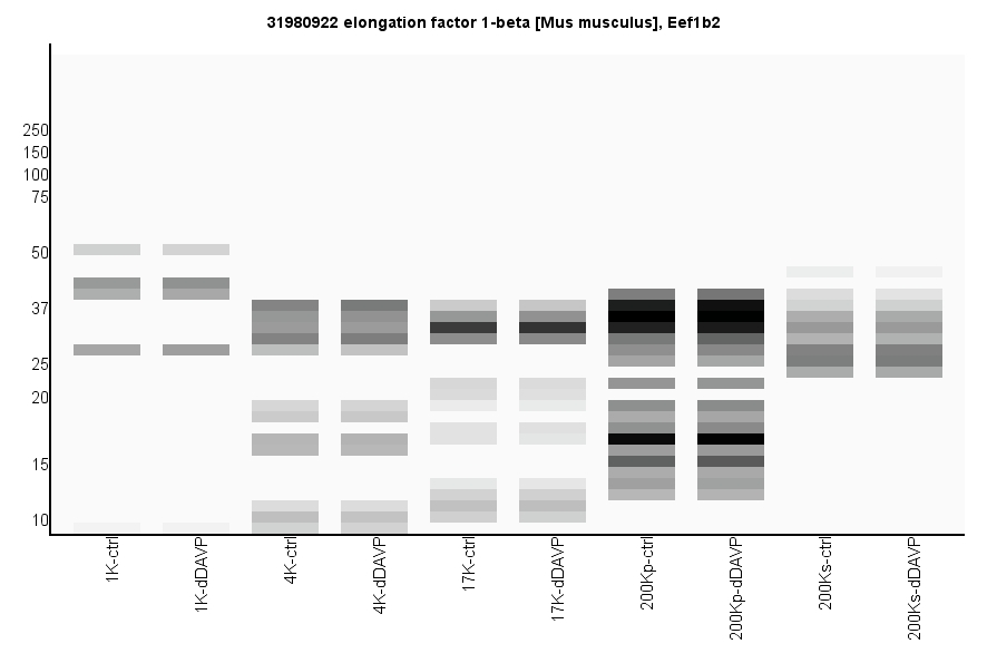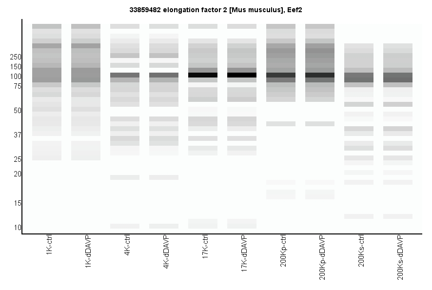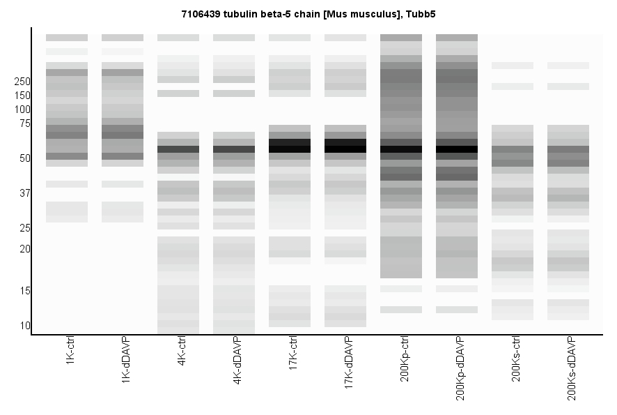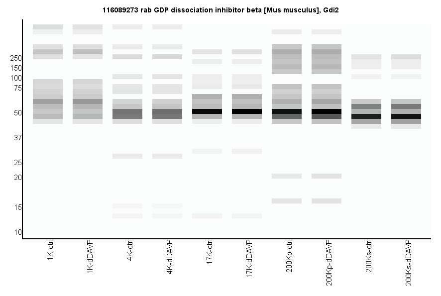 The virtual western blot images show data normalized using a logarithmic conversion scale to map peptide intensities to gray-scale levels. Using this conversion method, low-abundance peptides are generally visible in the blot images. Switch back to the default linear conversion scale database page.