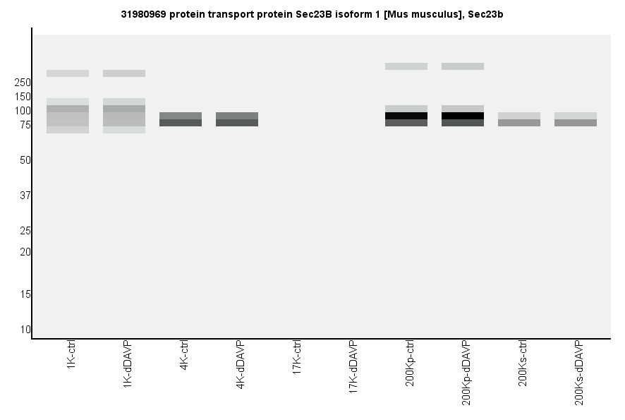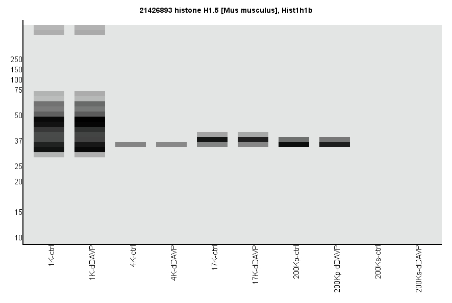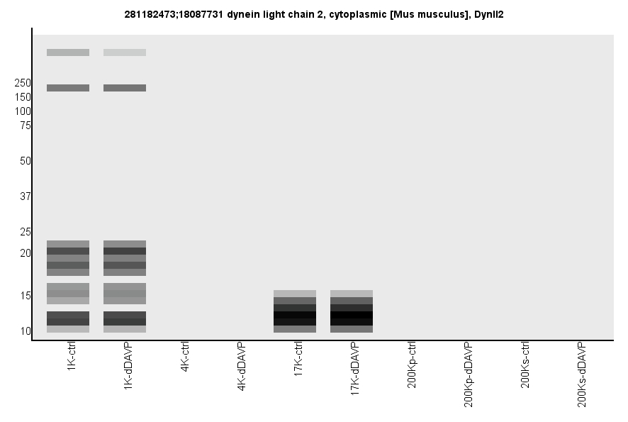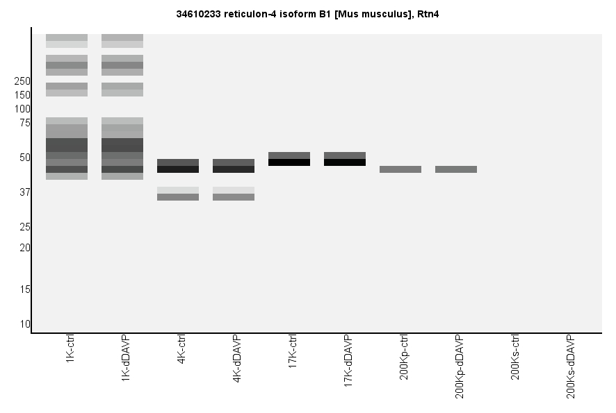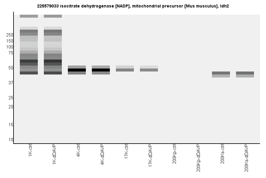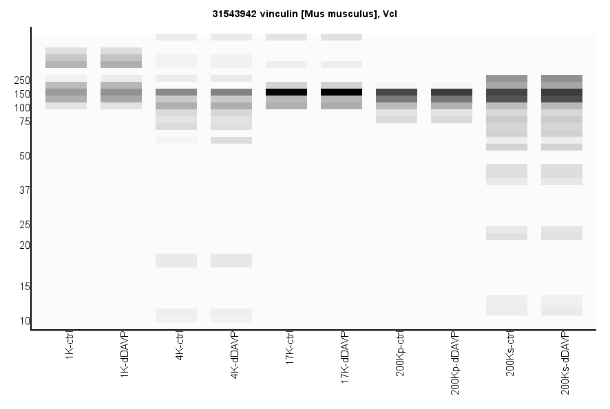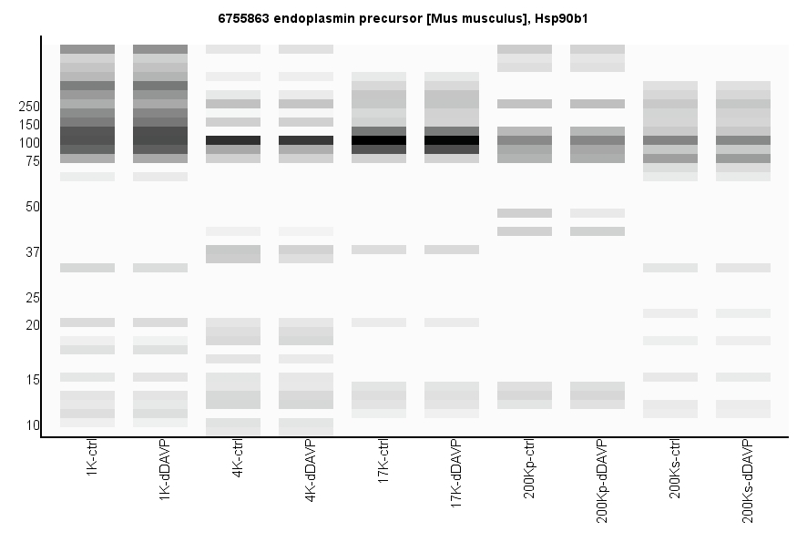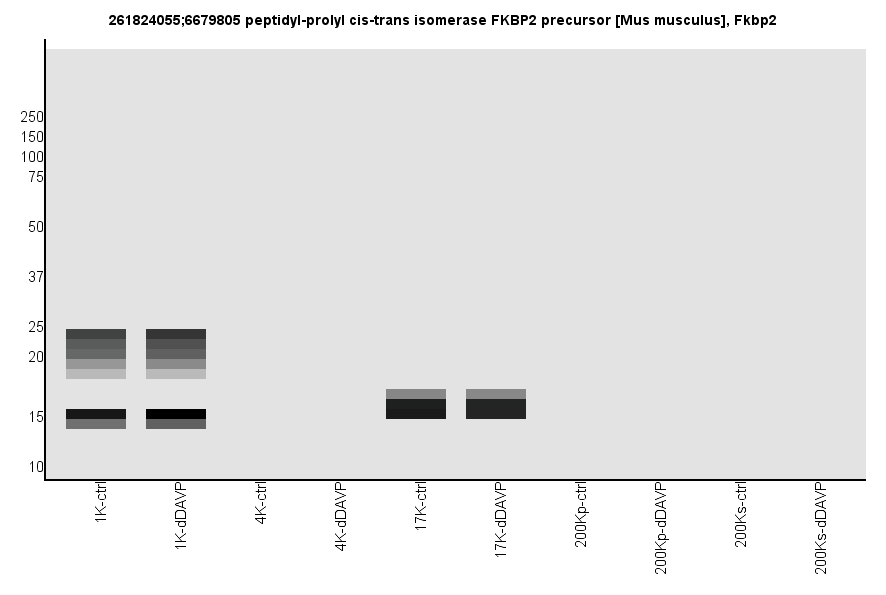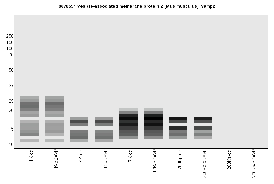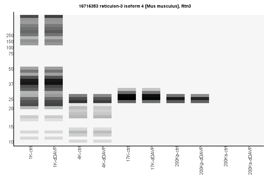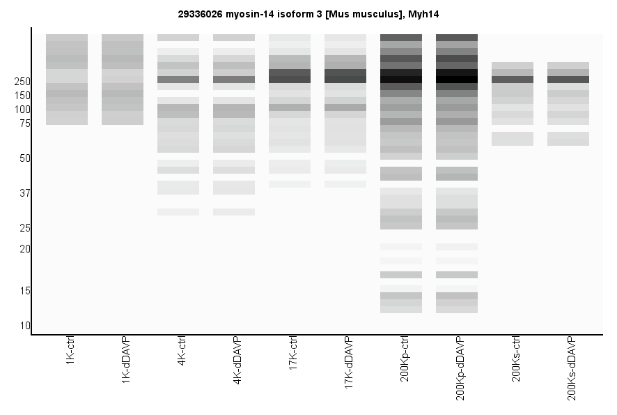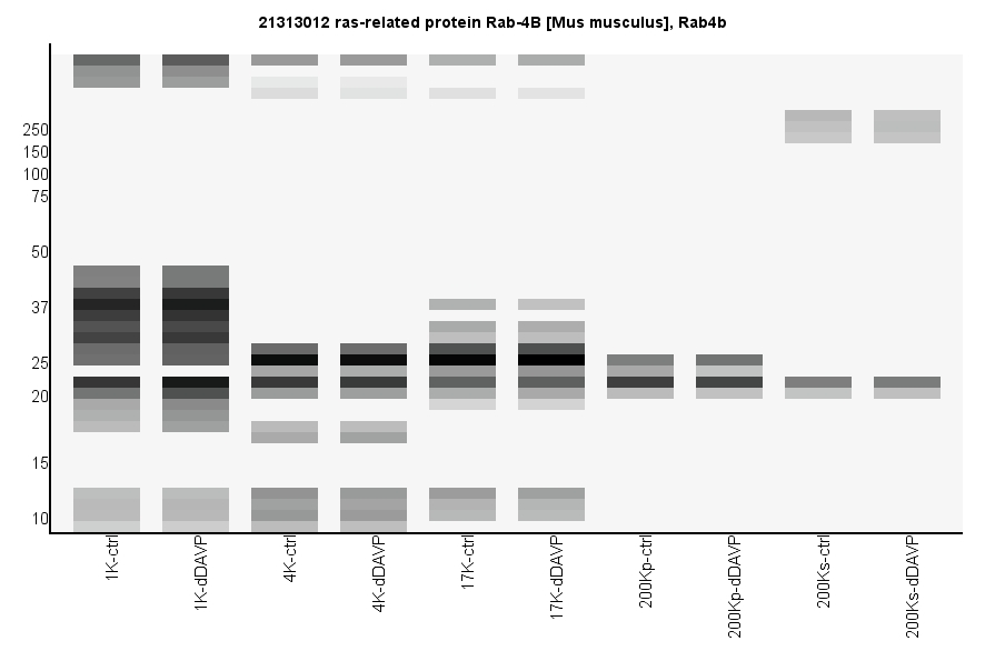 The virtual western blot images show data normalized using a logarithmic conversion scale to map peptide intensities to gray-scale levels. Using this conversion method, low-abundance peptides are generally visible in the blot images. Switch back to the default linear conversion scale database page.
