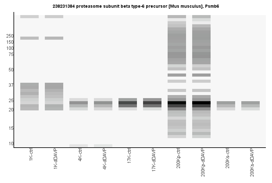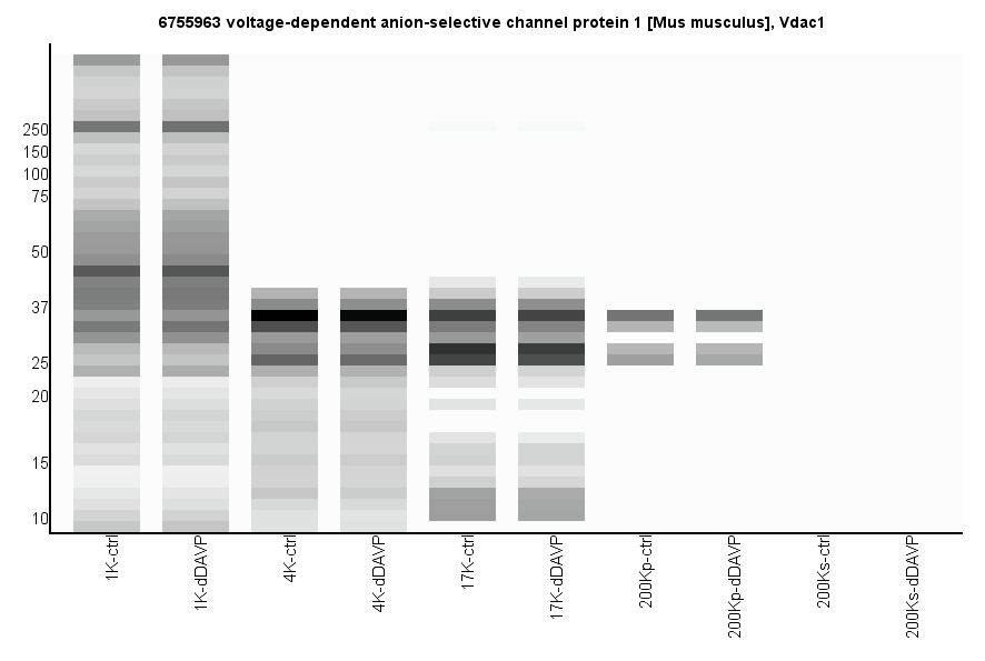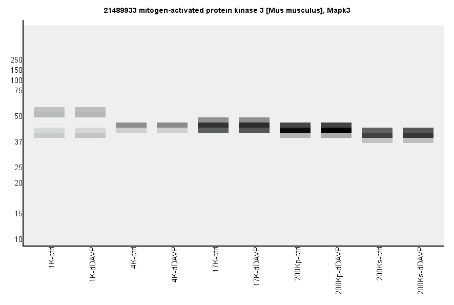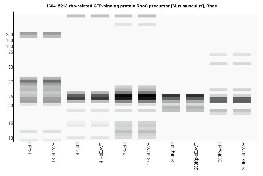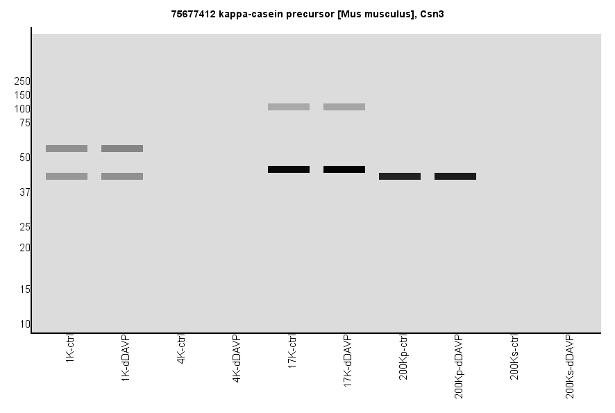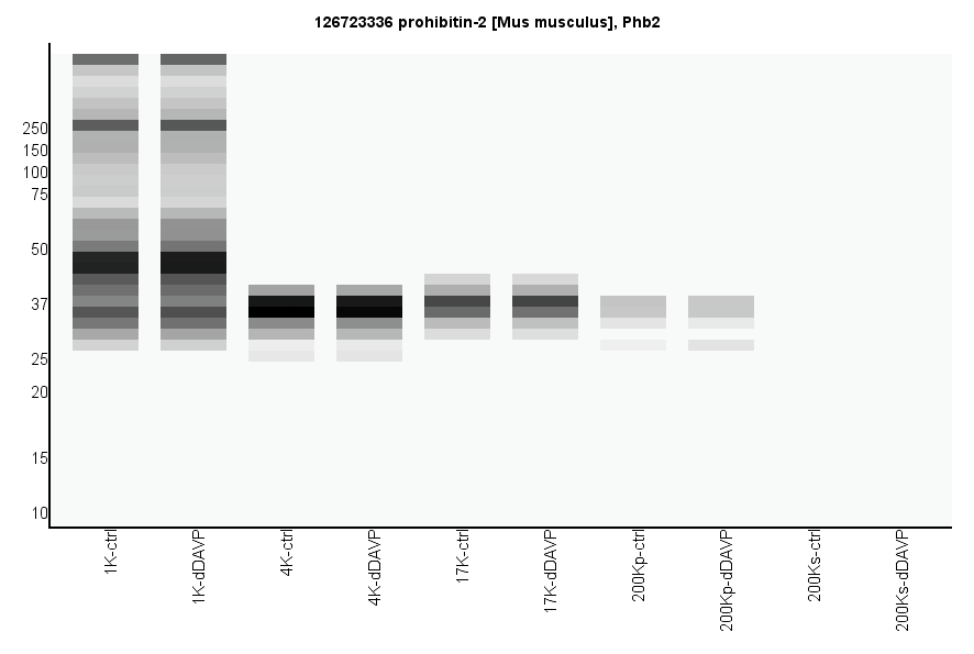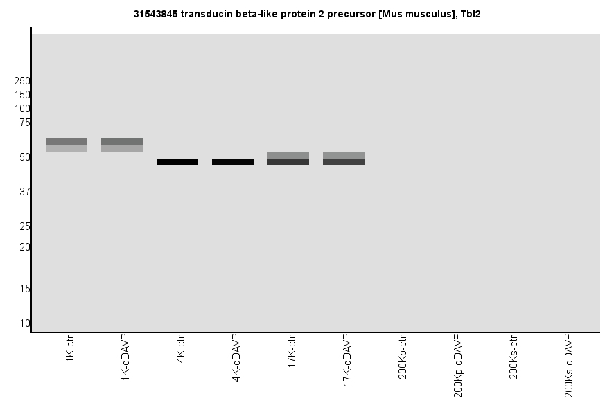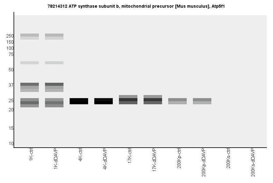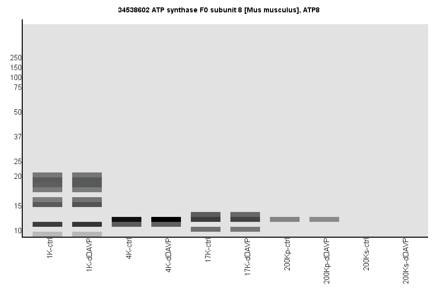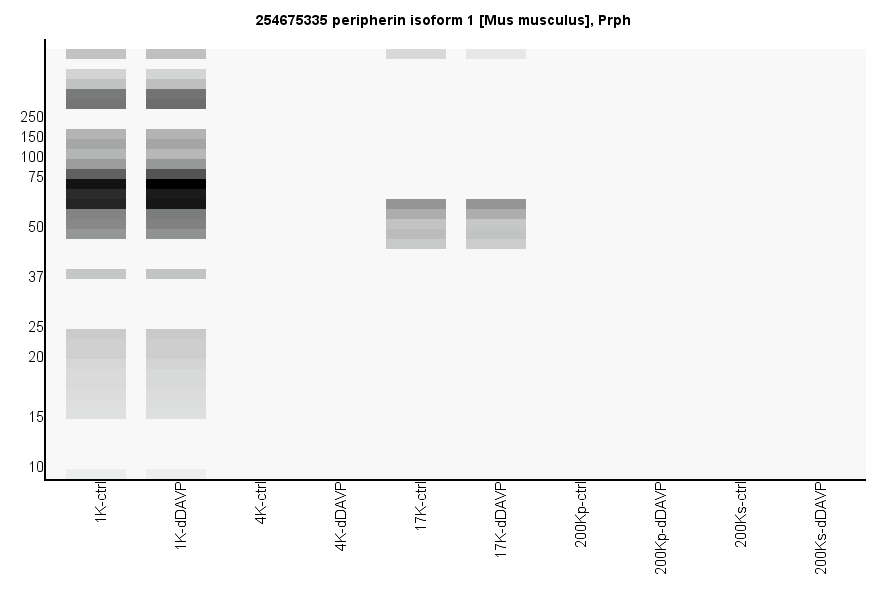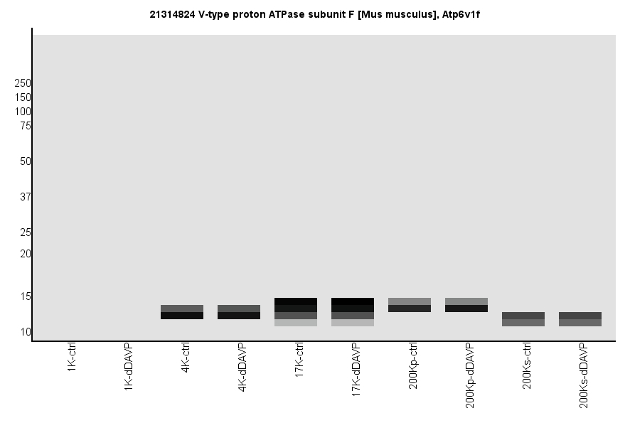 The virtual western blot images show data normalized using a logarithmic conversion scale to map peptide intensities to gray-scale levels. Using this conversion method, low-abundance peptides are generally visible in the blot images. Switch back to the default linear conversion scale database page.
