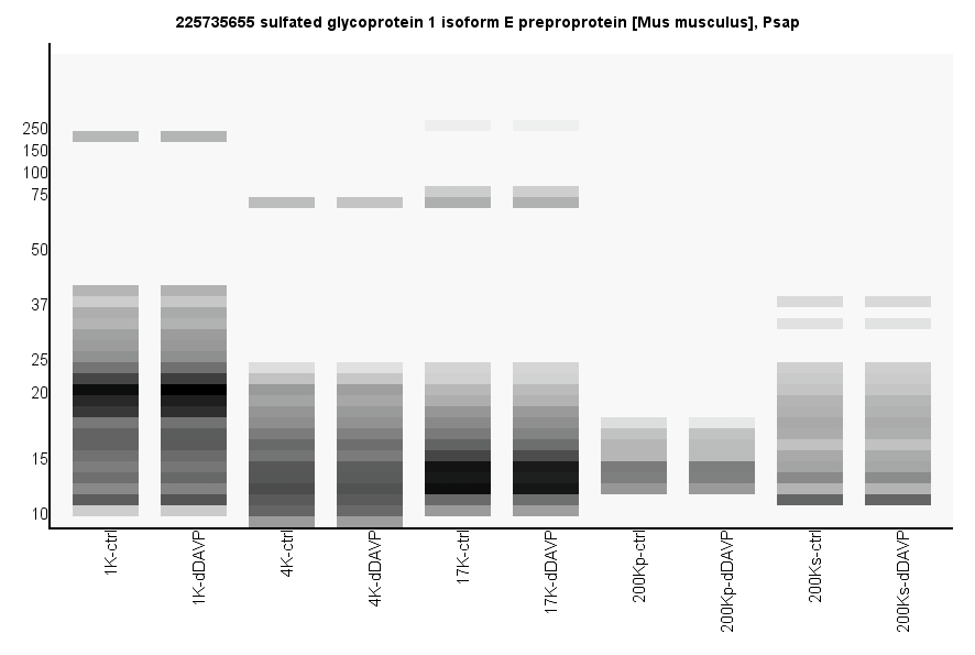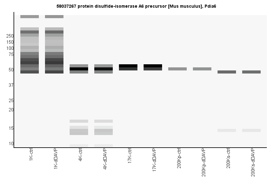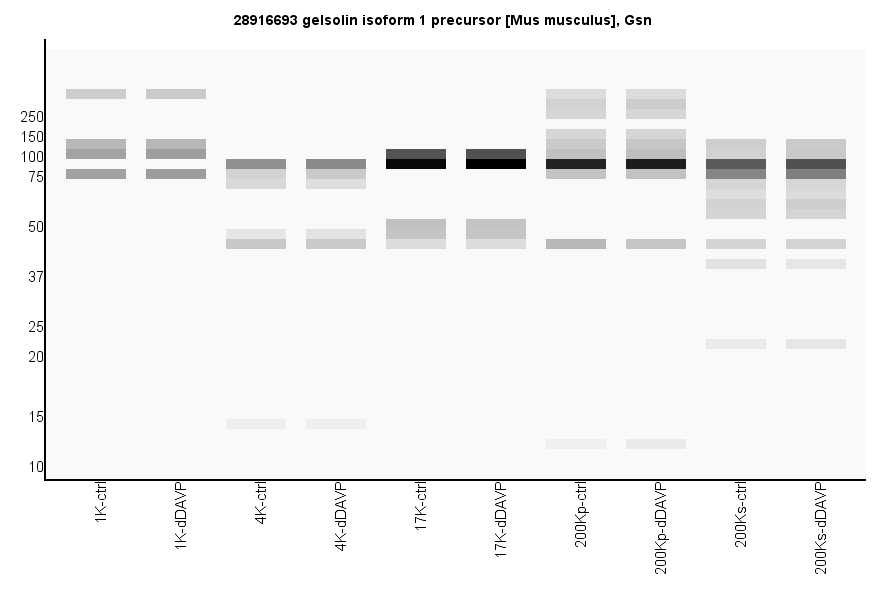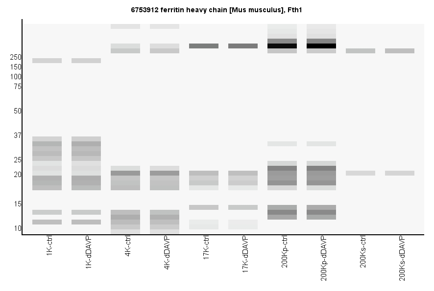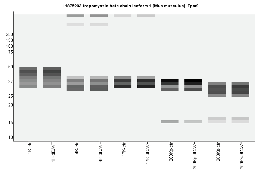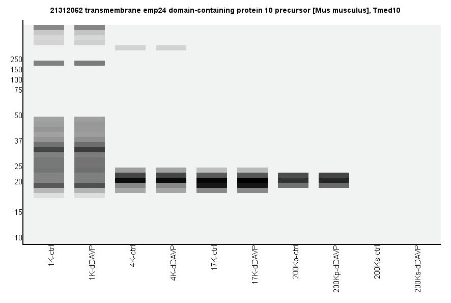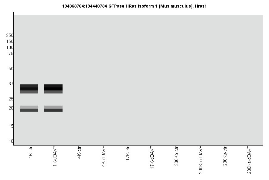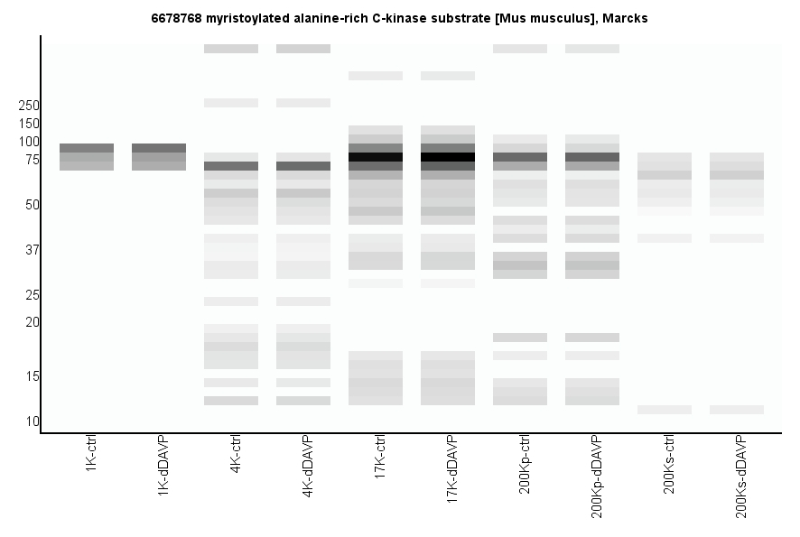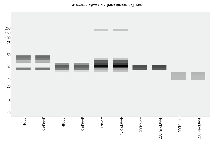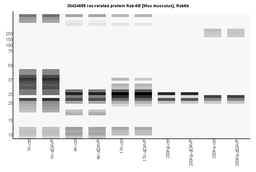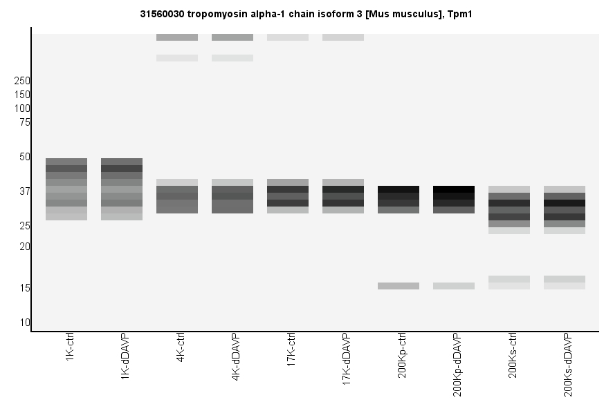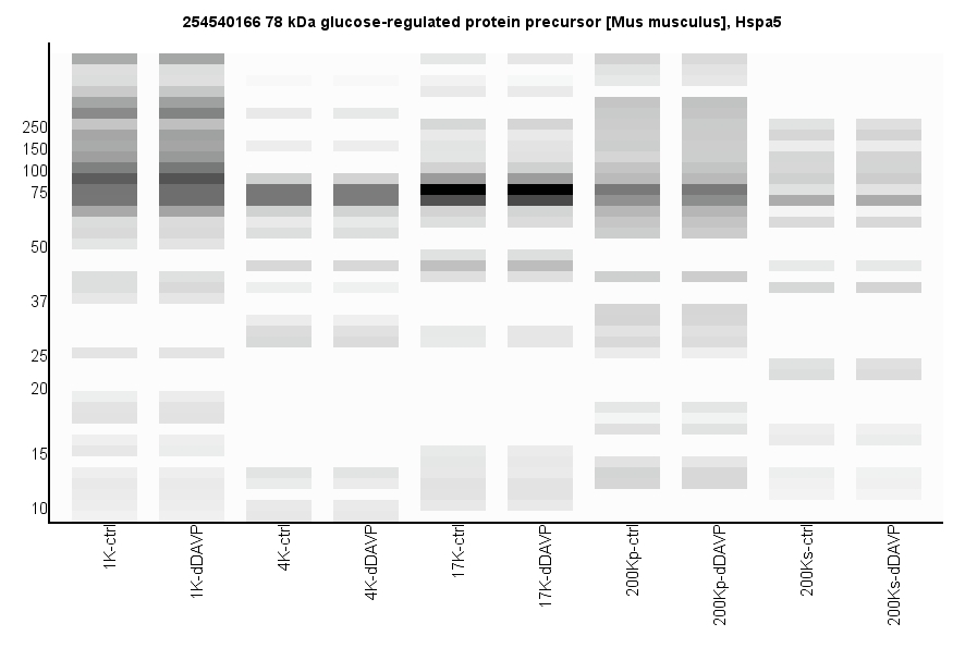 The virtual western blot images show data normalized using a logarithmic conversion scale to map peptide intensities to gray-scale levels. Using this conversion method, low-abundance peptides are generally visible in the blot images. Switch back to the default linear conversion scale database page.