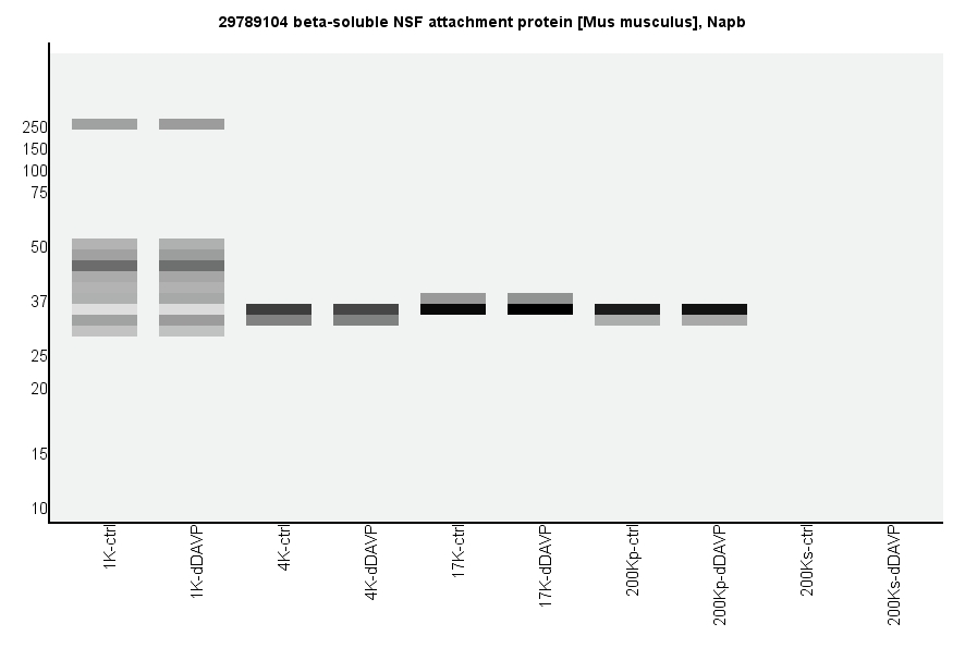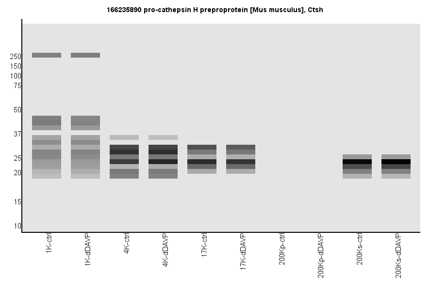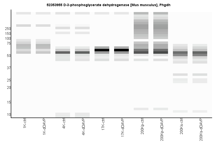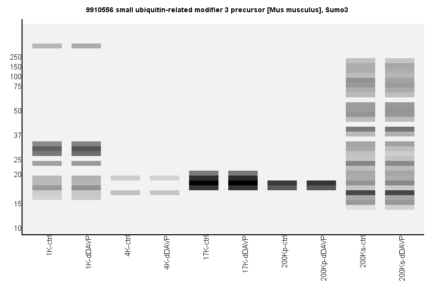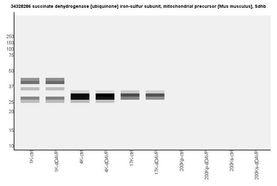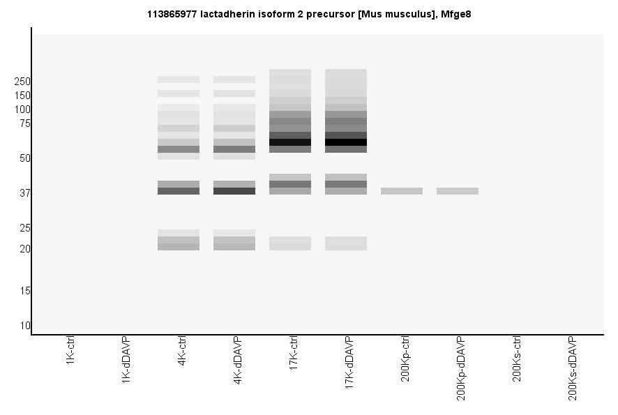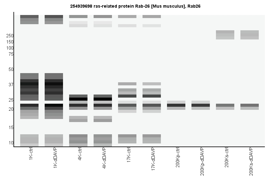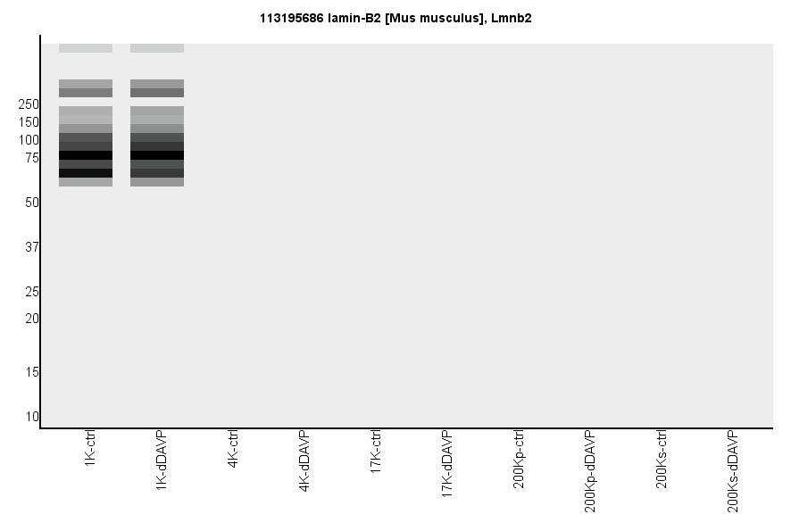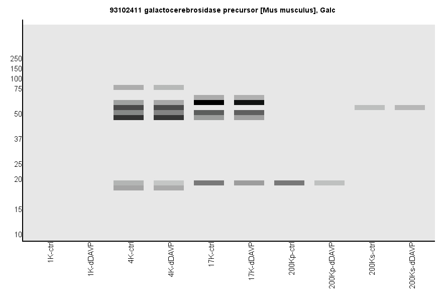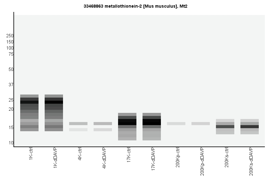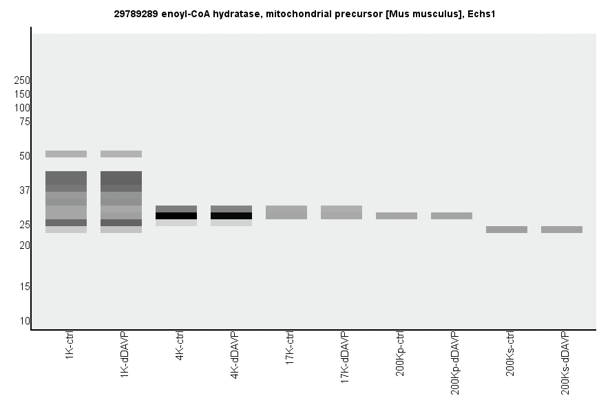 The virtual western blot images show data normalized using a logarithmic conversion scale to map peptide intensities to gray-scale levels. Using this conversion method, low-abundance peptides are generally visible in the blot images. Switch back to the default linear conversion scale database page.