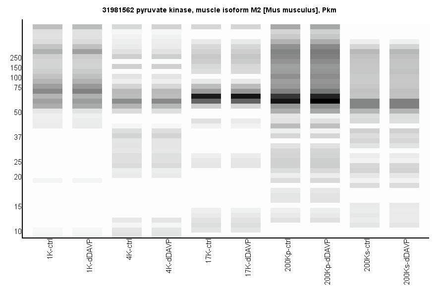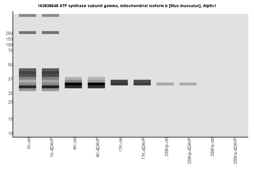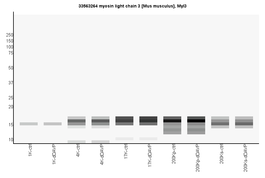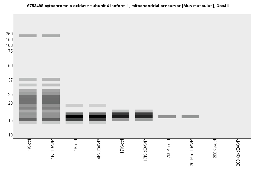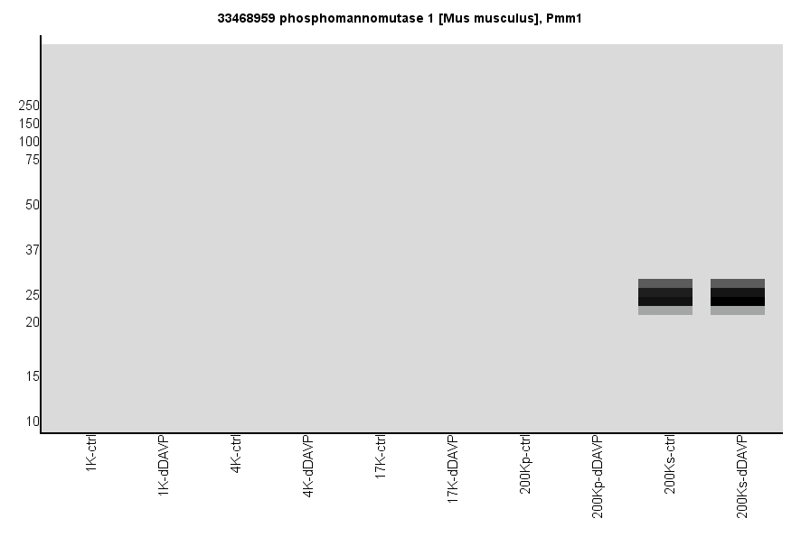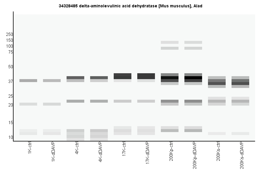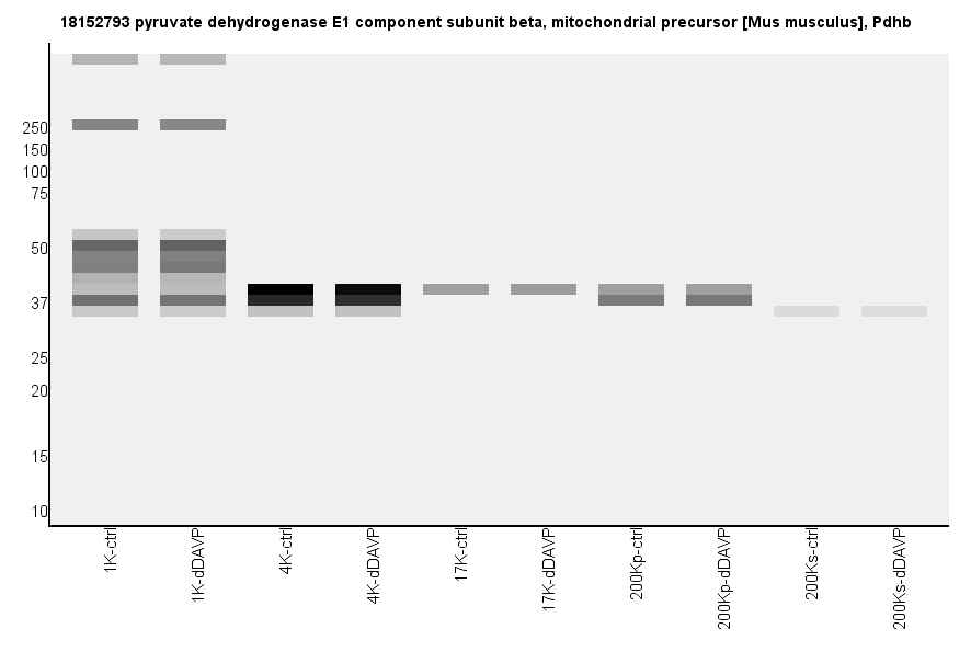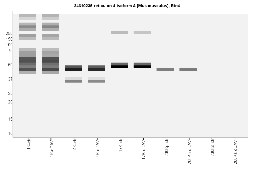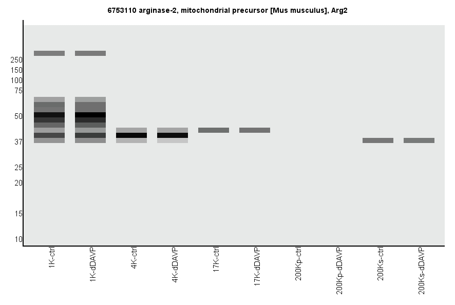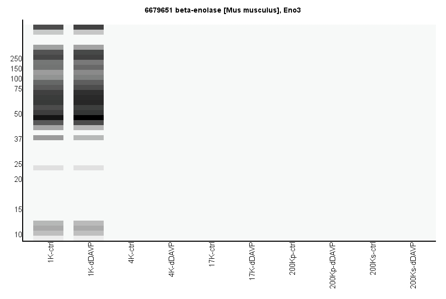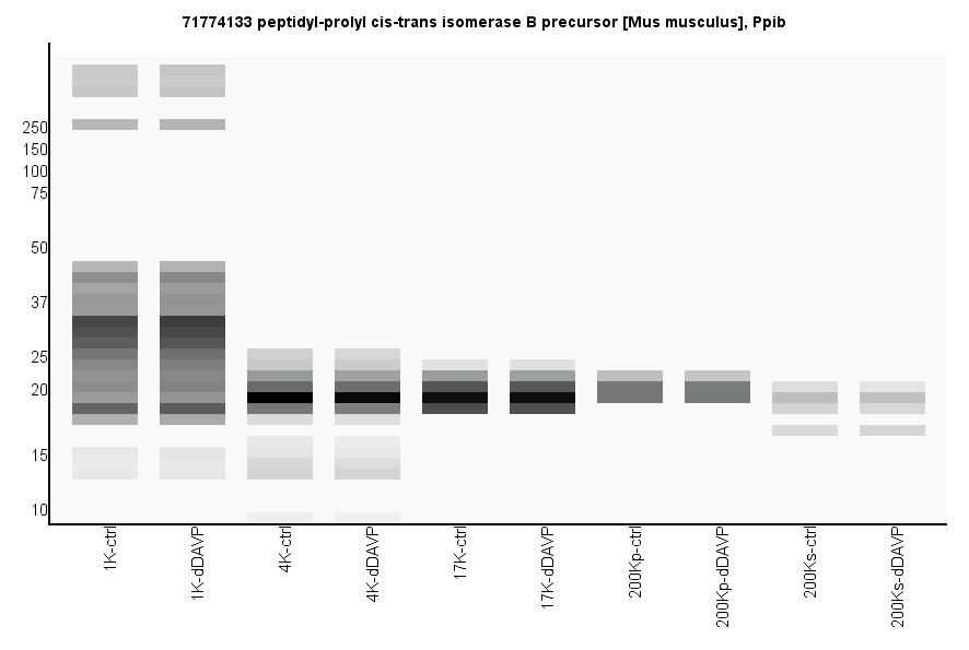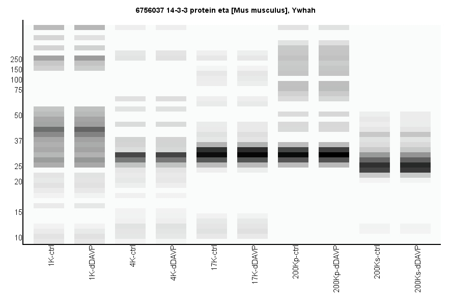 The virtual western blot images show data normalized using a logarithmic conversion scale to map peptide intensities to gray-scale levels. Using this conversion method, low-abundance peptides are generally visible in the blot images. Switch back to the default linear conversion scale database page.