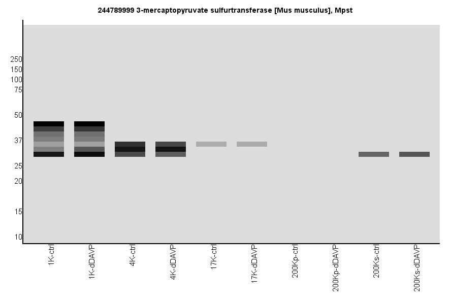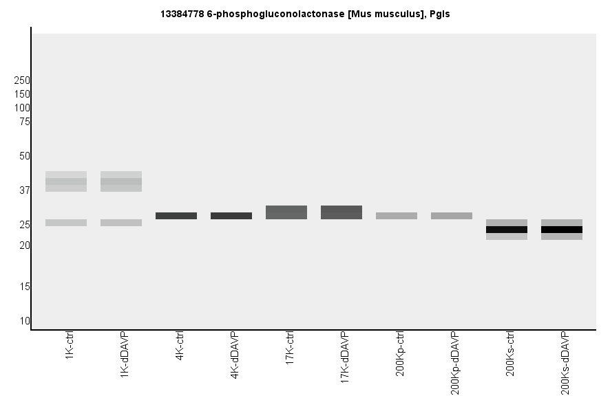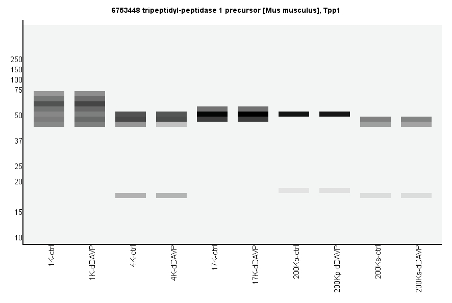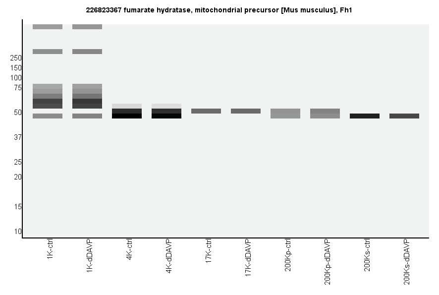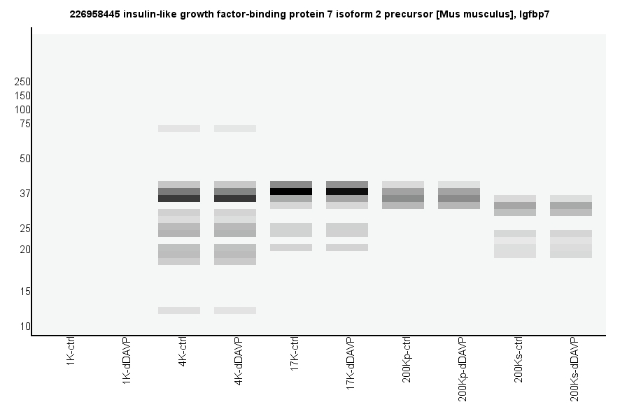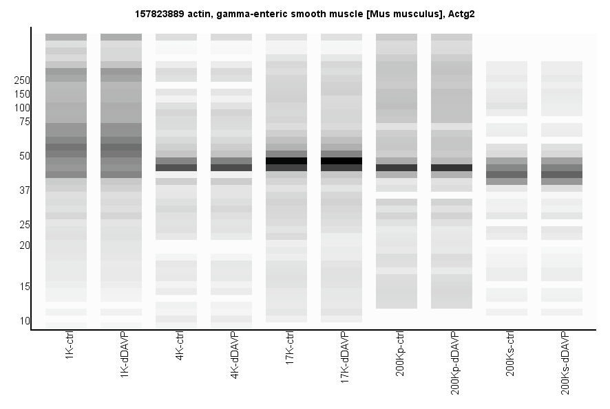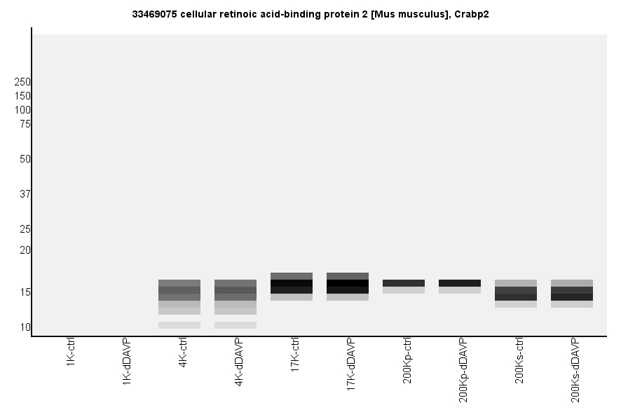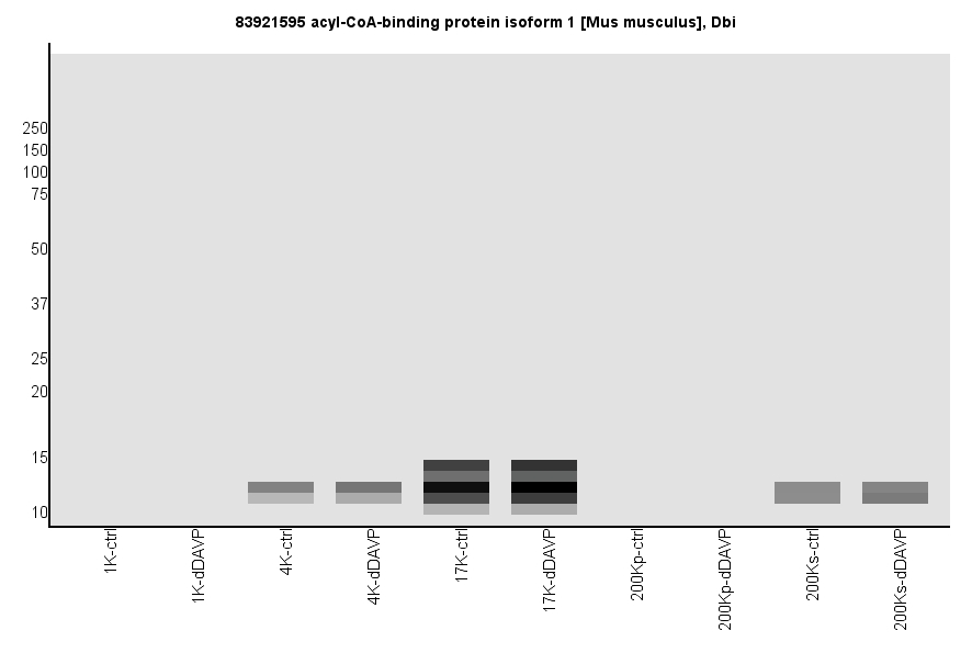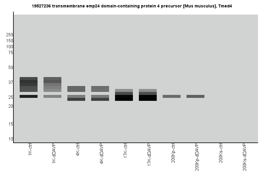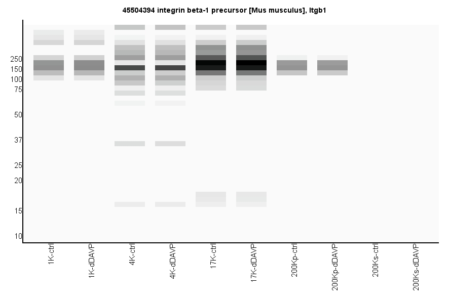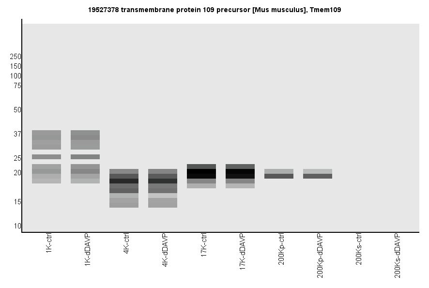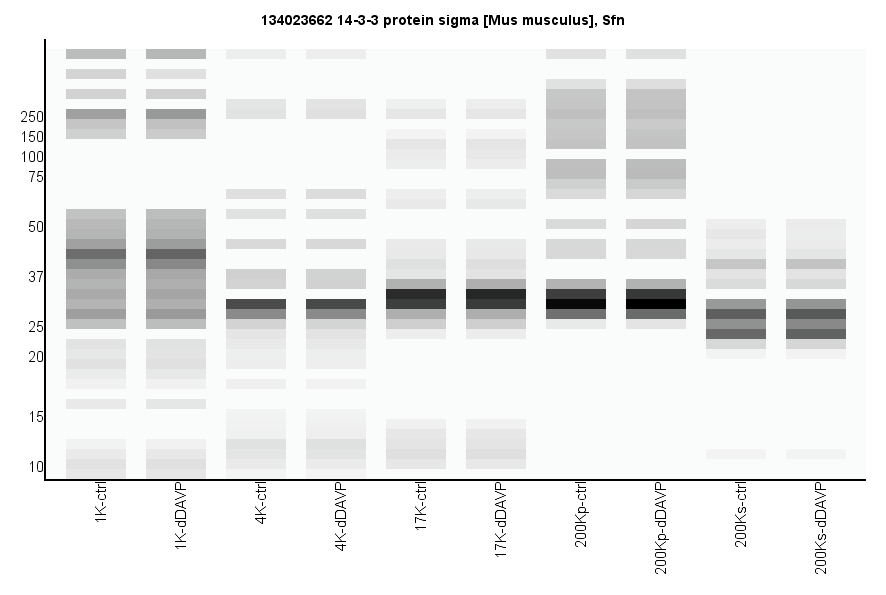 The virtual western blot images show data normalized using a logarithmic conversion scale to map peptide intensities to gray-scale levels. Using this conversion method, low-abundance peptides are generally visible in the blot images. Switch back to the default linear conversion scale database page.