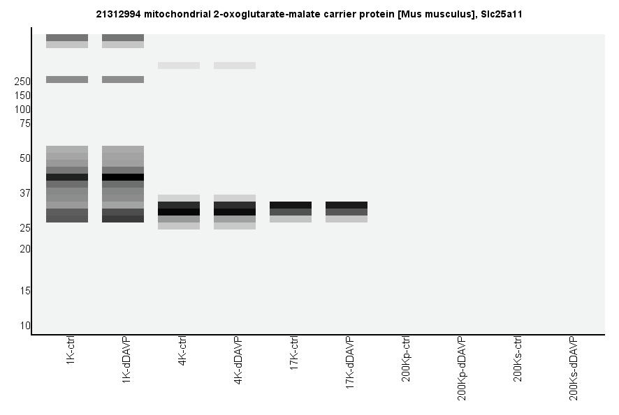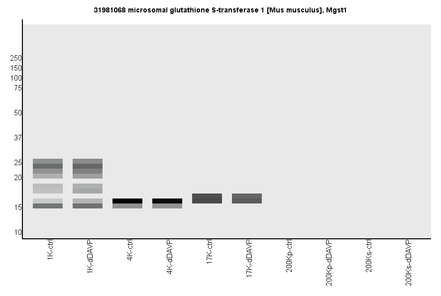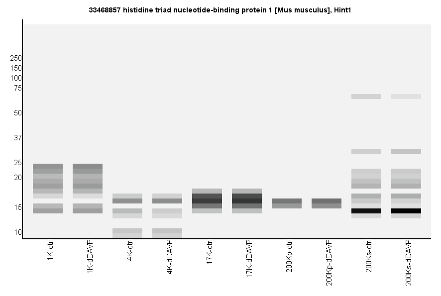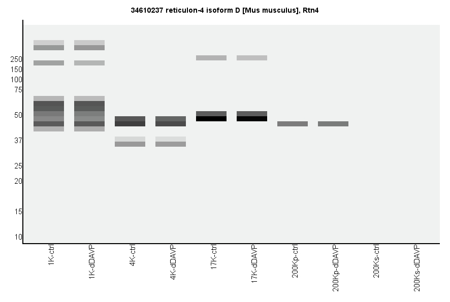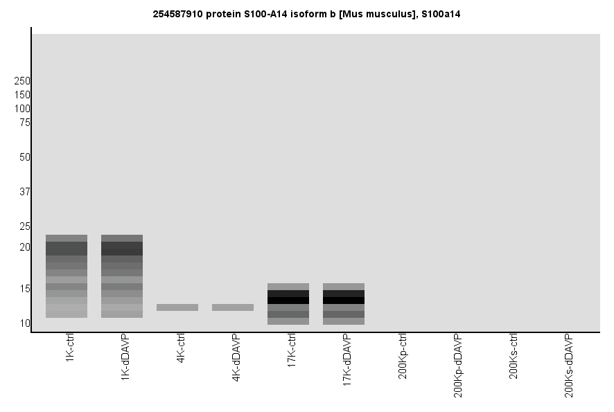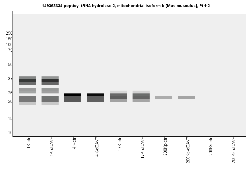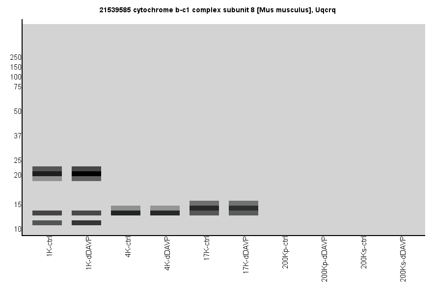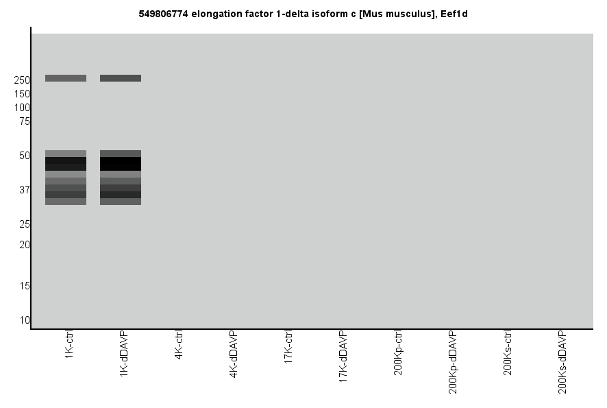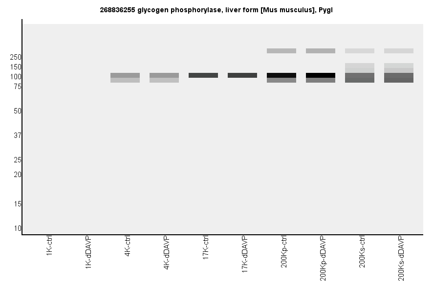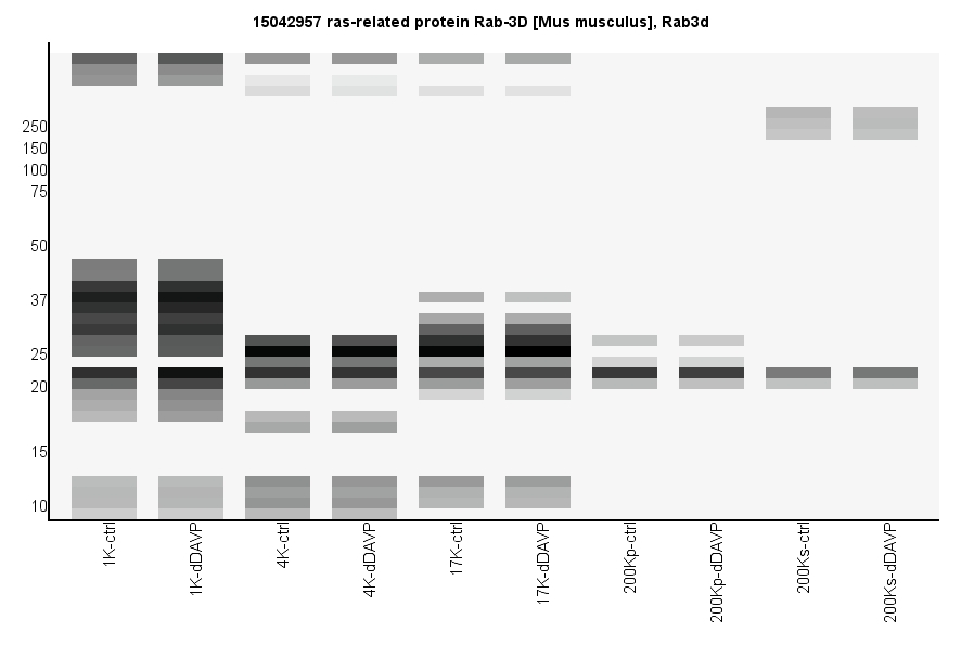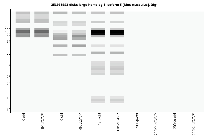 The virtual western blot images show data normalized using a logarithmic conversion scale to map peptide intensities to gray-scale levels. Using this conversion method, low-abundance peptides are generally visible in the blot images. Switch back to the default linear conversion scale database page.