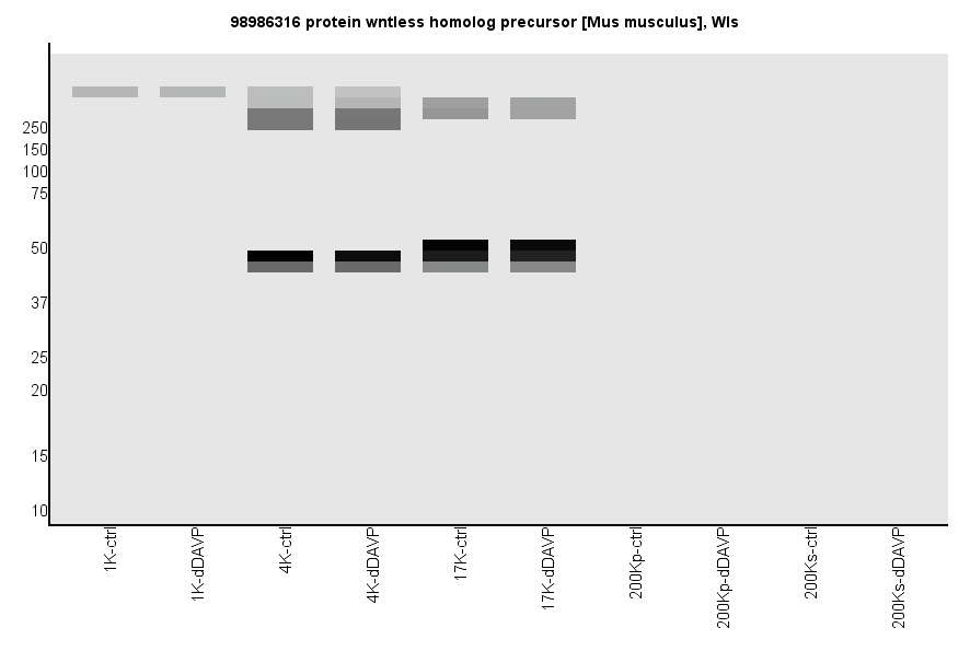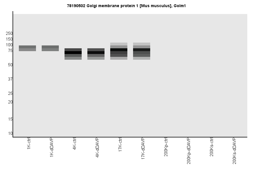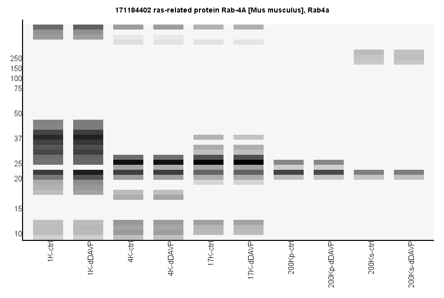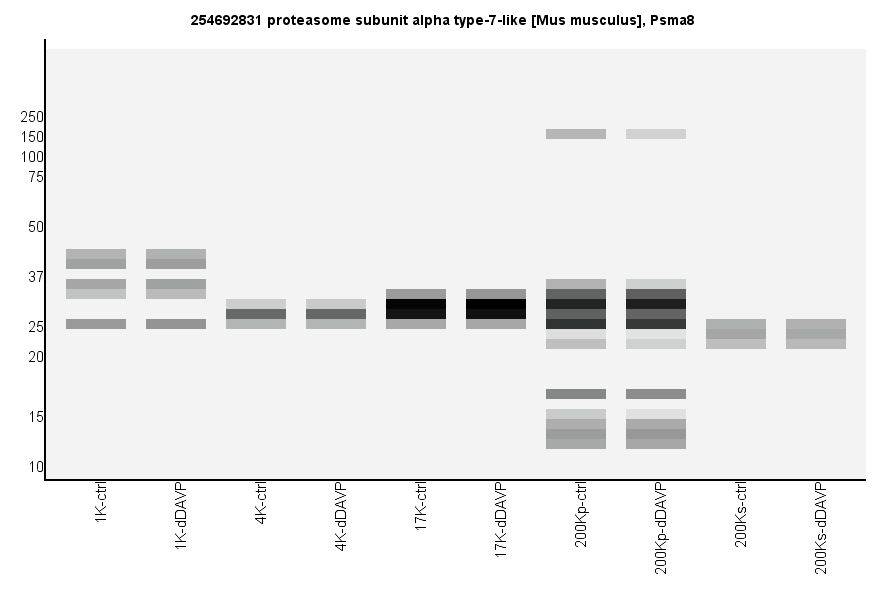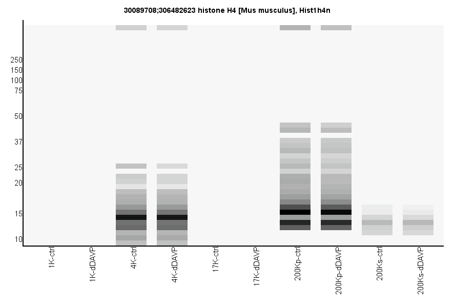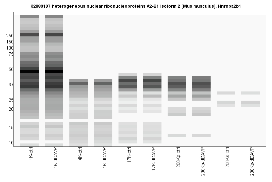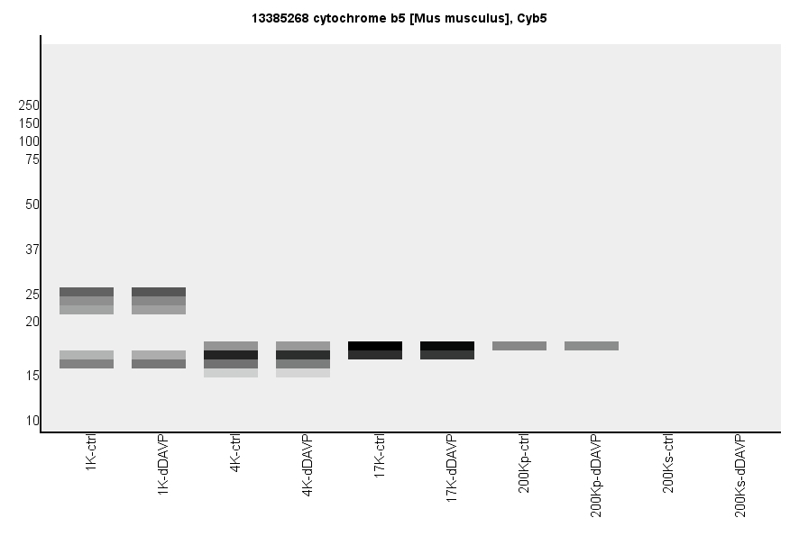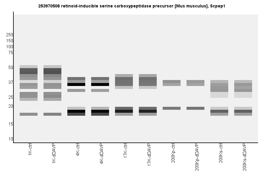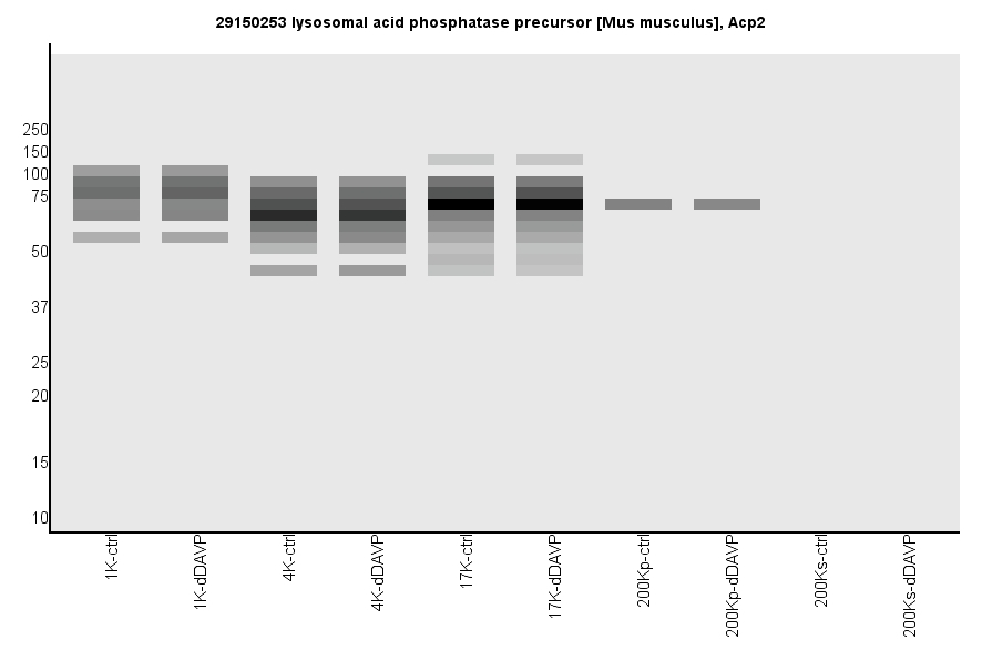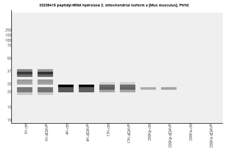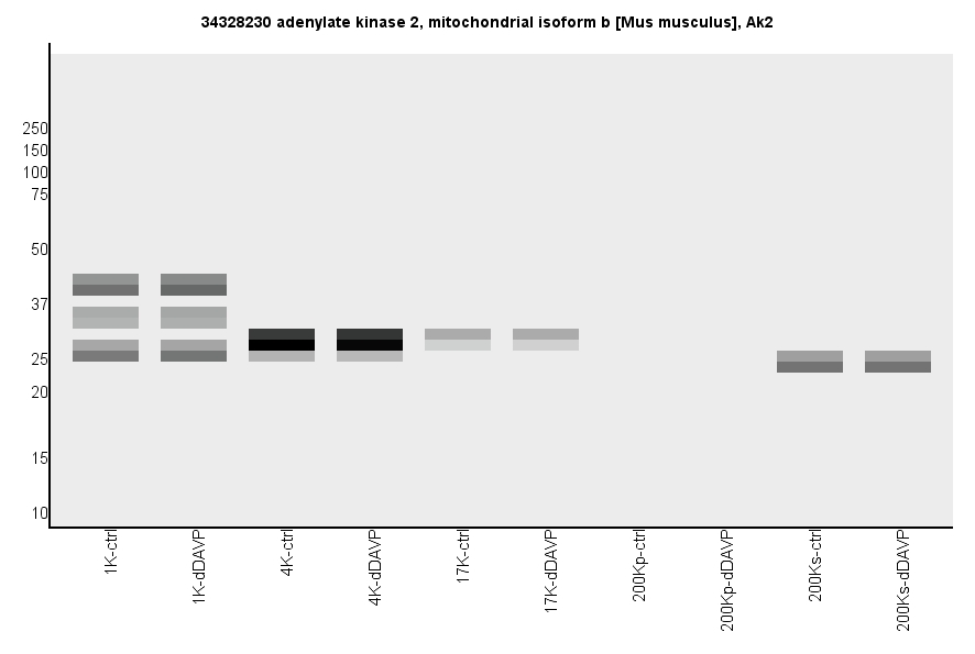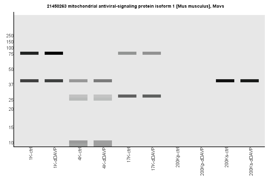 The virtual western blot images show data normalized using a logarithmic conversion scale to map peptide intensities to gray-scale levels. Using this conversion method, low-abundance peptides are generally visible in the blot images. Switch back to the default linear conversion scale database page.