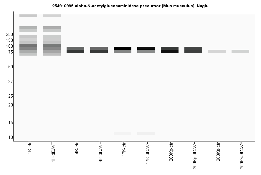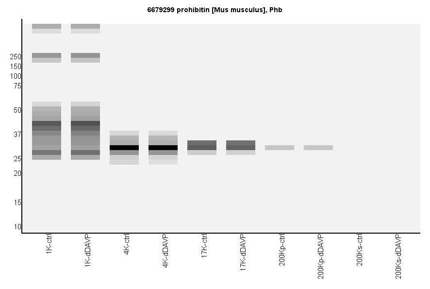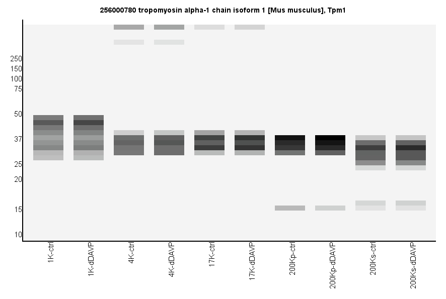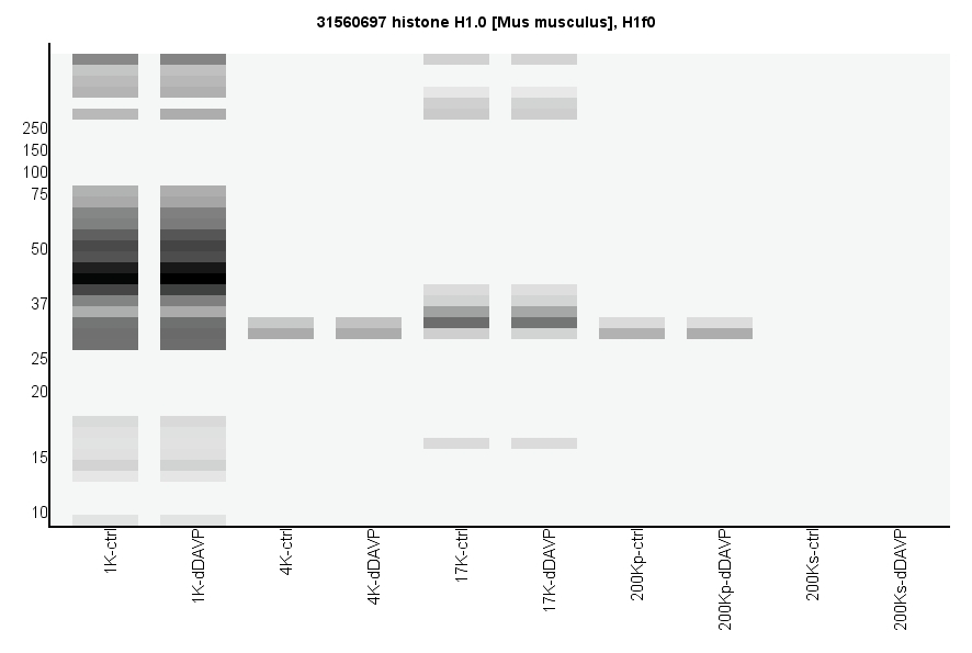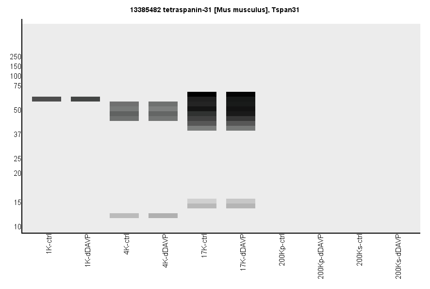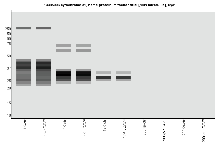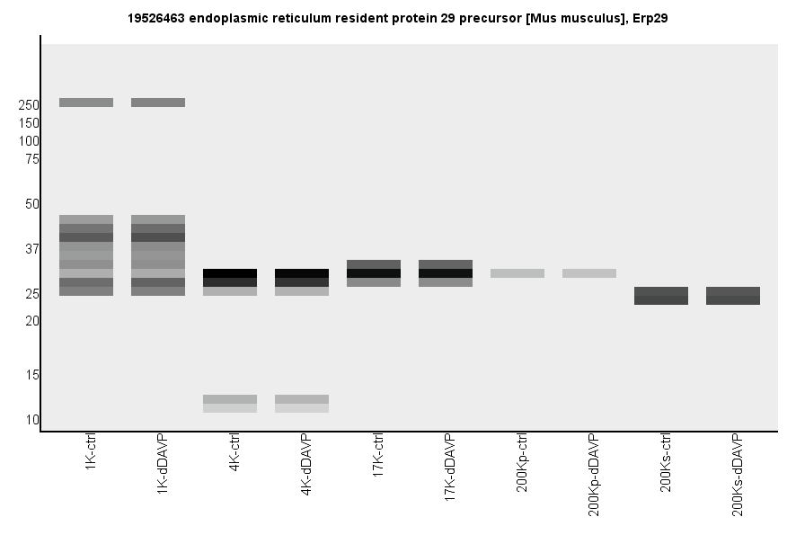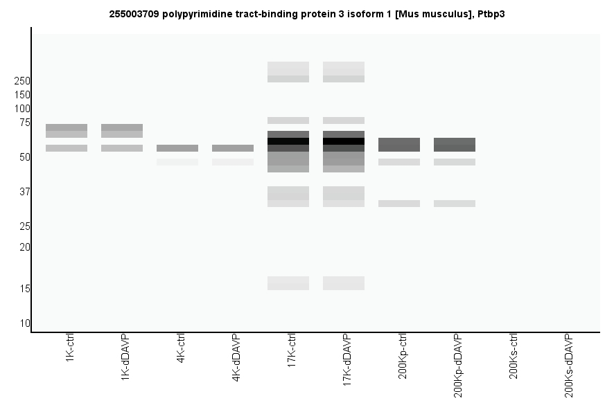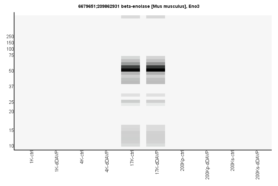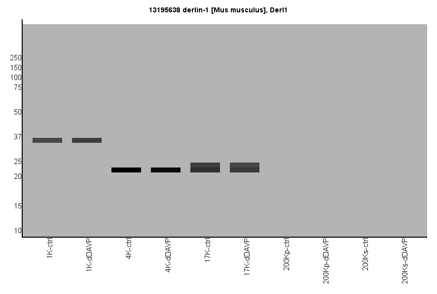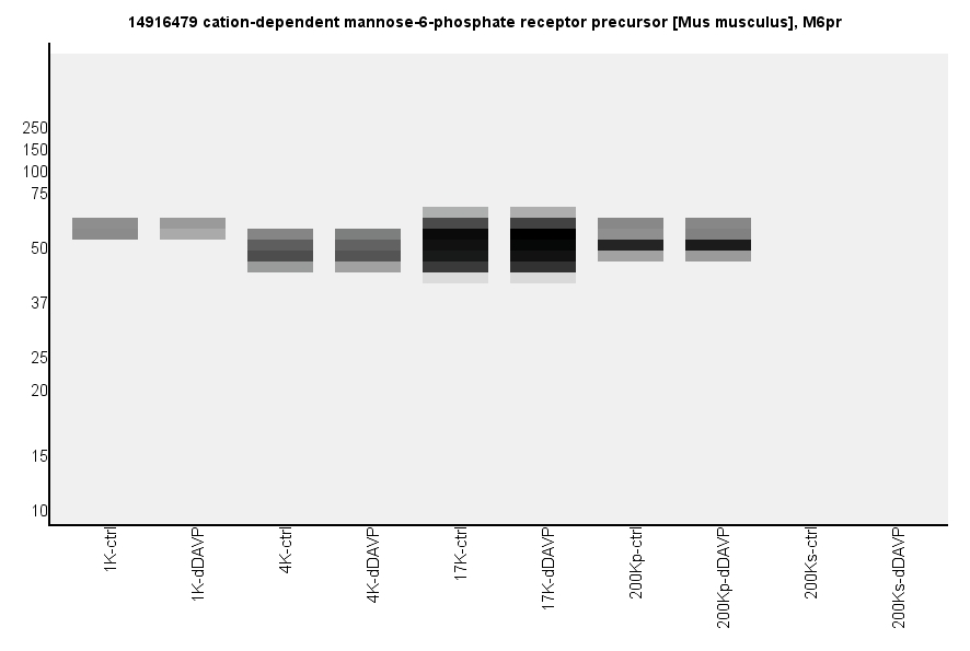 The virtual western blot images show data normalized using a logarithmic conversion scale to map peptide intensities to gray-scale levels. Using this conversion method, low-abundance peptides are generally visible in the blot images. Switch back to the default linear conversion scale database page.