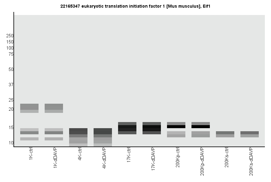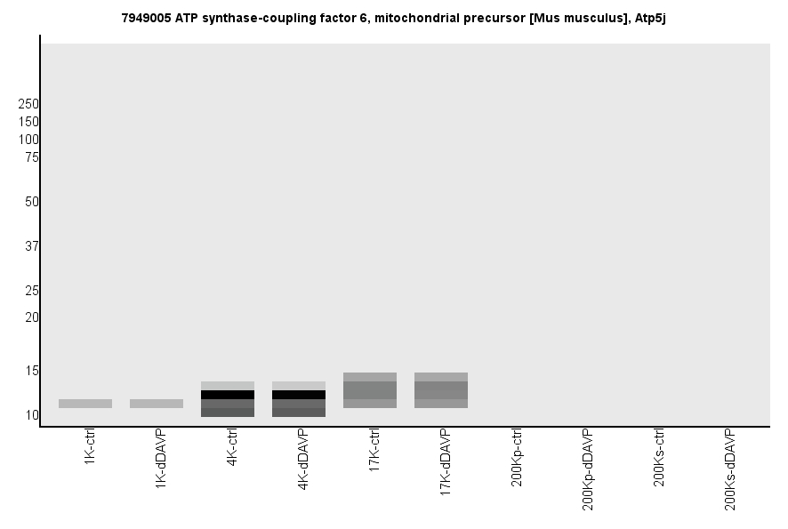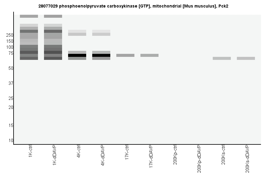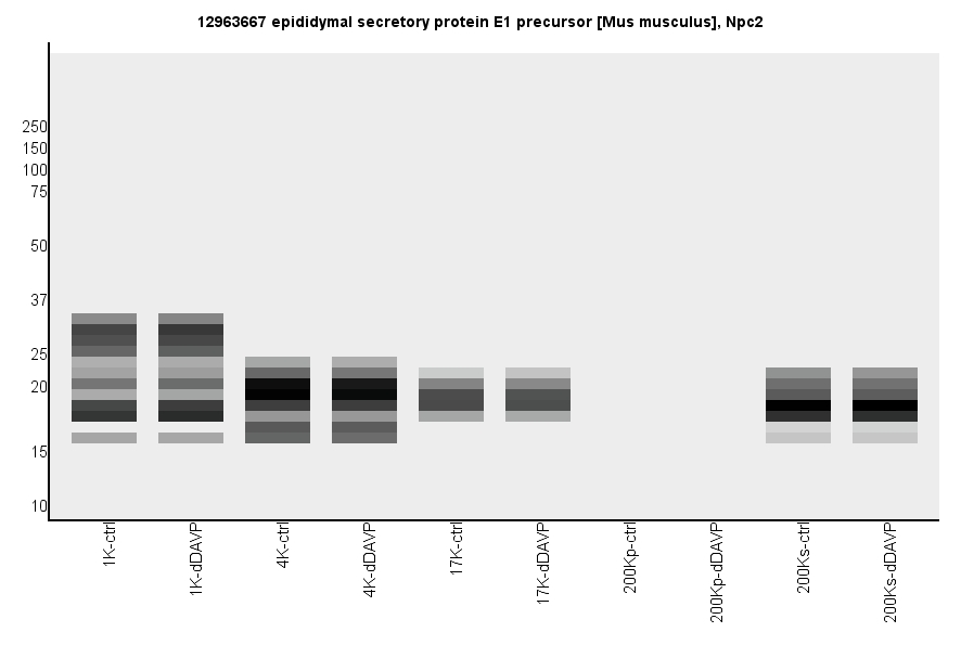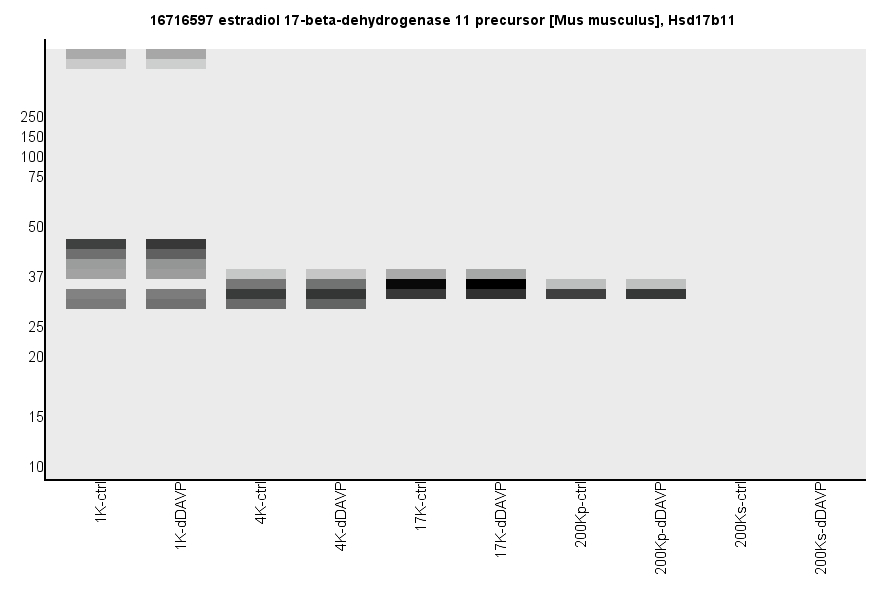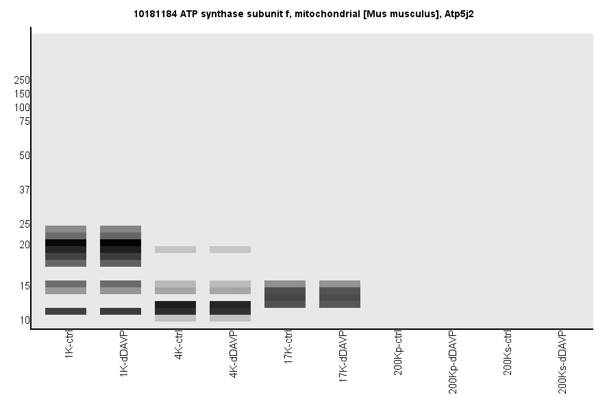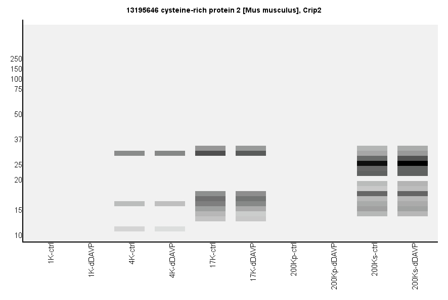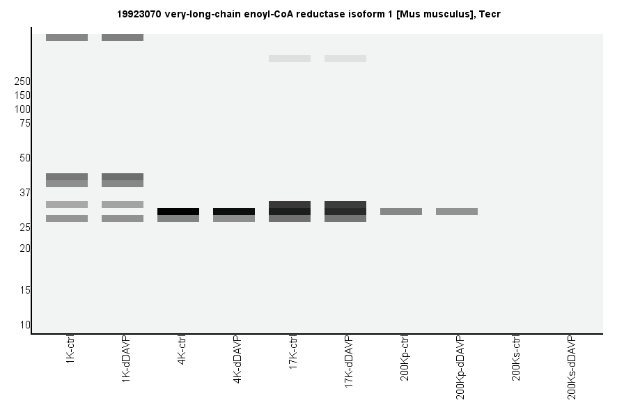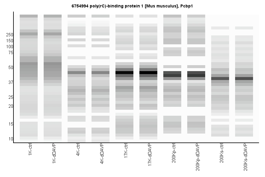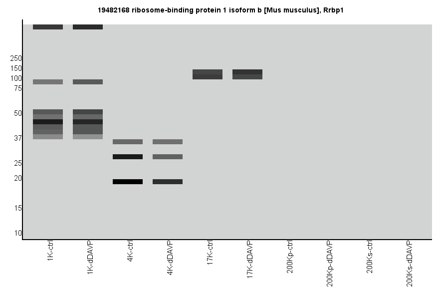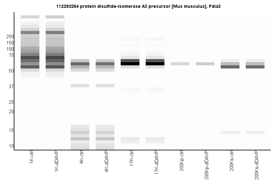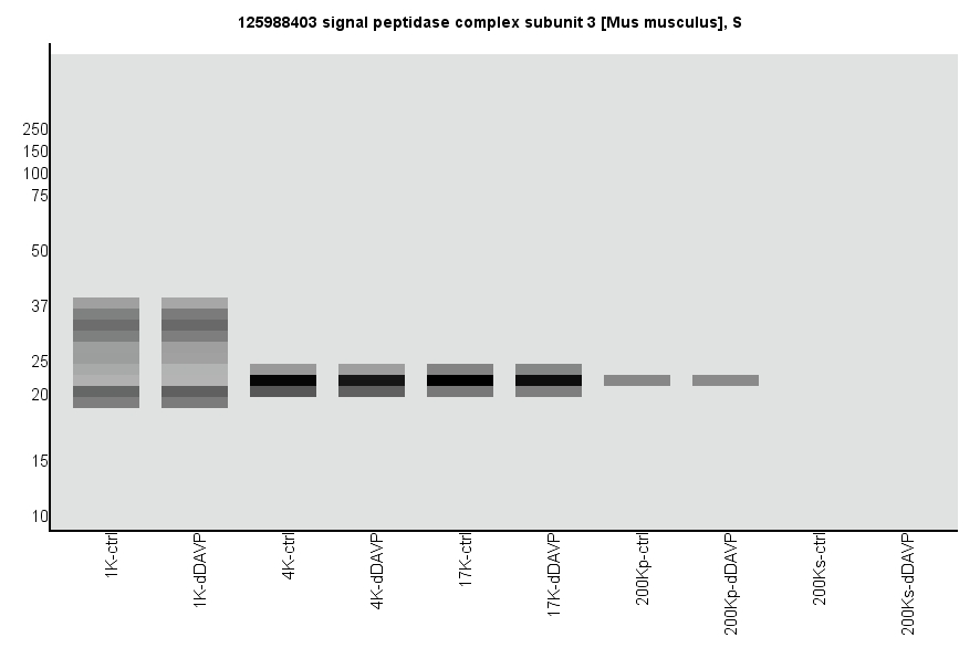 The virtual western blot images show data normalized using a logarithmic conversion scale to map peptide intensities to gray-scale levels. Using this conversion method, low-abundance peptides are generally visible in the blot images. Switch back to the default linear conversion scale database page.