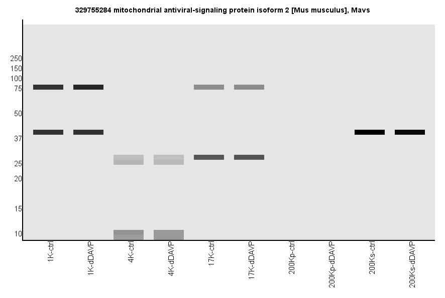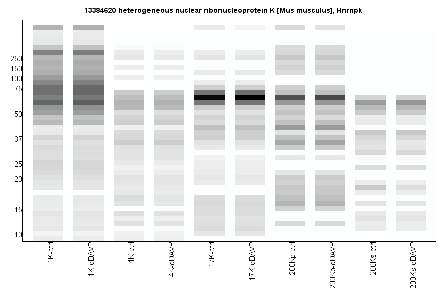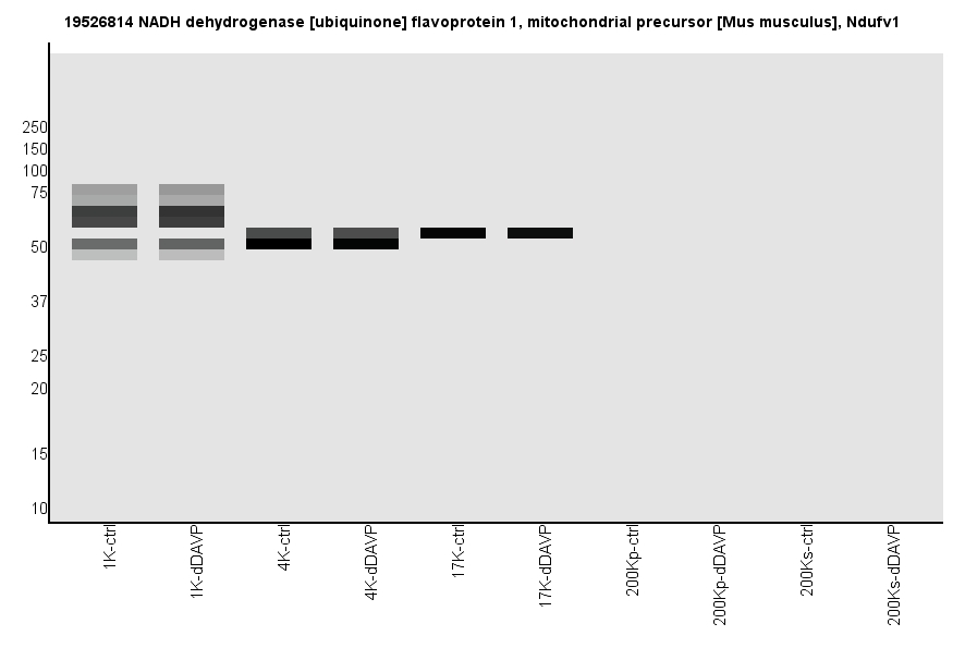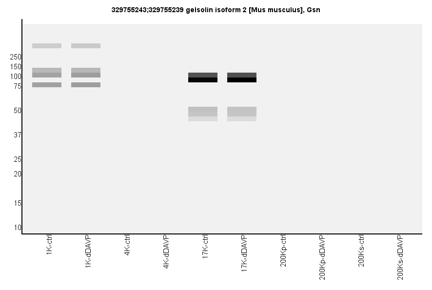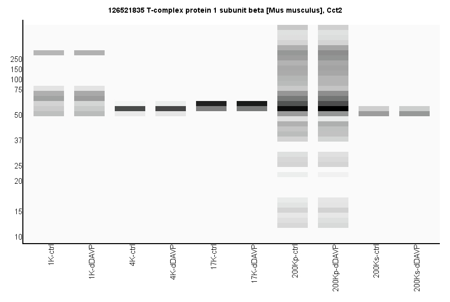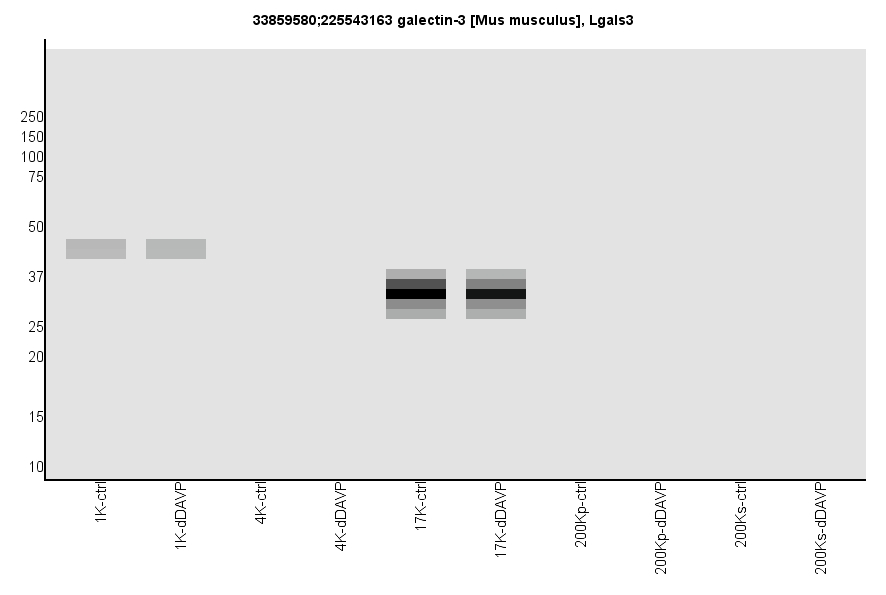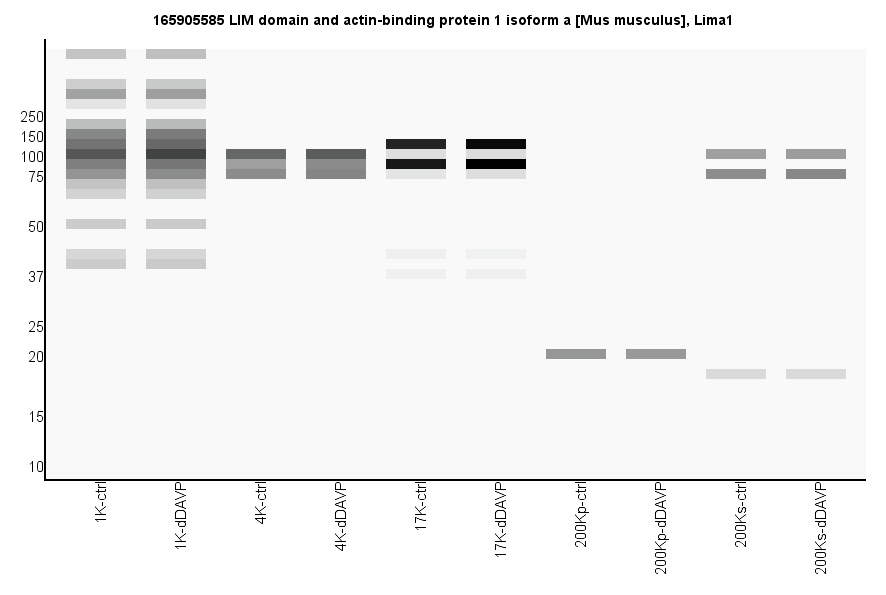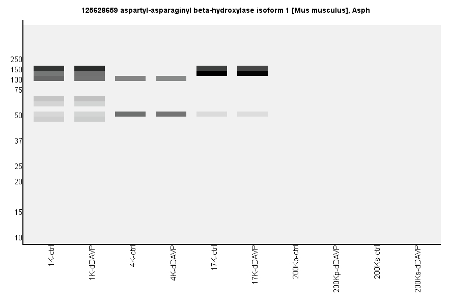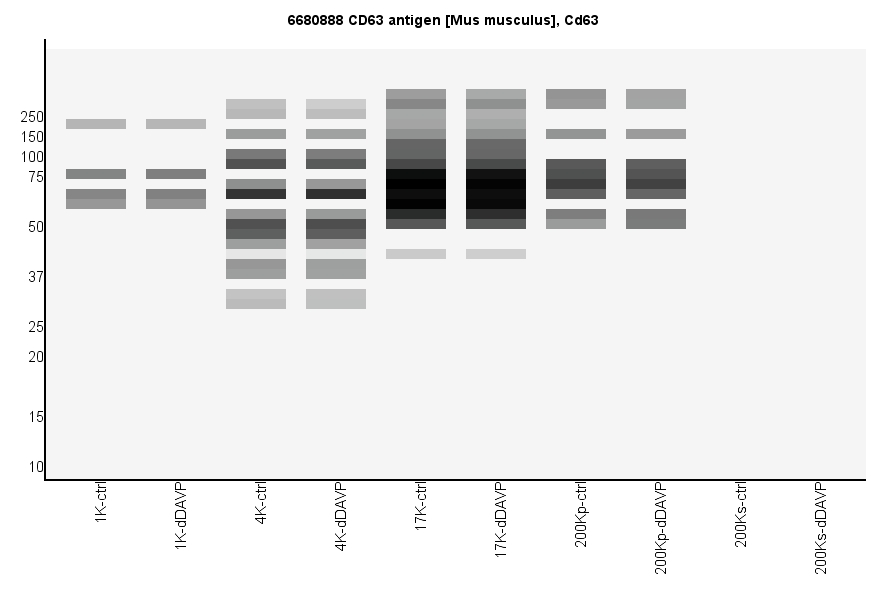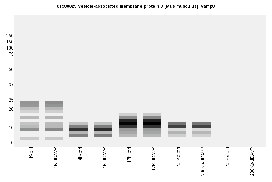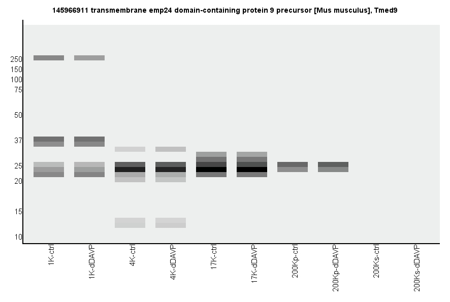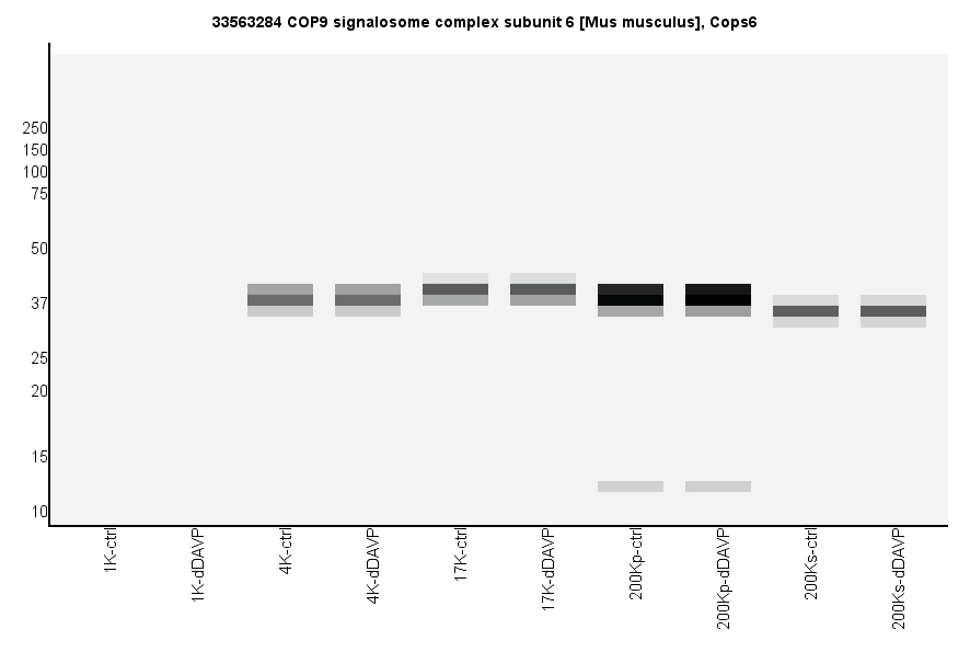 The virtual western blot images show data normalized using a logarithmic conversion scale to map peptide intensities to gray-scale levels. Using this conversion method, low-abundance peptides are generally visible in the blot images. Switch back to the default linear conversion scale database page.