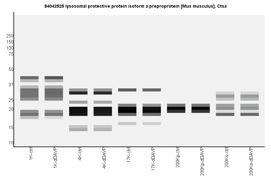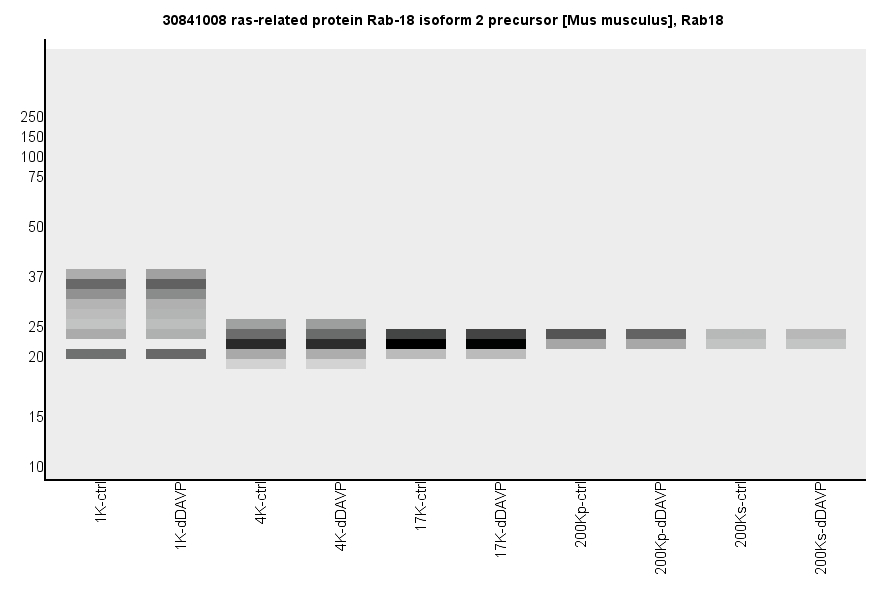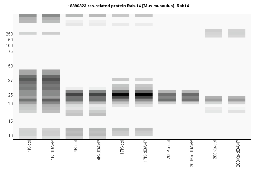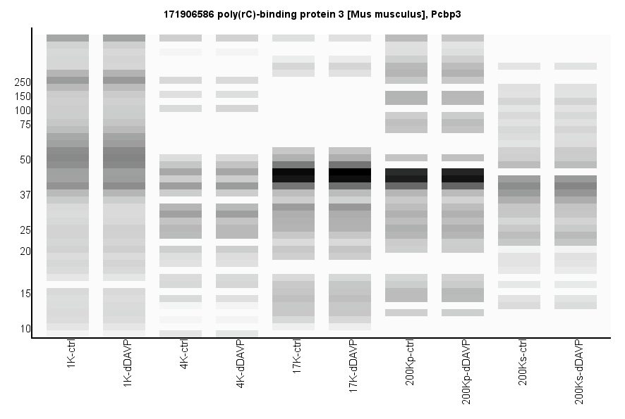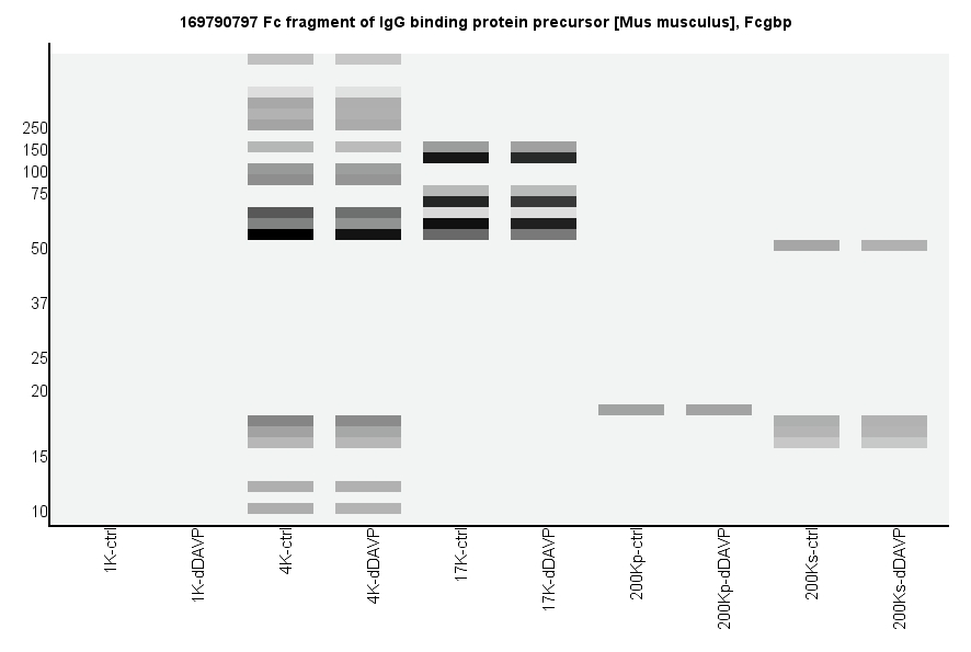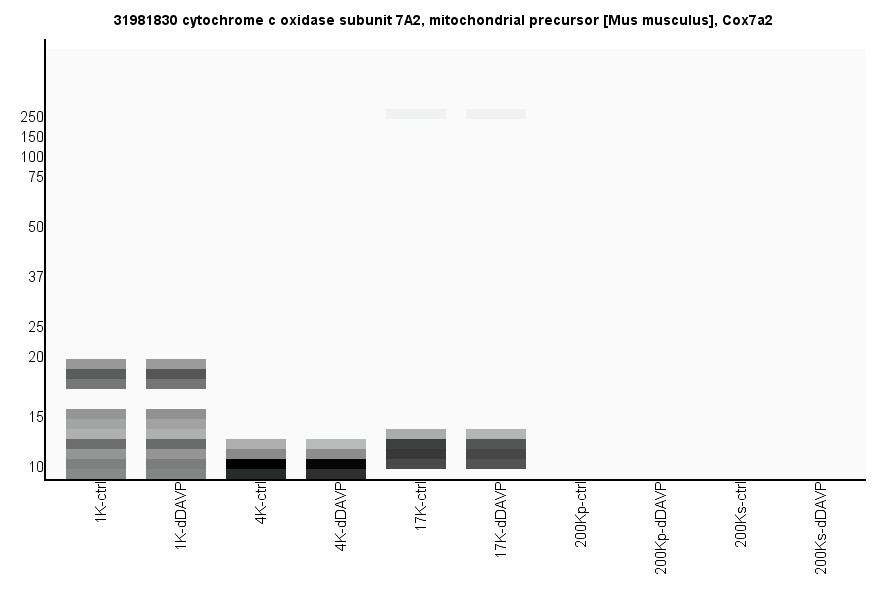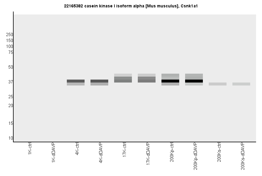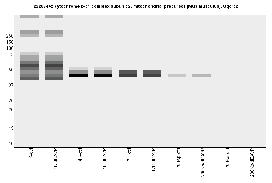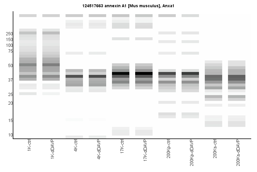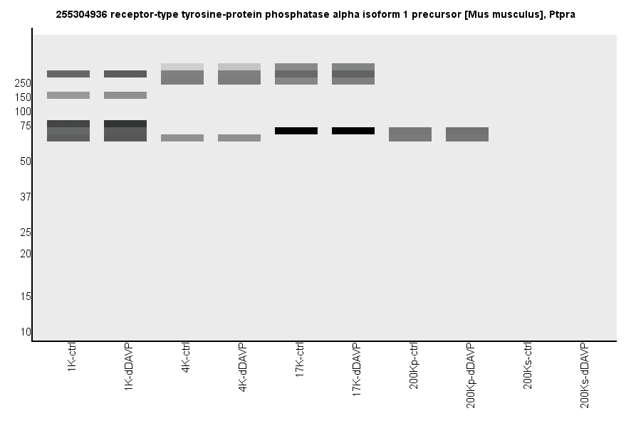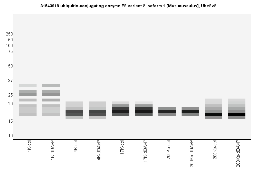 The virtual western blot images show data normalized using a logarithmic conversion scale to map peptide intensities to gray-scale levels. Using this conversion method, low-abundance peptides are generally visible in the blot images. Switch back to the default linear conversion scale database page.