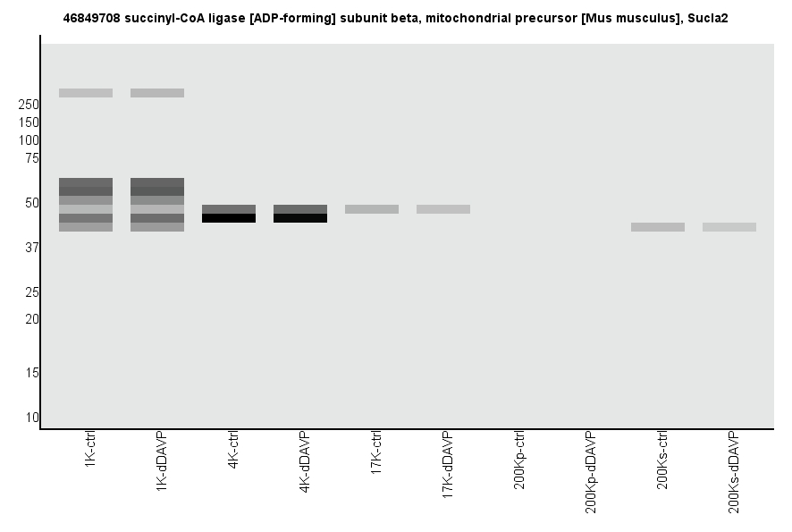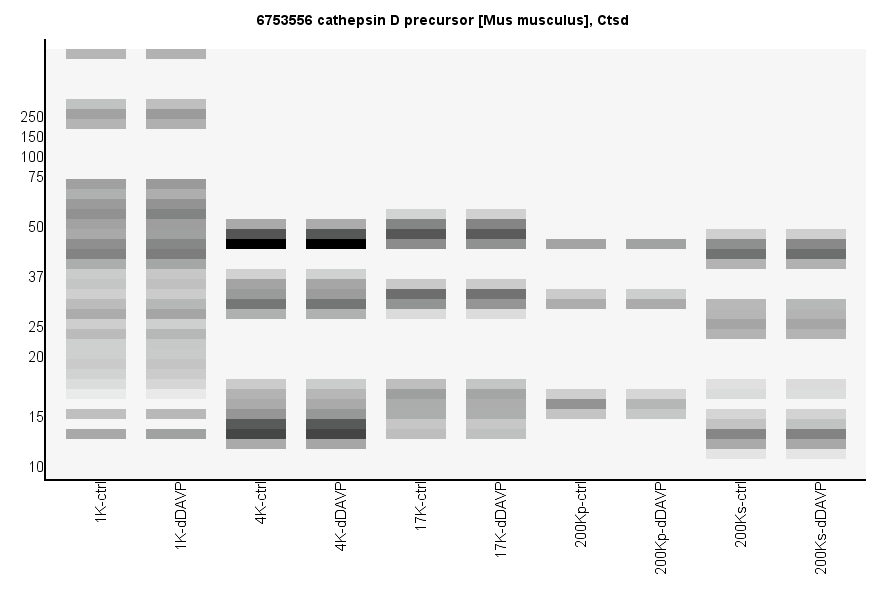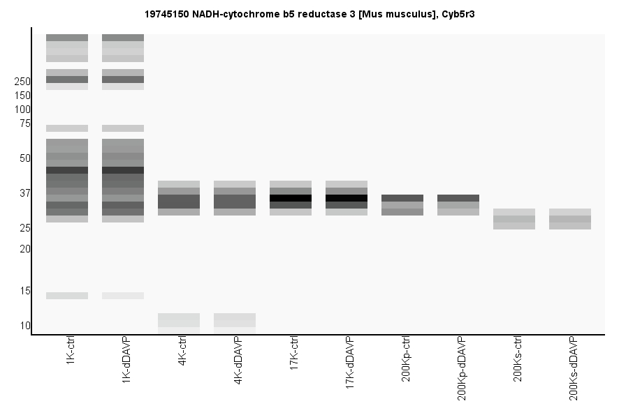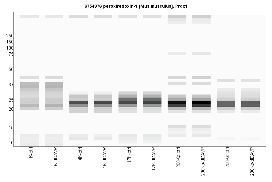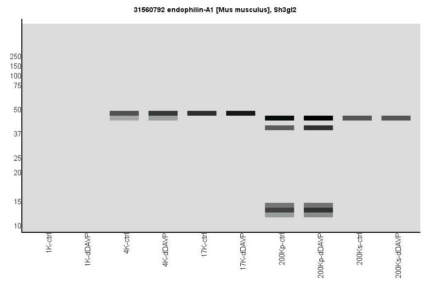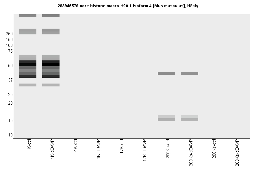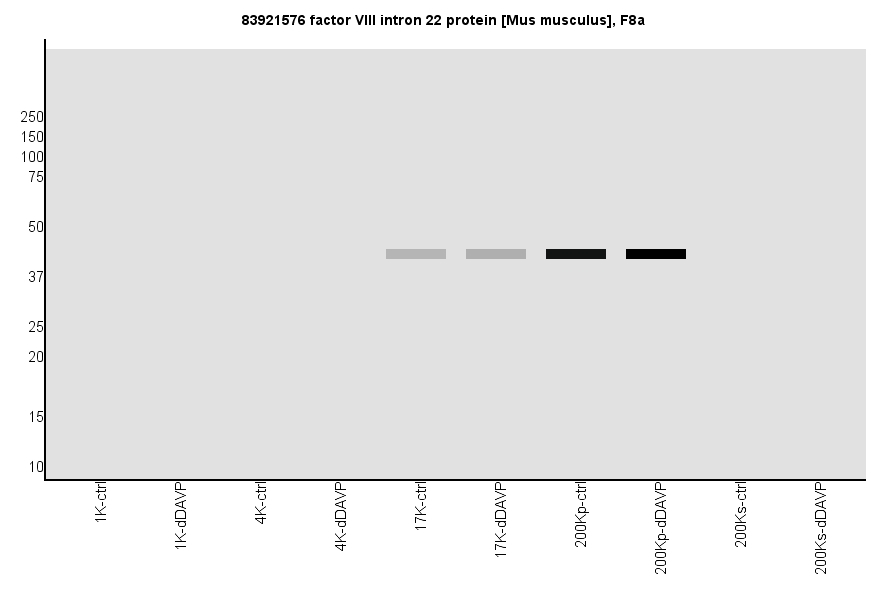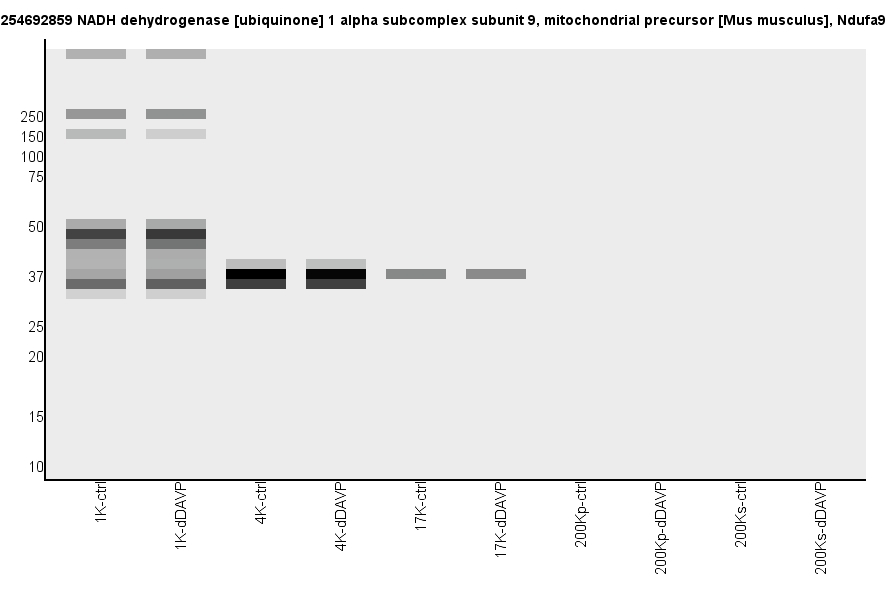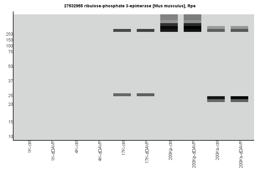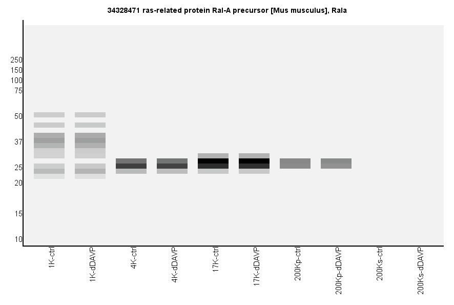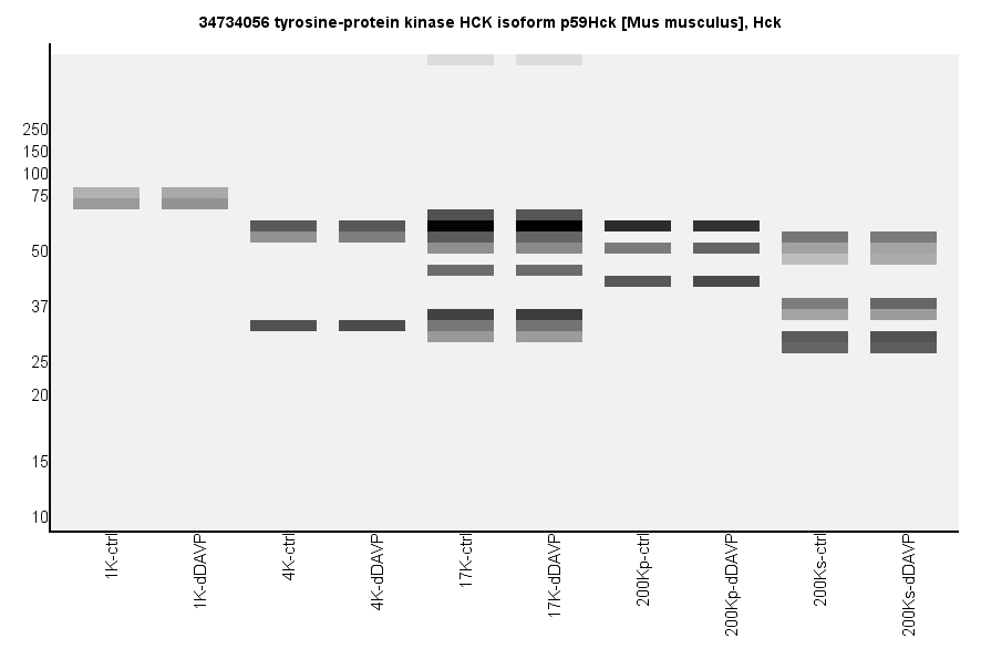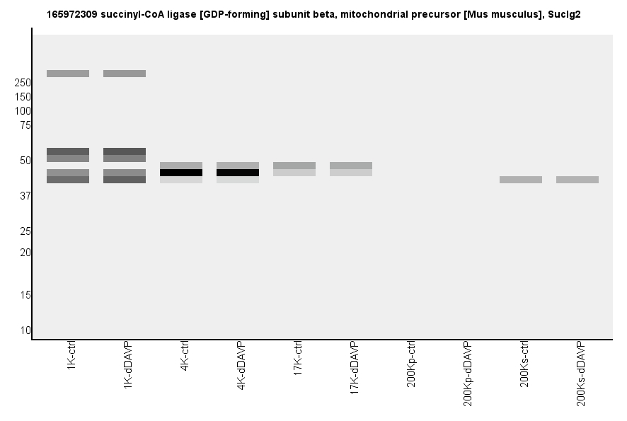 The virtual western blot images show data normalized using a logarithmic conversion scale to map peptide intensities to gray-scale levels. Using this conversion method, low-abundance peptides are generally visible in the blot images. Switch back to the default linear conversion scale database page.
