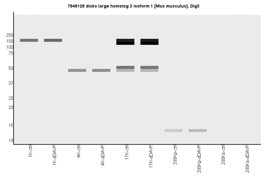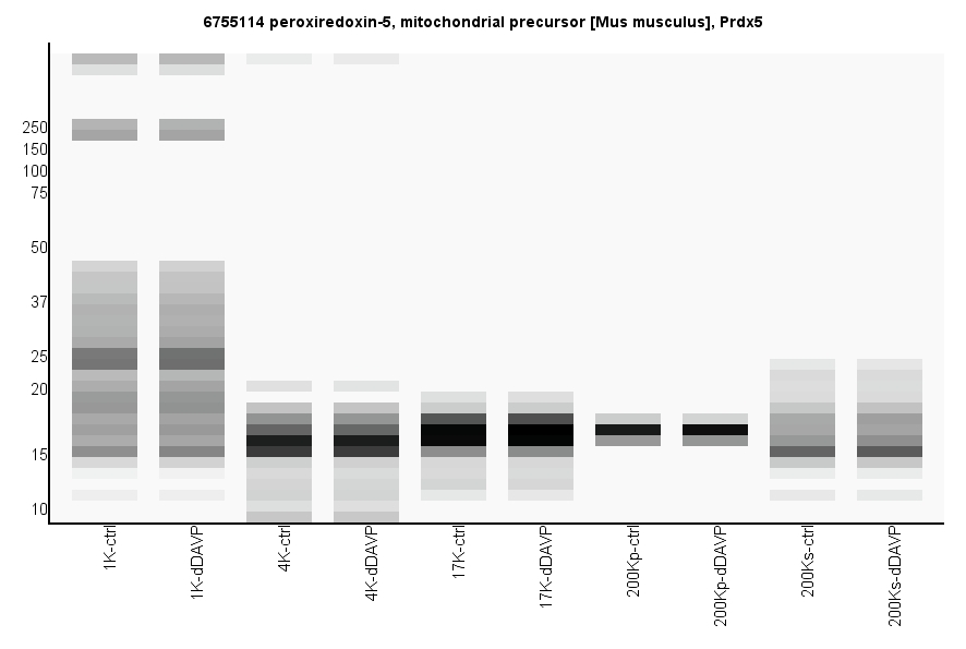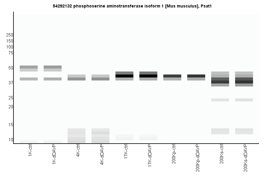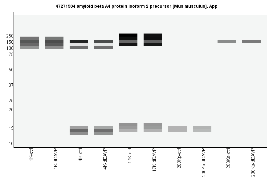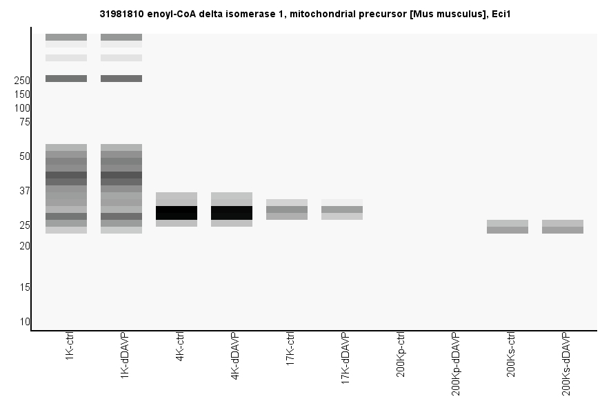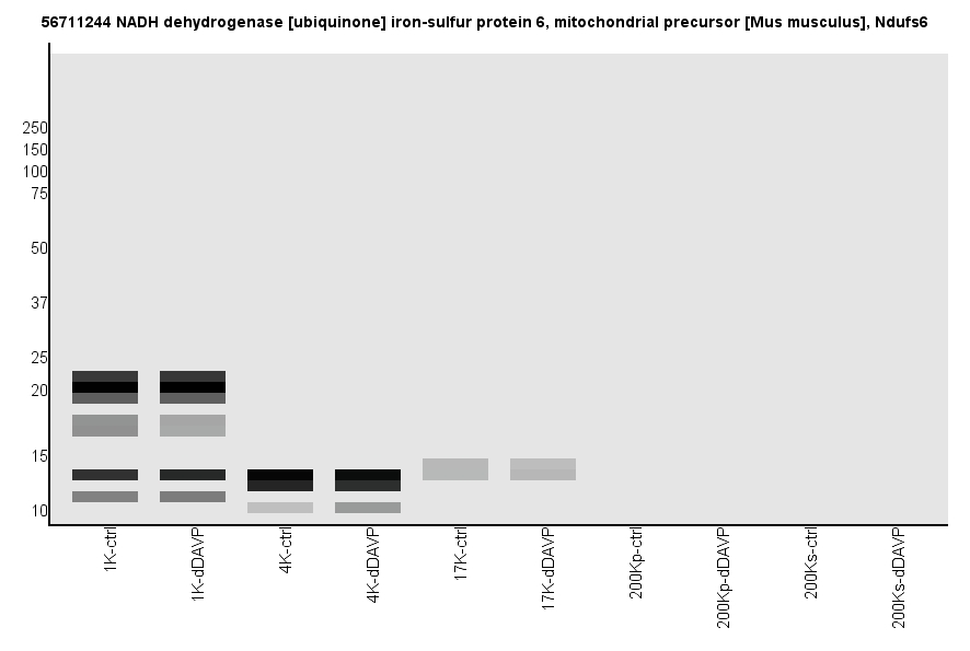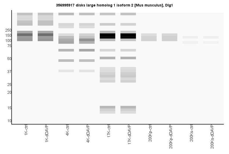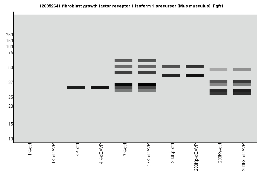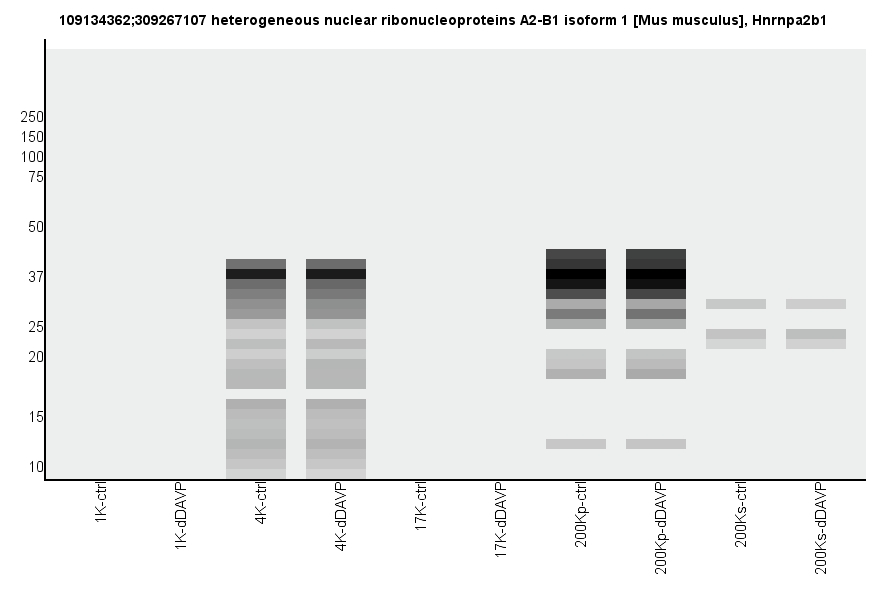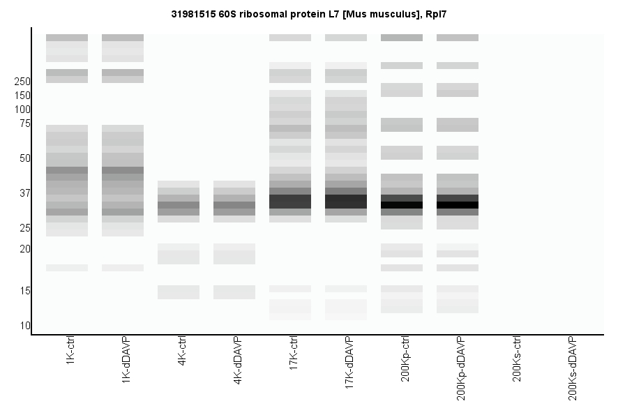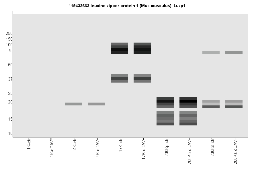 The virtual western blot images show data normalized using a logarithmic conversion scale to map peptide intensities to gray-scale levels. Using this conversion method, low-abundance peptides are generally visible in the blot images. Switch back to the default linear conversion scale database page.