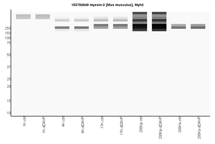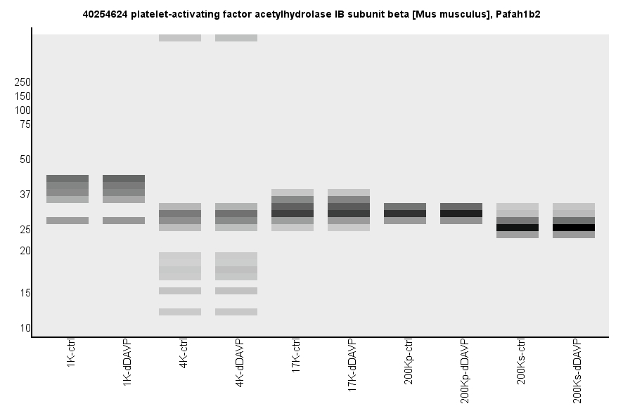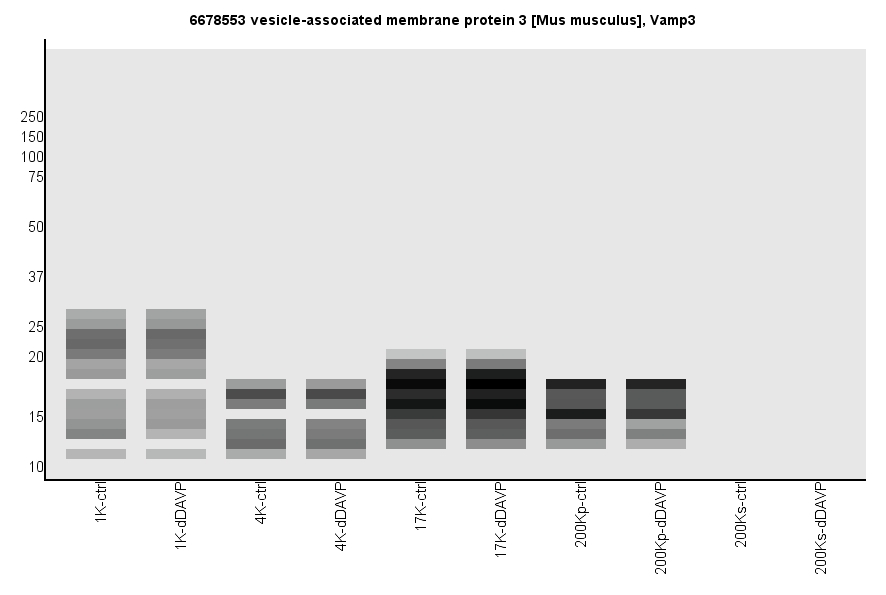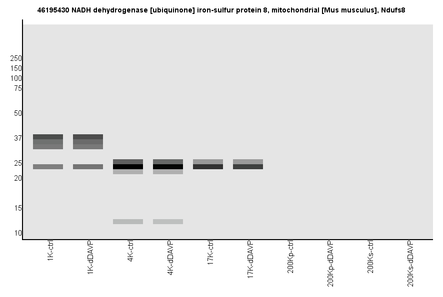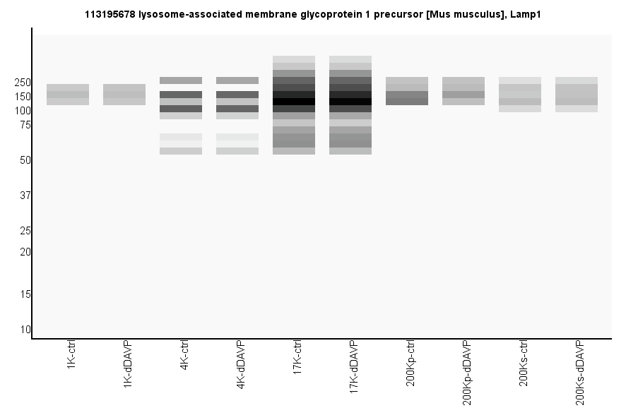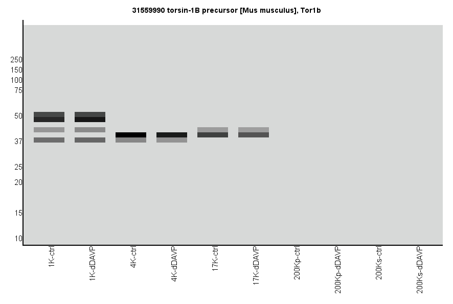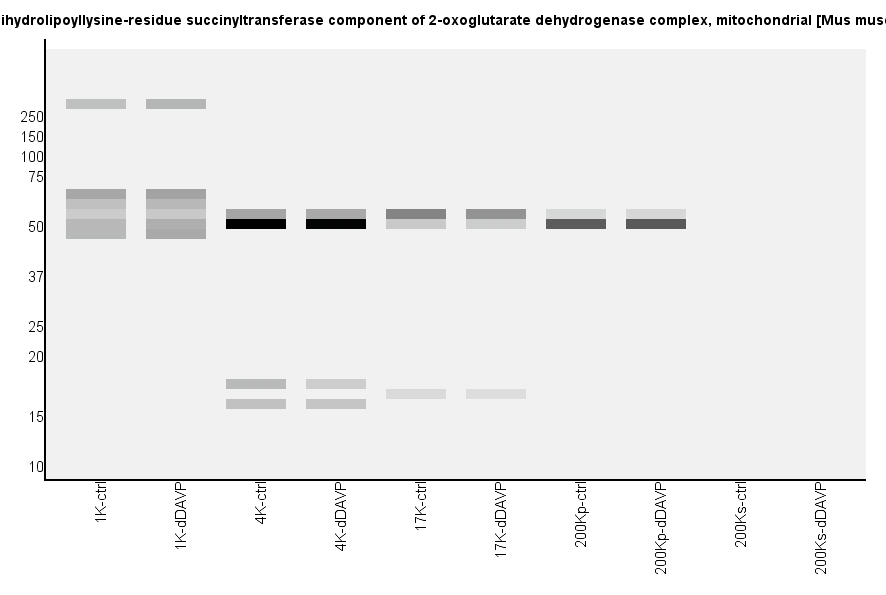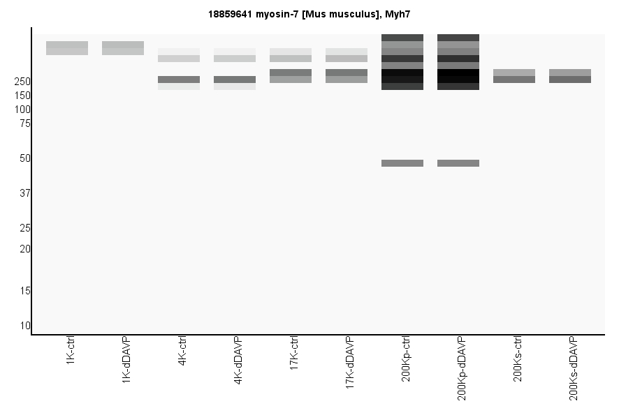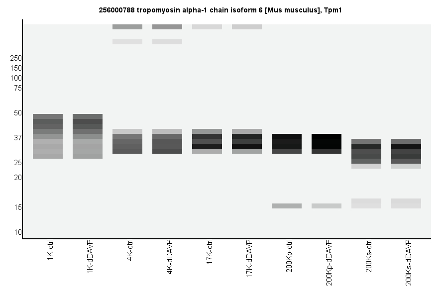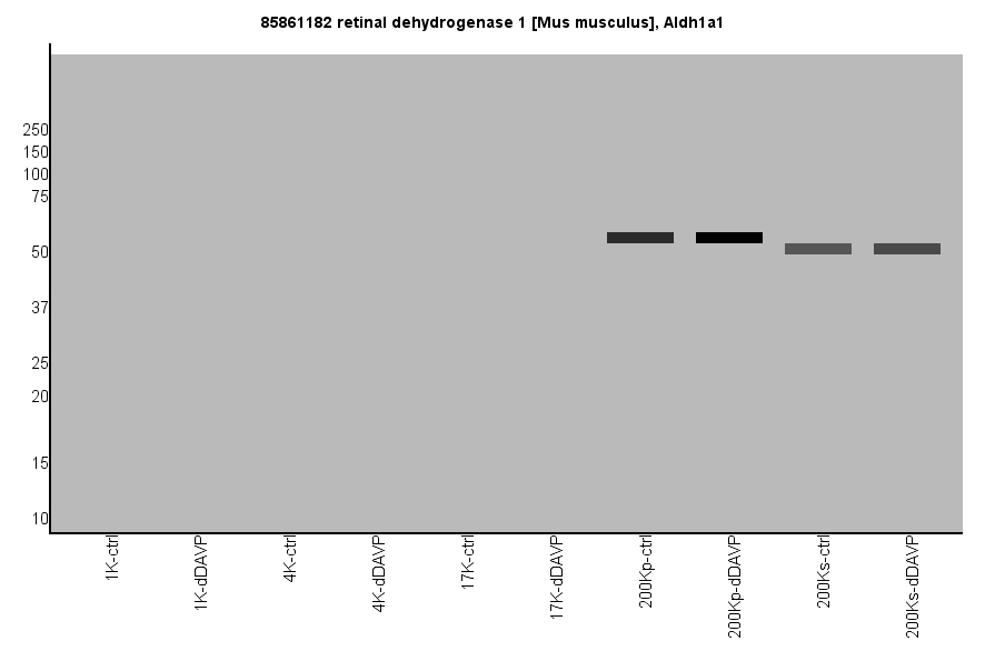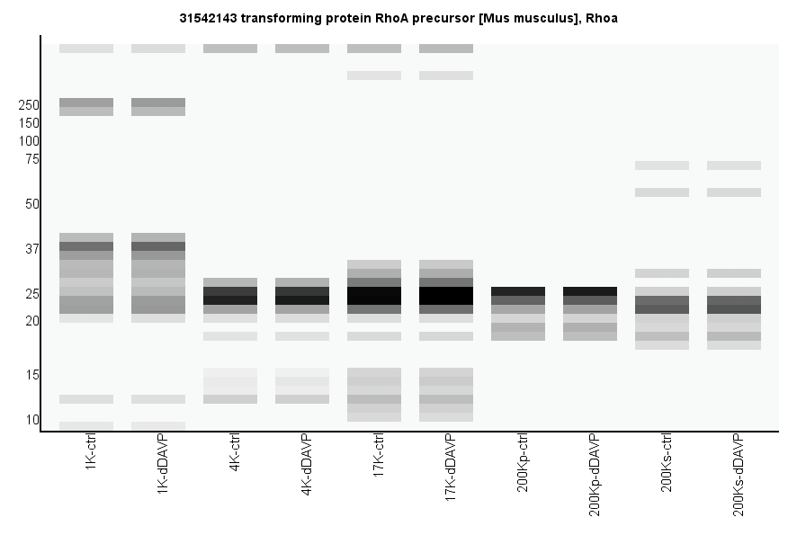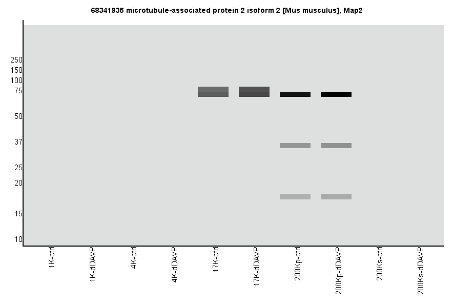 The virtual western blot images show data normalized using a logarithmic conversion scale to map peptide intensities to gray-scale levels. Using this conversion method, low-abundance peptides are generally visible in the blot images. Switch back to the default linear conversion scale database page.