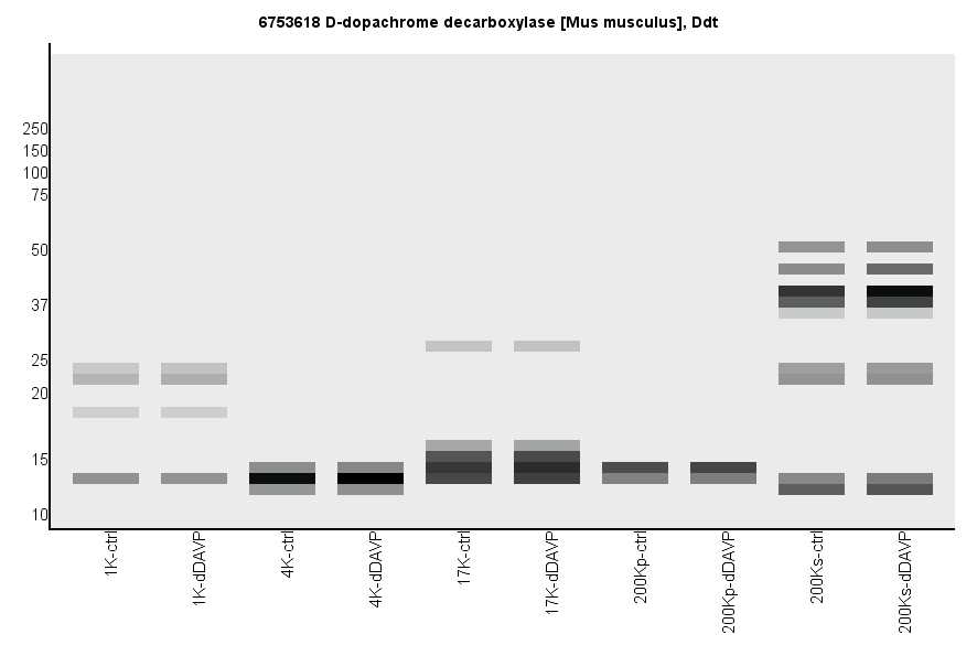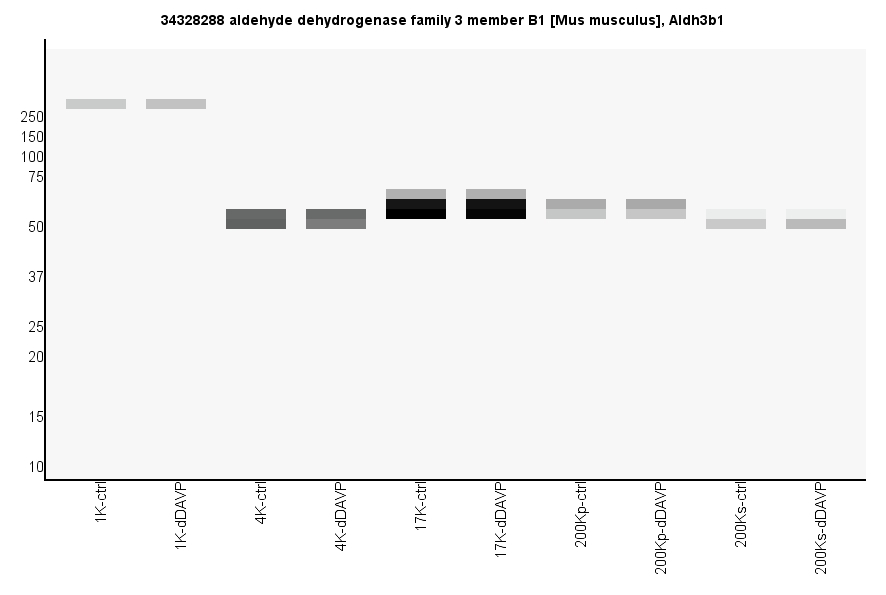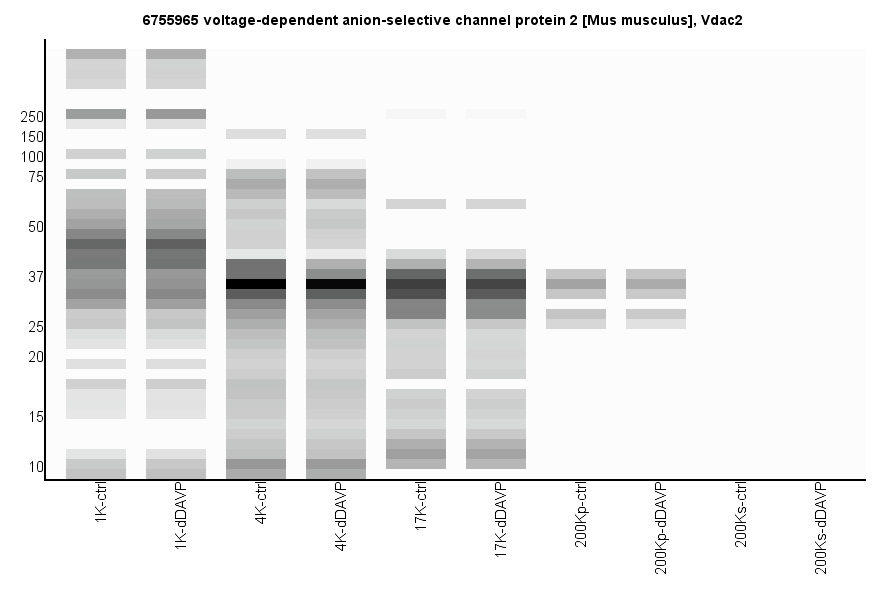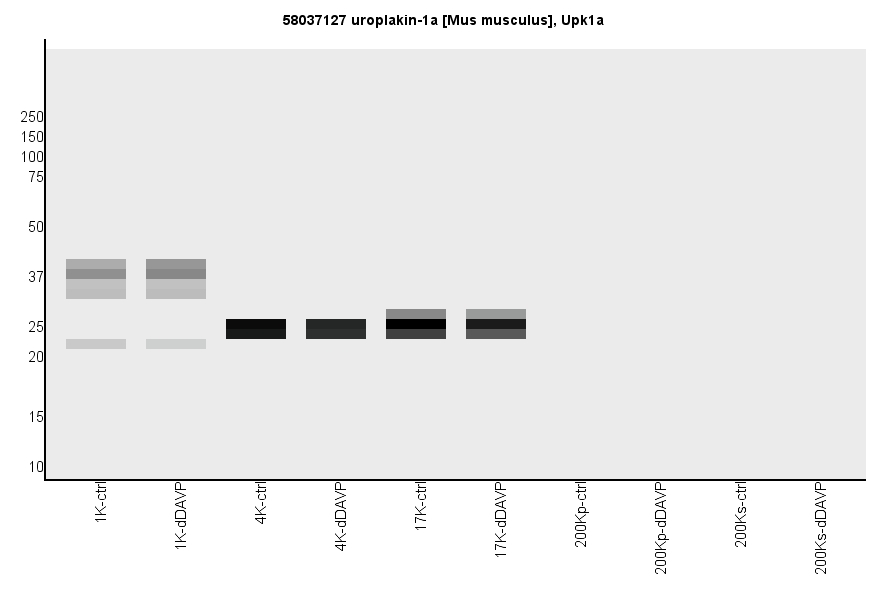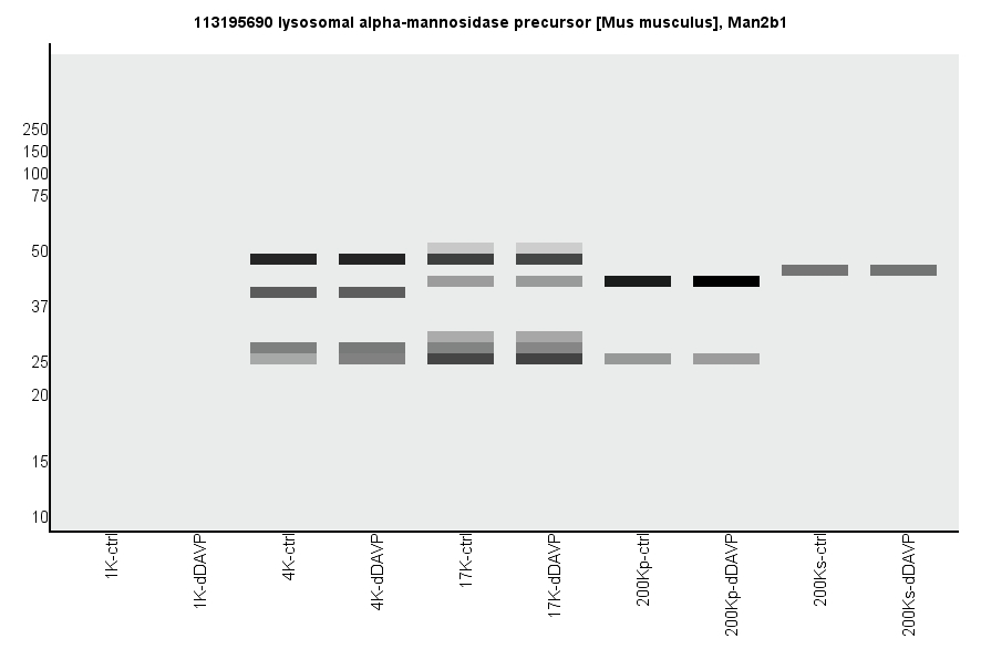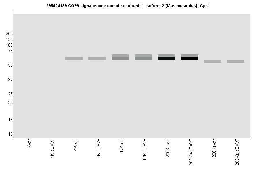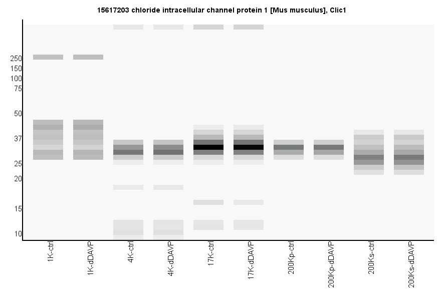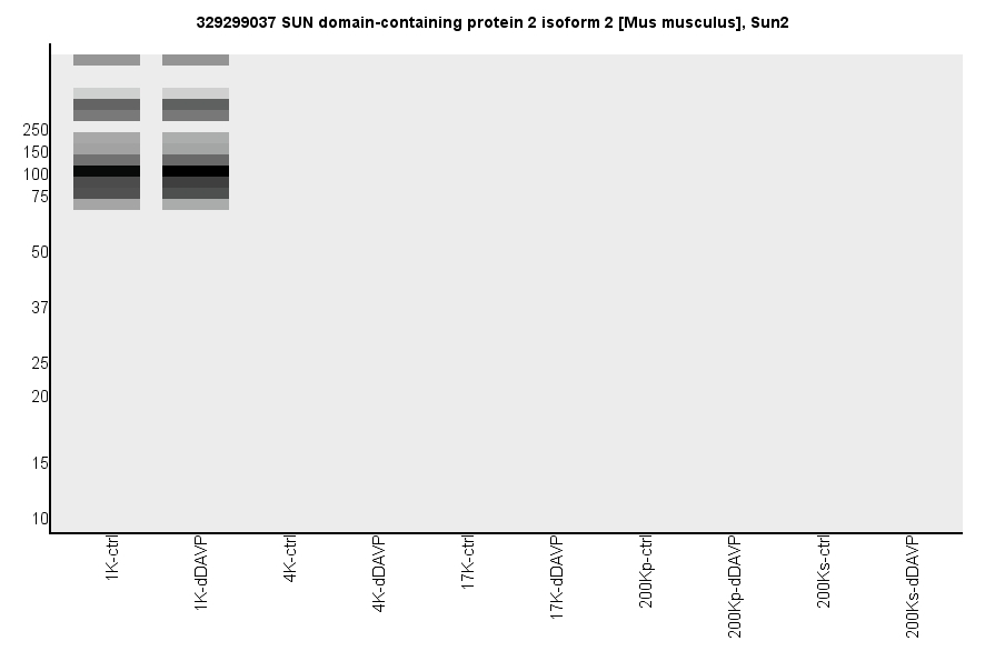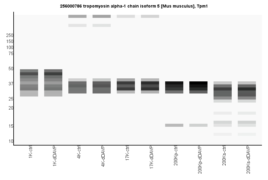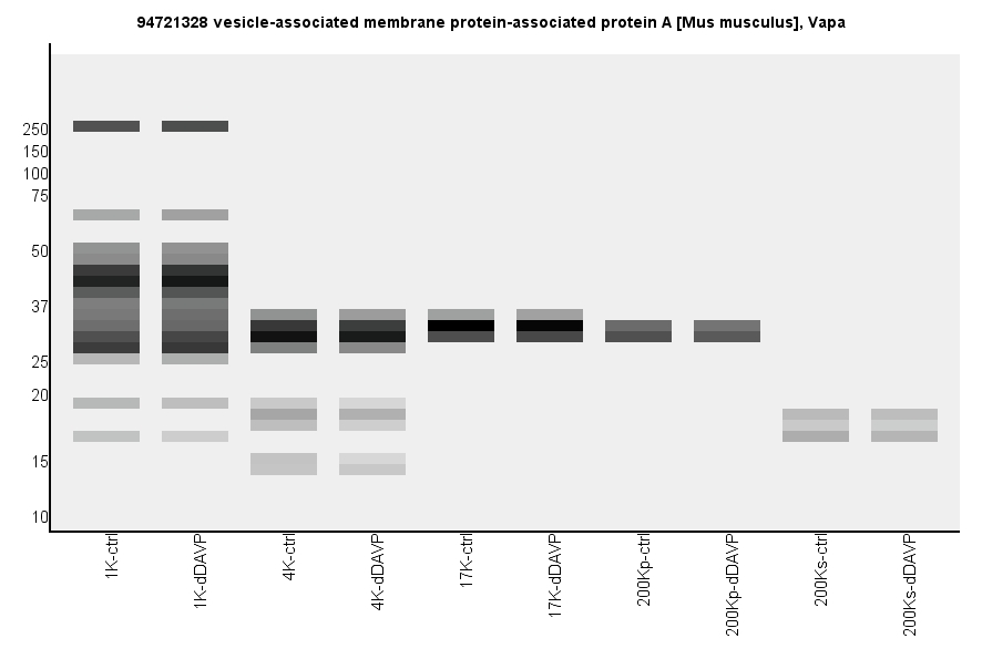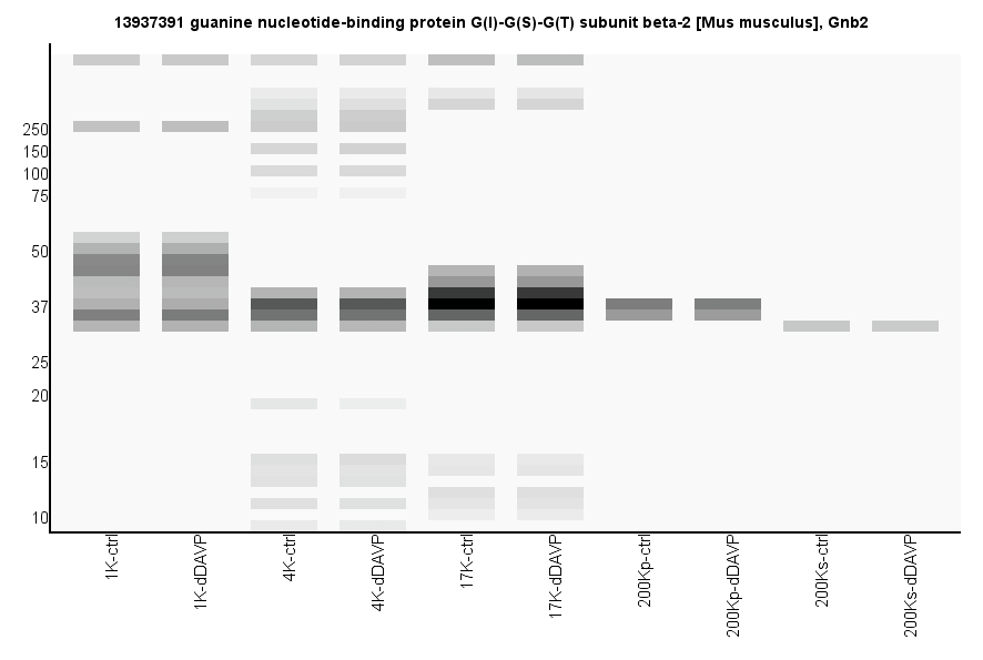 The virtual western blot images show data normalized using a logarithmic conversion scale to map peptide intensities to gray-scale levels. Using this conversion method, low-abundance peptides are generally visible in the blot images. Switch back to the default linear conversion scale database page.