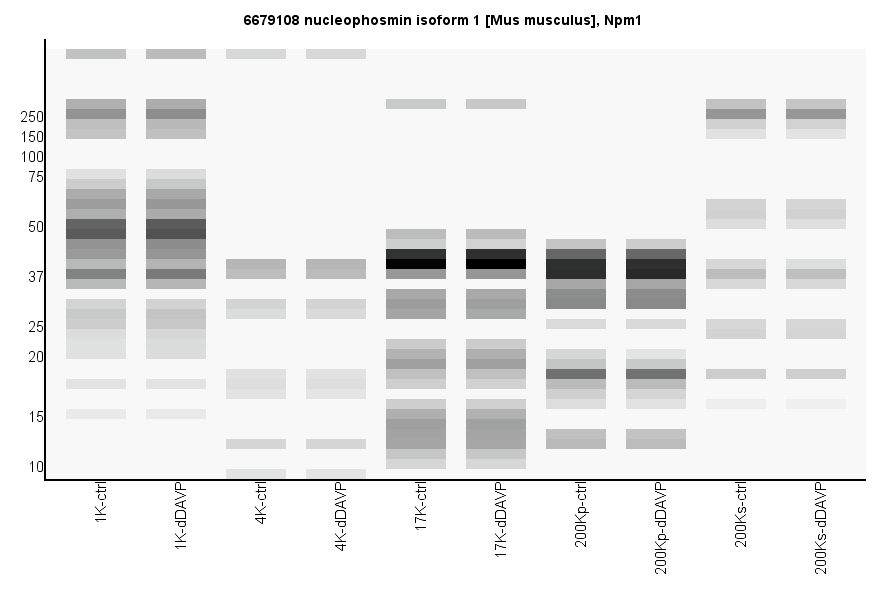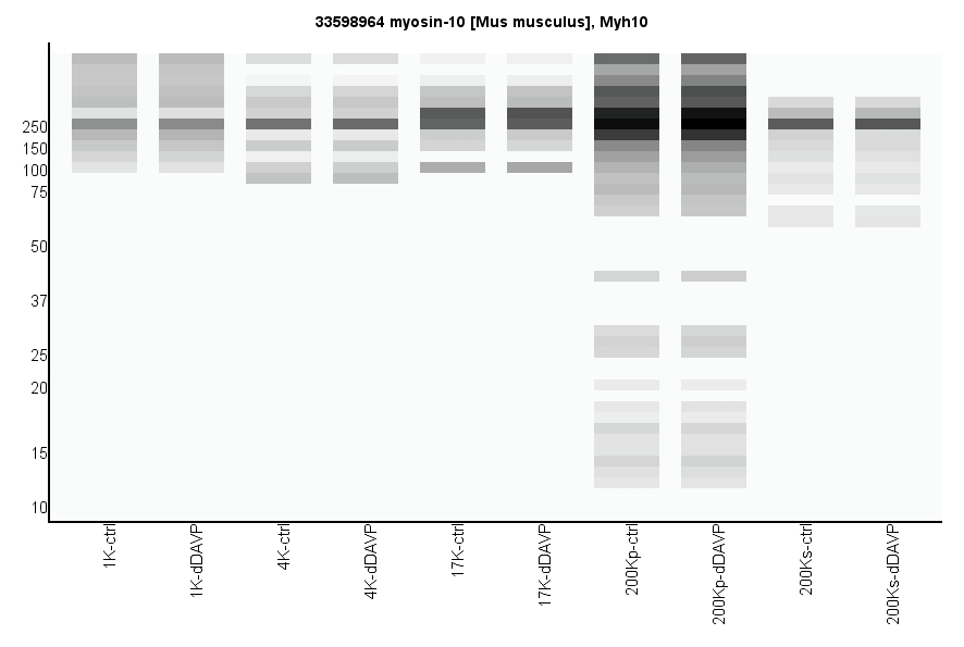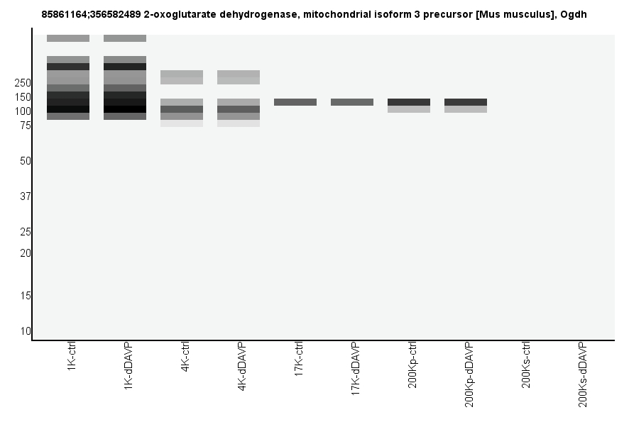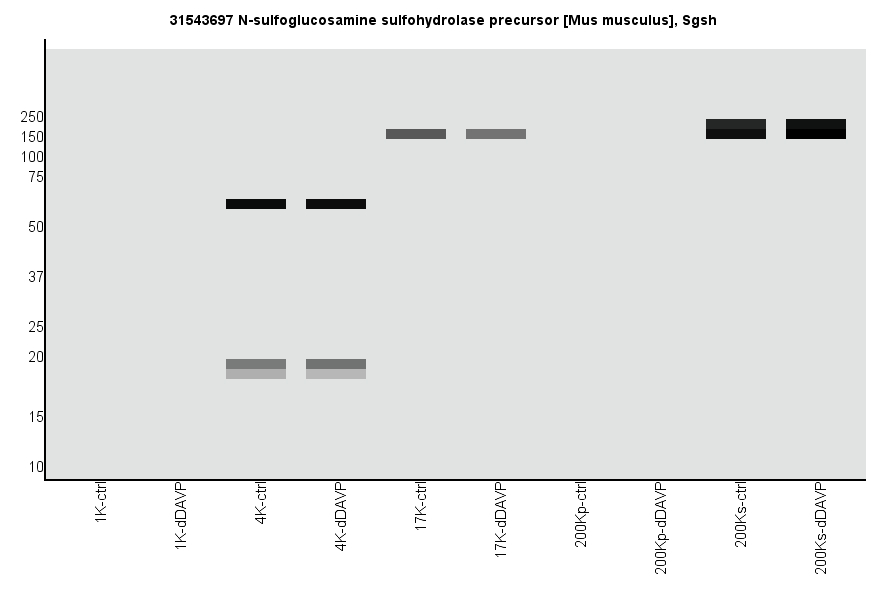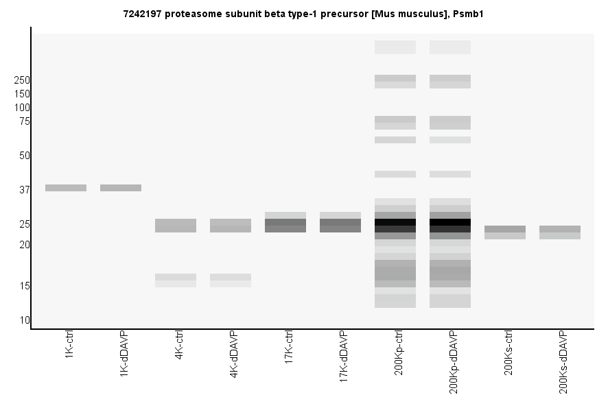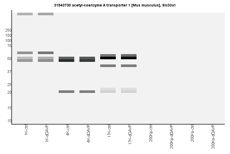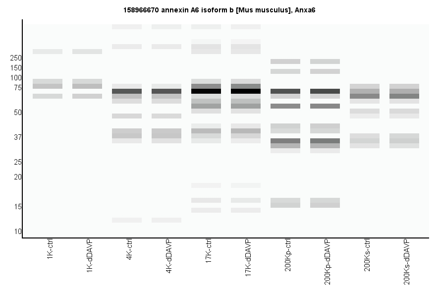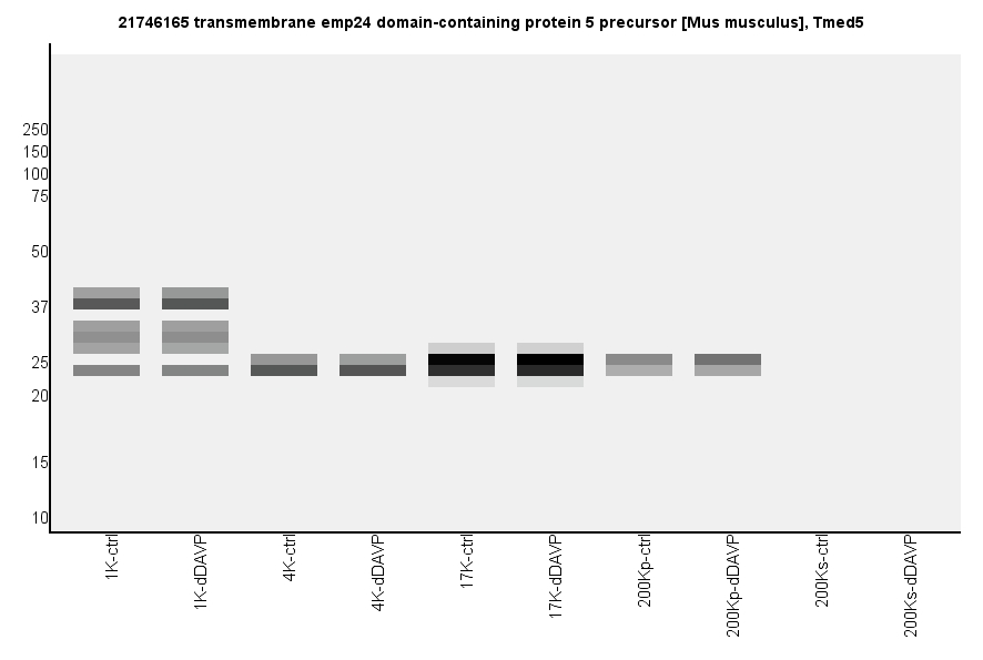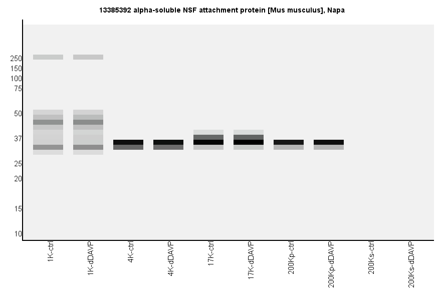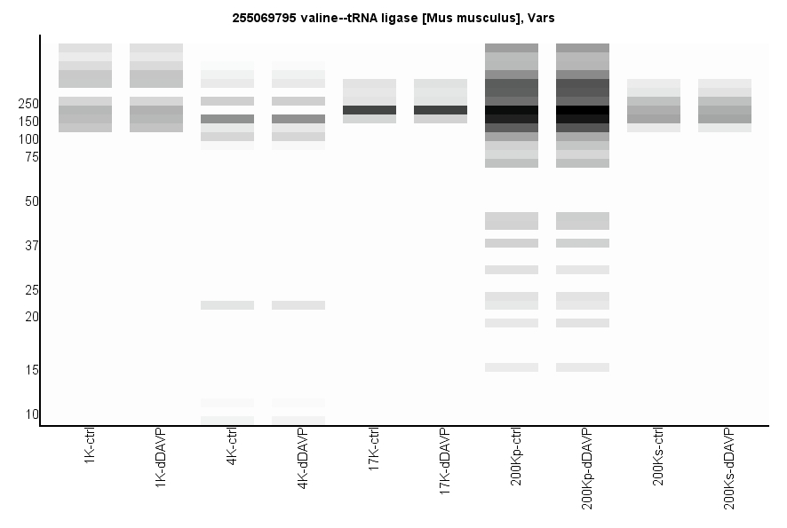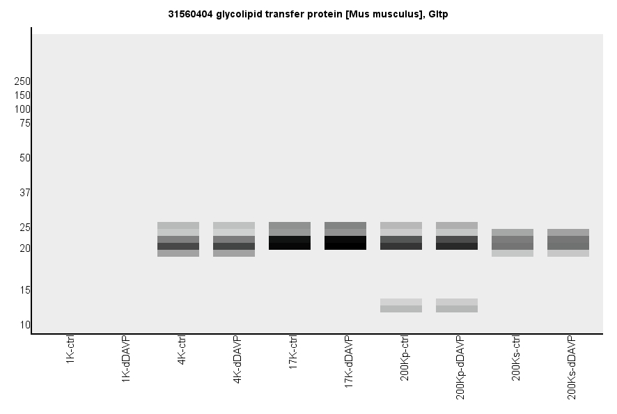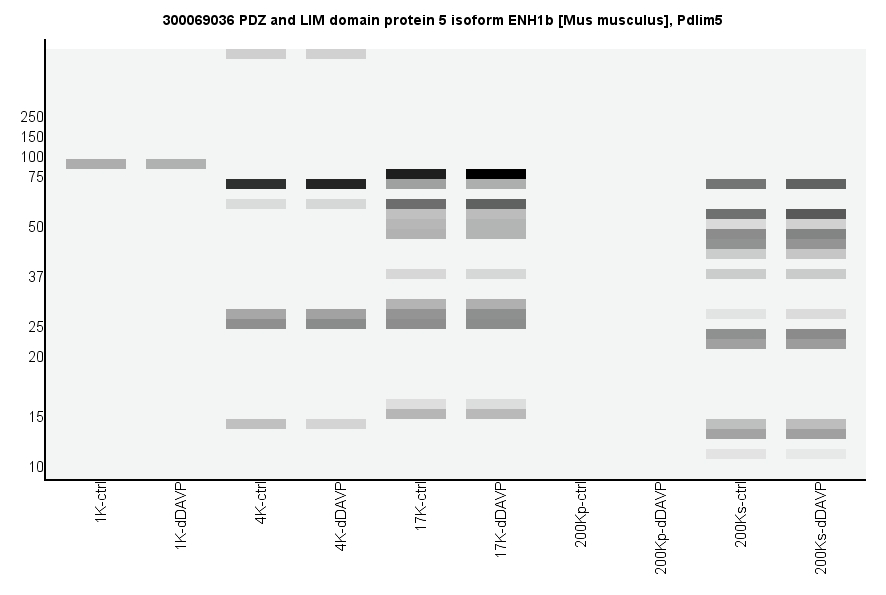 The virtual western blot images show data normalized using a logarithmic conversion scale to map peptide intensities to gray-scale levels. Using this conversion method, low-abundance peptides are generally visible in the blot images. Switch back to the default linear conversion scale database page.