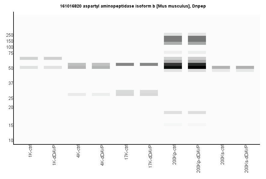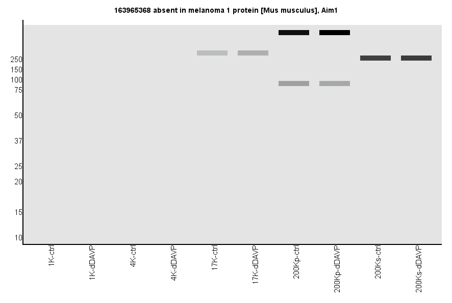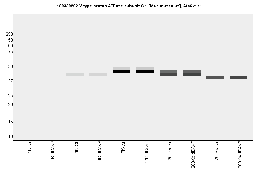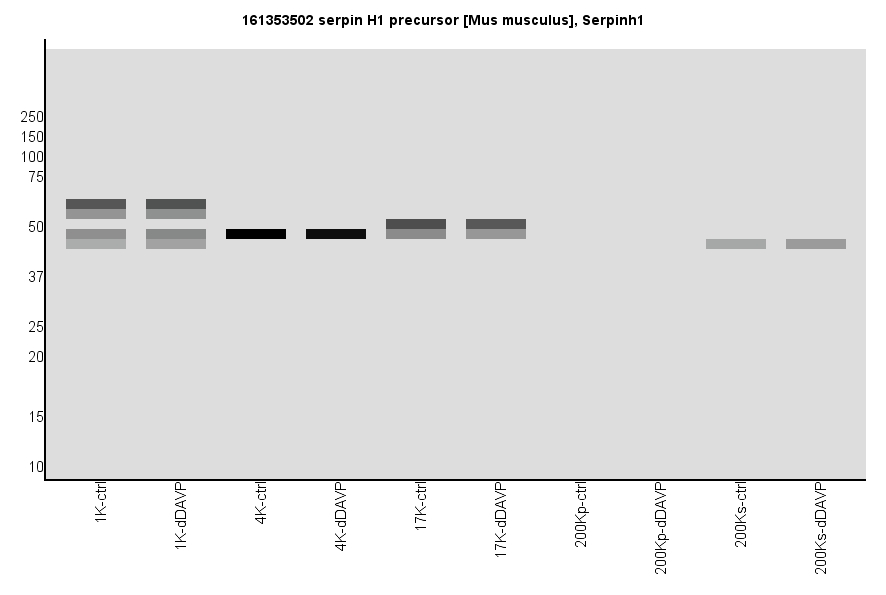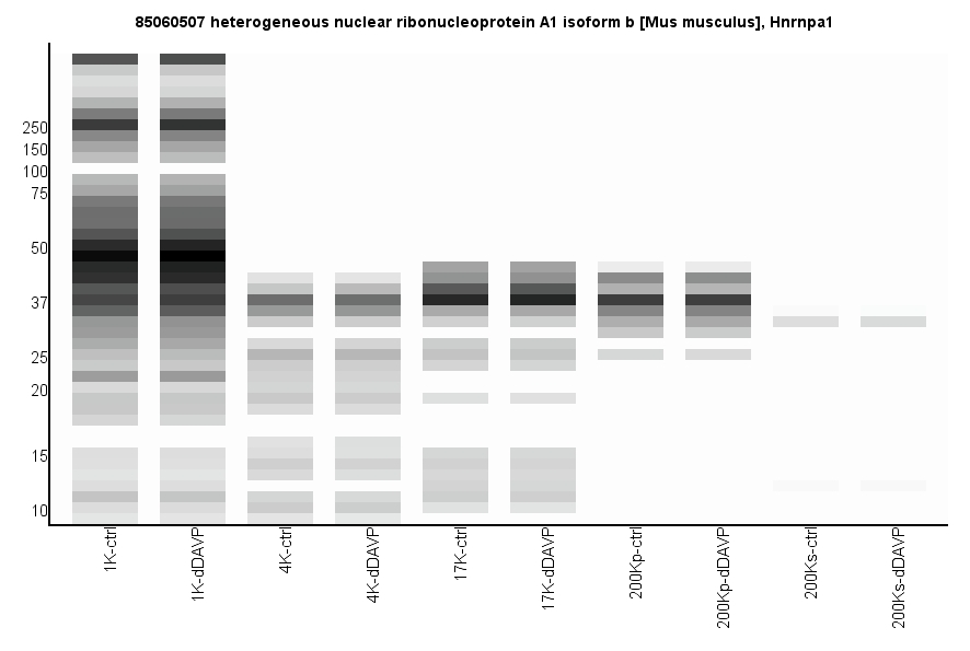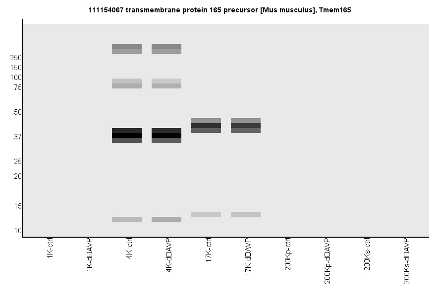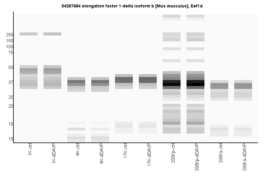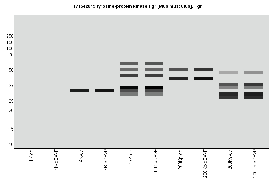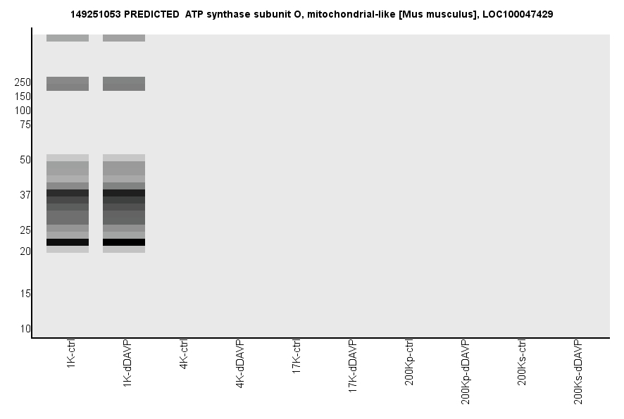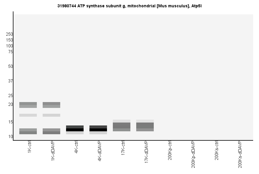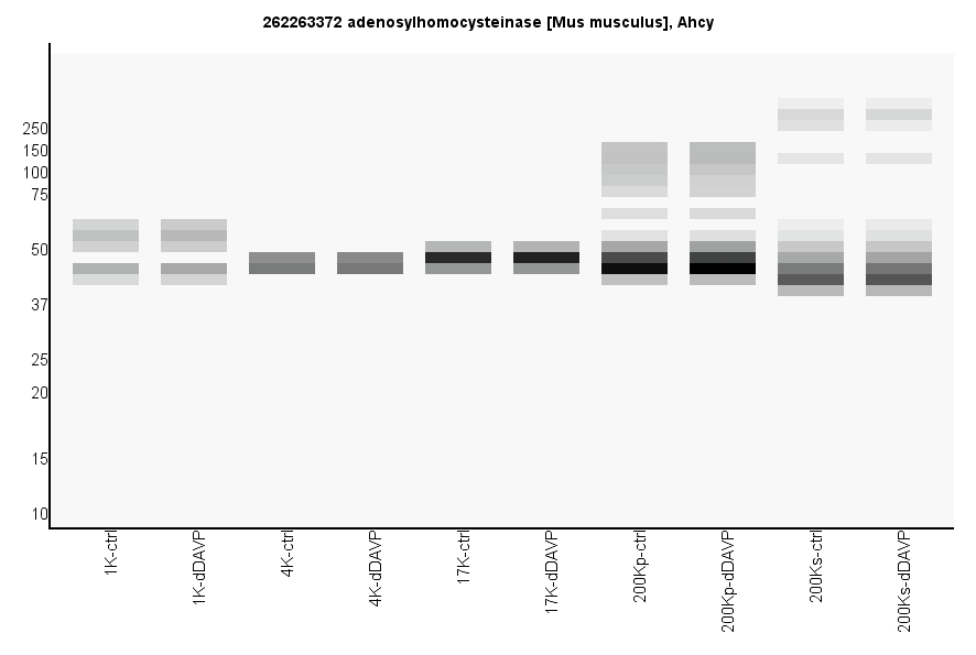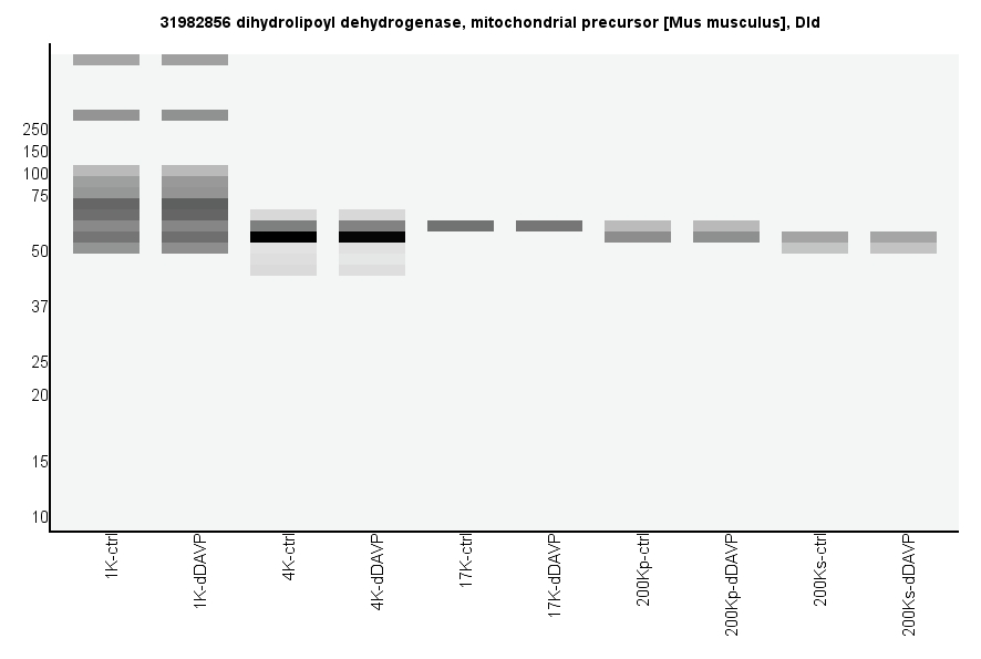 The virtual western blot images show data normalized using a logarithmic conversion scale to map peptide intensities to gray-scale levels. Using this conversion method, low-abundance peptides are generally visible in the blot images. Switch back to the default linear conversion scale database page.