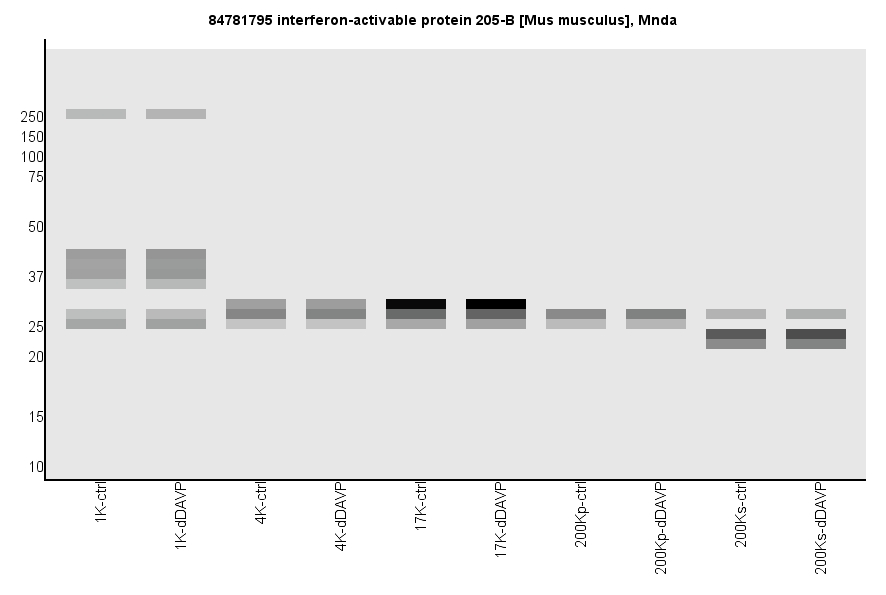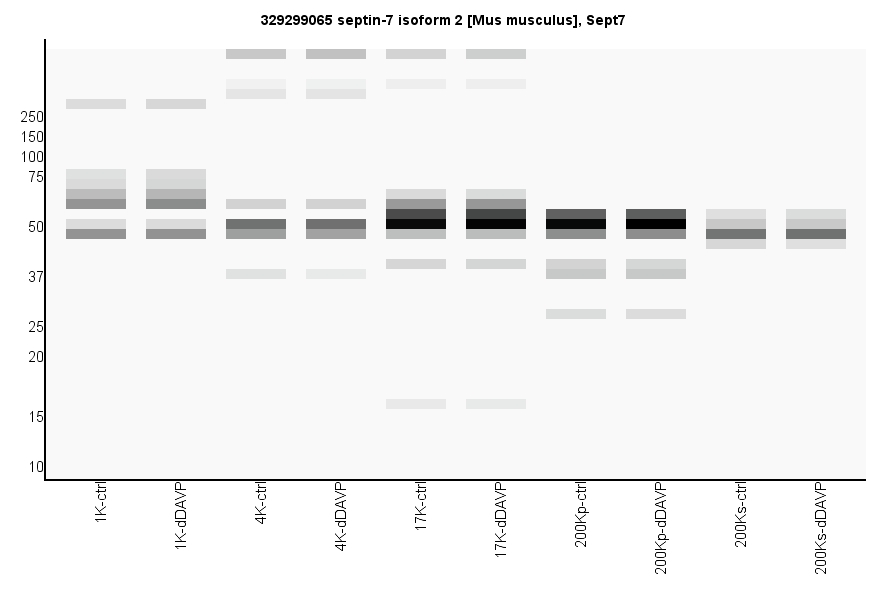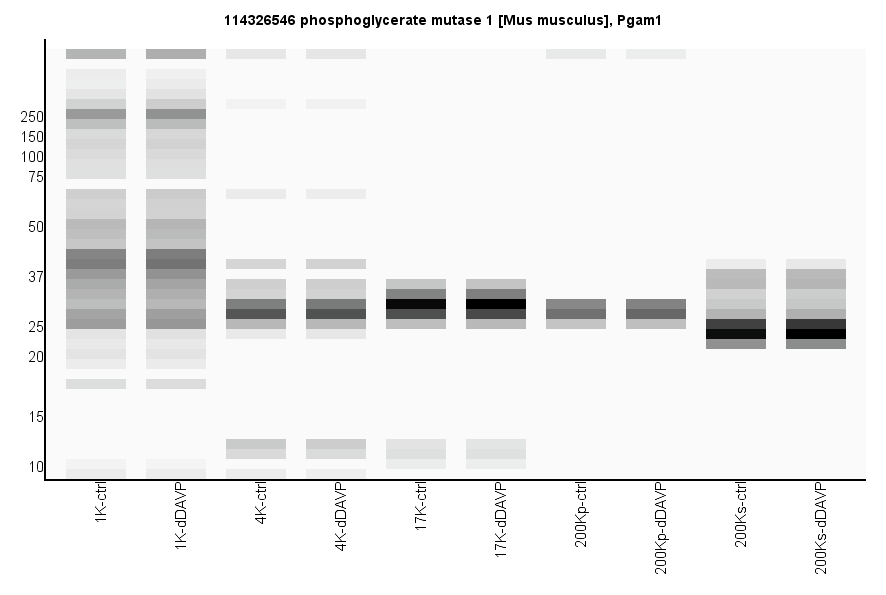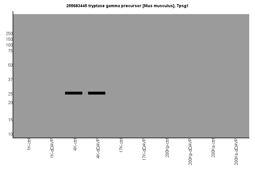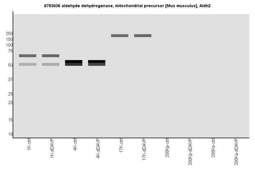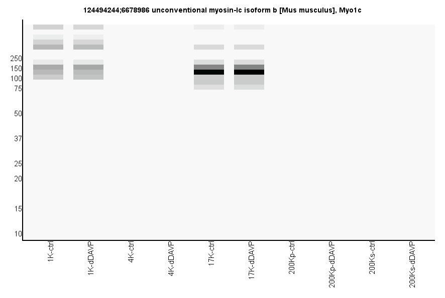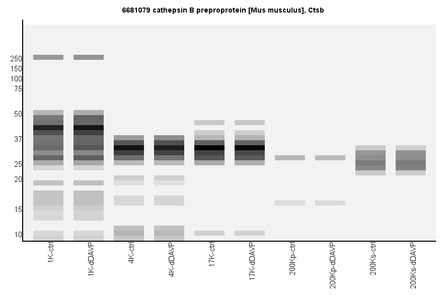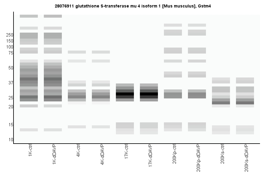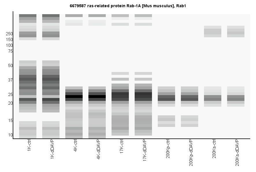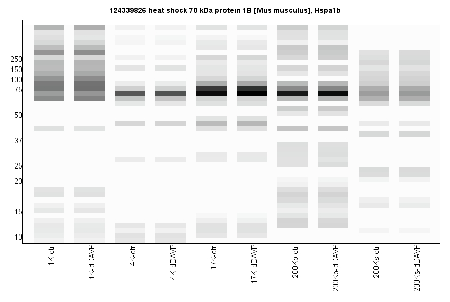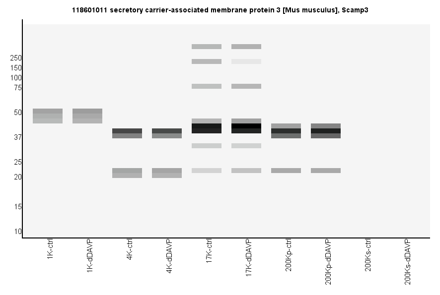 The virtual western blot images show data normalized using a logarithmic conversion scale to map peptide intensities to gray-scale levels. Using this conversion method, low-abundance peptides are generally visible in the blot images. Switch back to the default linear conversion scale database page.
