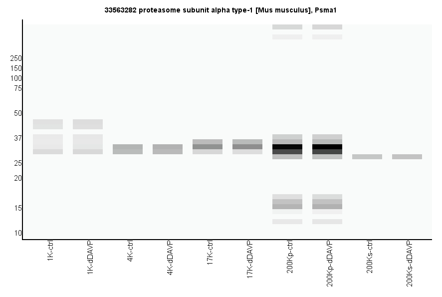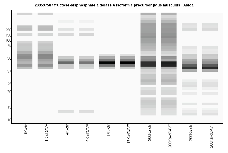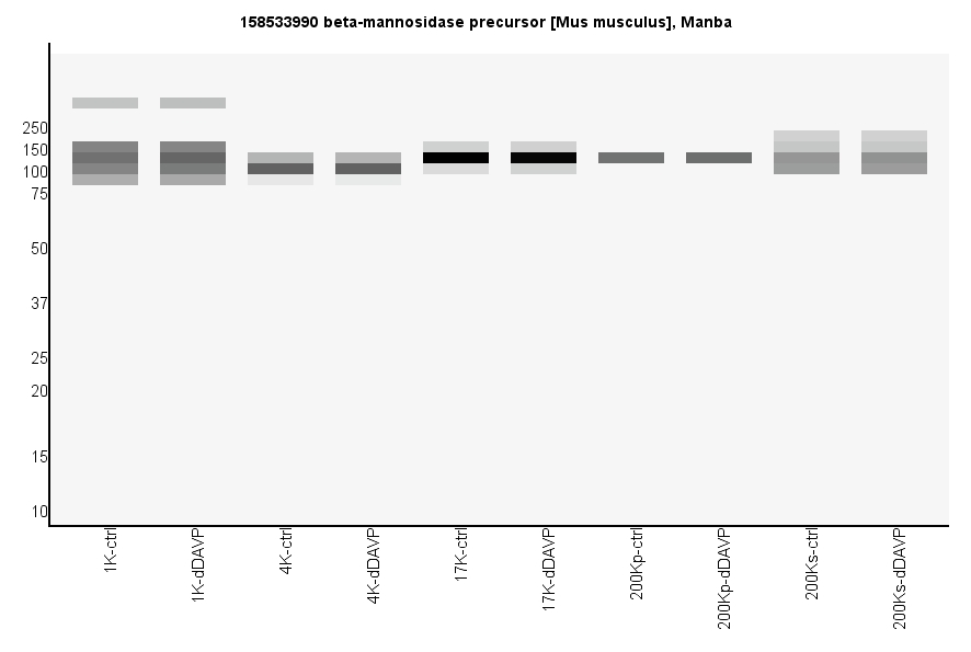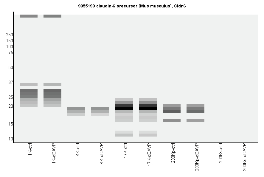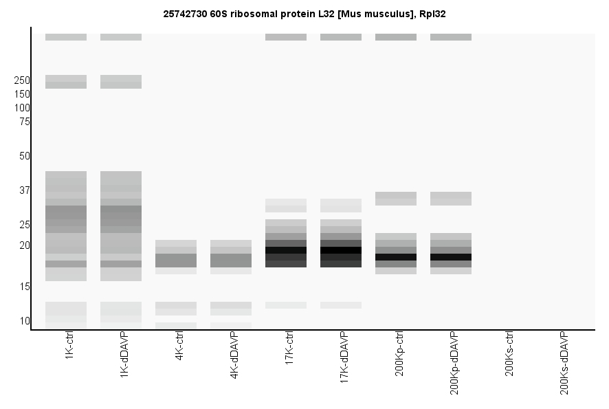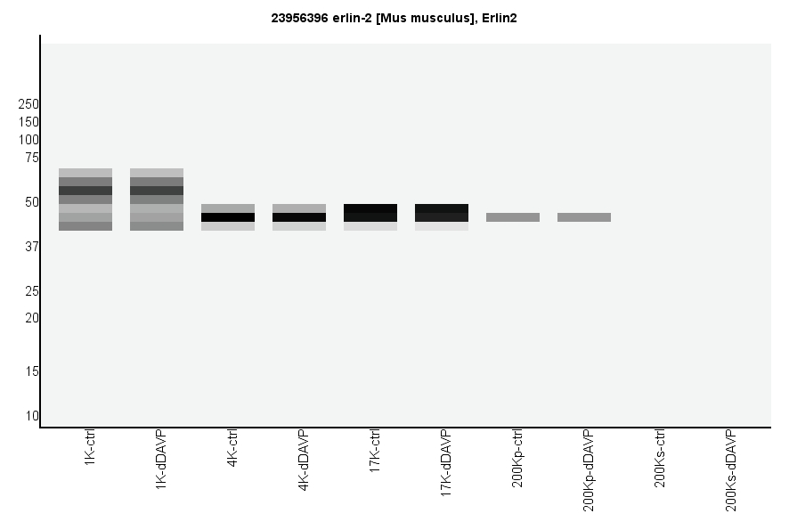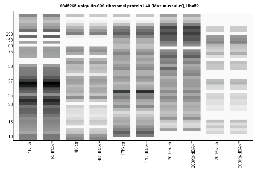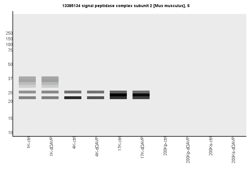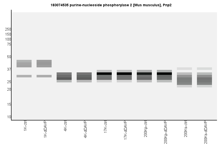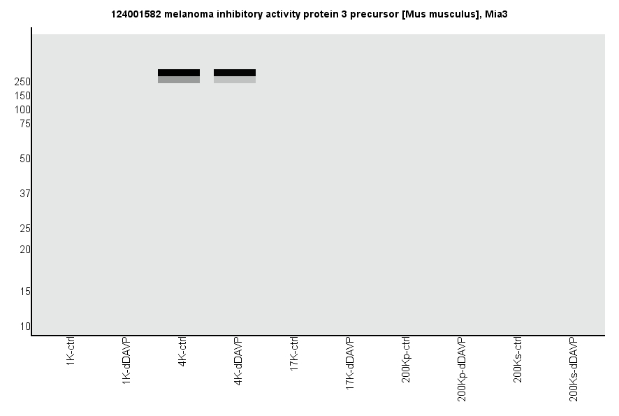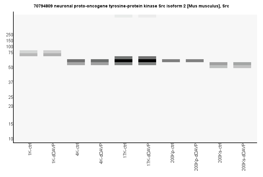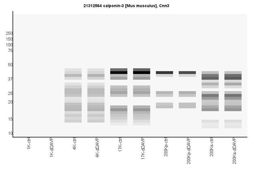 The virtual western blot images show data normalized using a logarithmic conversion scale to map peptide intensities to gray-scale levels. Using this conversion method, low-abundance peptides are generally visible in the blot images. Switch back to the default linear conversion scale database page.