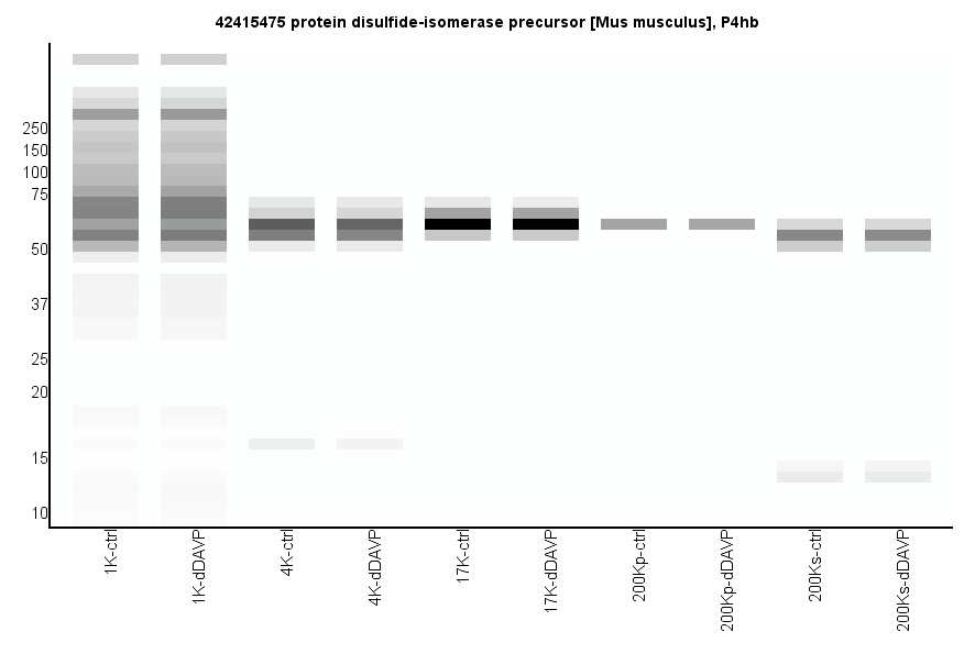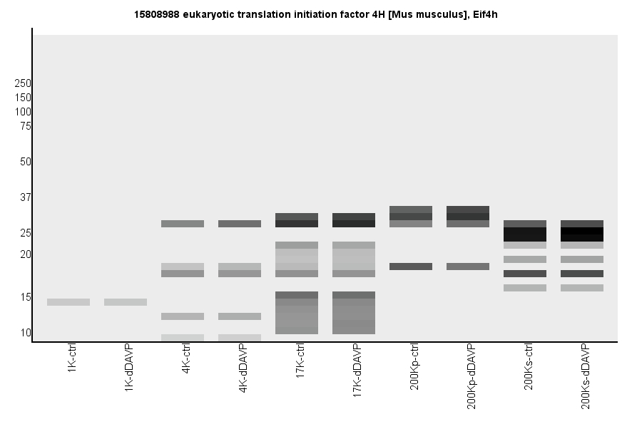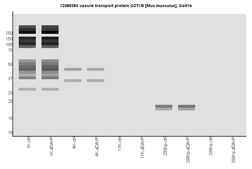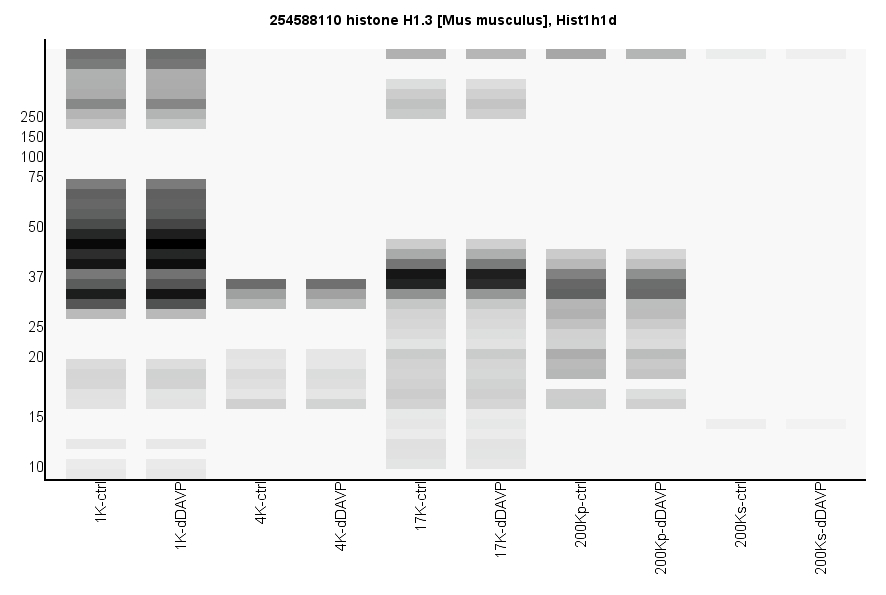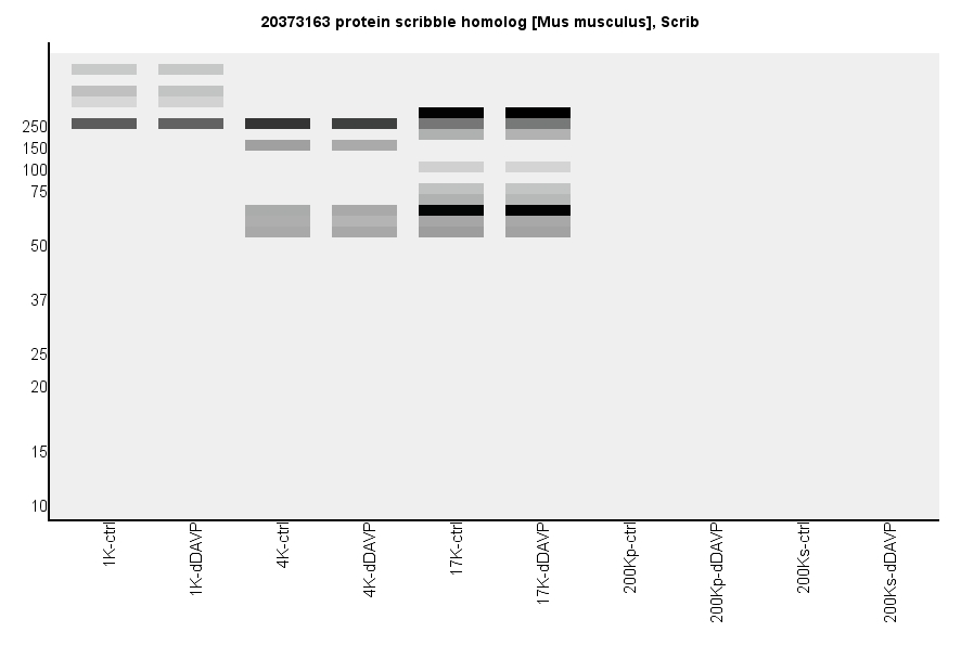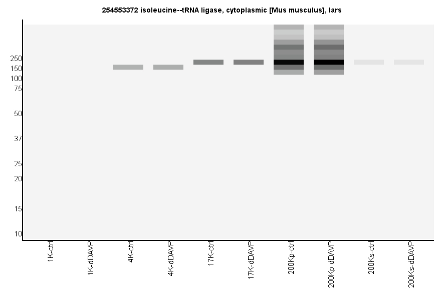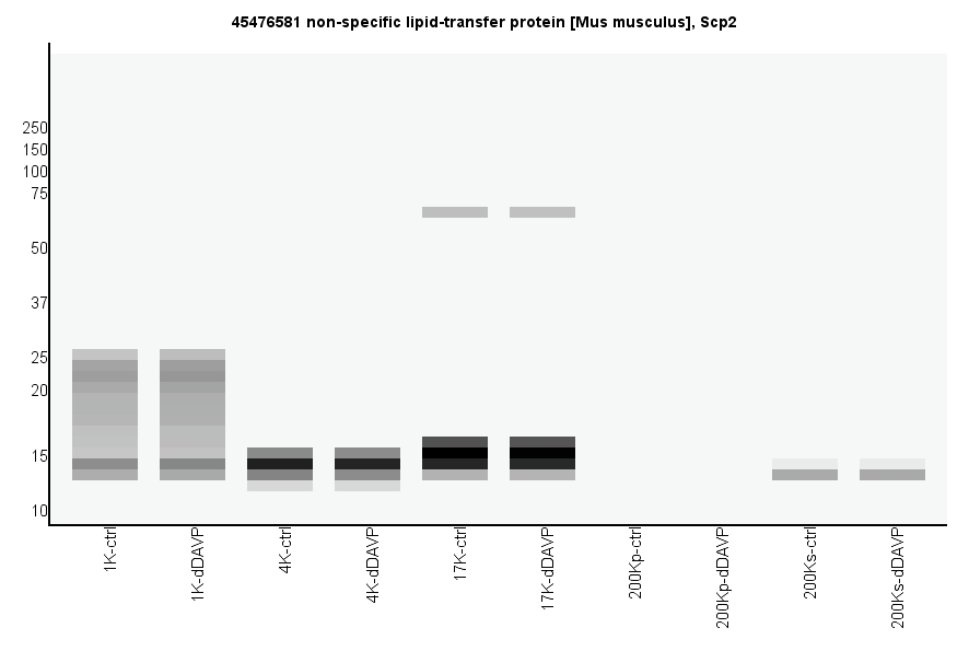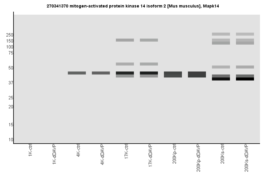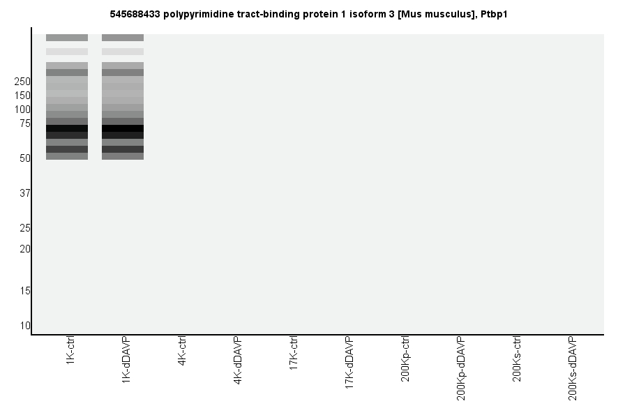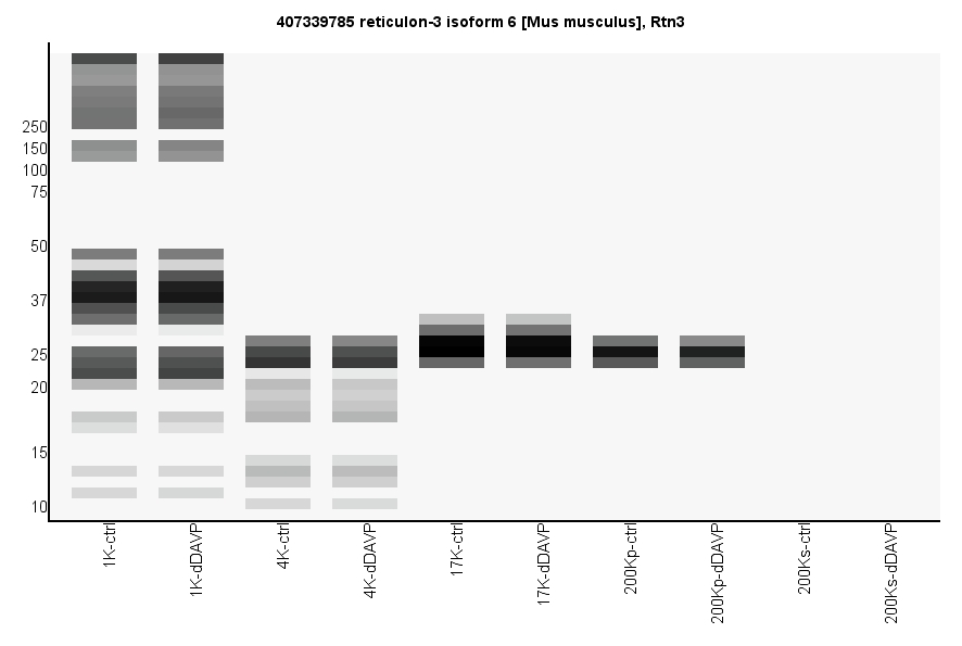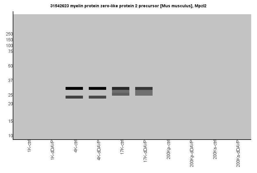 The virtual western blot images show data normalized using a logarithmic conversion scale to map peptide intensities to gray-scale levels. Using this conversion method, low-abundance peptides are generally visible in the blot images. Switch back to the default linear conversion scale database page.