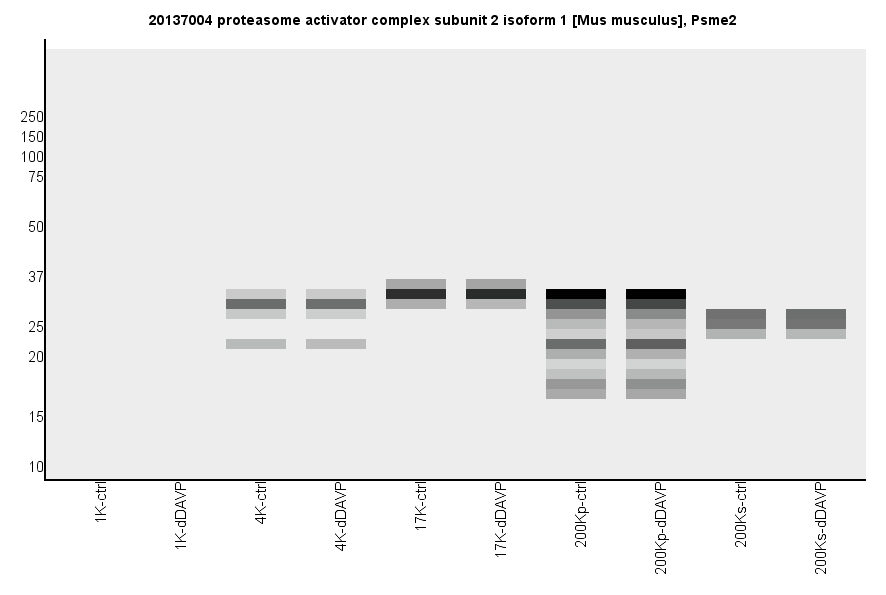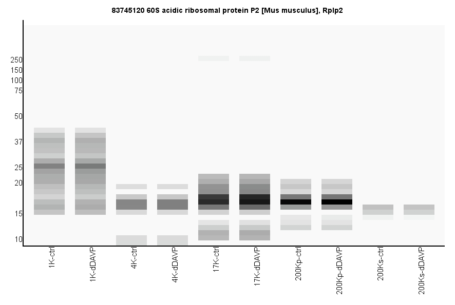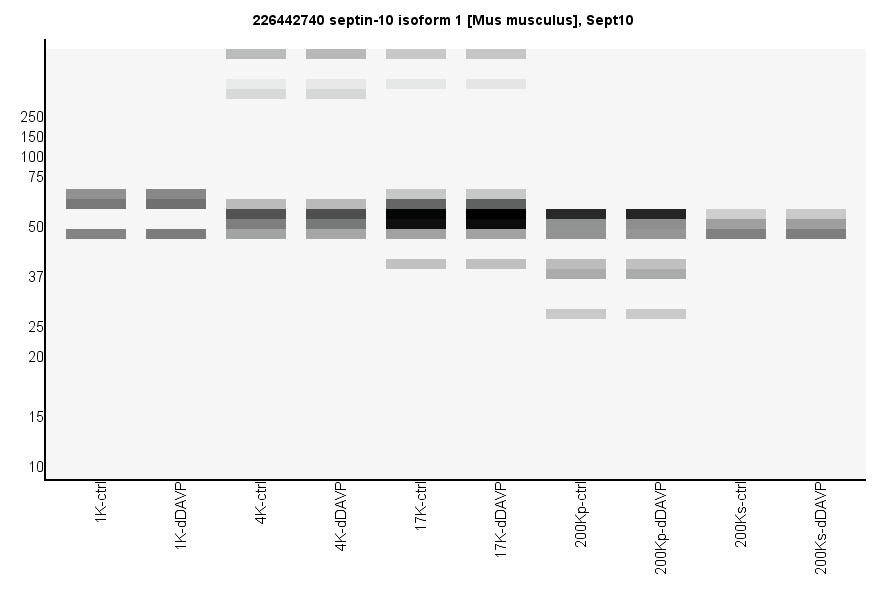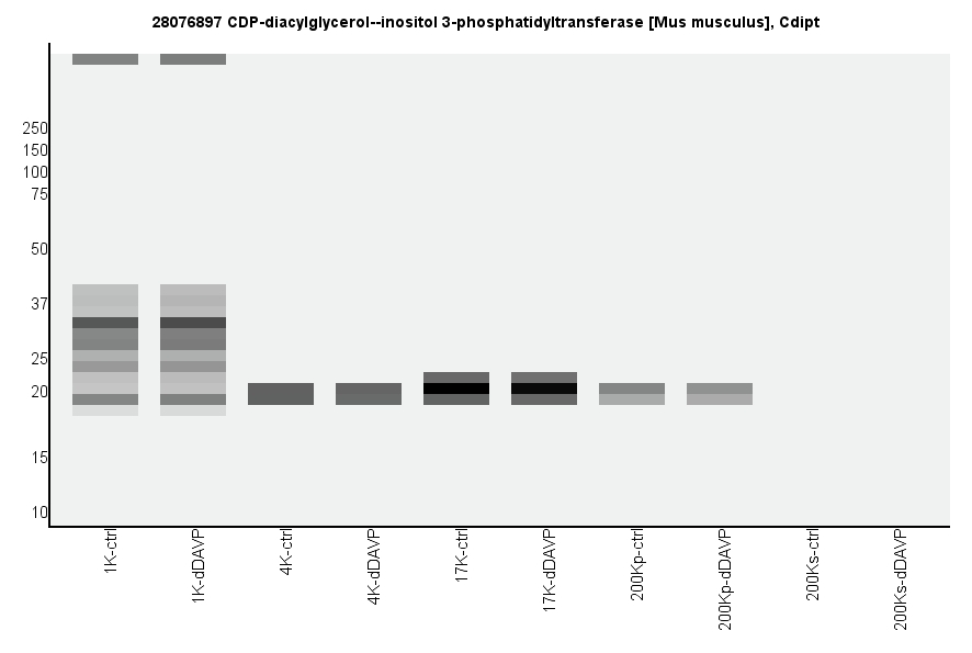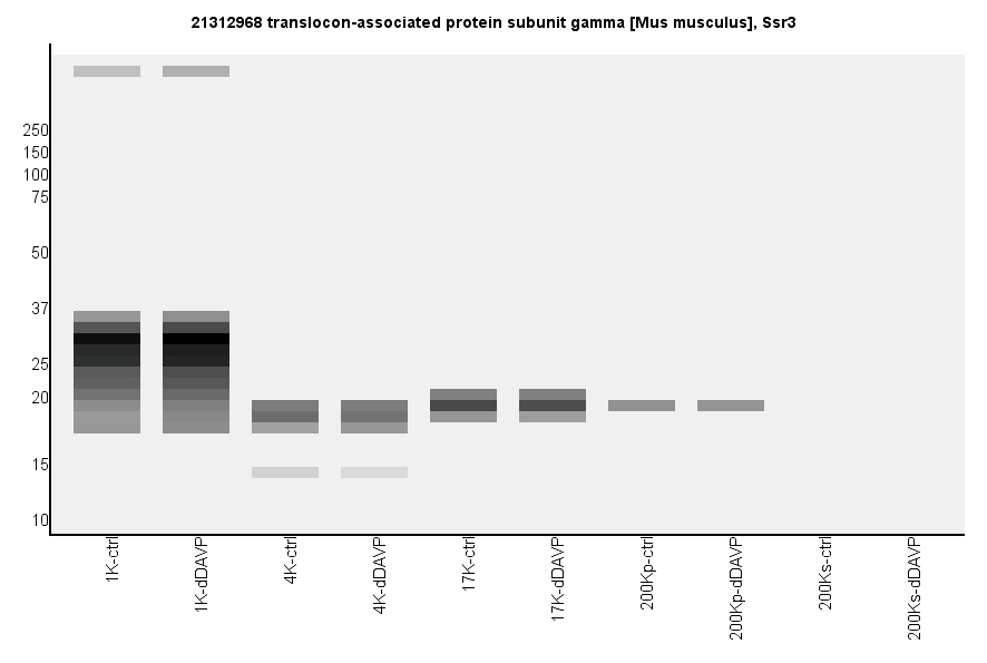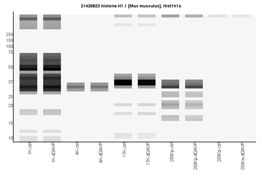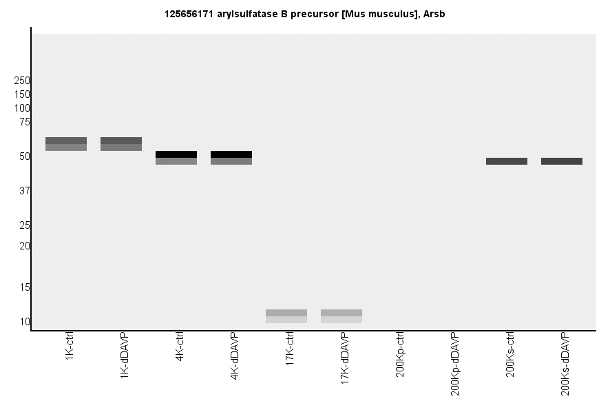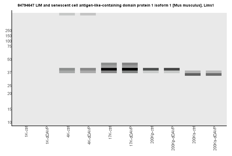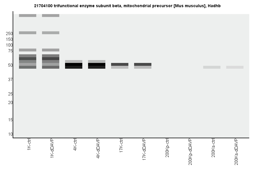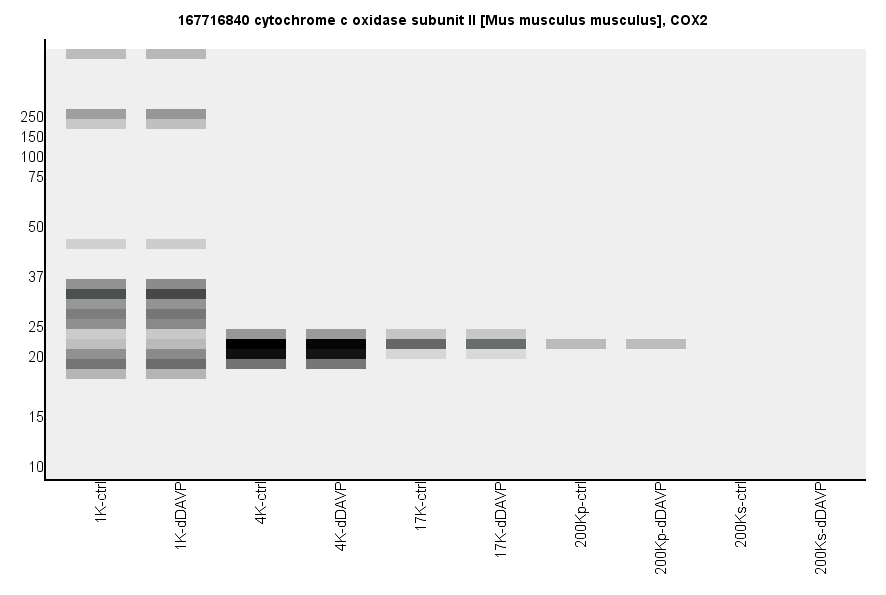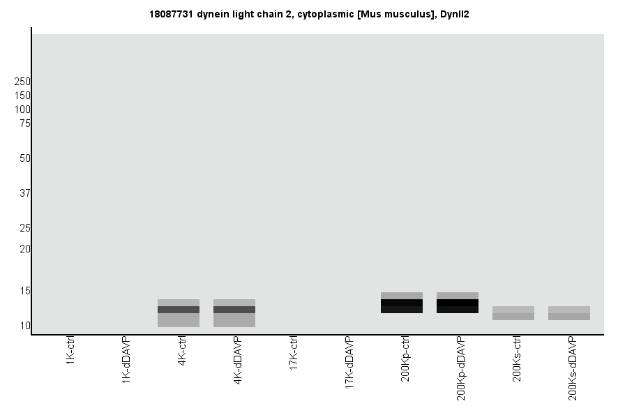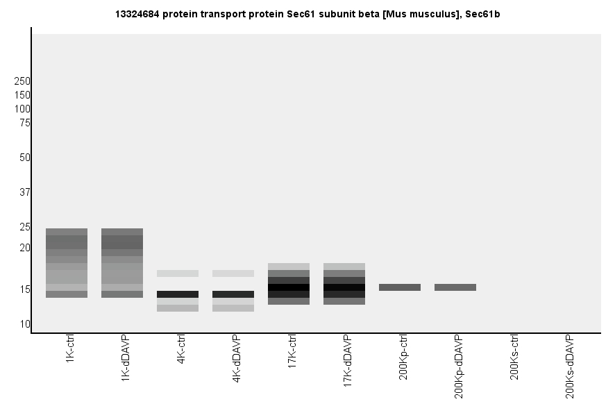 The virtual western blot images show data normalized using a logarithmic conversion scale to map peptide intensities to gray-scale levels. Using this conversion method, low-abundance peptides are generally visible in the blot images. Switch back to the default linear conversion scale database page.