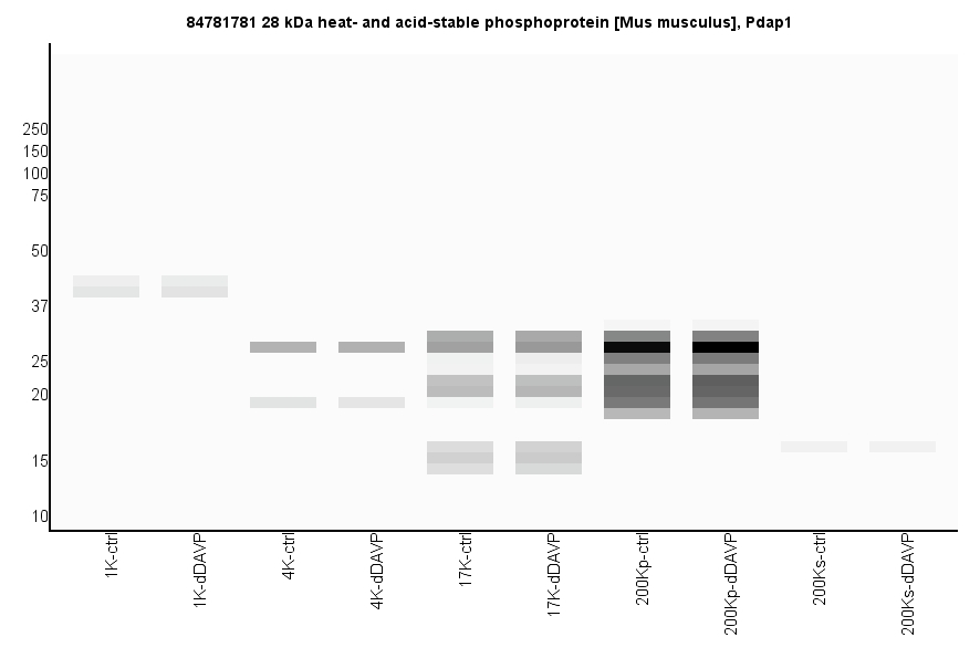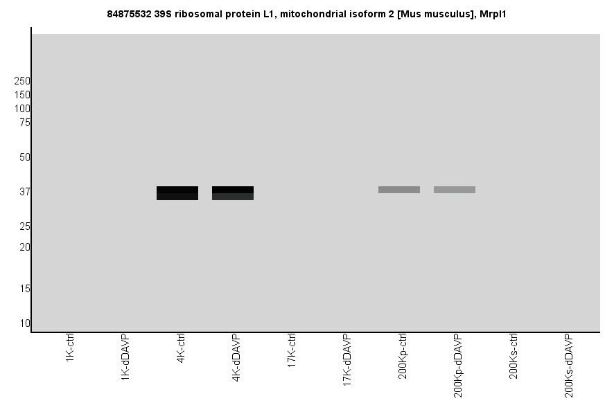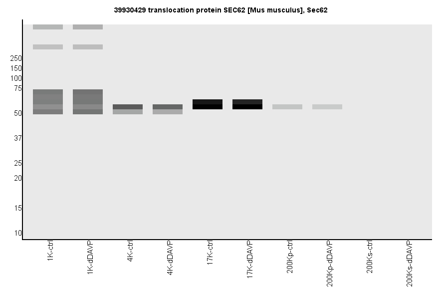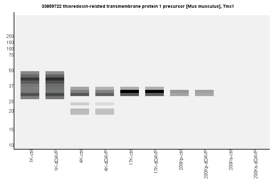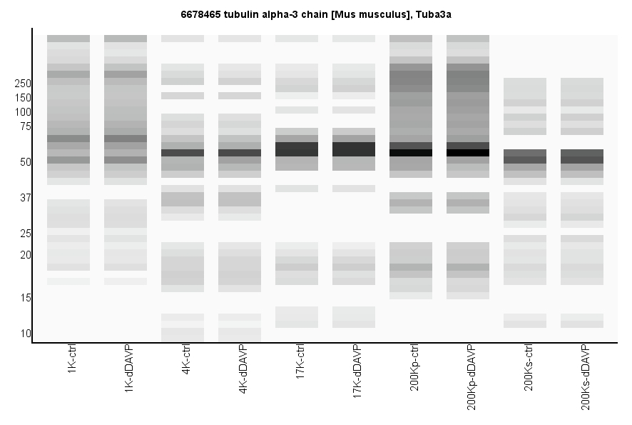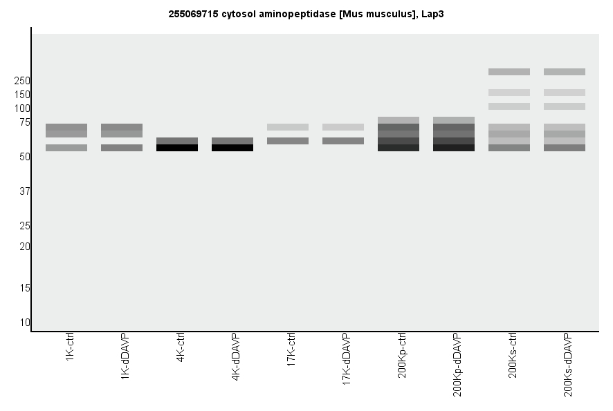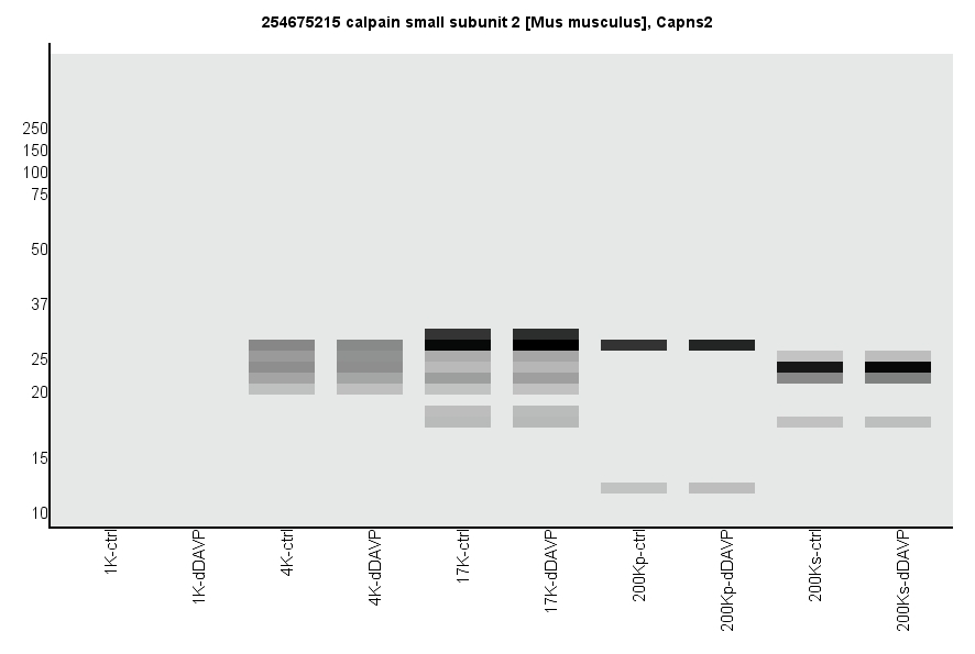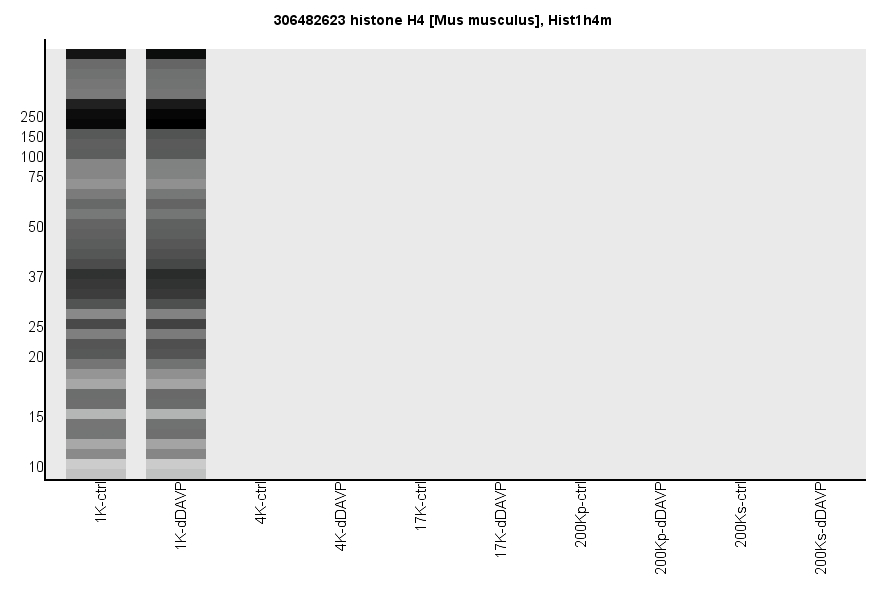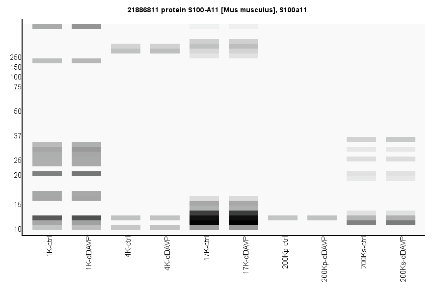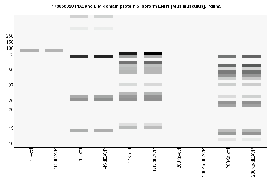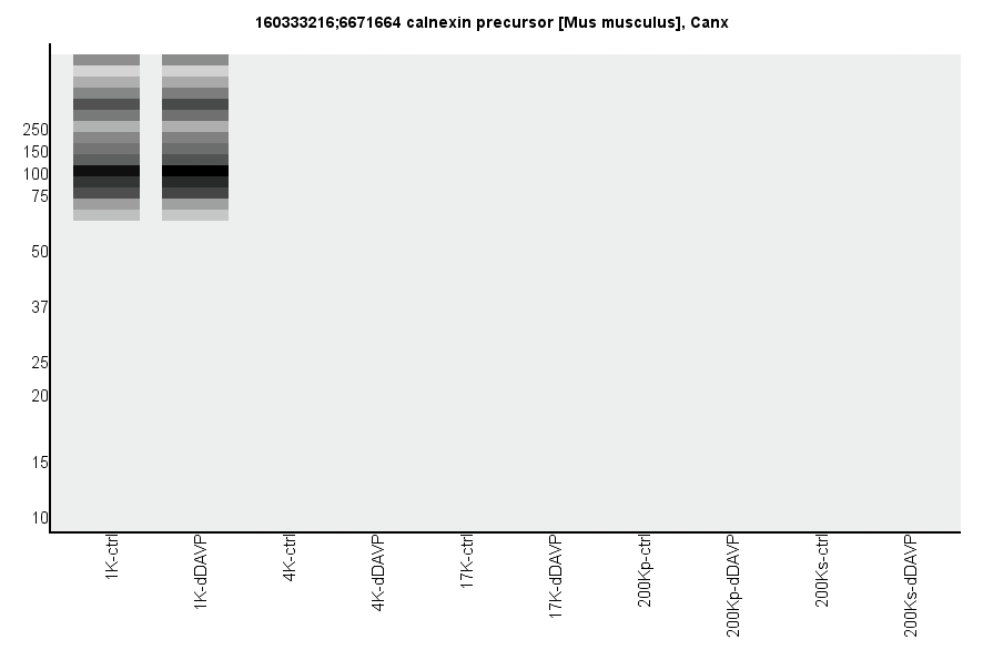 The virtual western blot images show data normalized using a logarithmic conversion scale to map peptide intensities to gray-scale levels. Using this conversion method, low-abundance peptides are generally visible in the blot images. Switch back to the default linear conversion scale database page.