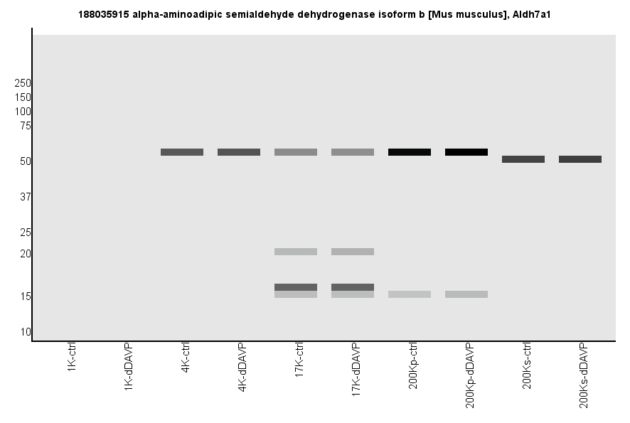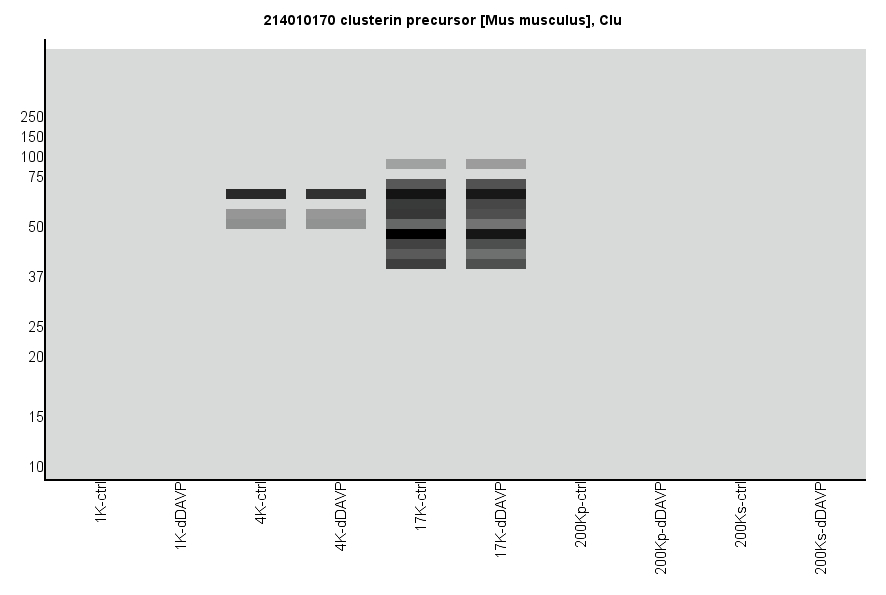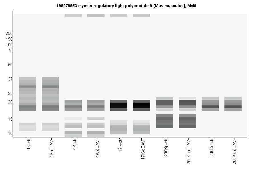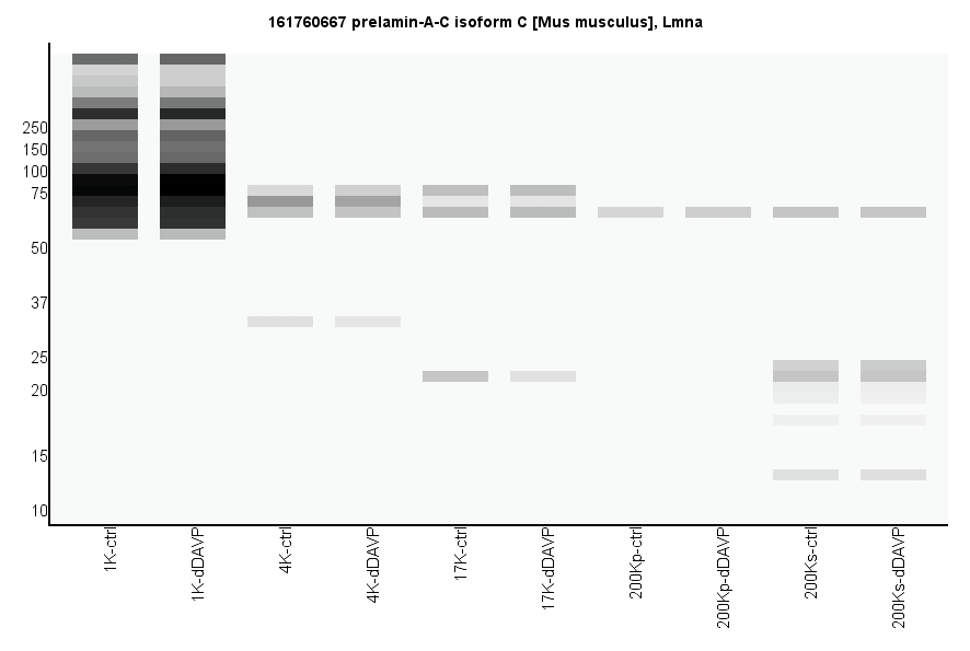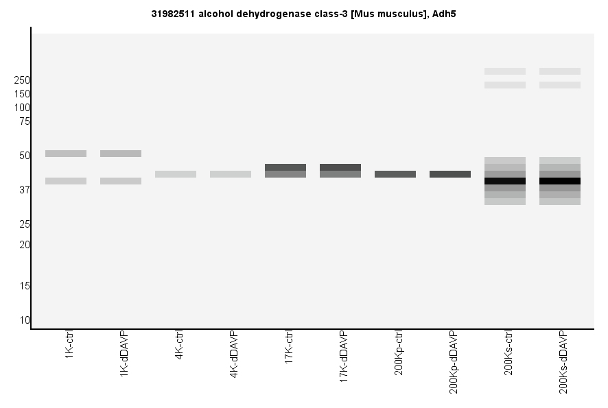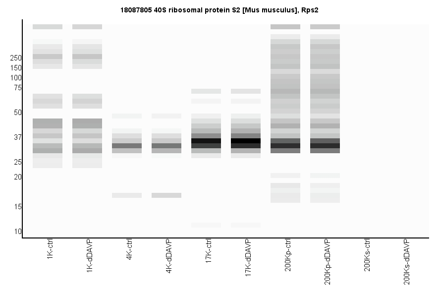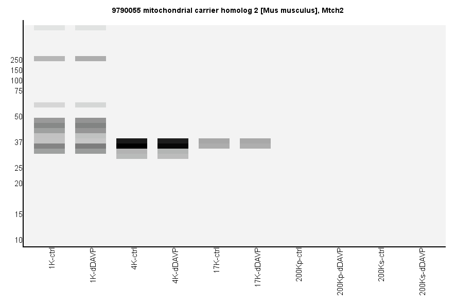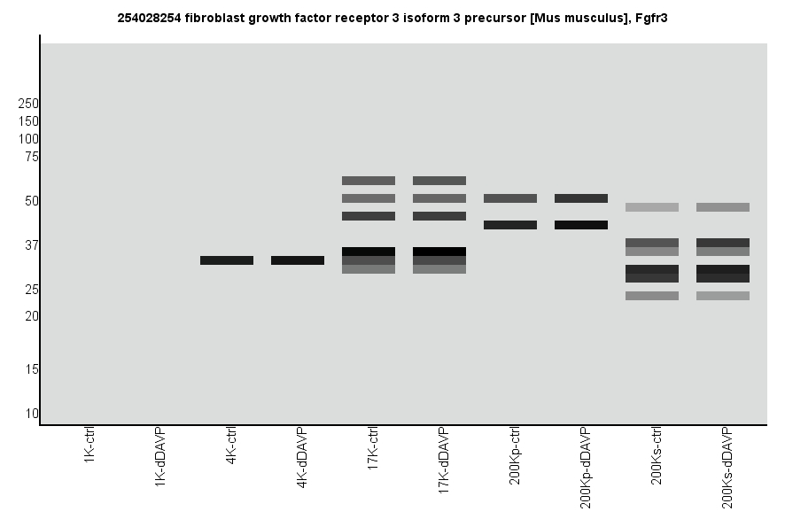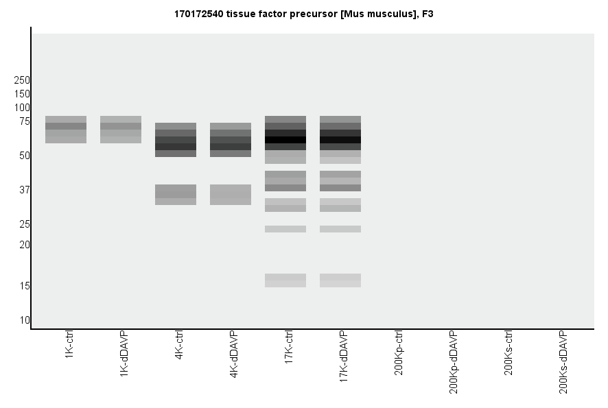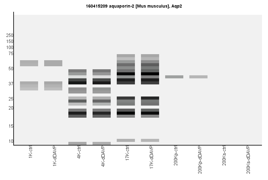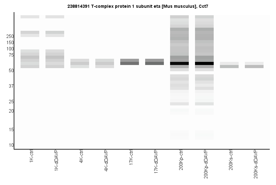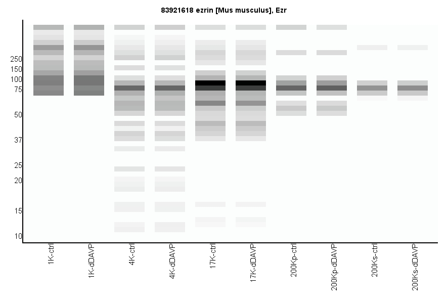 The virtual western blot images show data normalized using a logarithmic conversion scale to map peptide intensities to gray-scale levels. Using this conversion method, low-abundance peptides are generally visible in the blot images. Switch back to the default linear conversion scale database page.