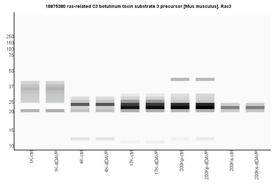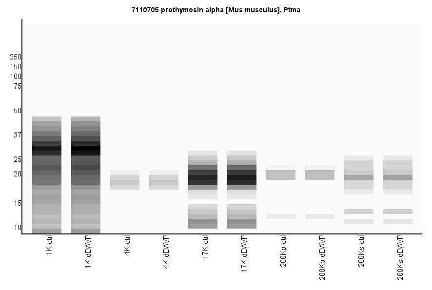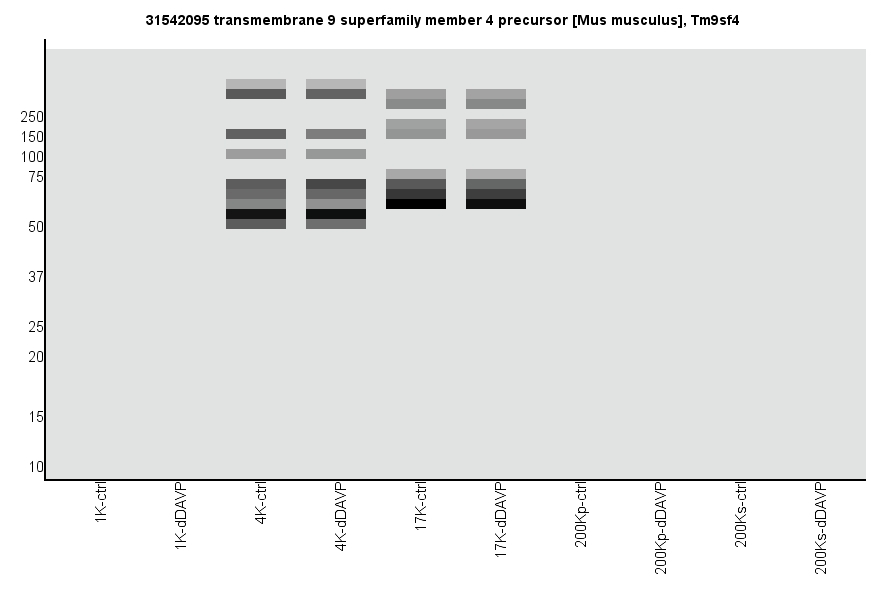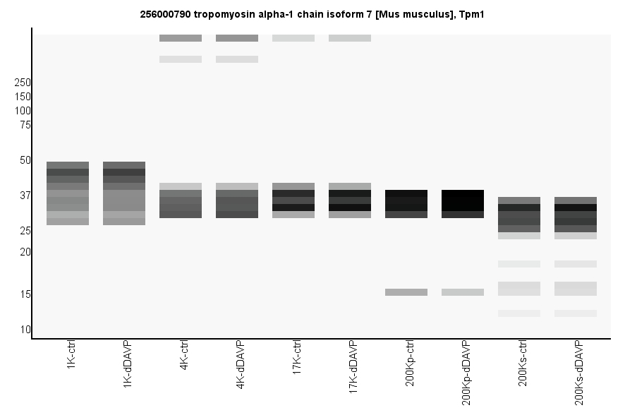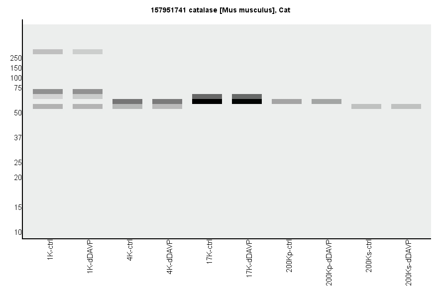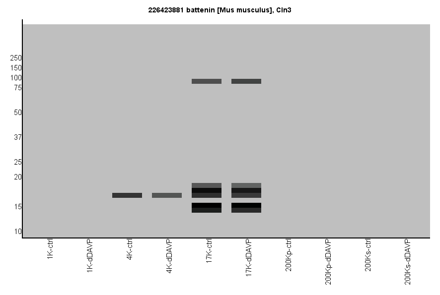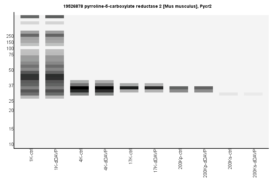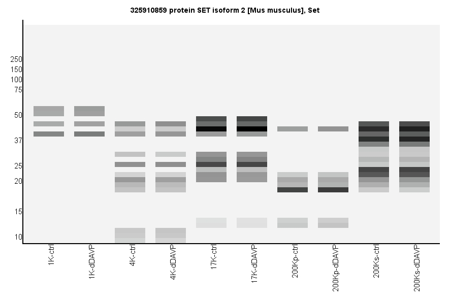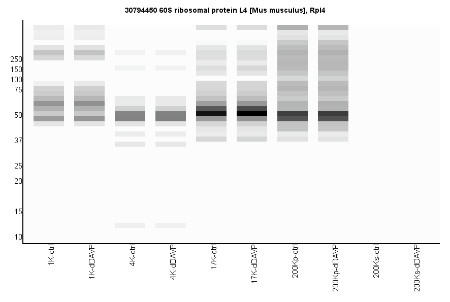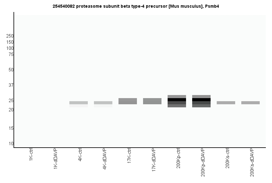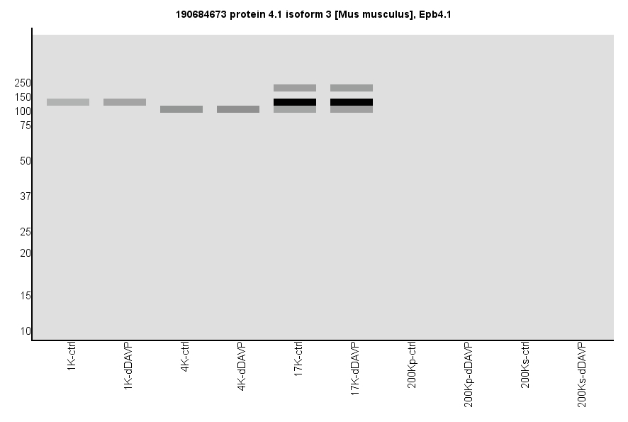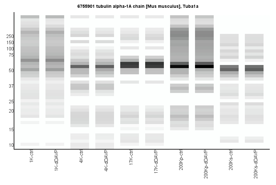 The virtual western blot images show data normalized using a logarithmic conversion scale to map peptide intensities to gray-scale levels. Using this conversion method, low-abundance peptides are generally visible in the blot images. Switch back to the default linear conversion scale database page.