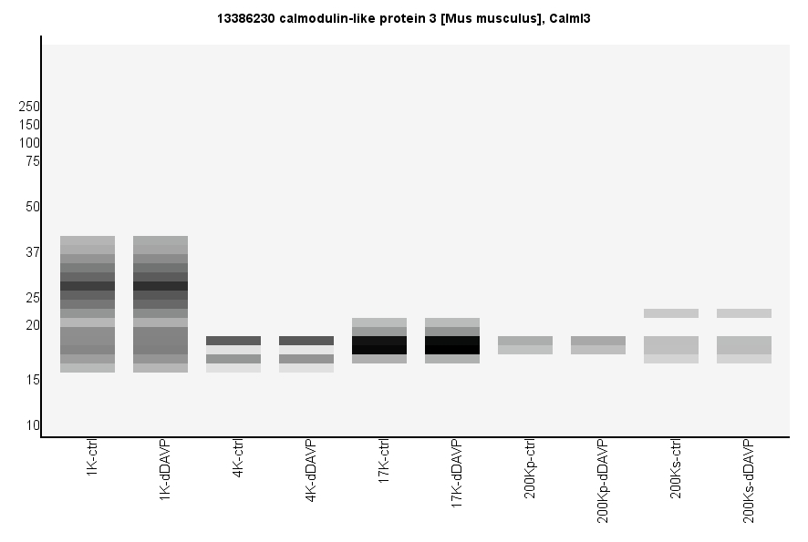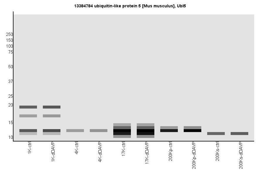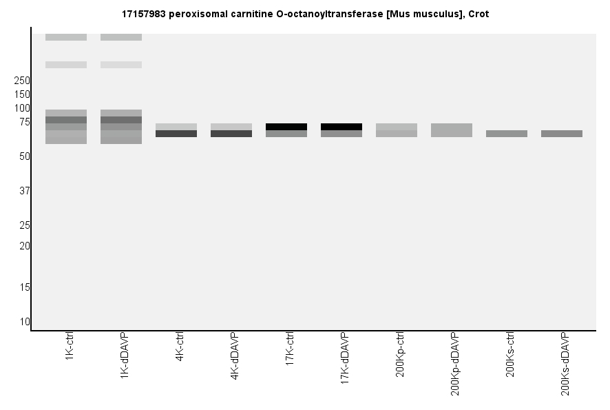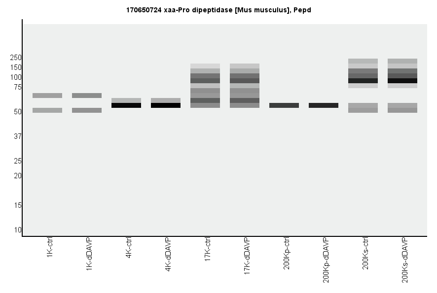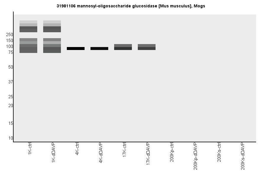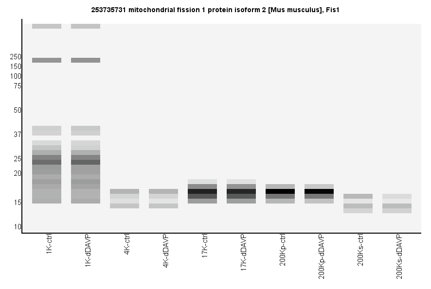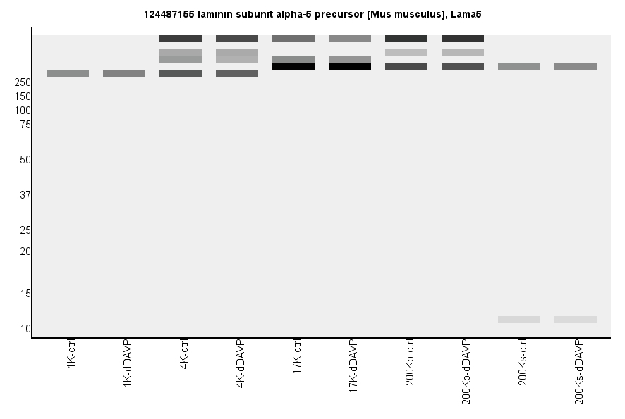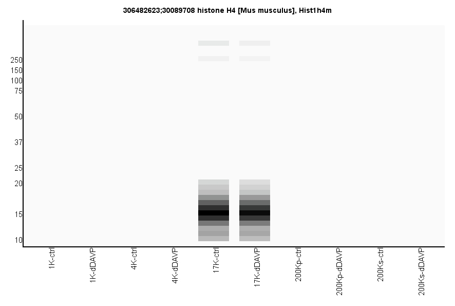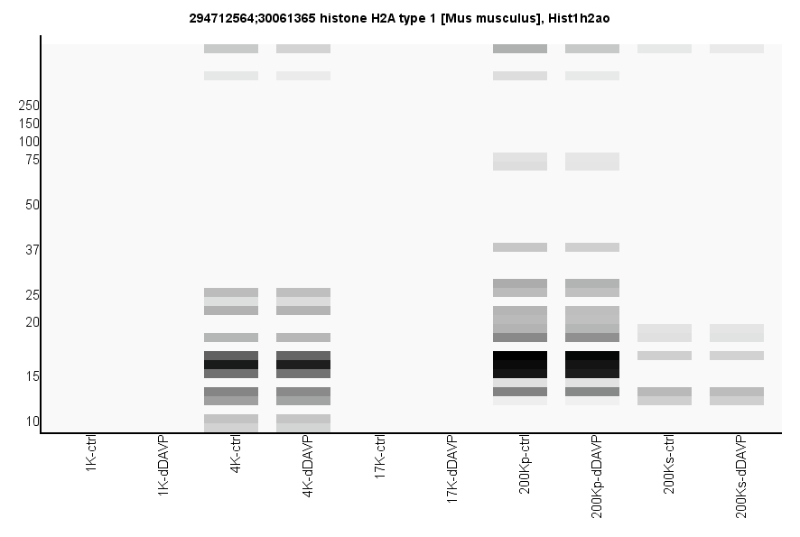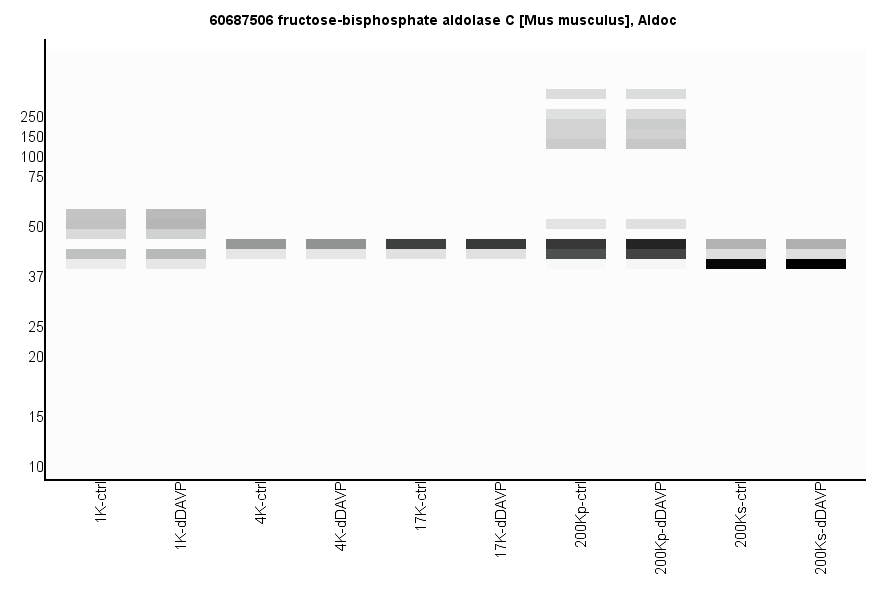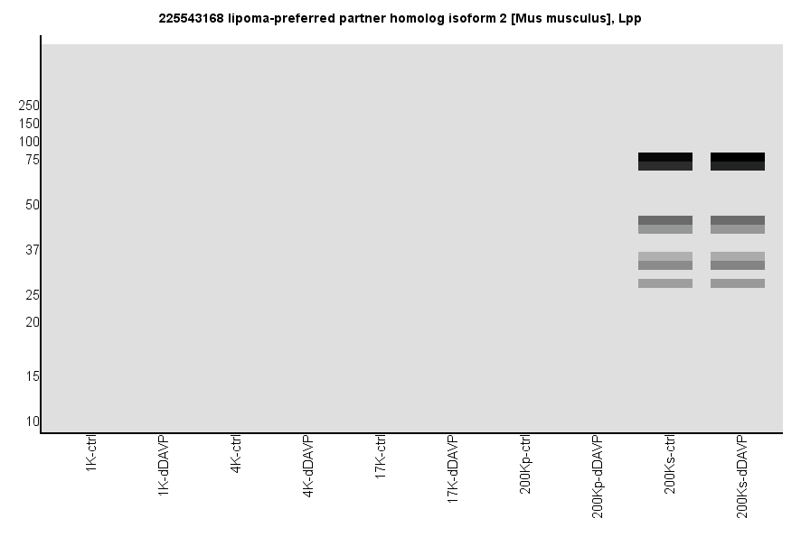 The virtual western blot images show data normalized using a logarithmic conversion scale to map peptide intensities to gray-scale levels. Using this conversion method, low-abundance peptides are generally visible in the blot images. Switch back to the default linear conversion scale database page.