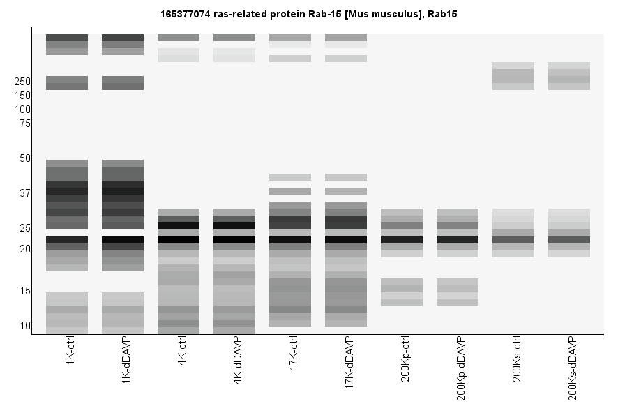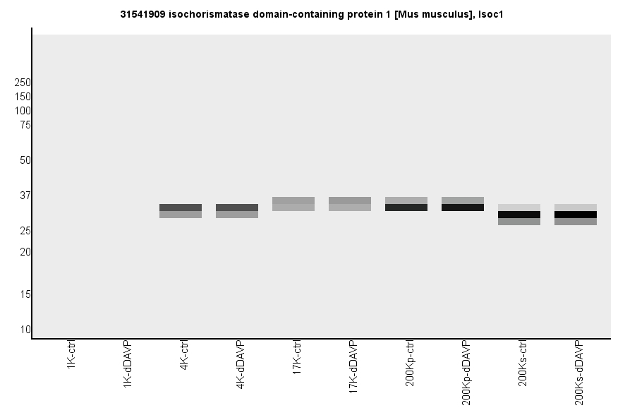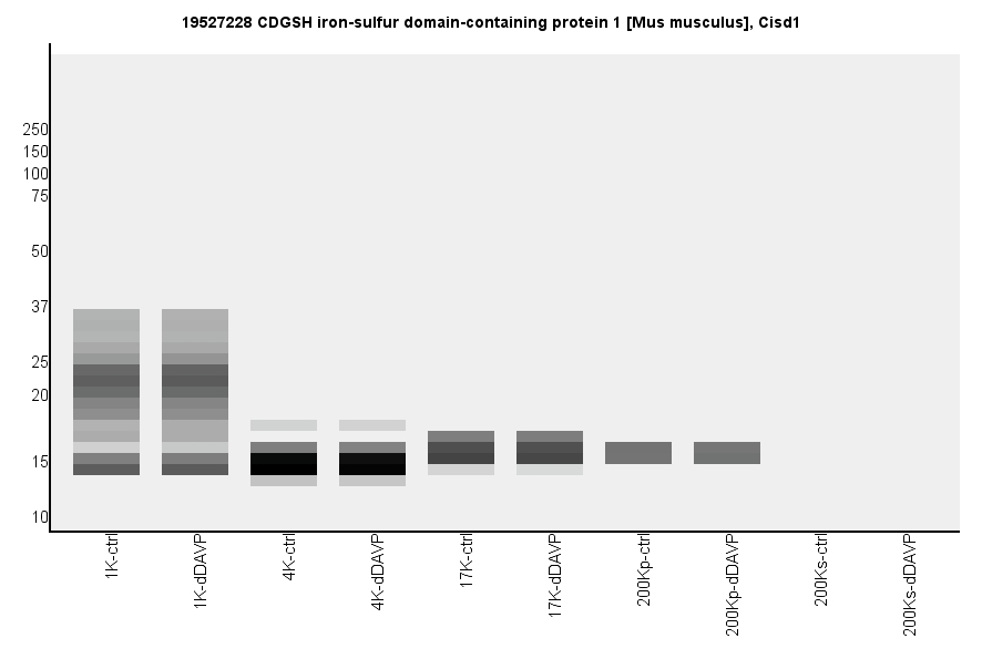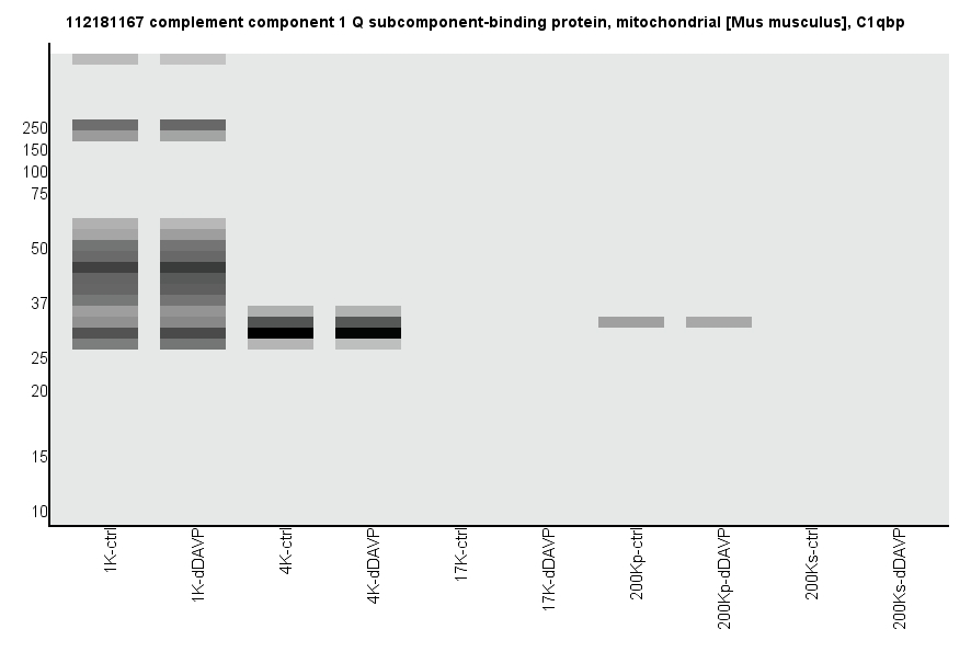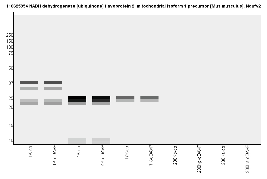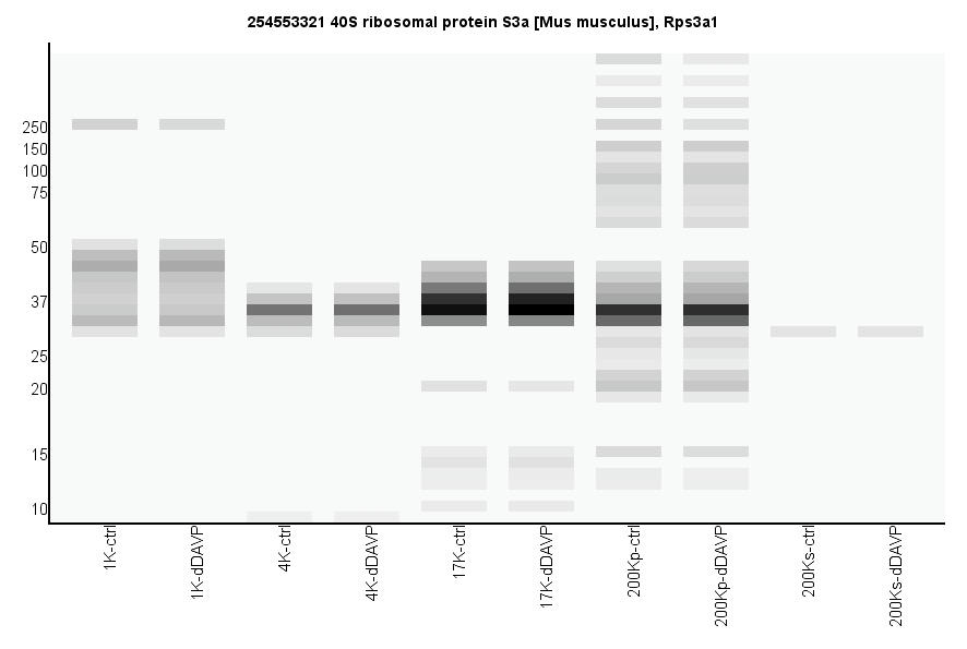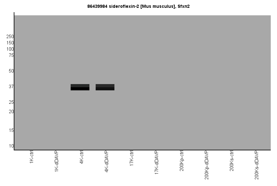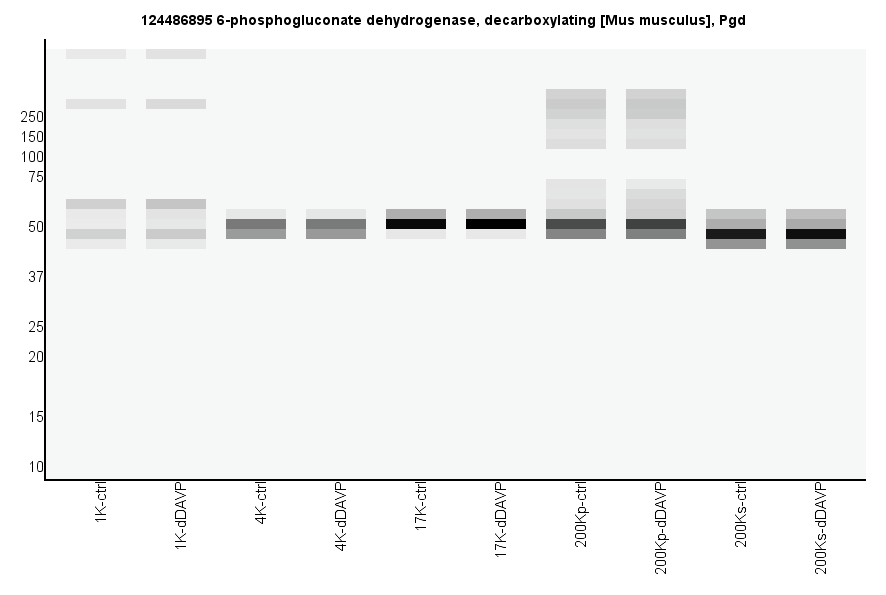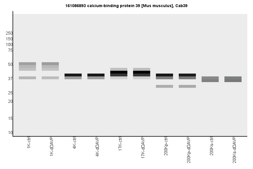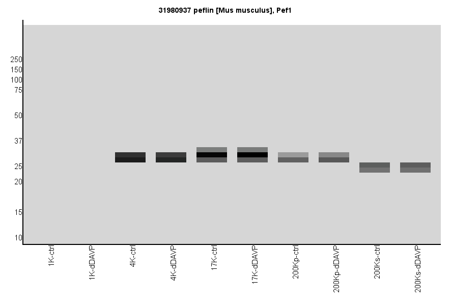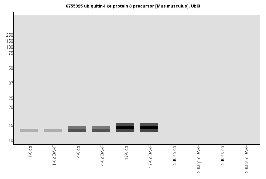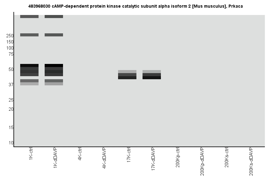 The virtual western blot images show data normalized using a logarithmic conversion scale to map peptide intensities to gray-scale levels. Using this conversion method, low-abundance peptides are generally visible in the blot images. Switch back to the default linear conversion scale database page.