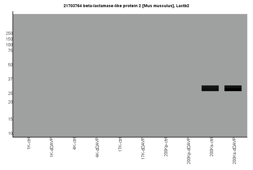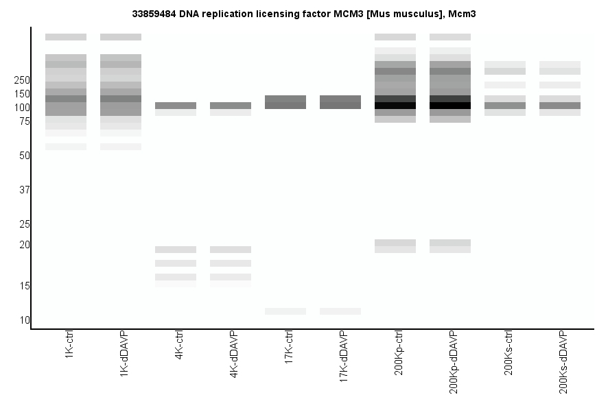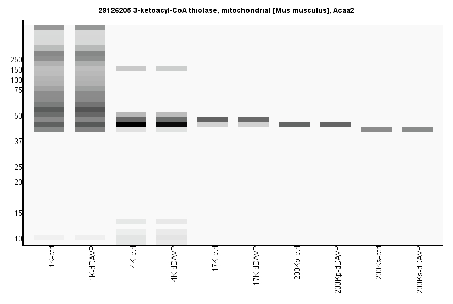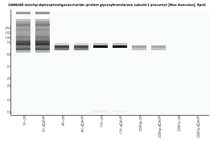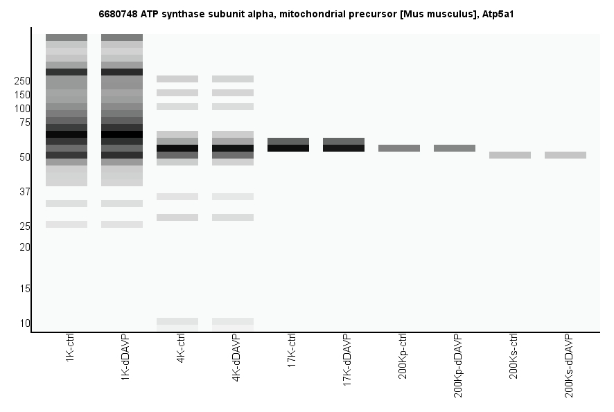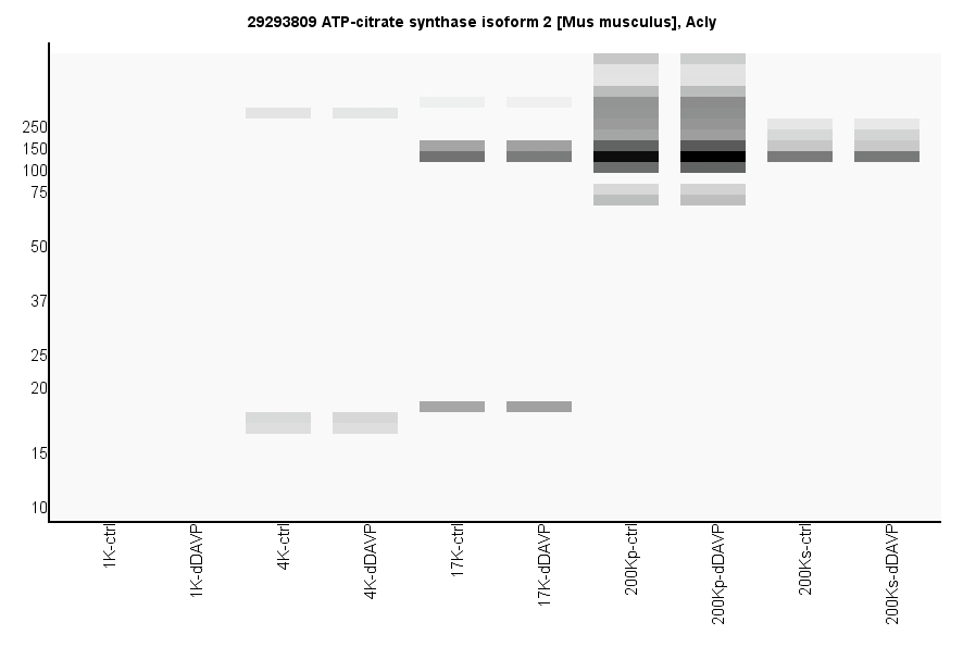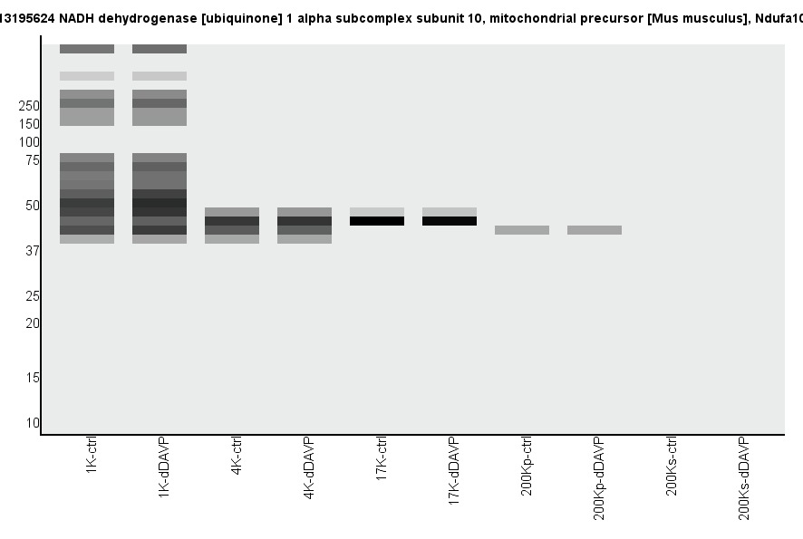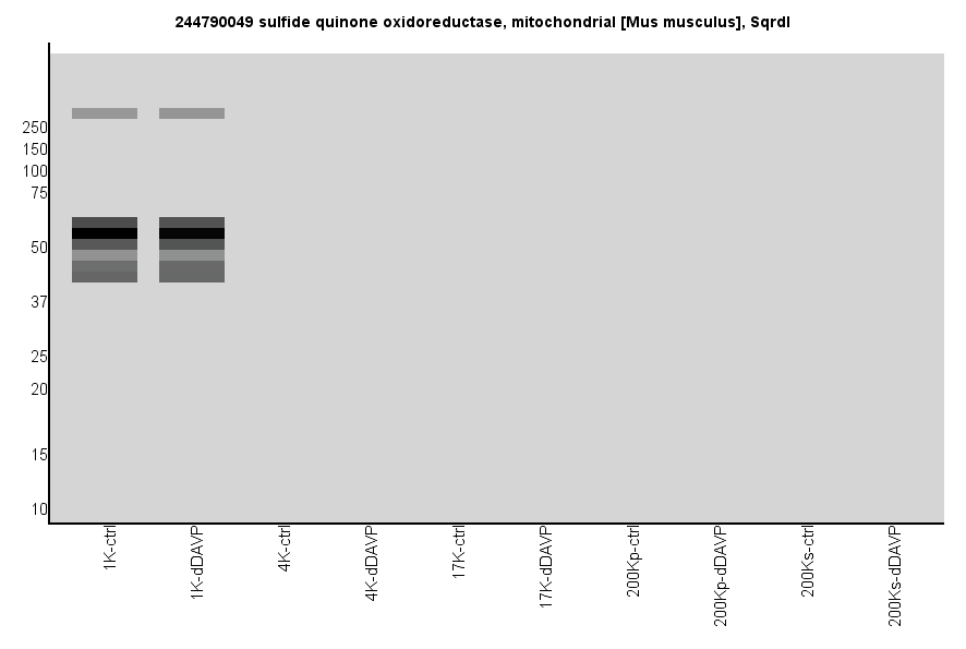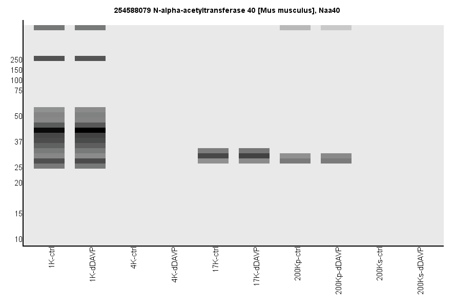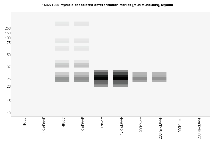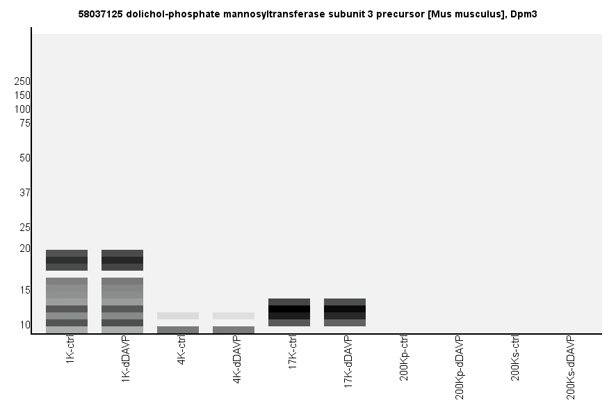 The virtual western blot images show data normalized using a logarithmic conversion scale to map peptide intensities to gray-scale levels. Using this conversion method, low-abundance peptides are generally visible in the blot images. Switch back to the default linear conversion scale database page.