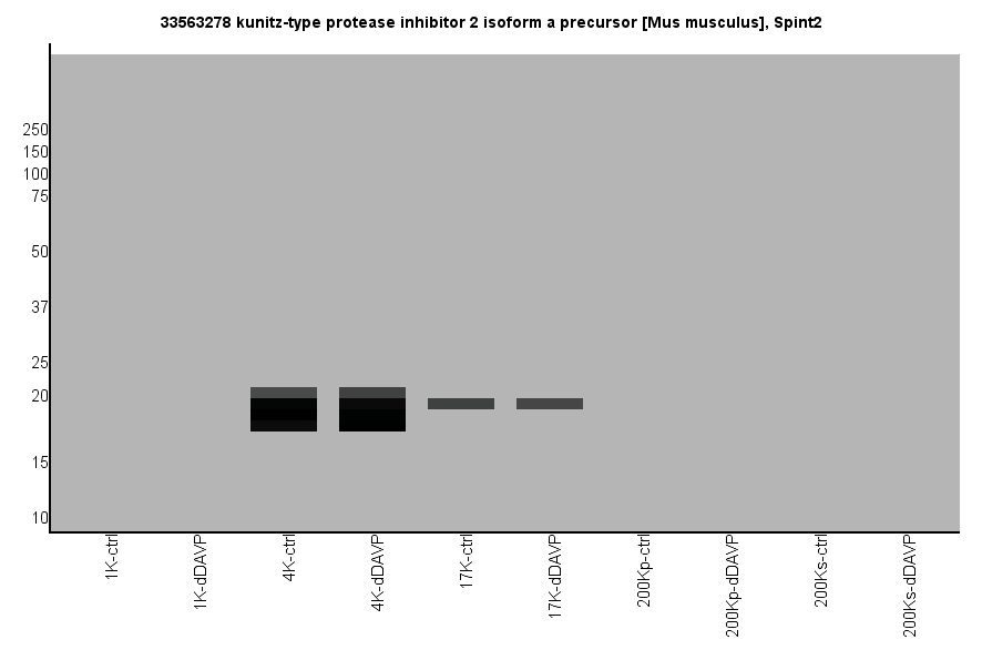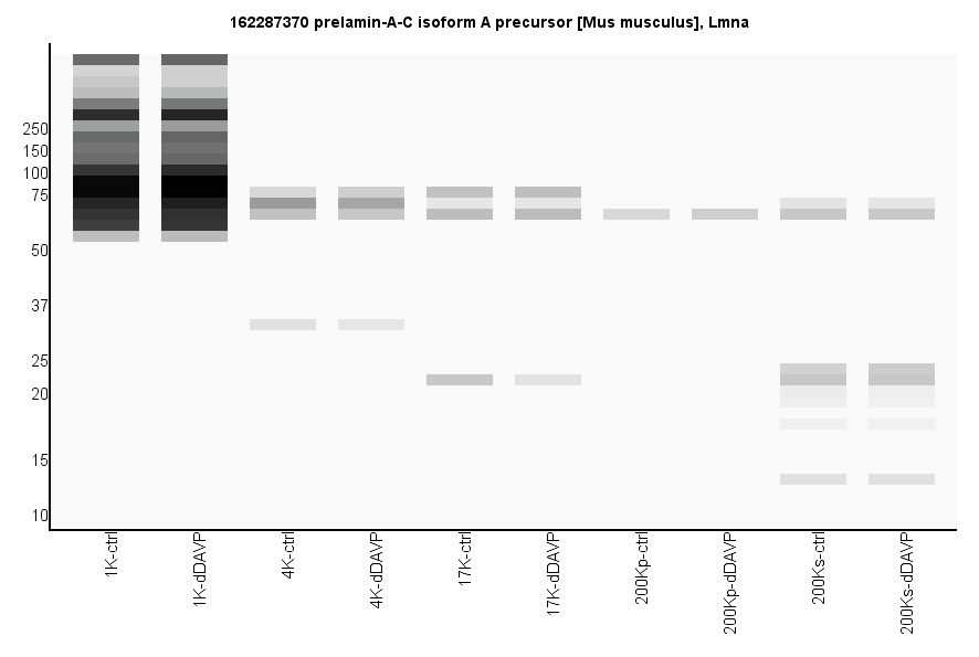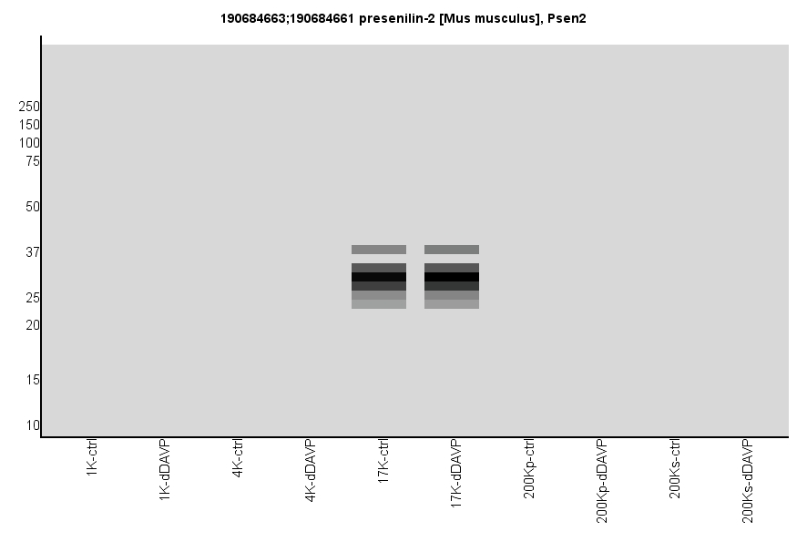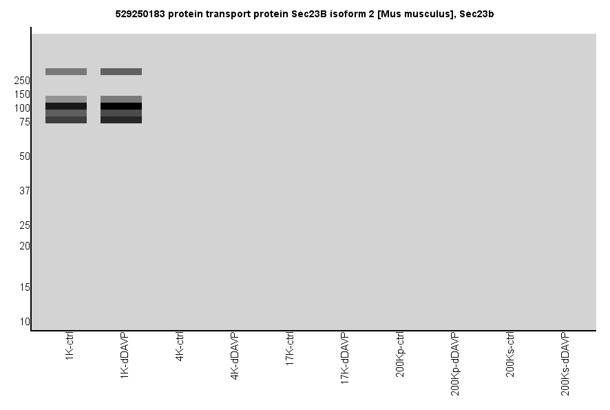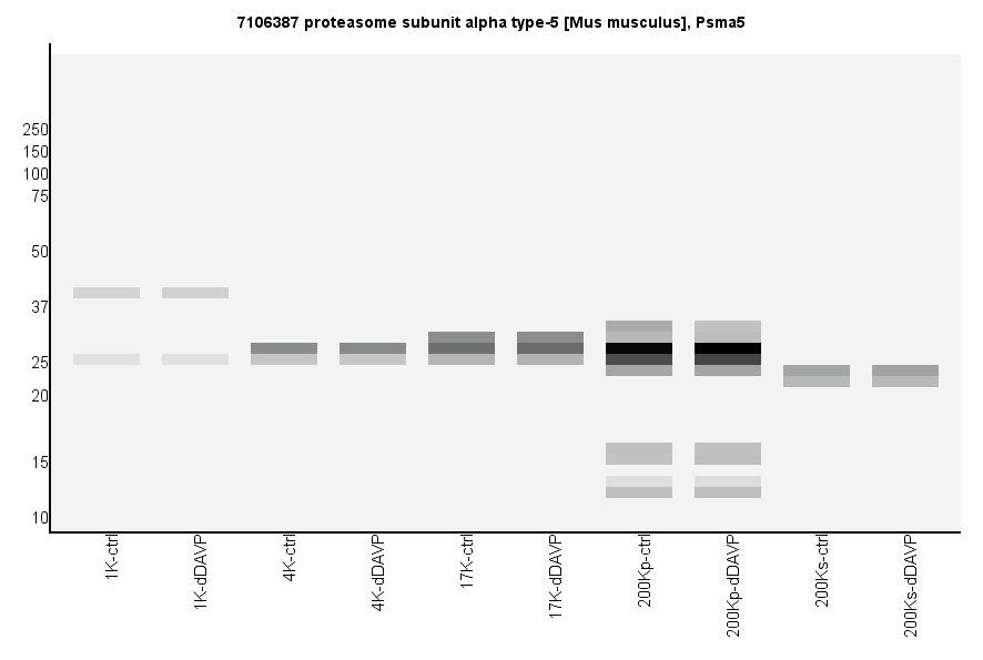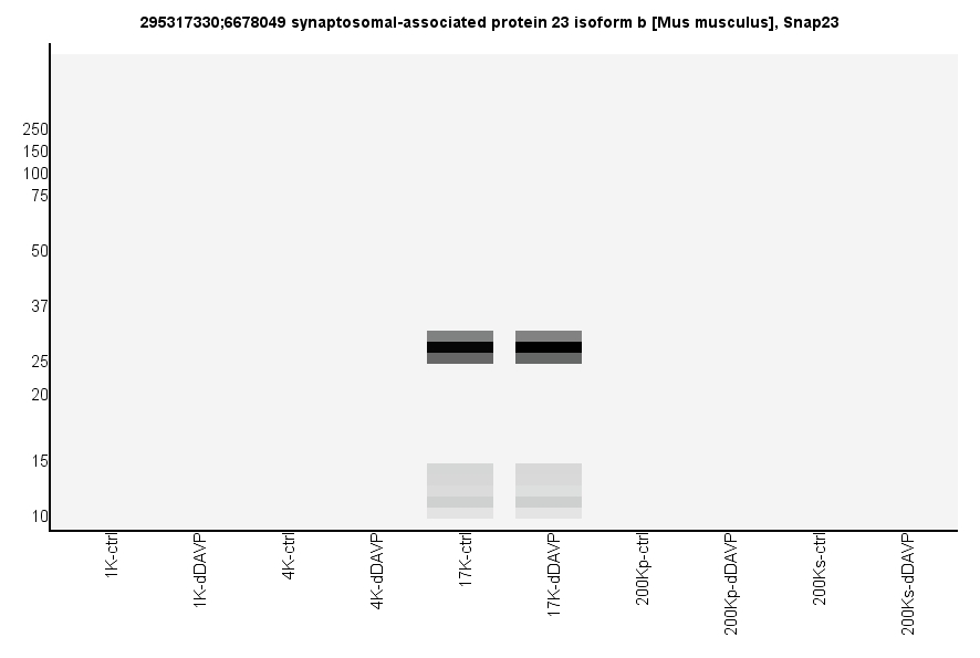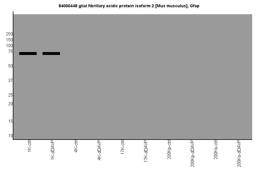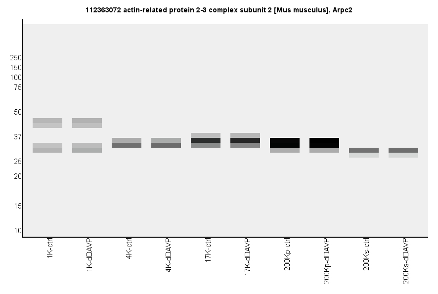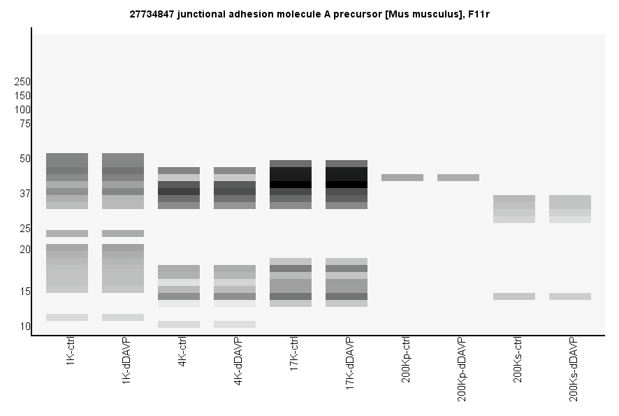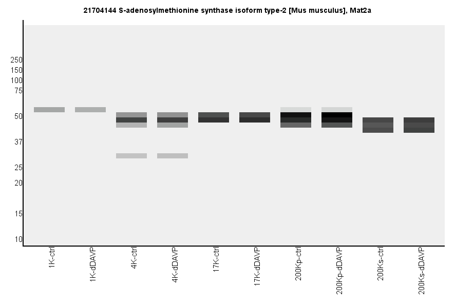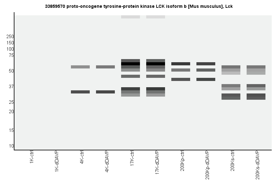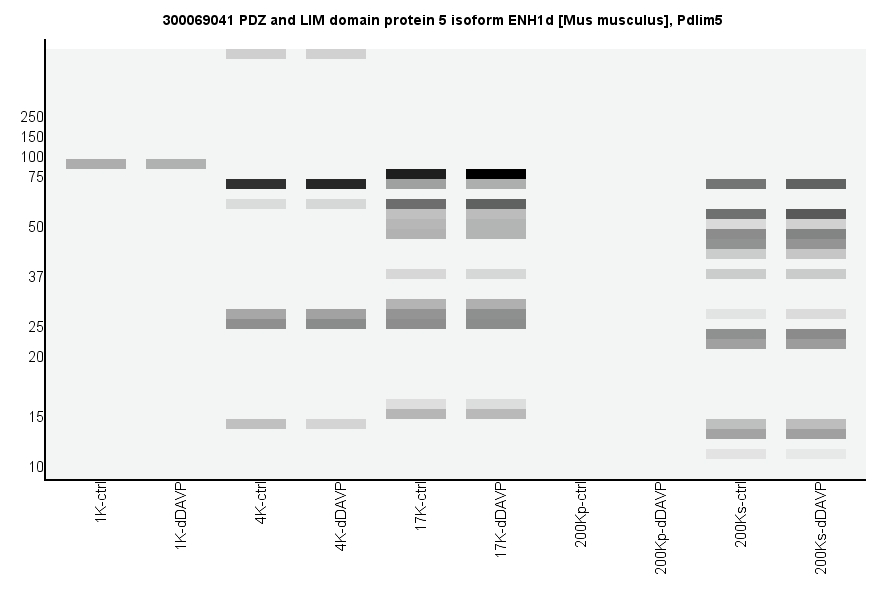 The virtual western blot images show data normalized using a logarithmic conversion scale to map peptide intensities to gray-scale levels. Using this conversion method, low-abundance peptides are generally visible in the blot images. Switch back to the default linear conversion scale database page.