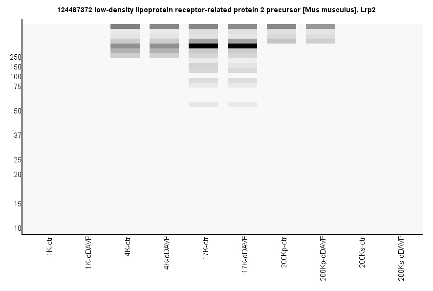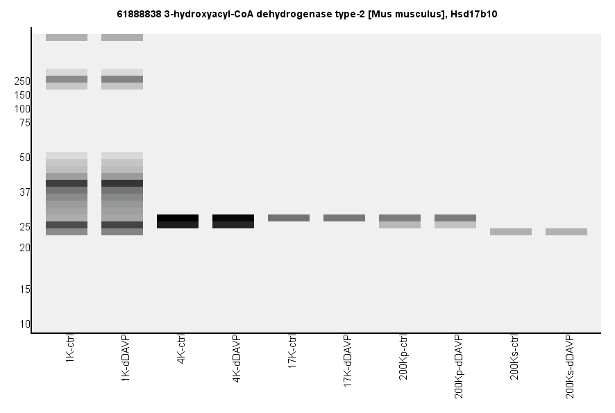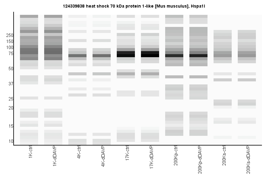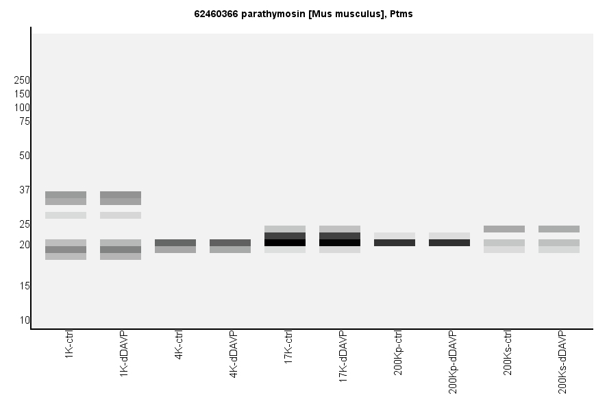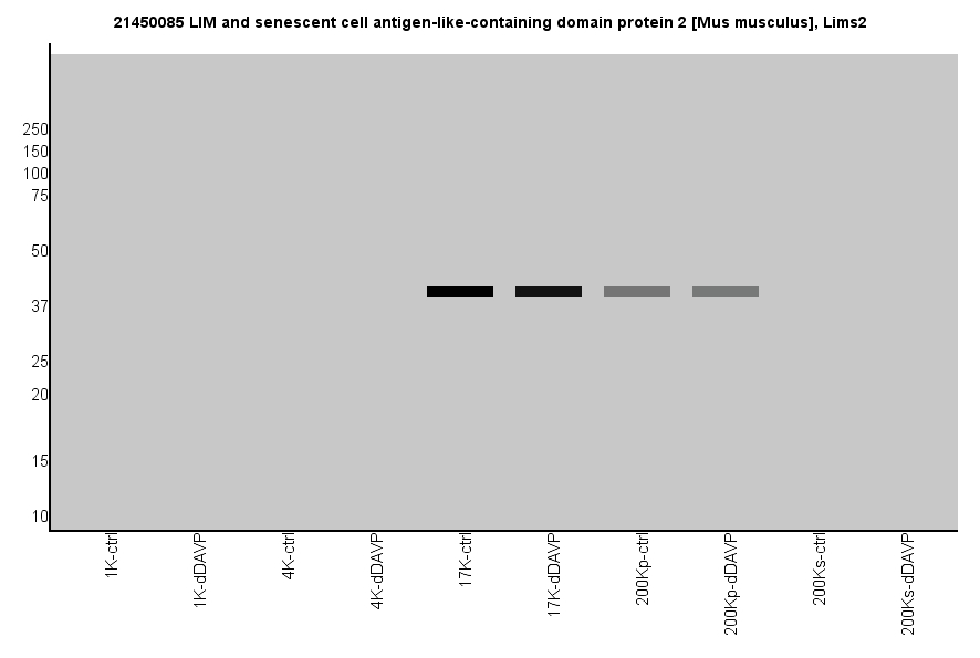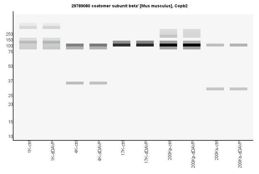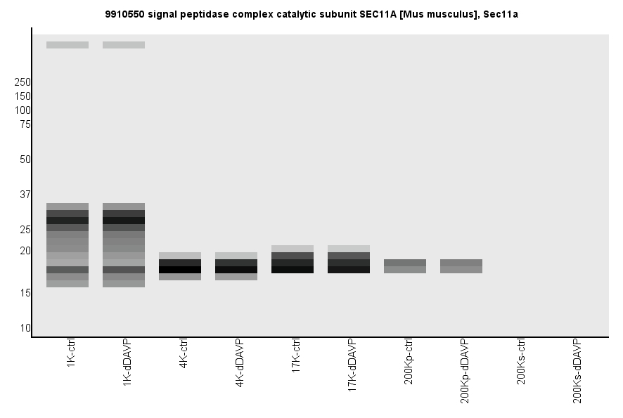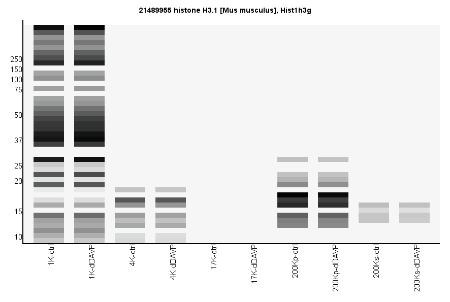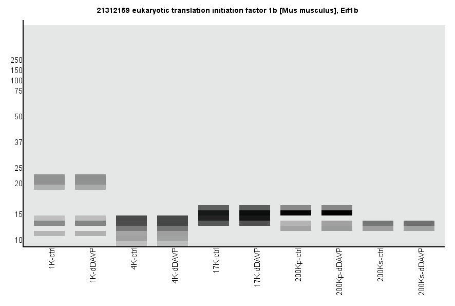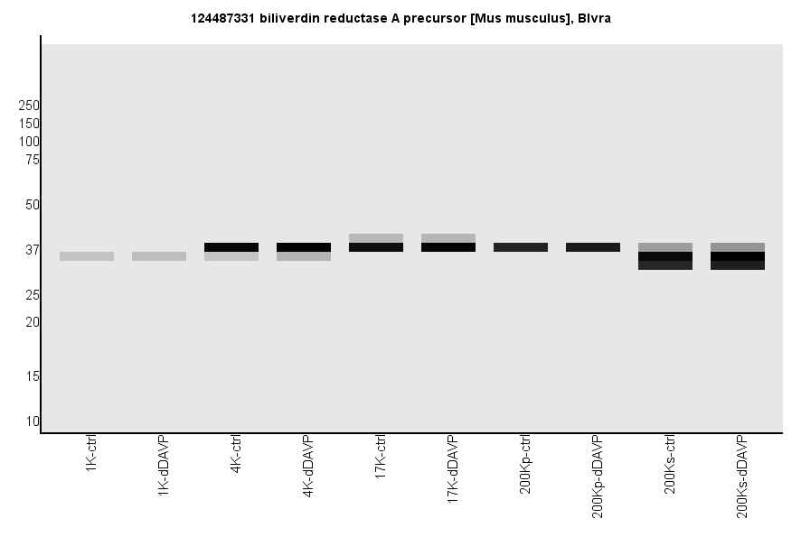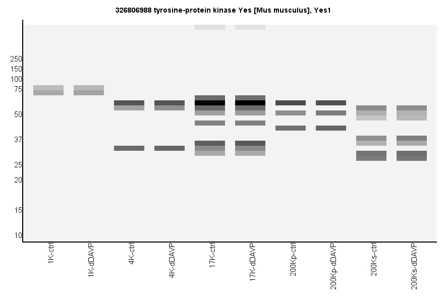 The virtual western blot images show data normalized using a logarithmic conversion scale to map peptide intensities to gray-scale levels. Using this conversion method, low-abundance peptides are generally visible in the blot images. Switch back to the default linear conversion scale database page.