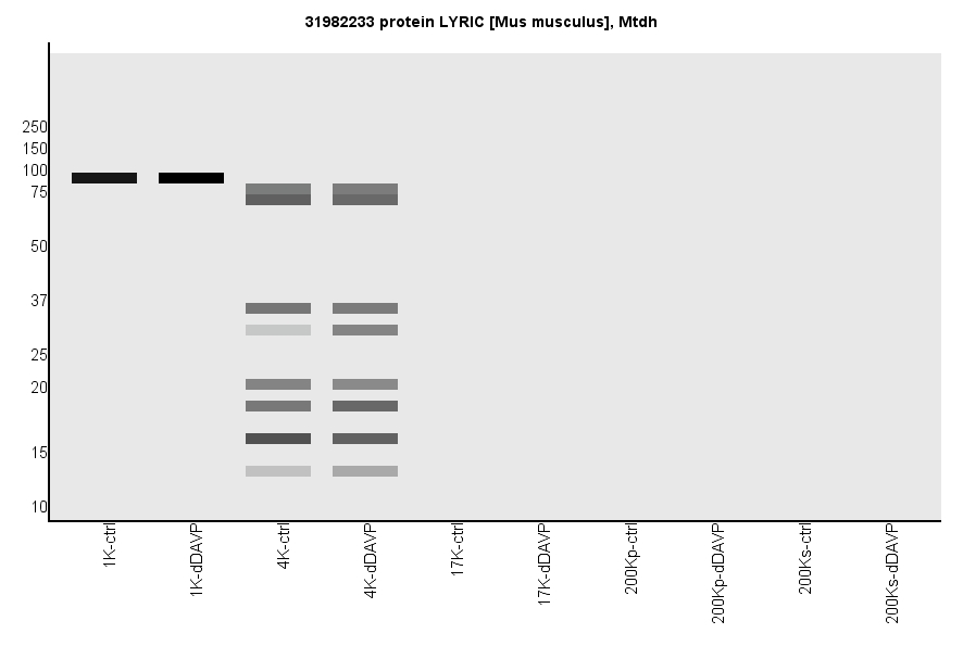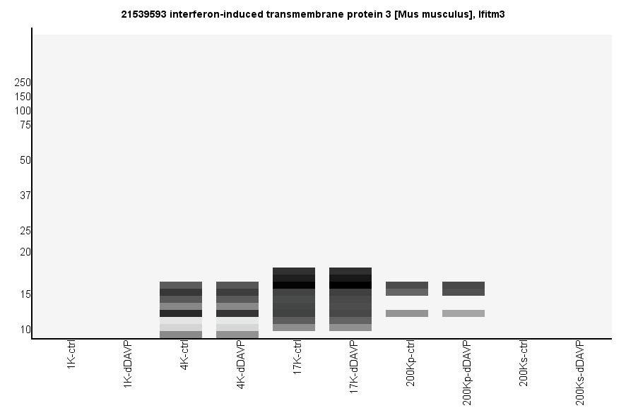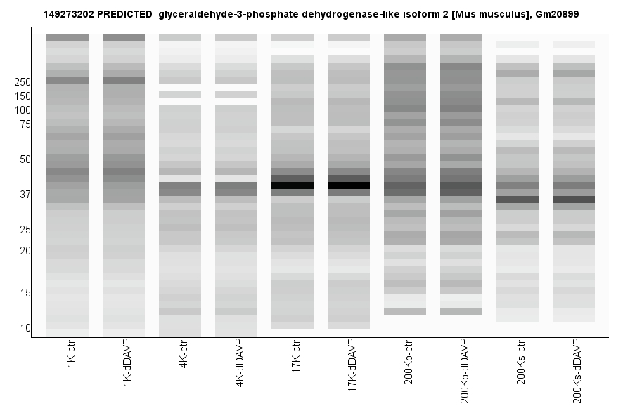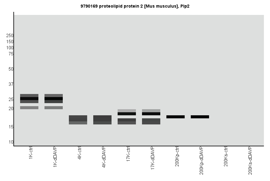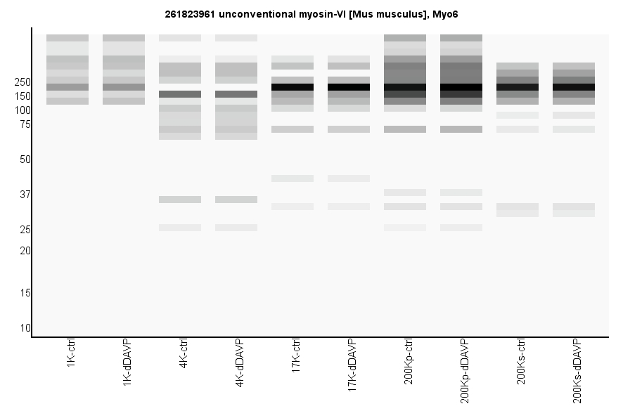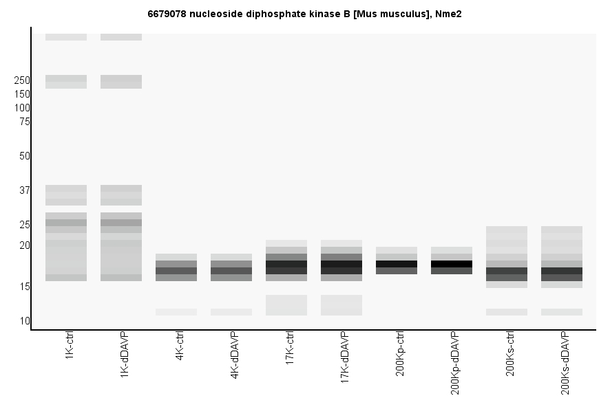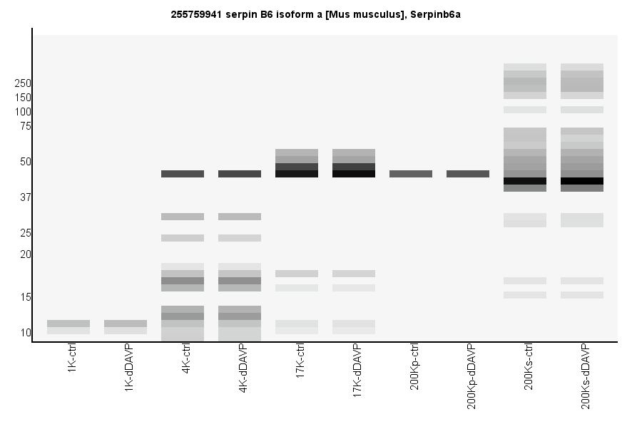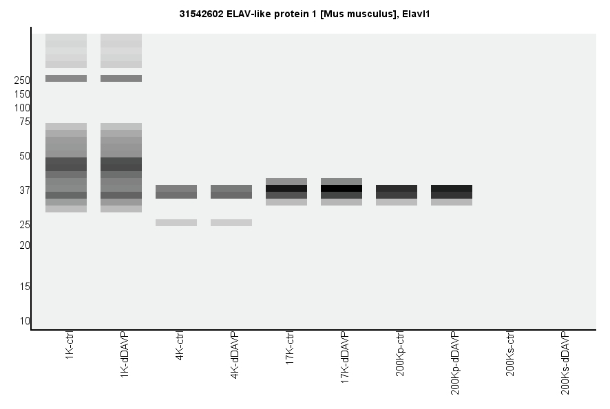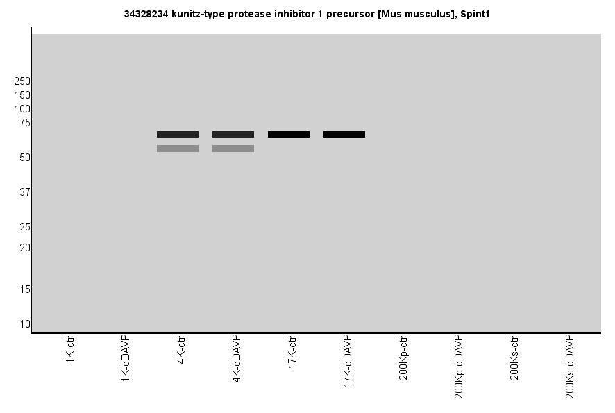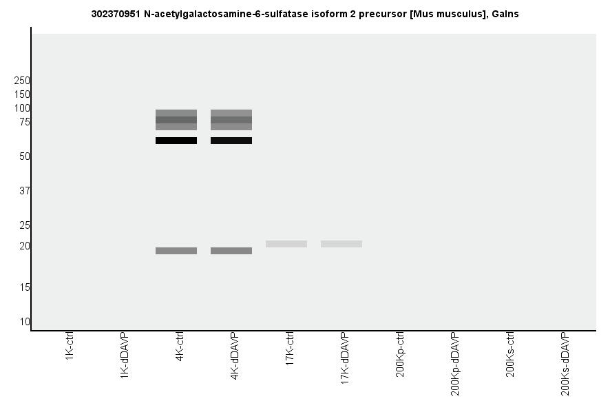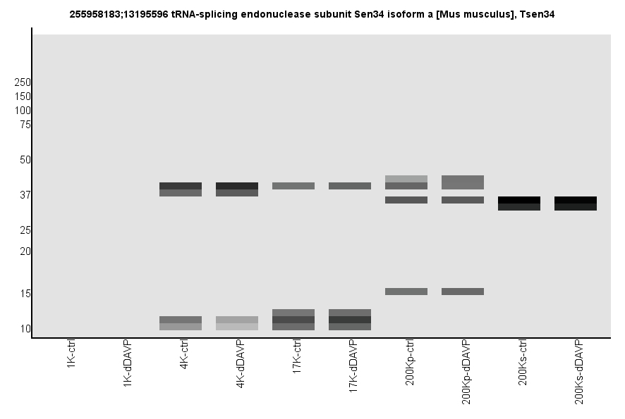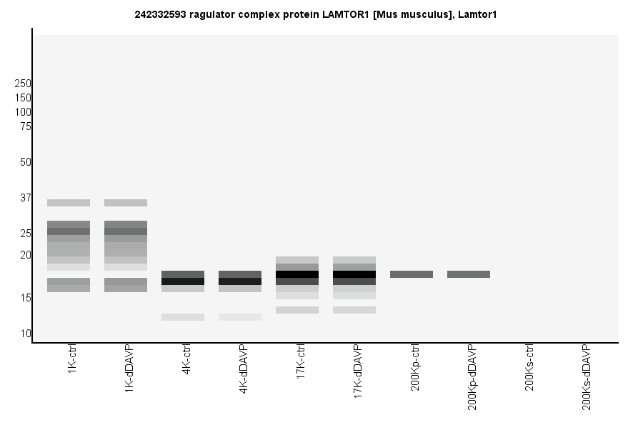 The virtual western blot images show data normalized using a logarithmic conversion scale to map peptide intensities to gray-scale levels. Using this conversion method, low-abundance peptides are generally visible in the blot images. Switch back to the default linear conversion scale database page.