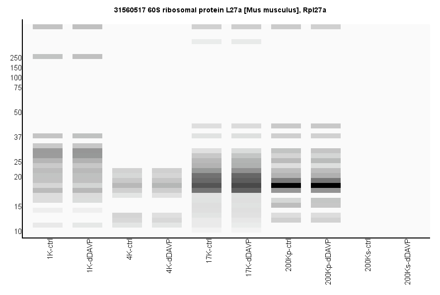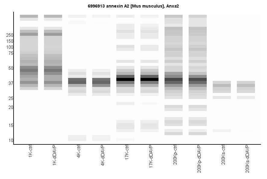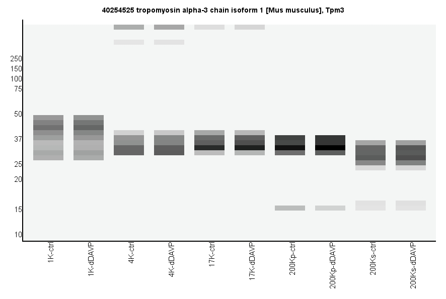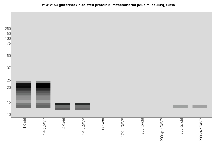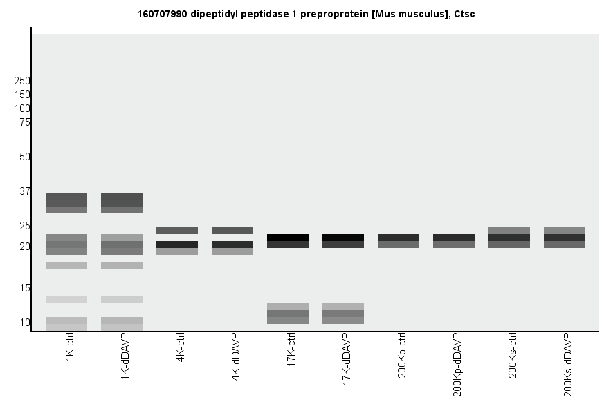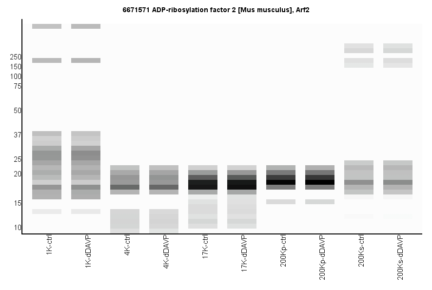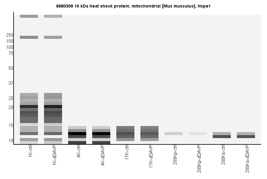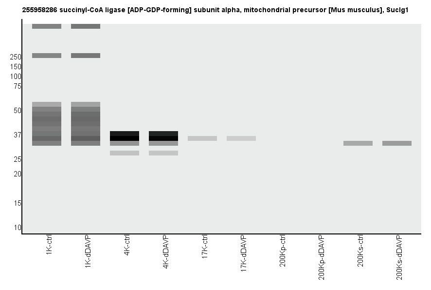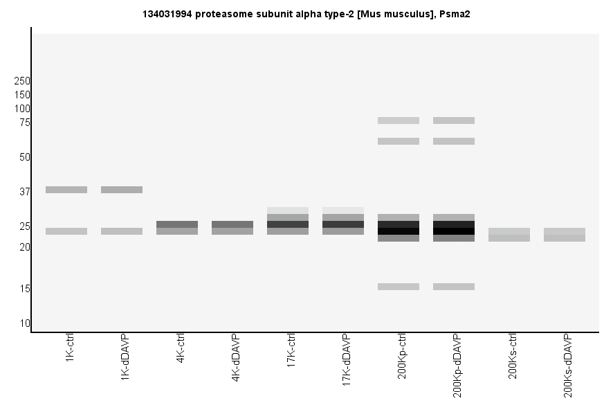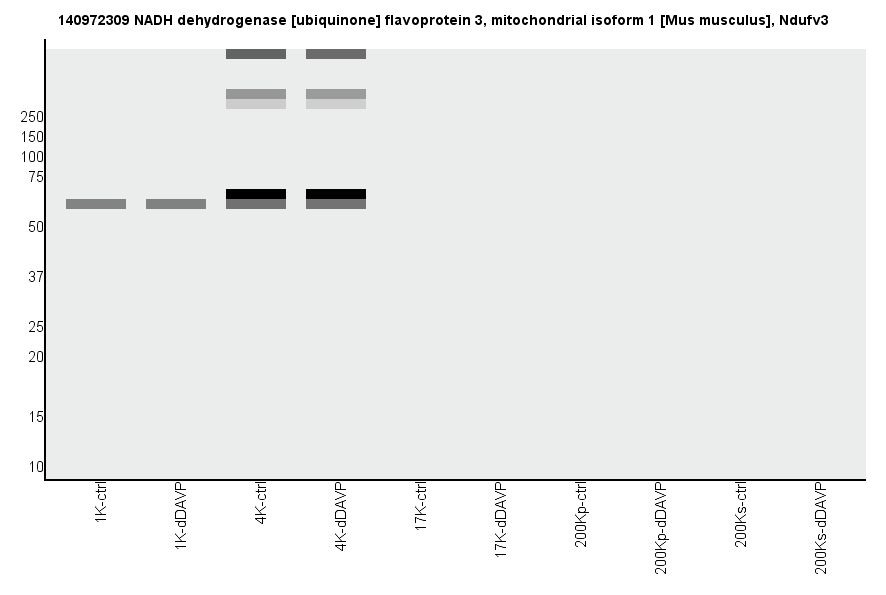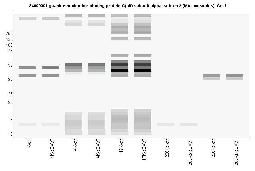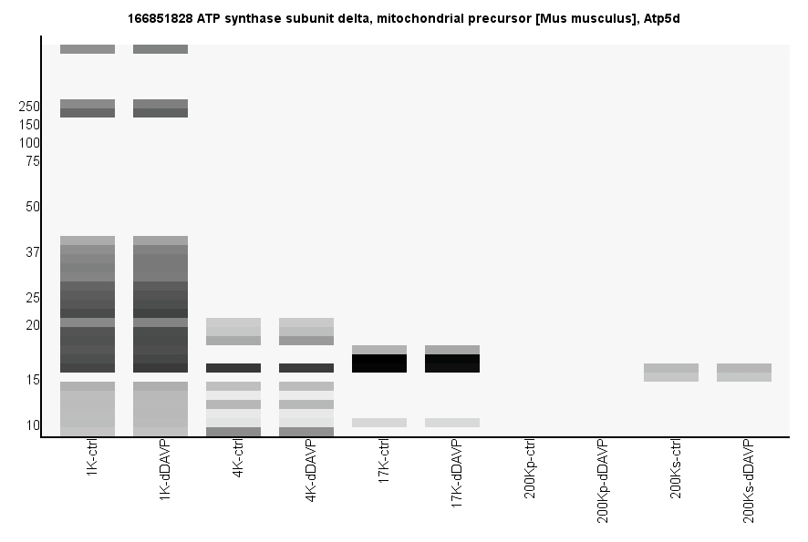 The virtual western blot images show data normalized using a logarithmic conversion scale to map peptide intensities to gray-scale levels. Using this conversion method, low-abundance peptides are generally visible in the blot images. Switch back to the default linear conversion scale database page.