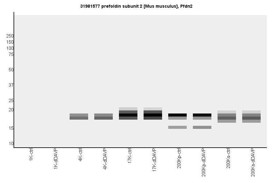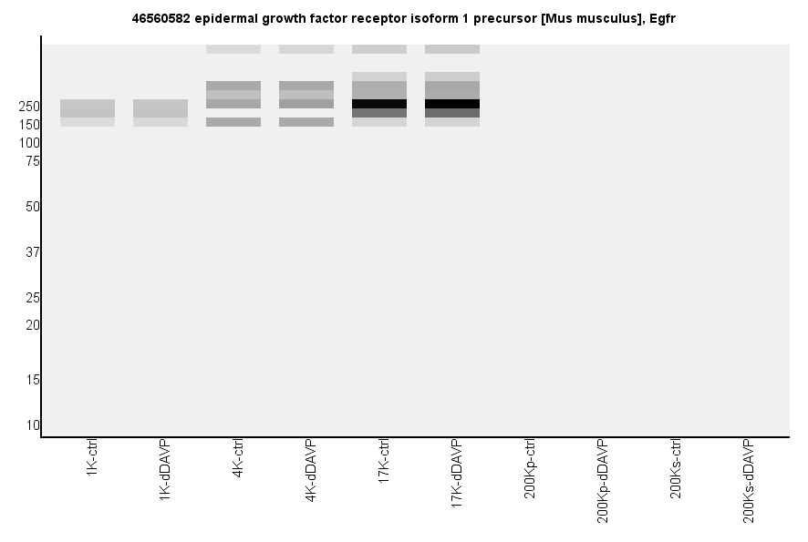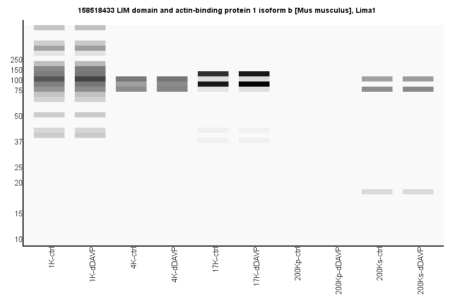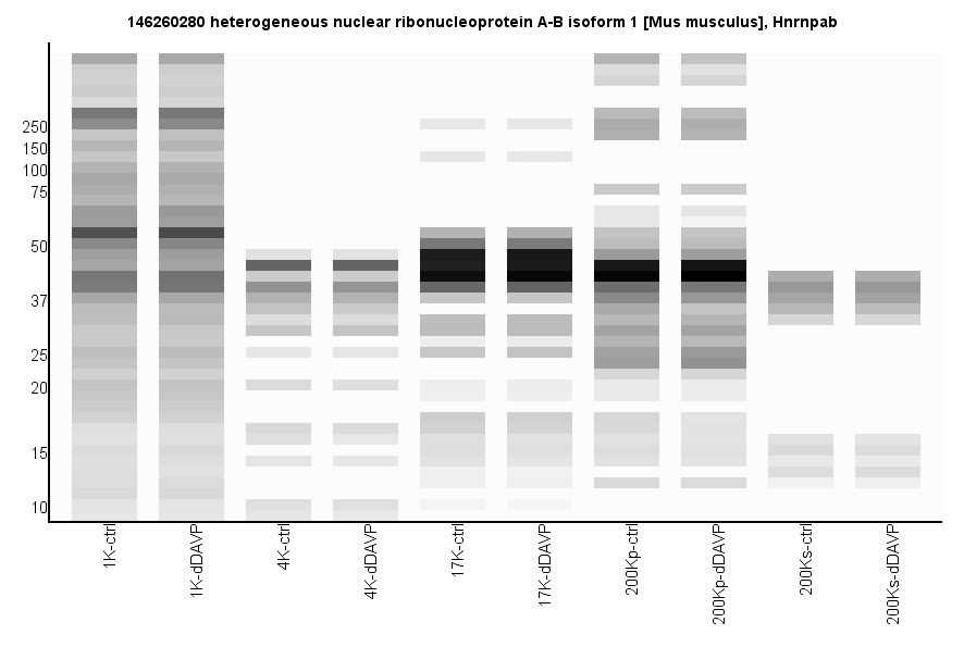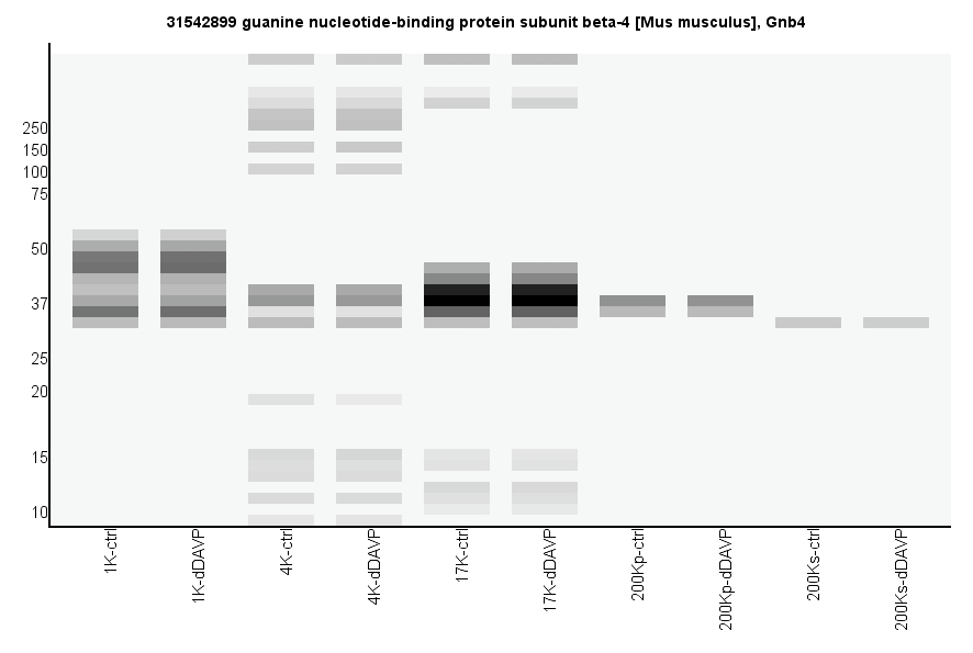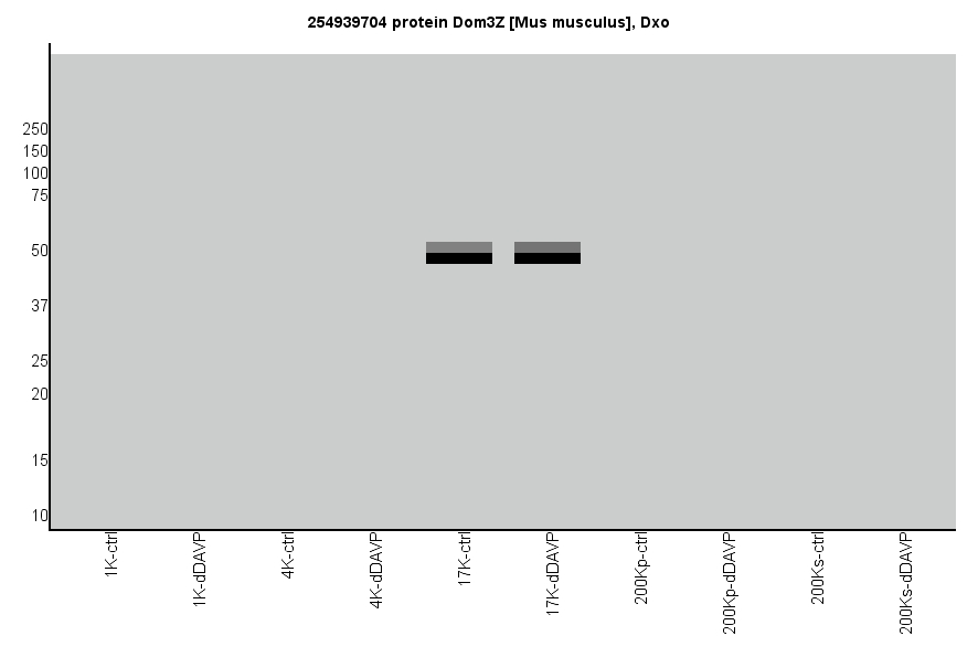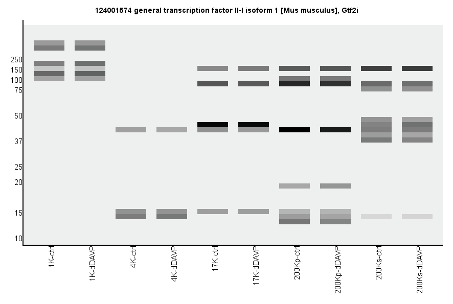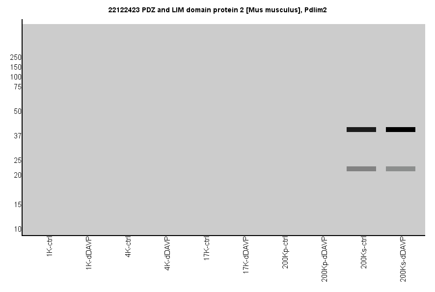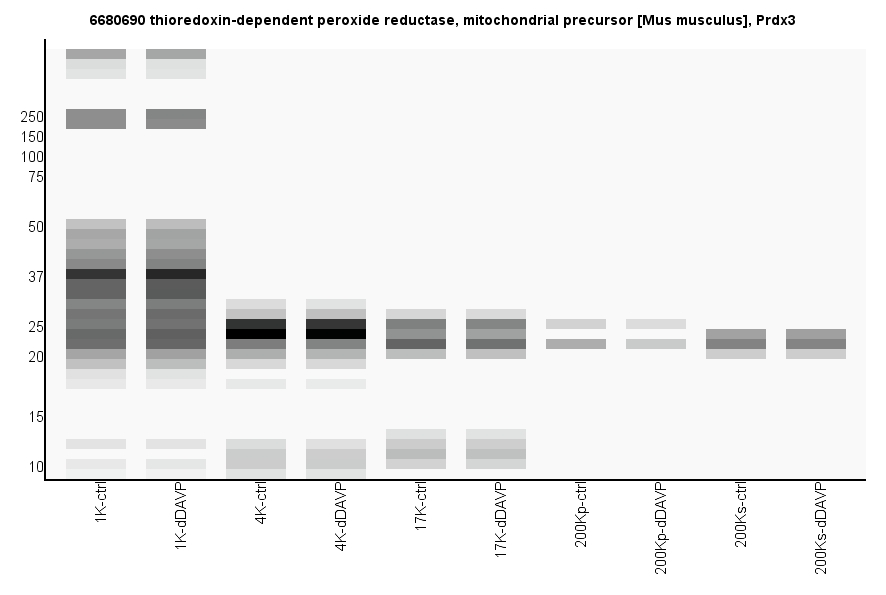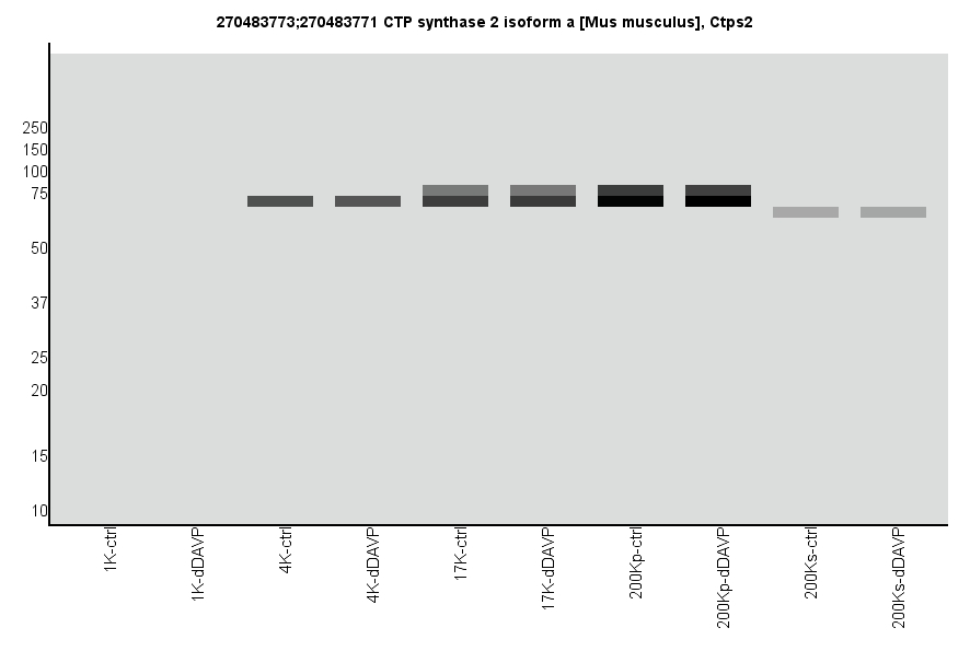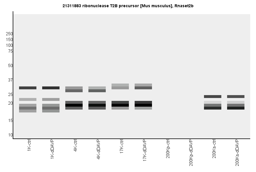 The virtual western blot images show data normalized using a logarithmic conversion scale to map peptide intensities to gray-scale levels. Using this conversion method, low-abundance peptides are generally visible in the blot images. Switch back to the default linear conversion scale database page.