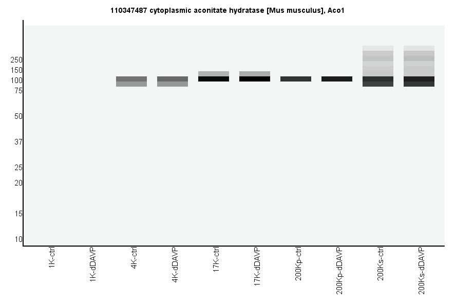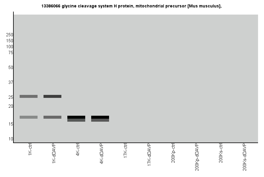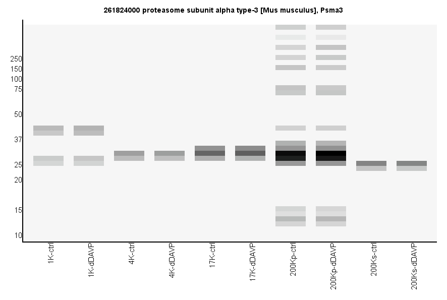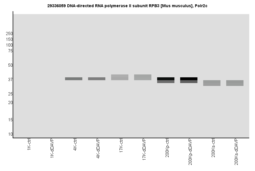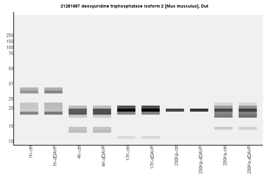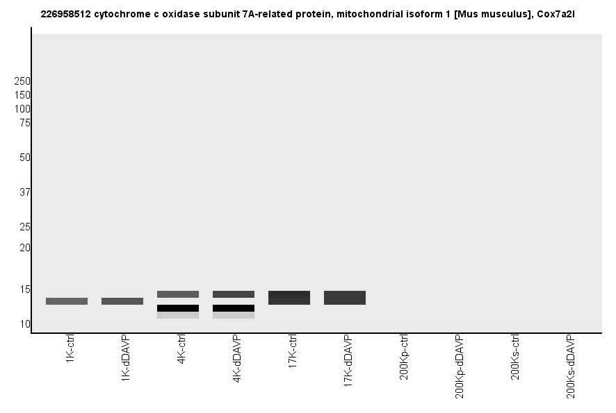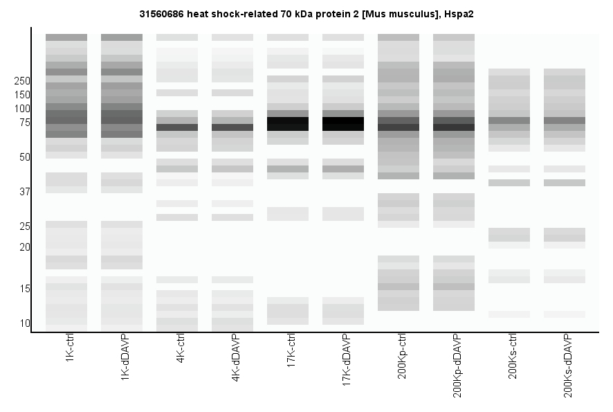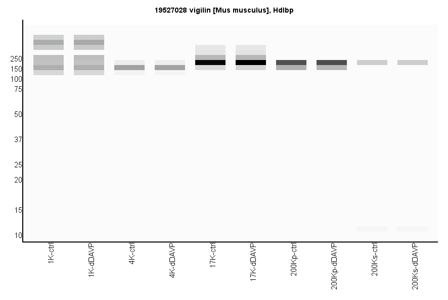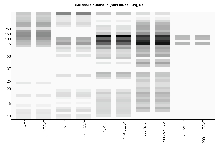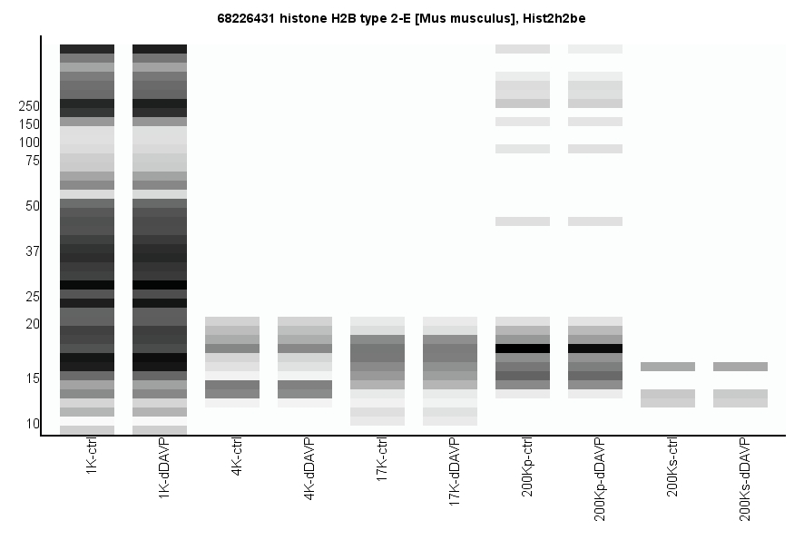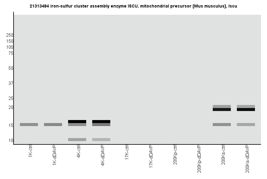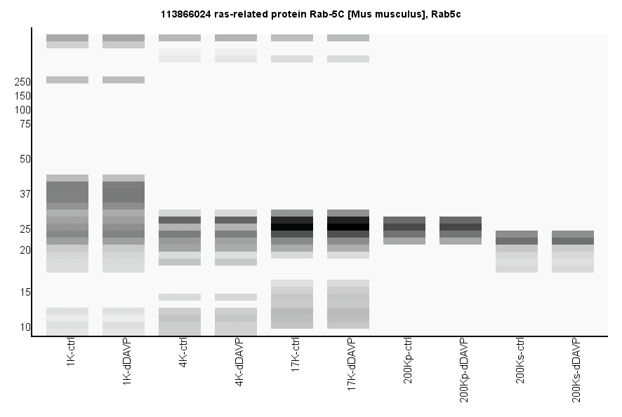The virtual western blot images show data normalized using a logarithmic conversion scale to map peptide intensities to gray-scale levels. Using this conversion method, low-abundance peptides are generally visible in the blot images. Switch back to the default linear conversion scale database page.