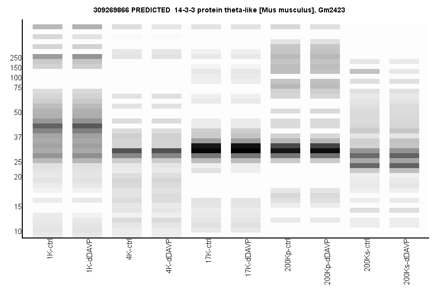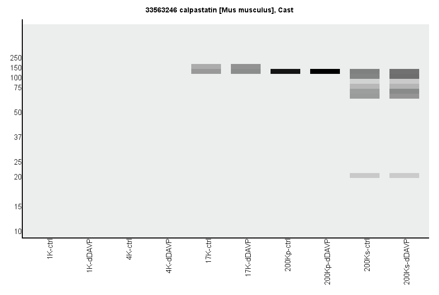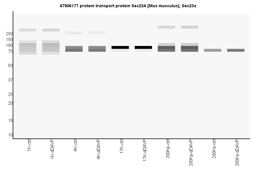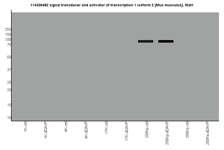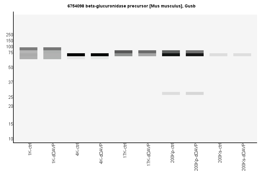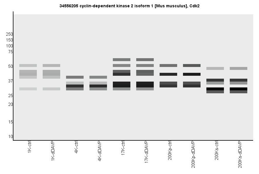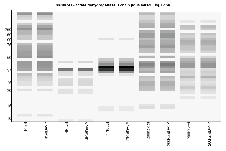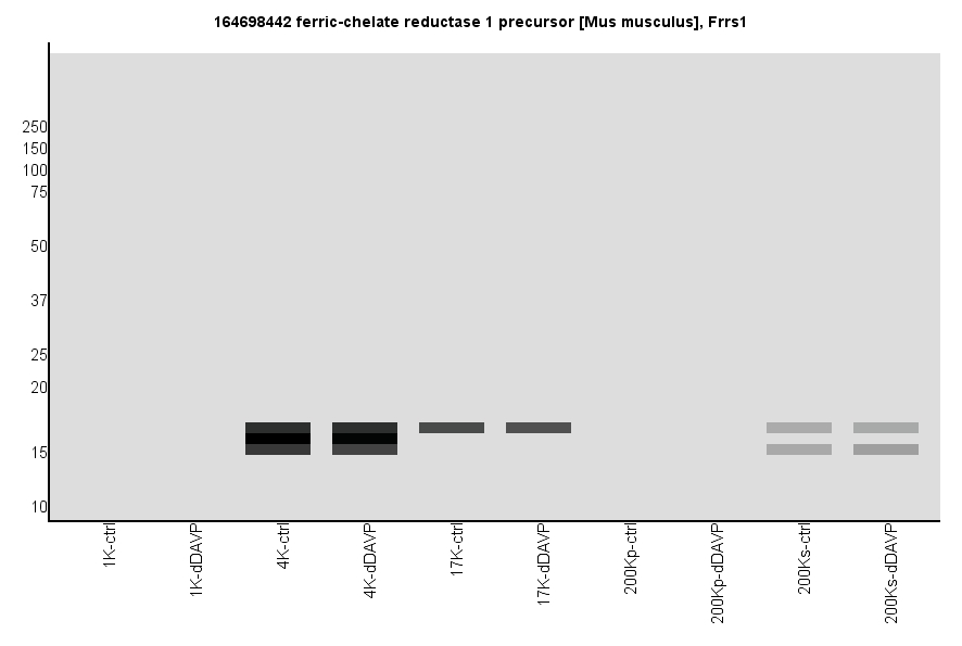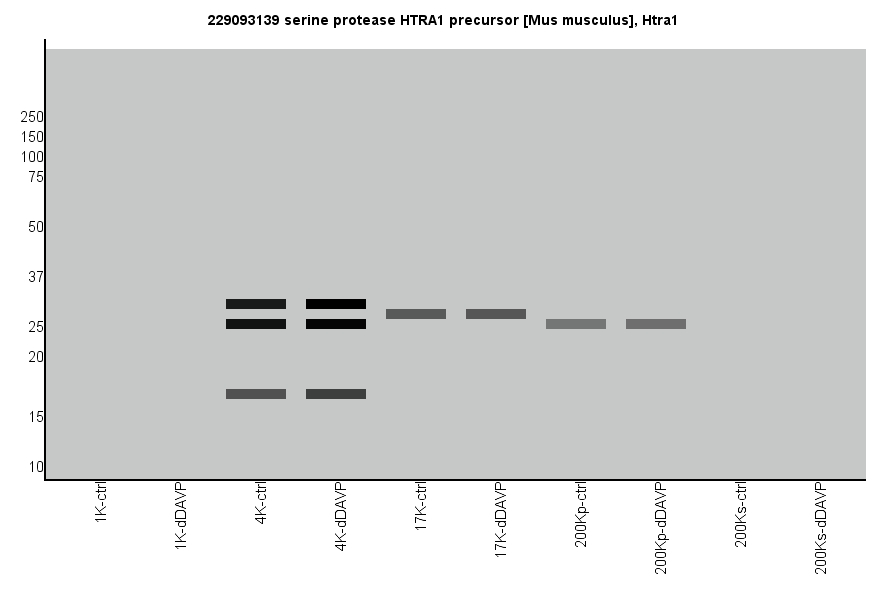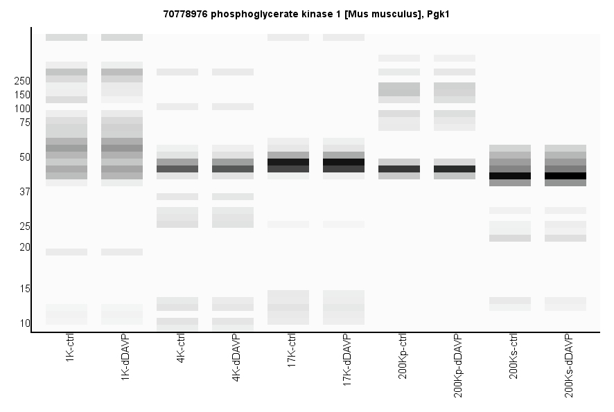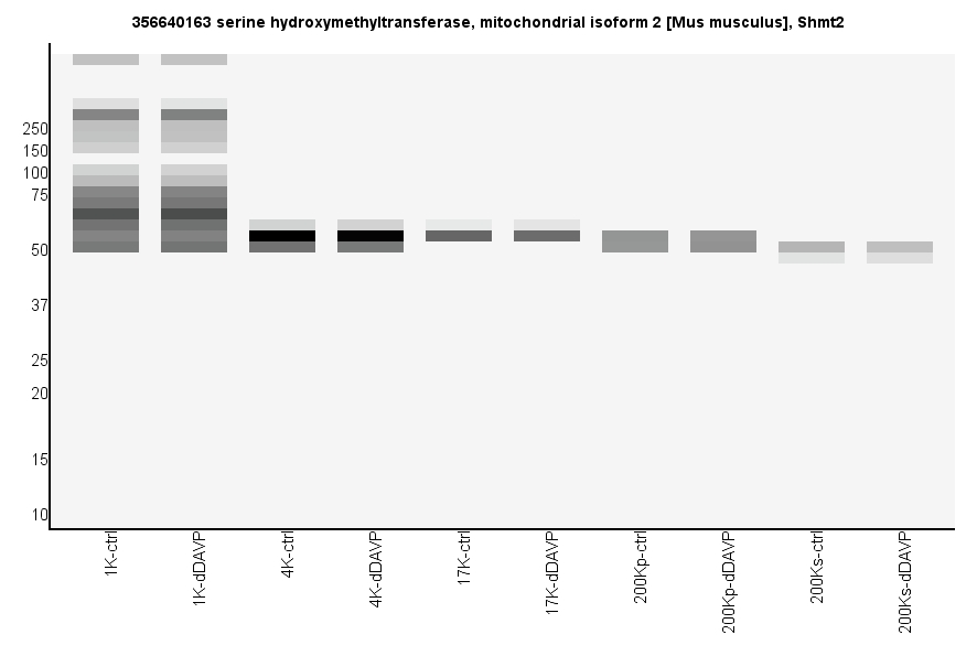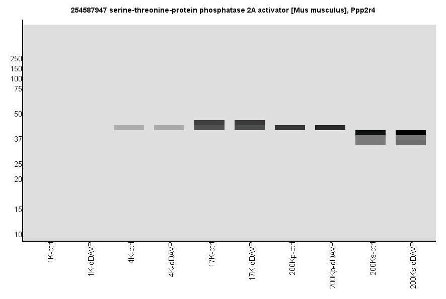 The virtual western blot images show data normalized using a logarithmic conversion scale to map peptide intensities to gray-scale levels. Using this conversion method, low-abundance peptides are generally visible in the blot images. Switch back to the default linear conversion scale database page.
