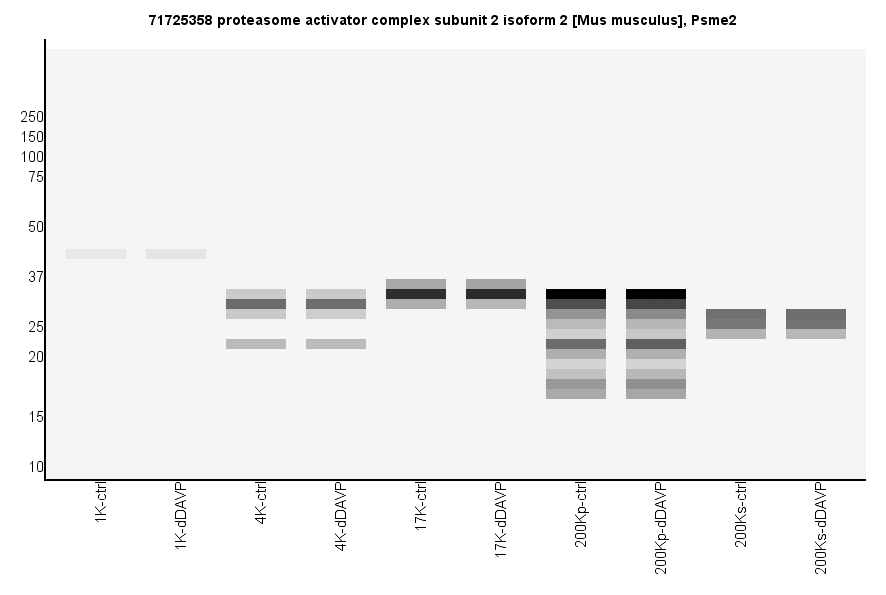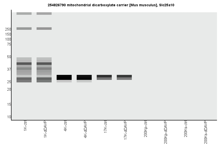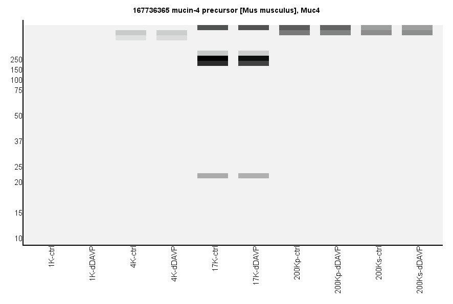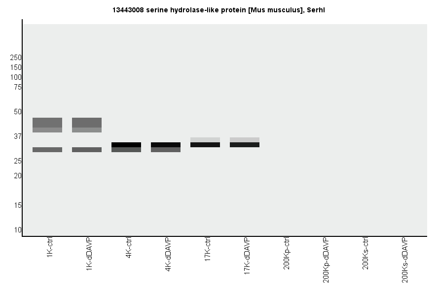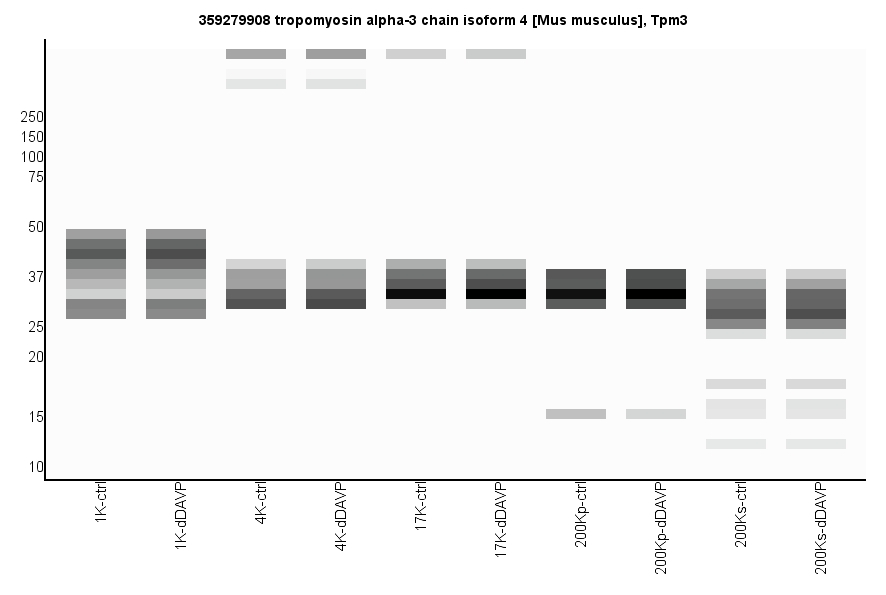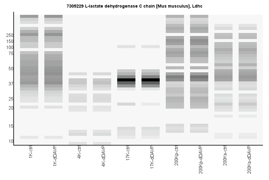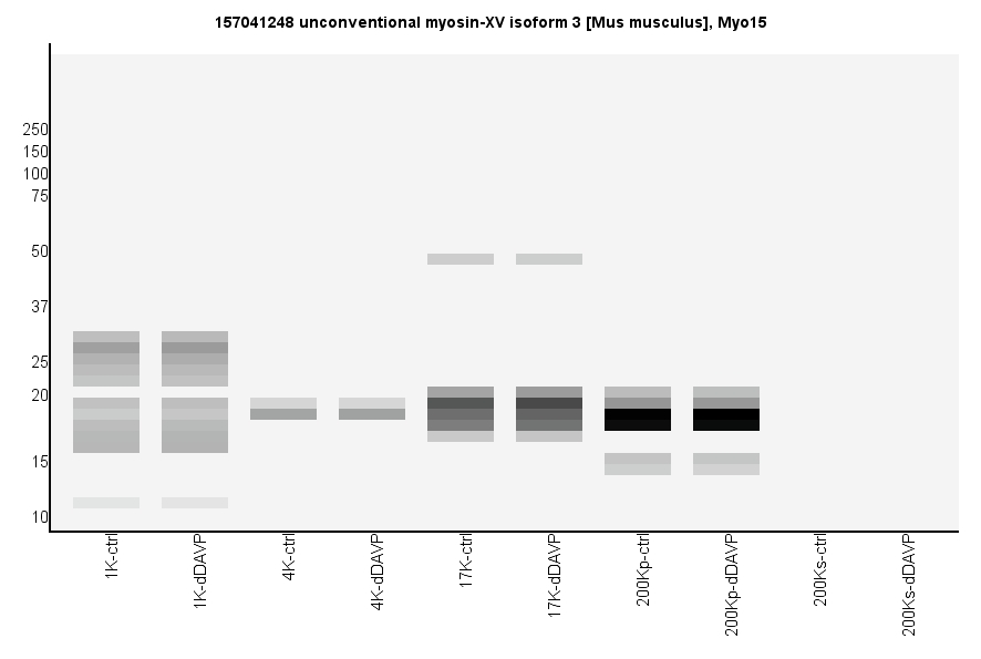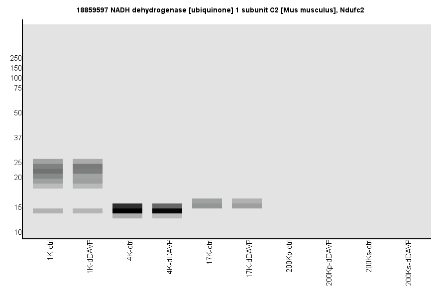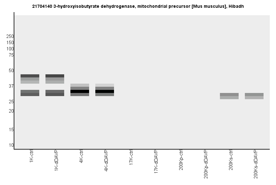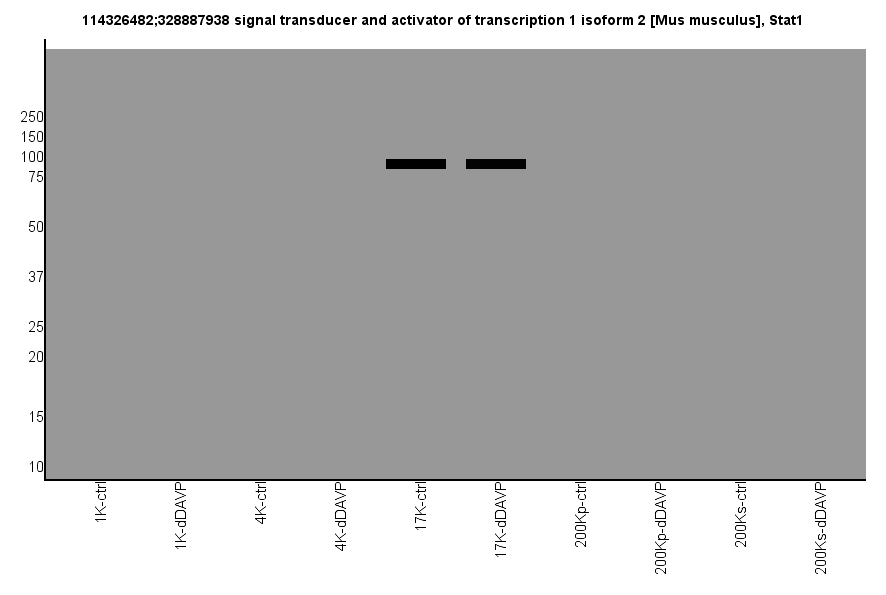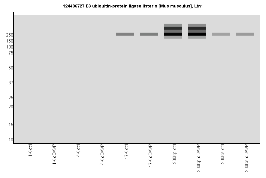 The virtual western blot images show data normalized using a logarithmic conversion scale to map peptide intensities to gray-scale levels. Using this conversion method, low-abundance peptides are generally visible in the blot images. Switch back to the default linear conversion scale database page.
