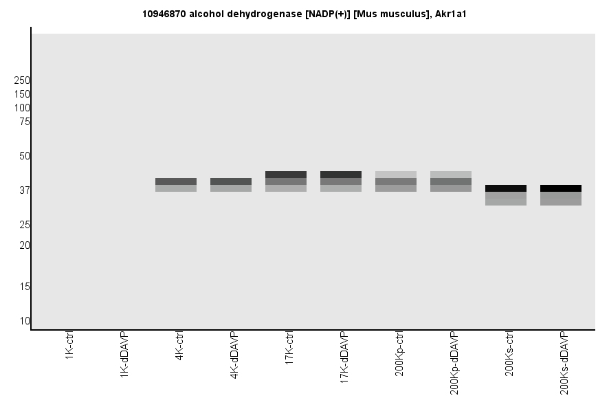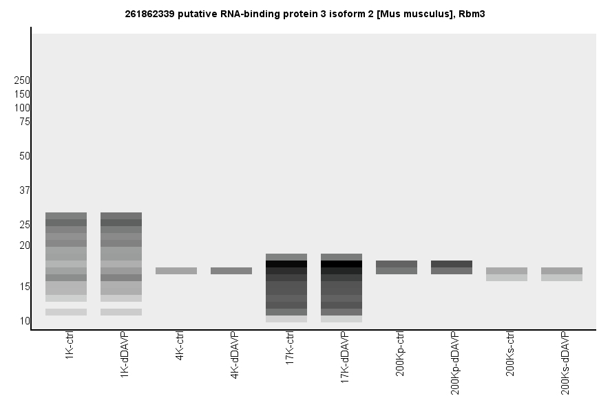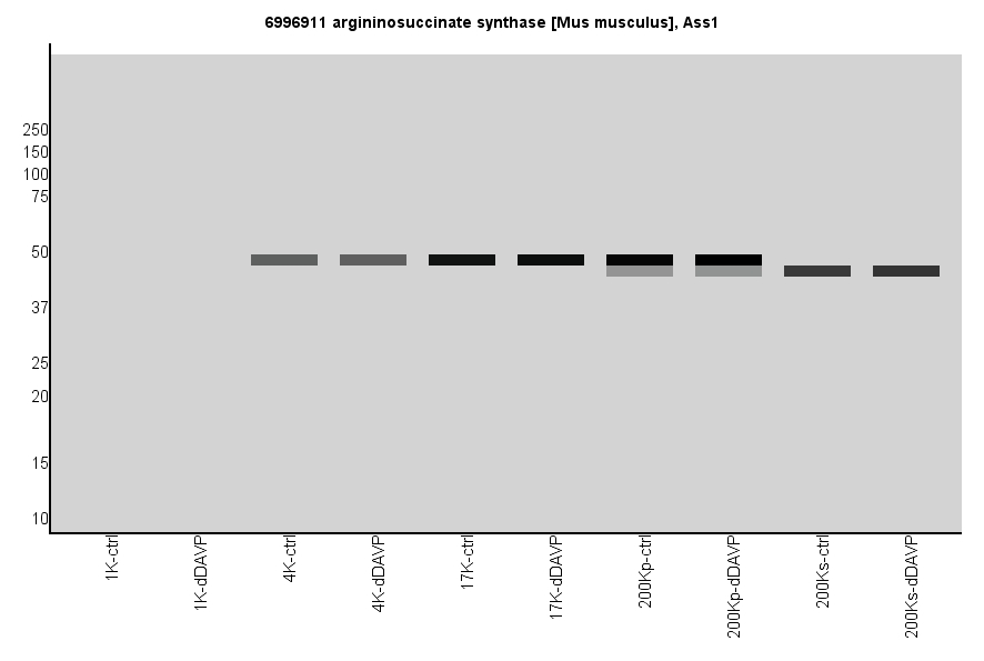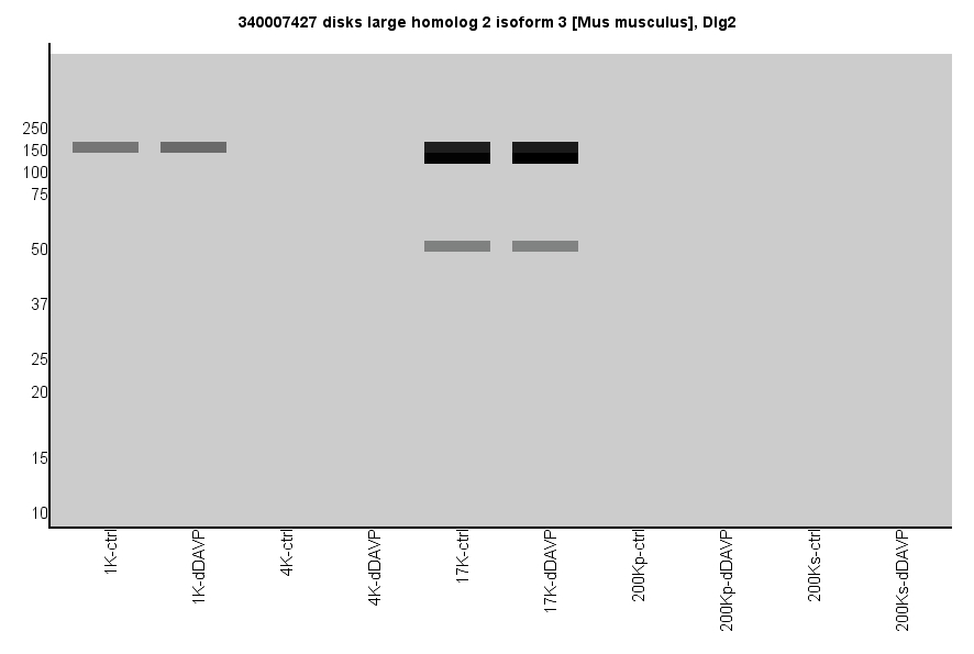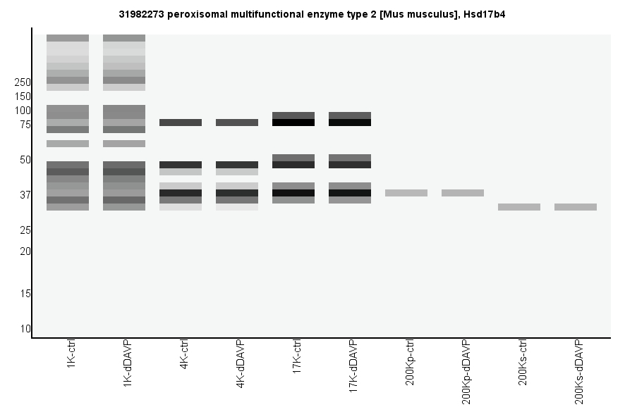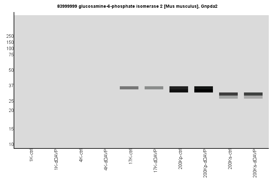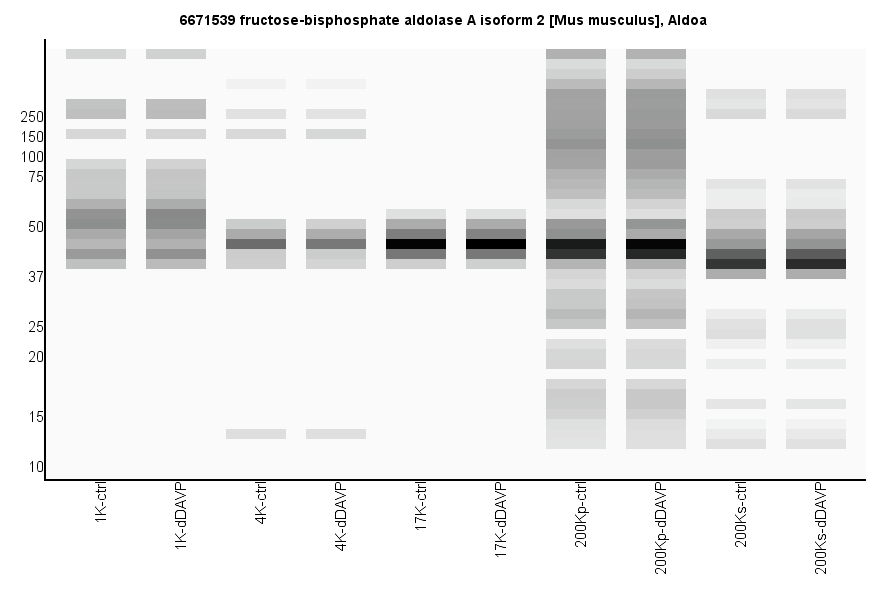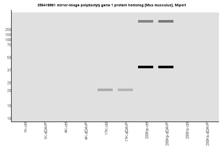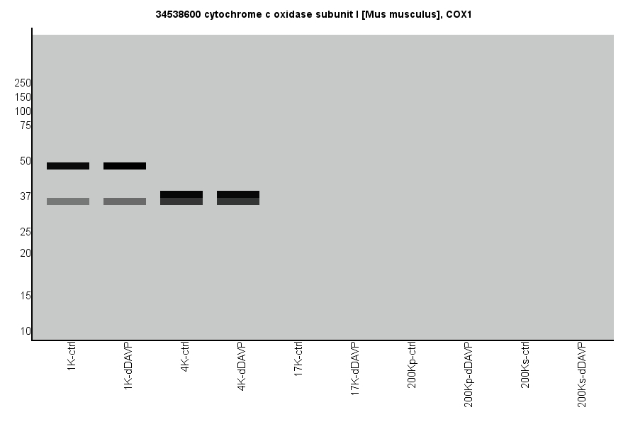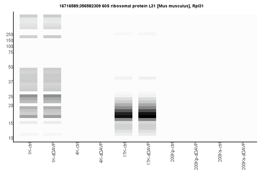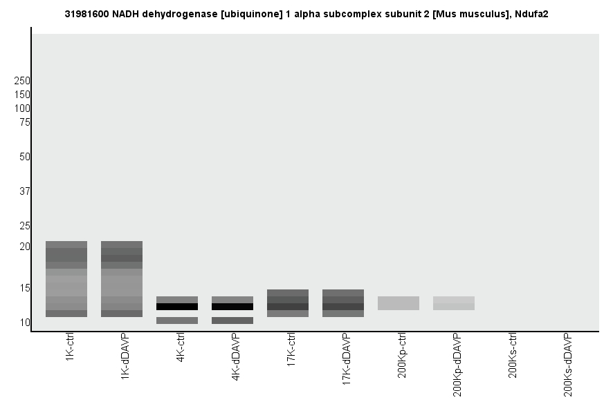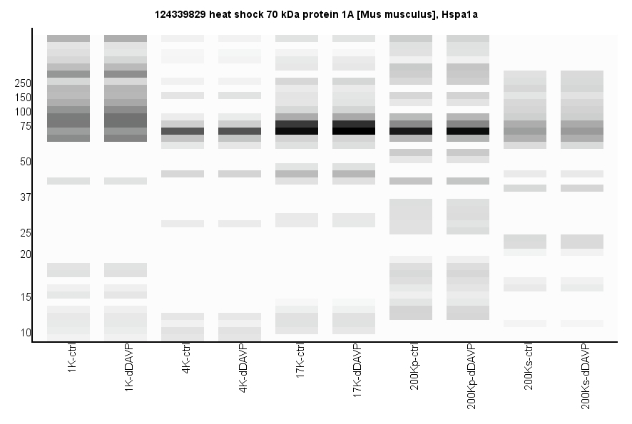 The virtual western blot images show data normalized using a logarithmic conversion scale to map peptide intensities to gray-scale levels. Using this conversion method, low-abundance peptides are generally visible in the blot images. Switch back to the default linear conversion scale database page.