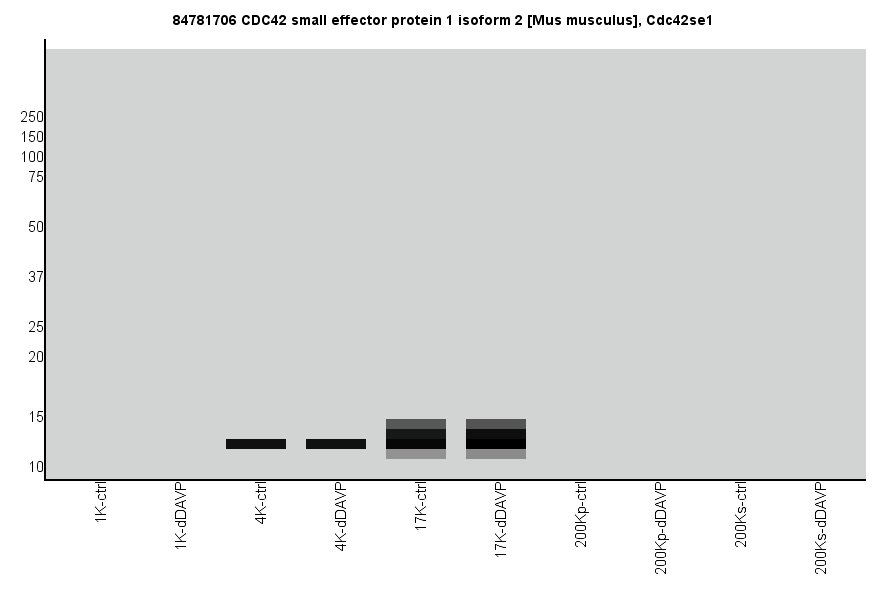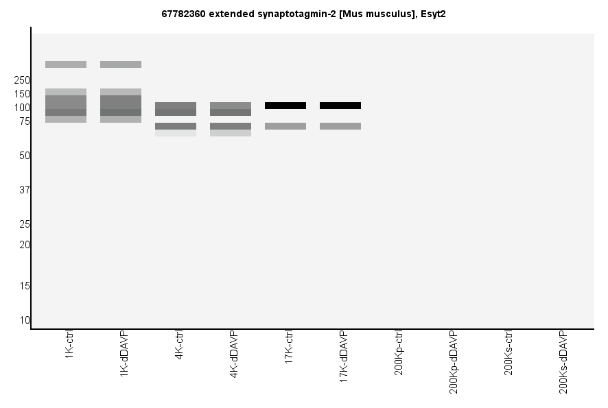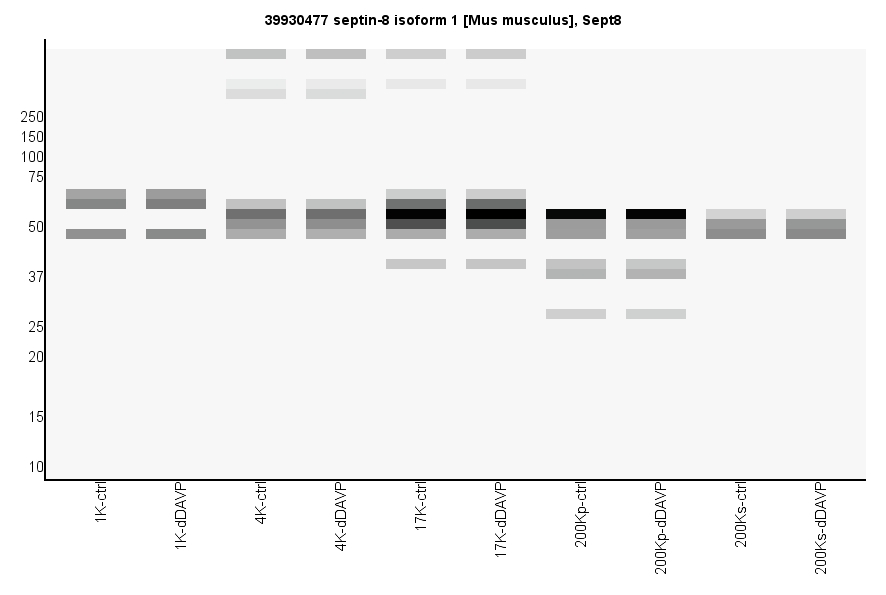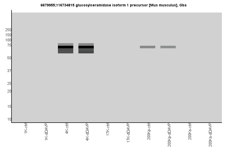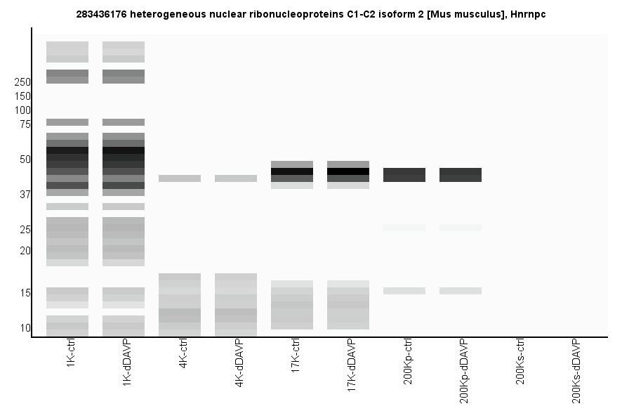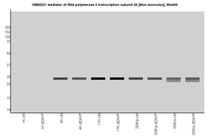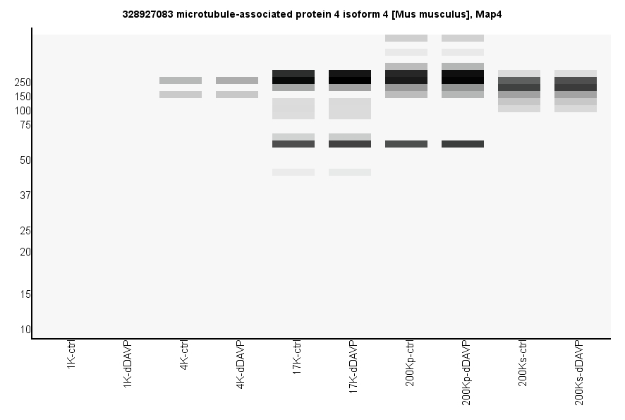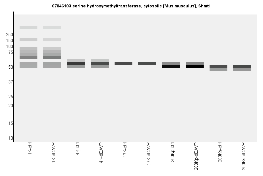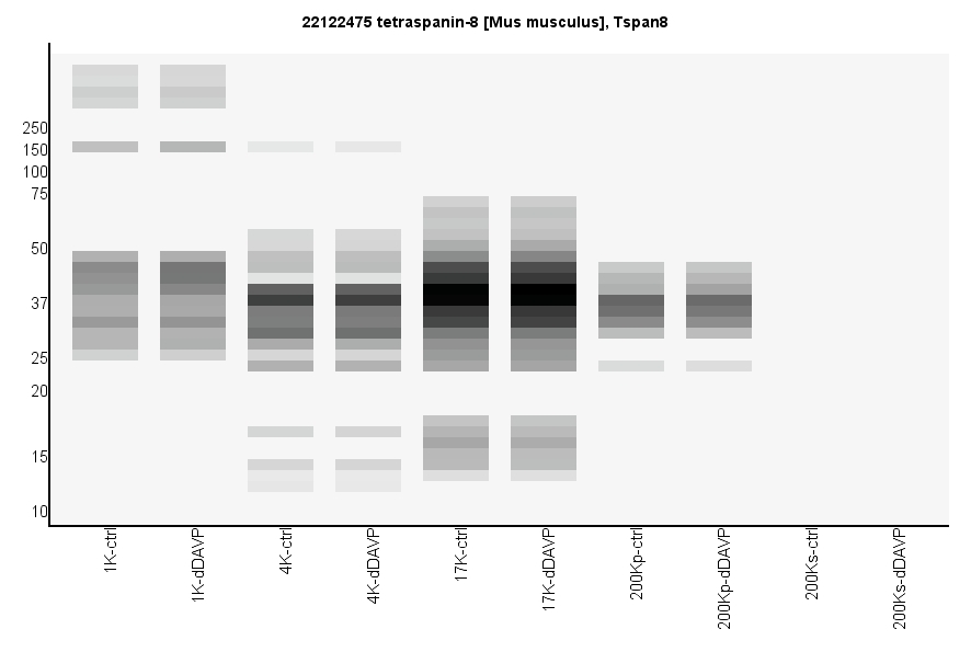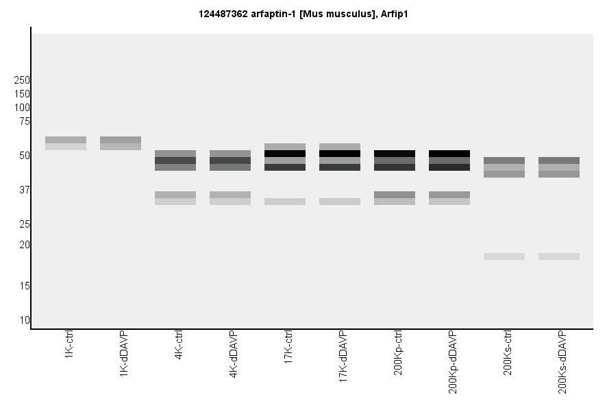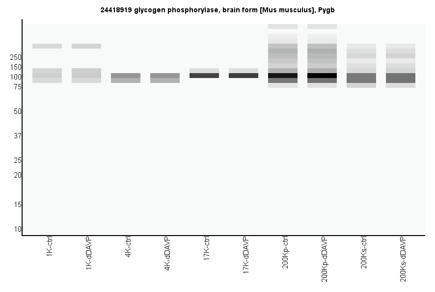 The virtual western blot images show data normalized using a logarithmic conversion scale to map peptide intensities to gray-scale levels. Using this conversion method, low-abundance peptides are generally visible in the blot images. Switch back to the default linear conversion scale database page.