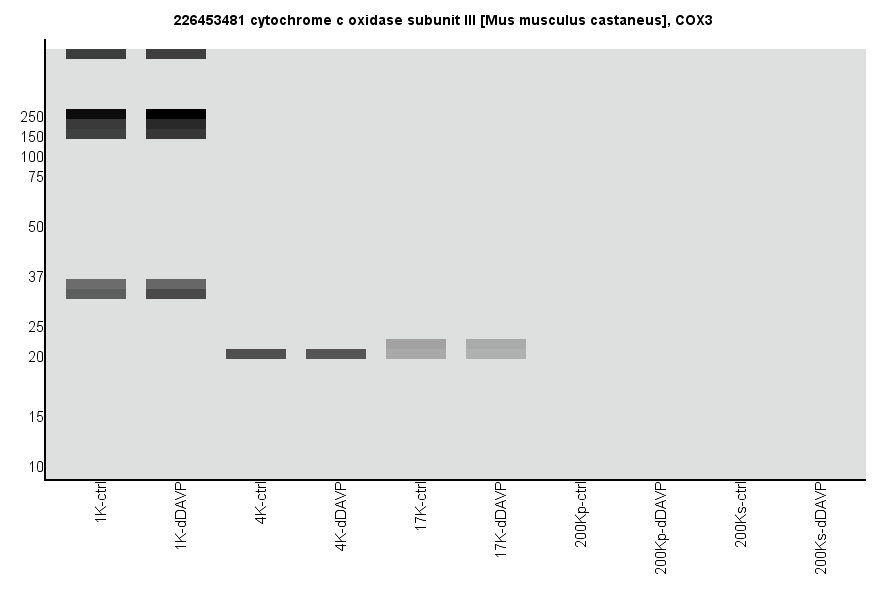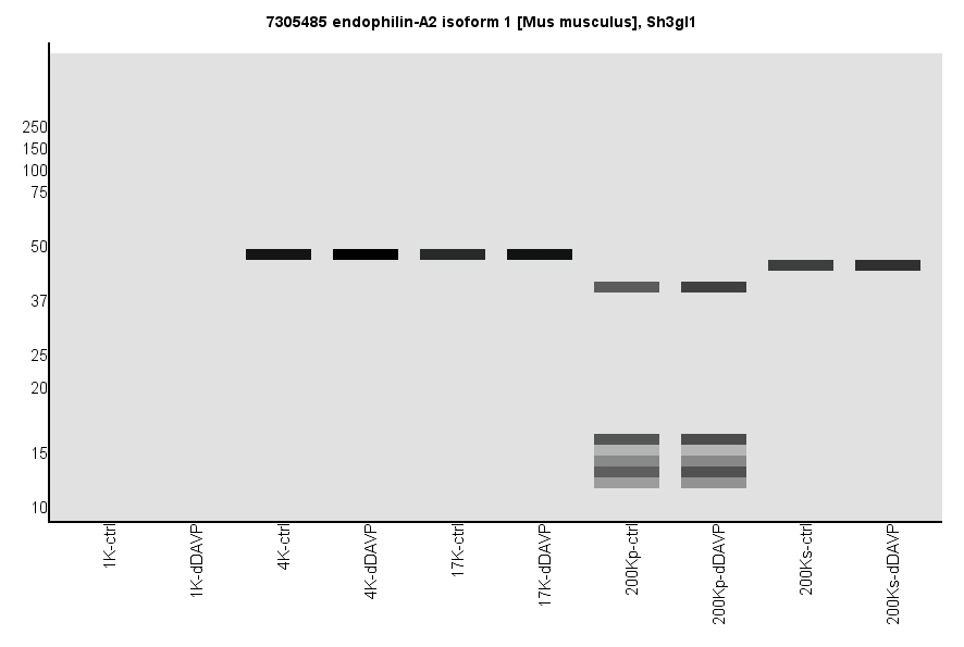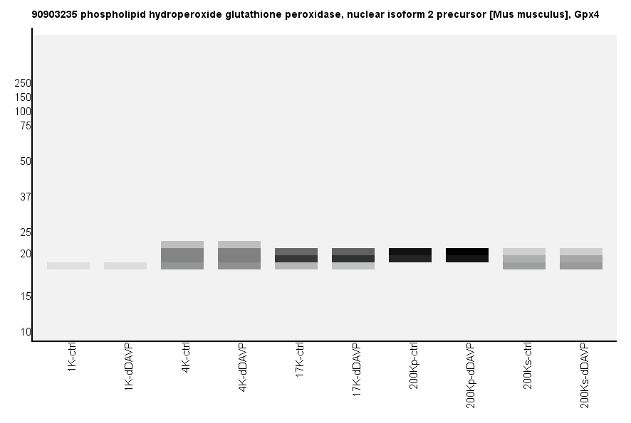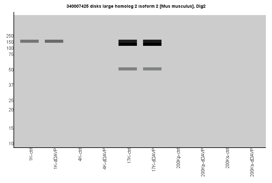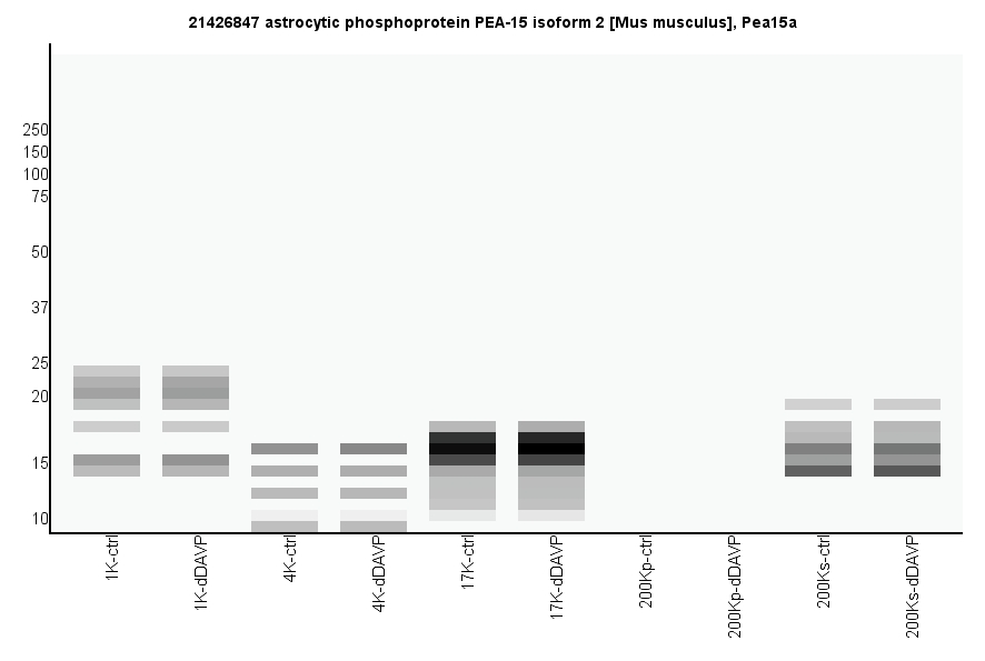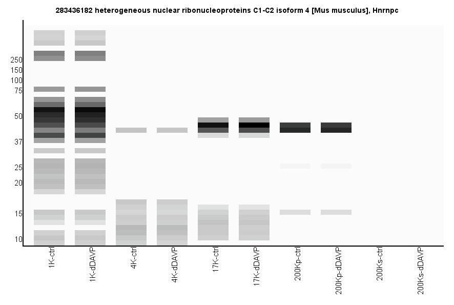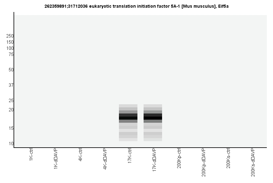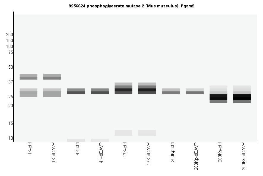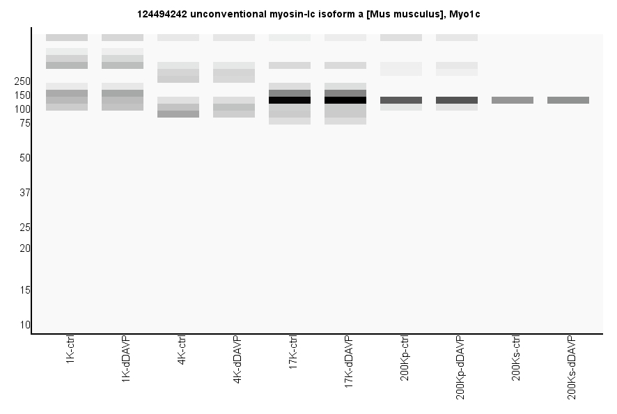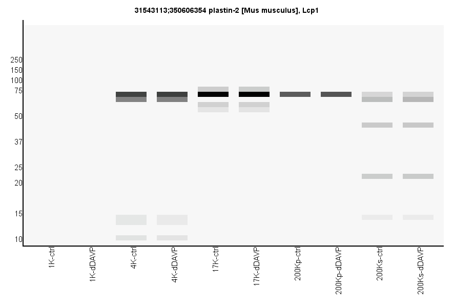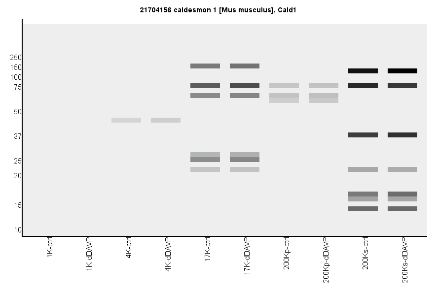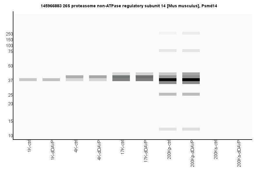 The virtual western blot images show data normalized using a logarithmic conversion scale to map peptide intensities to gray-scale levels. Using this conversion method, low-abundance peptides are generally visible in the blot images. Switch back to the default linear conversion scale database page.