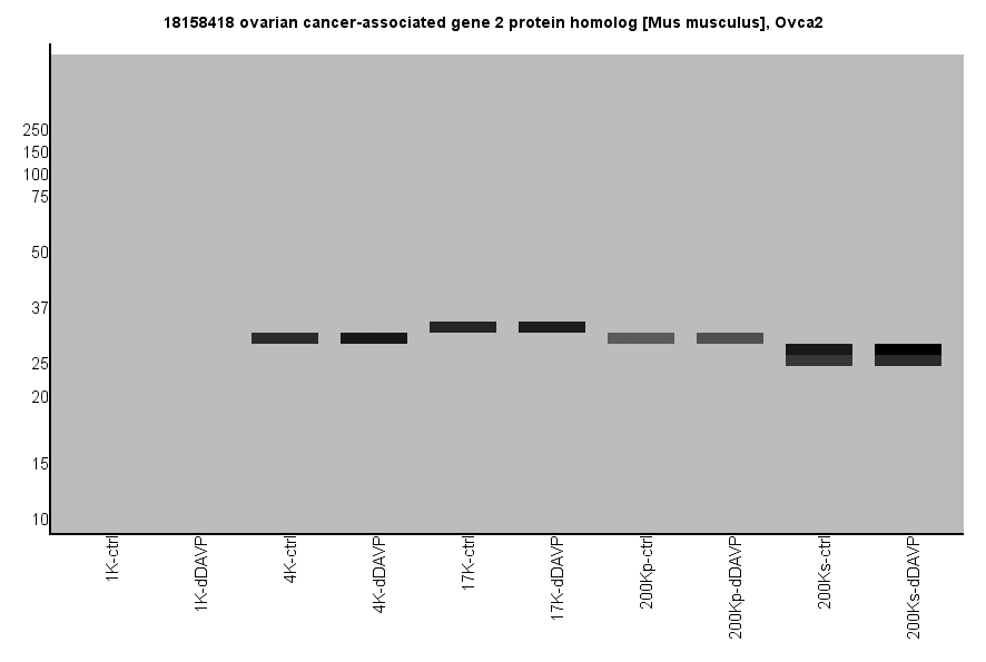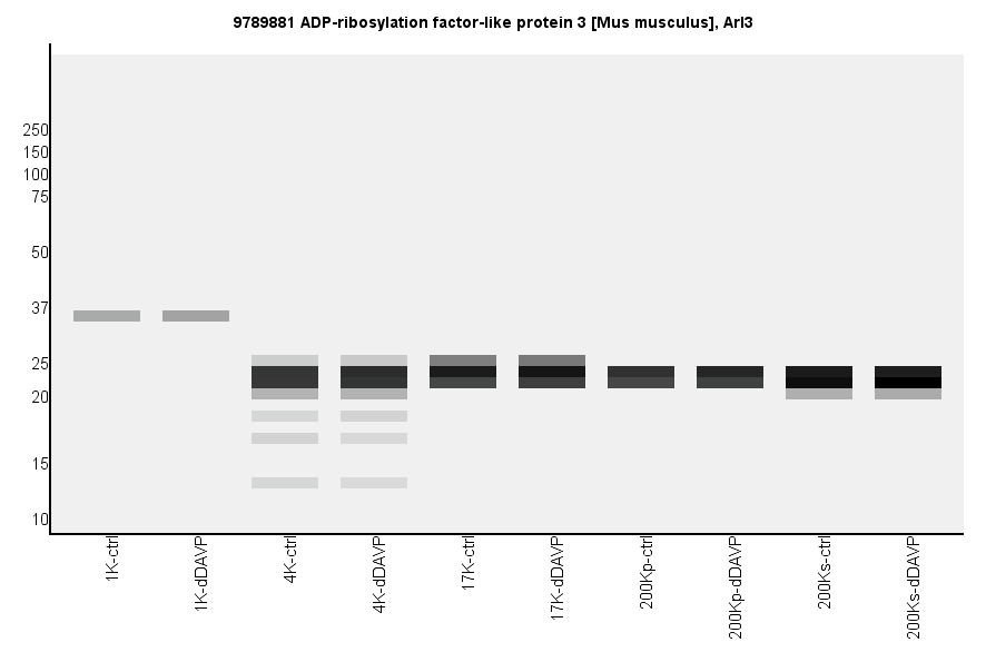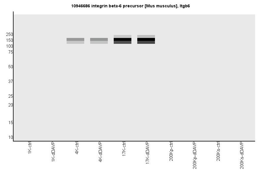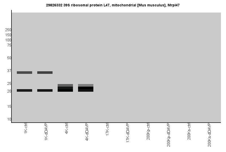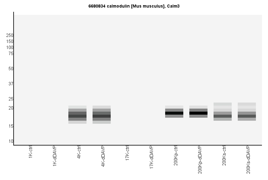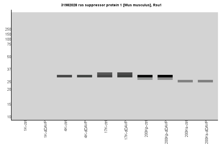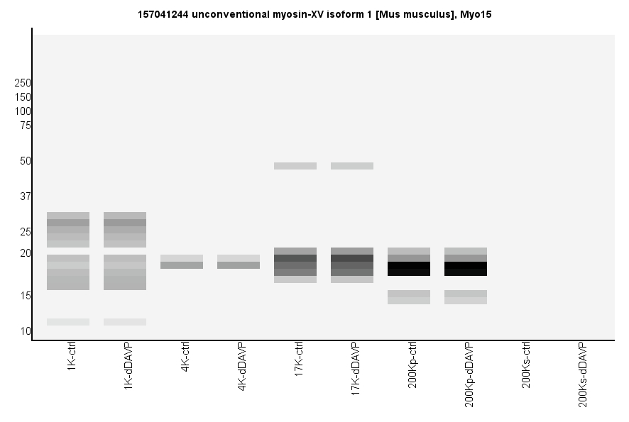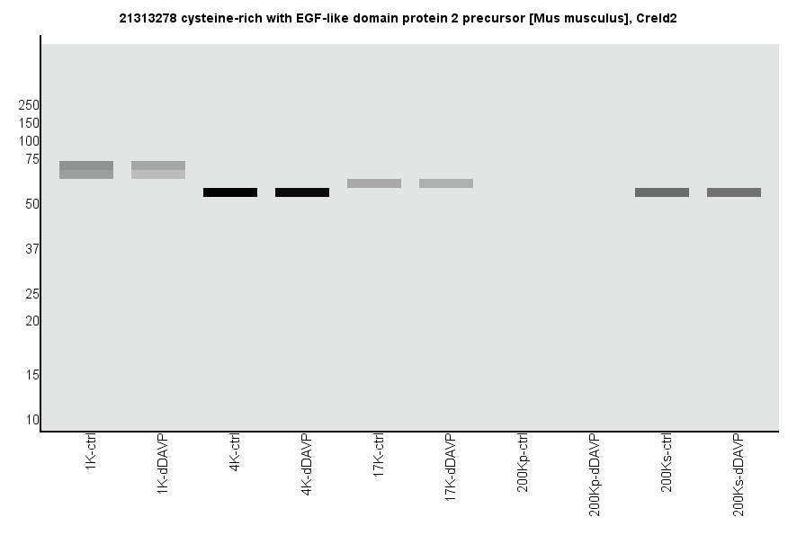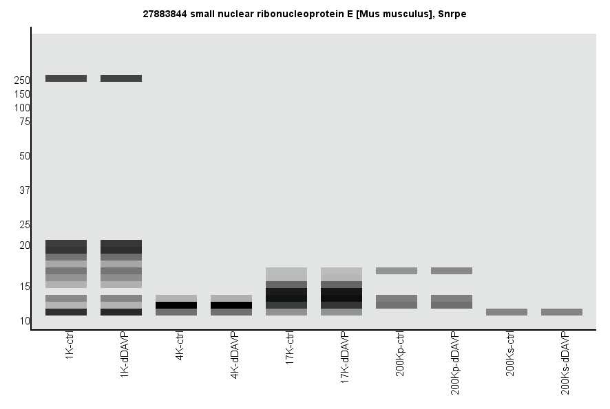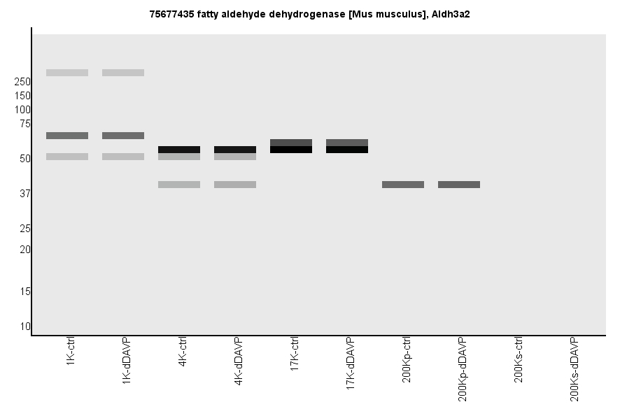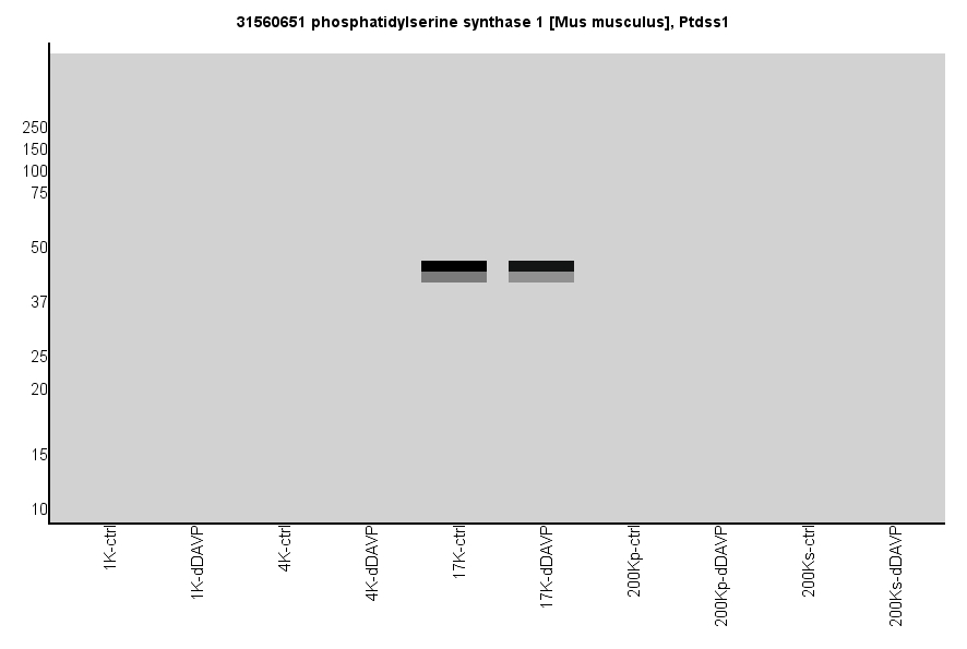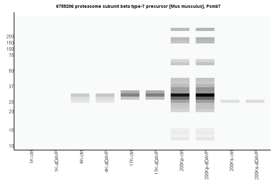 The virtual western blot images show data normalized using a logarithmic conversion scale to map peptide intensities to gray-scale levels. Using this conversion method, low-abundance peptides are generally visible in the blot images. Switch back to the default linear conversion scale database page.
