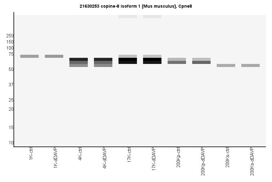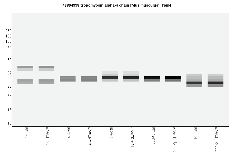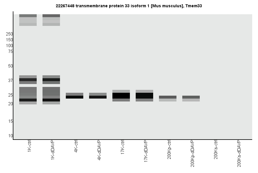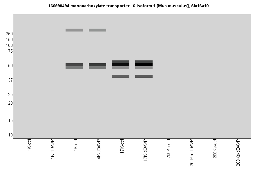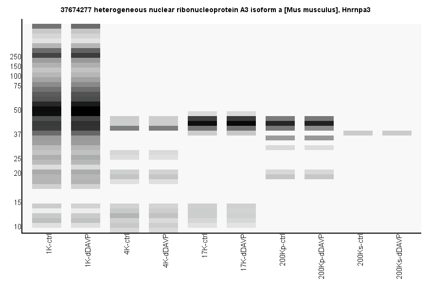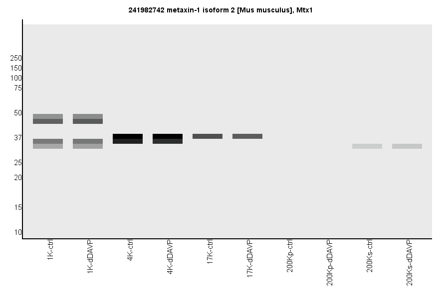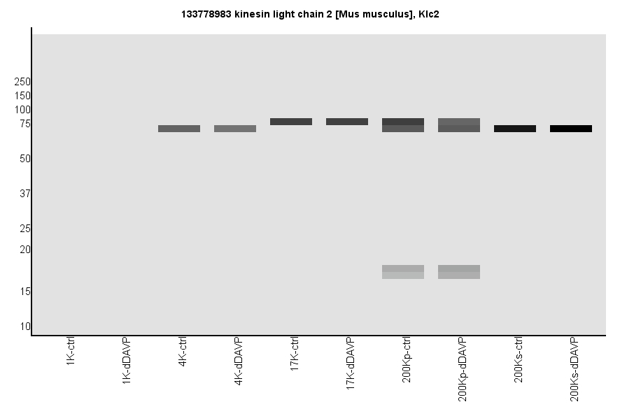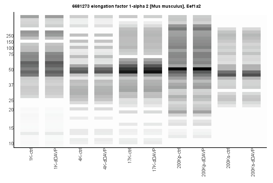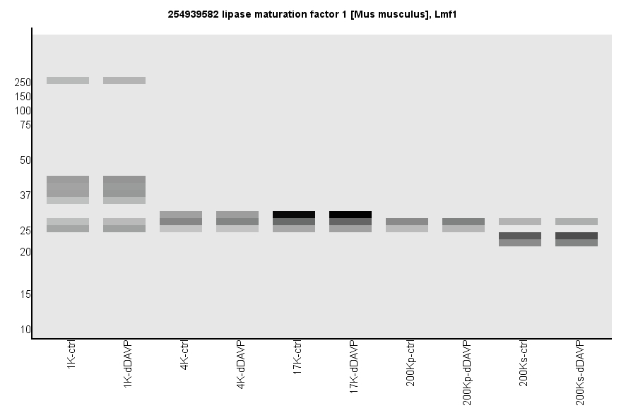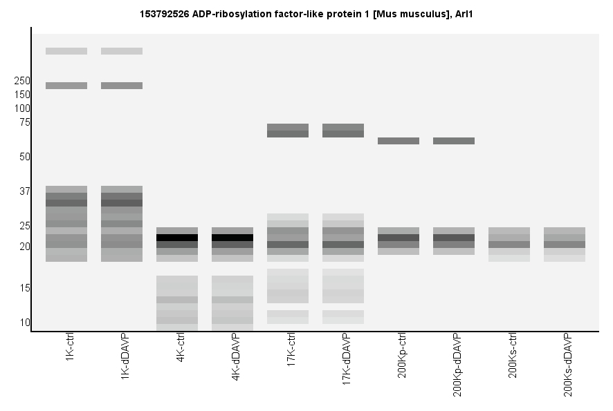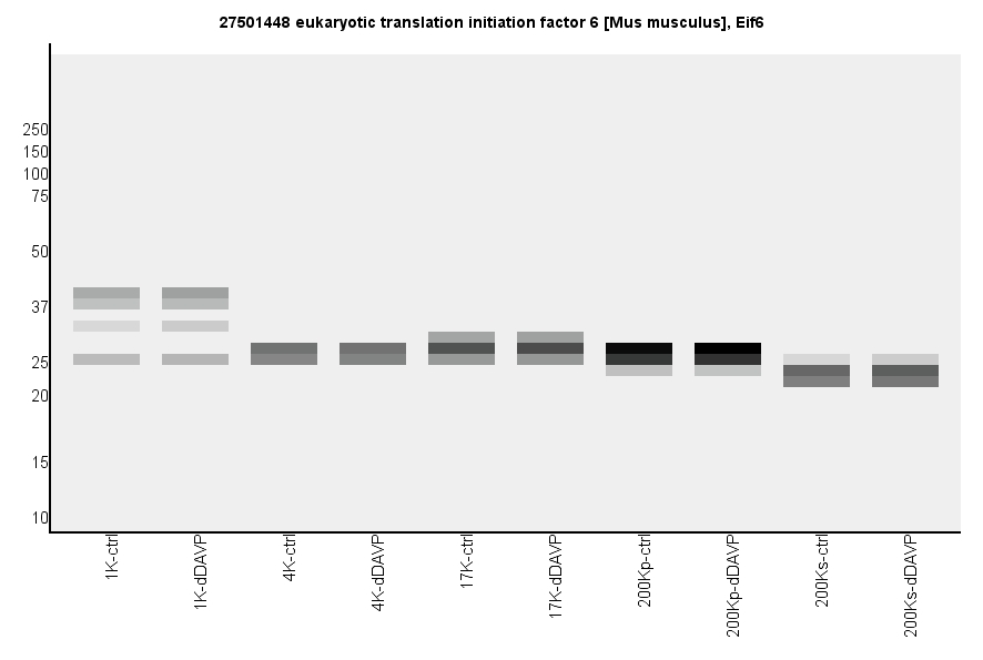 The virtual western blot images show data normalized using a logarithmic conversion scale to map peptide intensities to gray-scale levels. Using this conversion method, low-abundance peptides are generally visible in the blot images. Switch back to the default linear conversion scale database page.